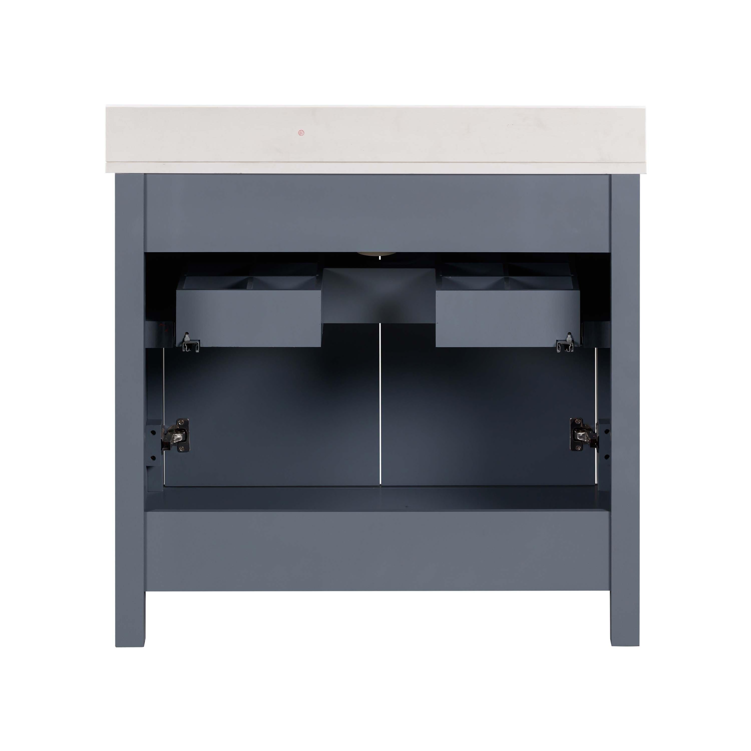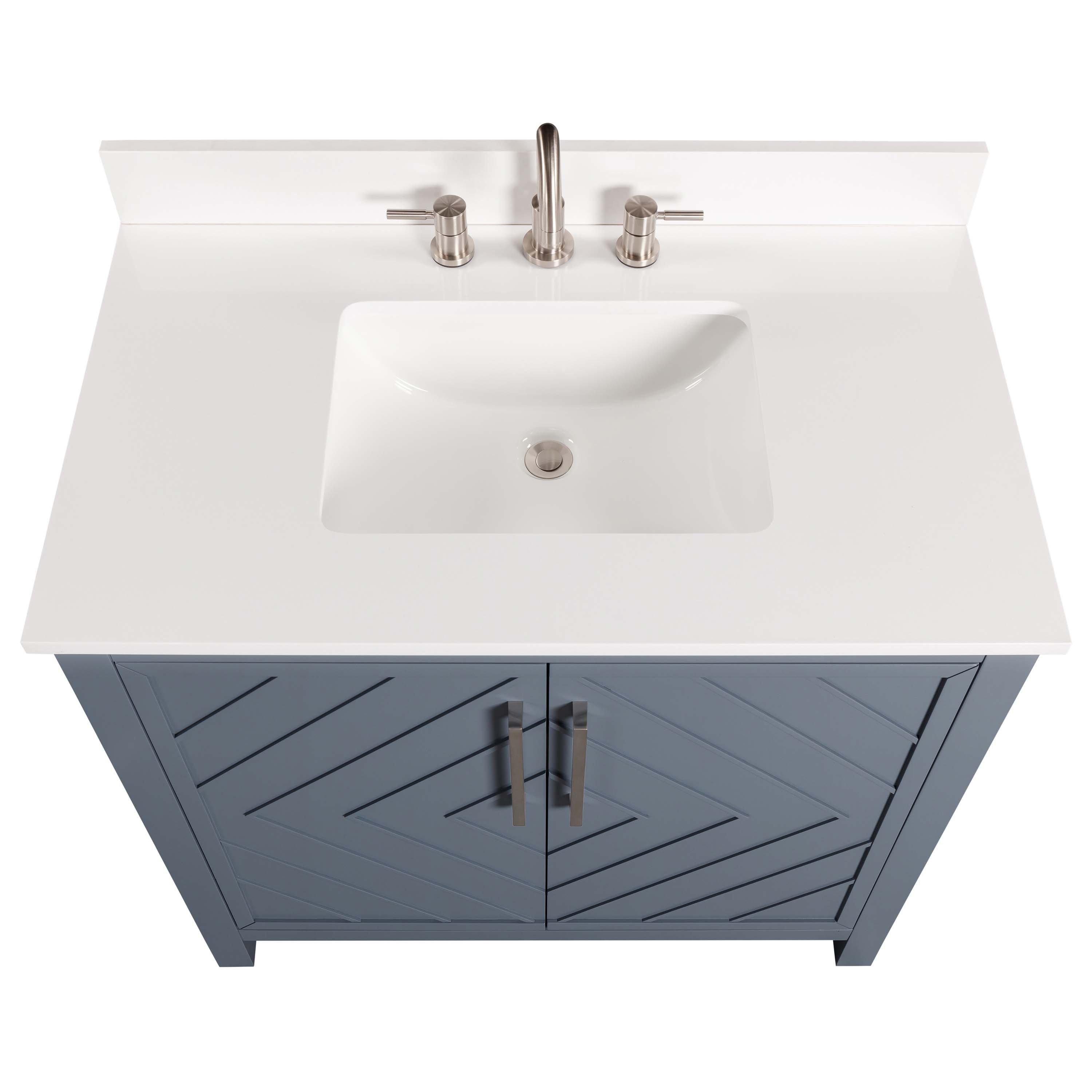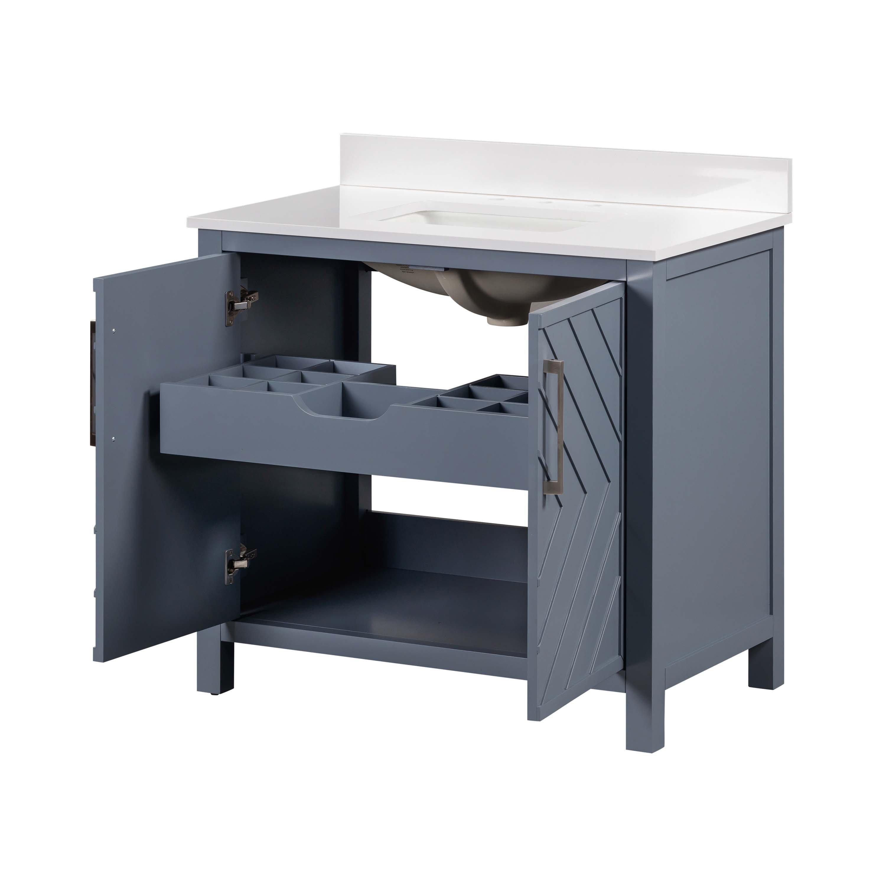 Complete your bathroom with the beautiful Bryce 37 in. Blue Vanity with Engineered Stone Top. This freestanding features durable solid wood, mdf cabinets in stunning blue with a white engineered stone vanity top and brushed silver hardware. A charming single undermount sink in brilliant white is included. The Bryce 37 in. Blue Vanity with Engineered Stone Top is a versatile choice to customize multiple bathroom settings.
