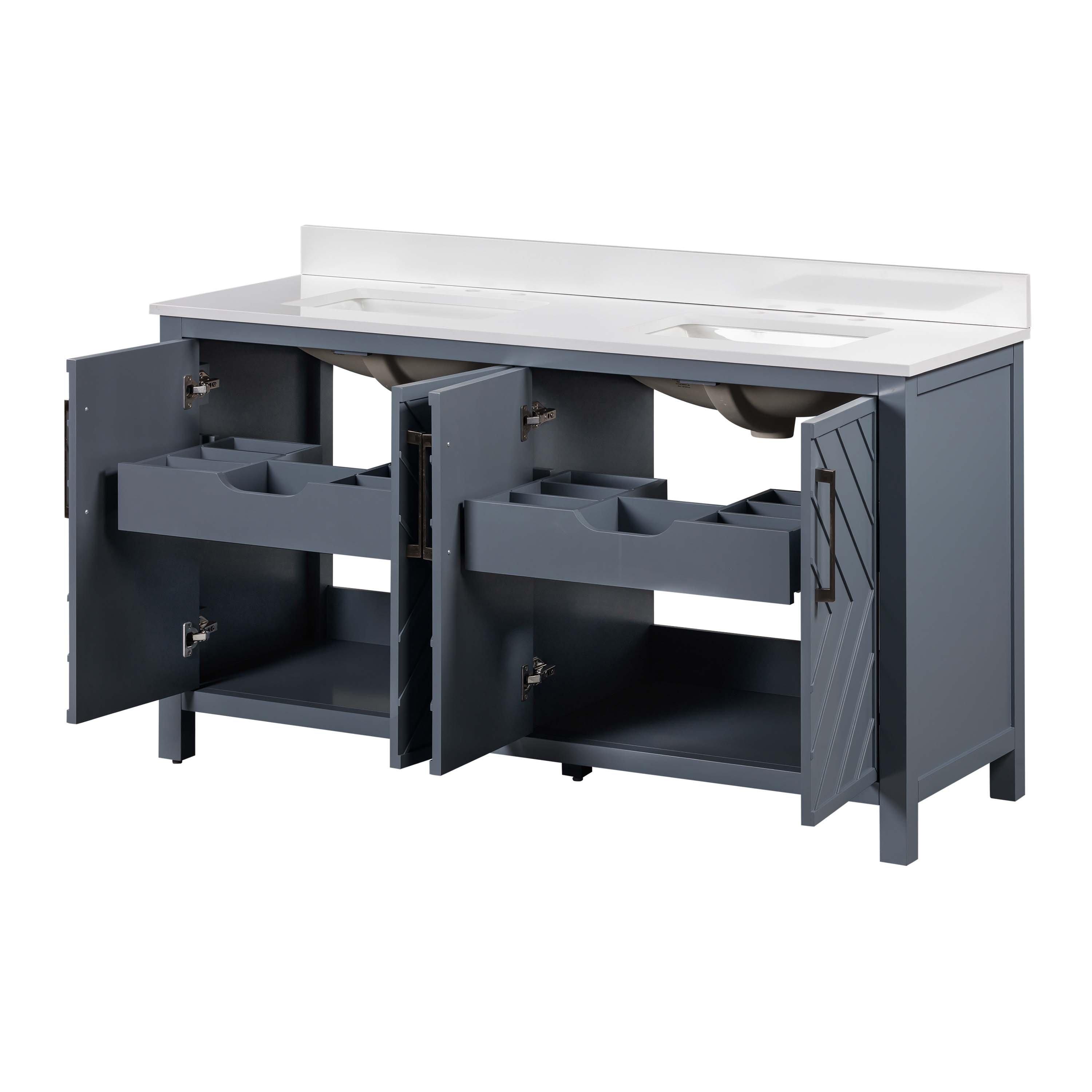 Tailor the look of your bathroom with the Bryce 61 in. Blue Vanity with Engineered Stone Top featuring gorgeous solid wood, mdf in blue with 4 doors, 2 drawers, and n/a shelves. This piece is completed with beautiful brushed silver hardware and a double undermount white sink. The Bryce 61 in. Blue Vanity with Engineered Stone Top is a stunning addition to any bathroom setting.