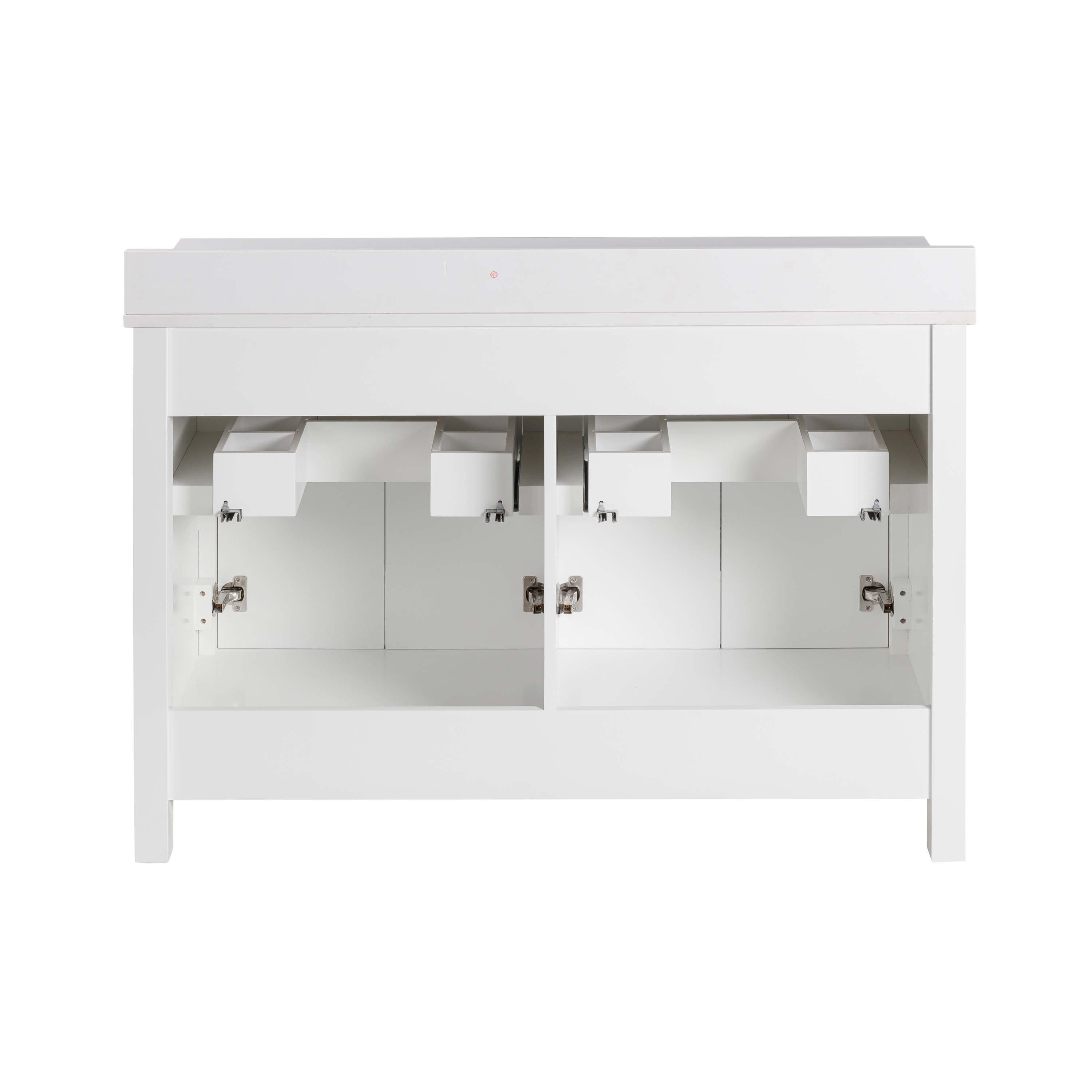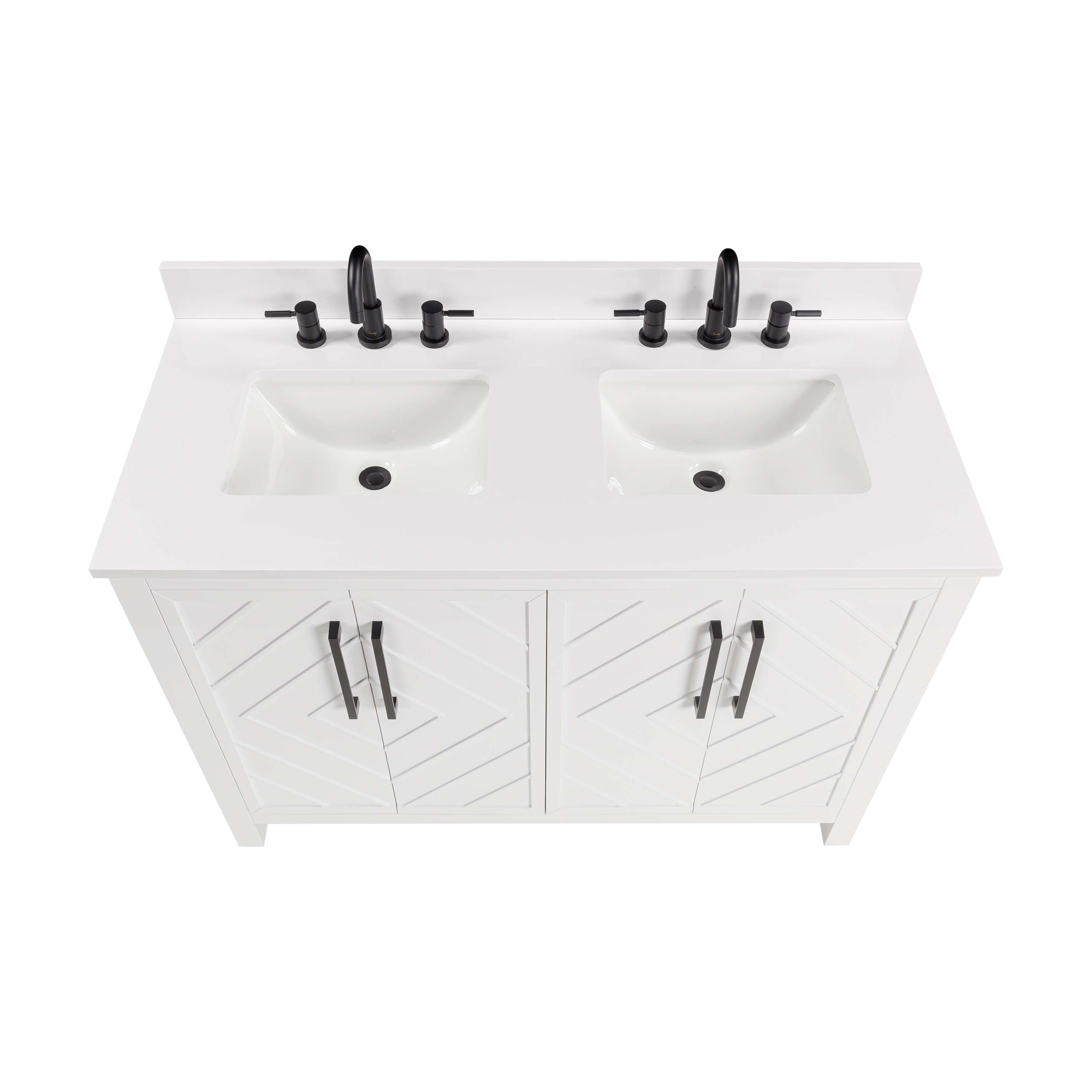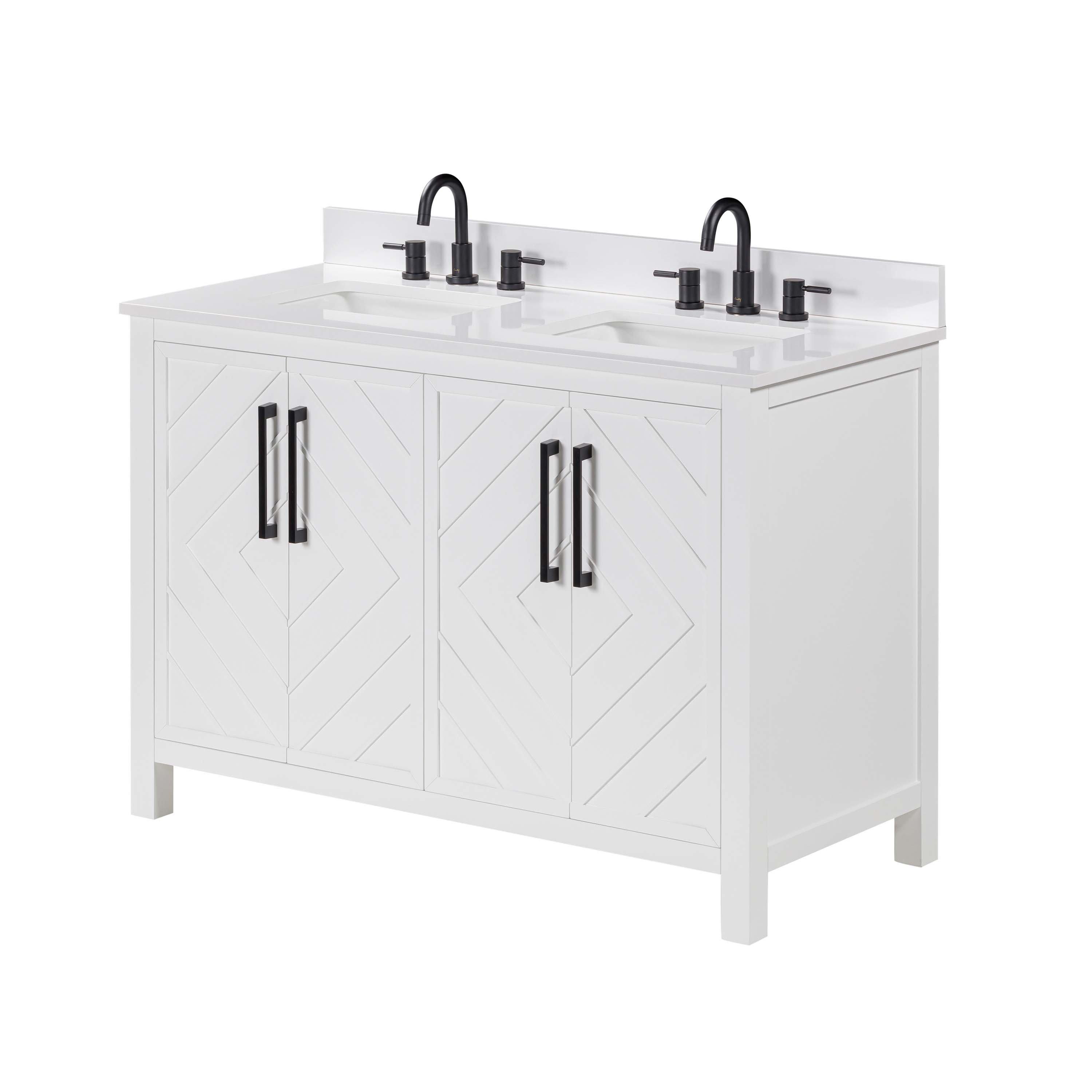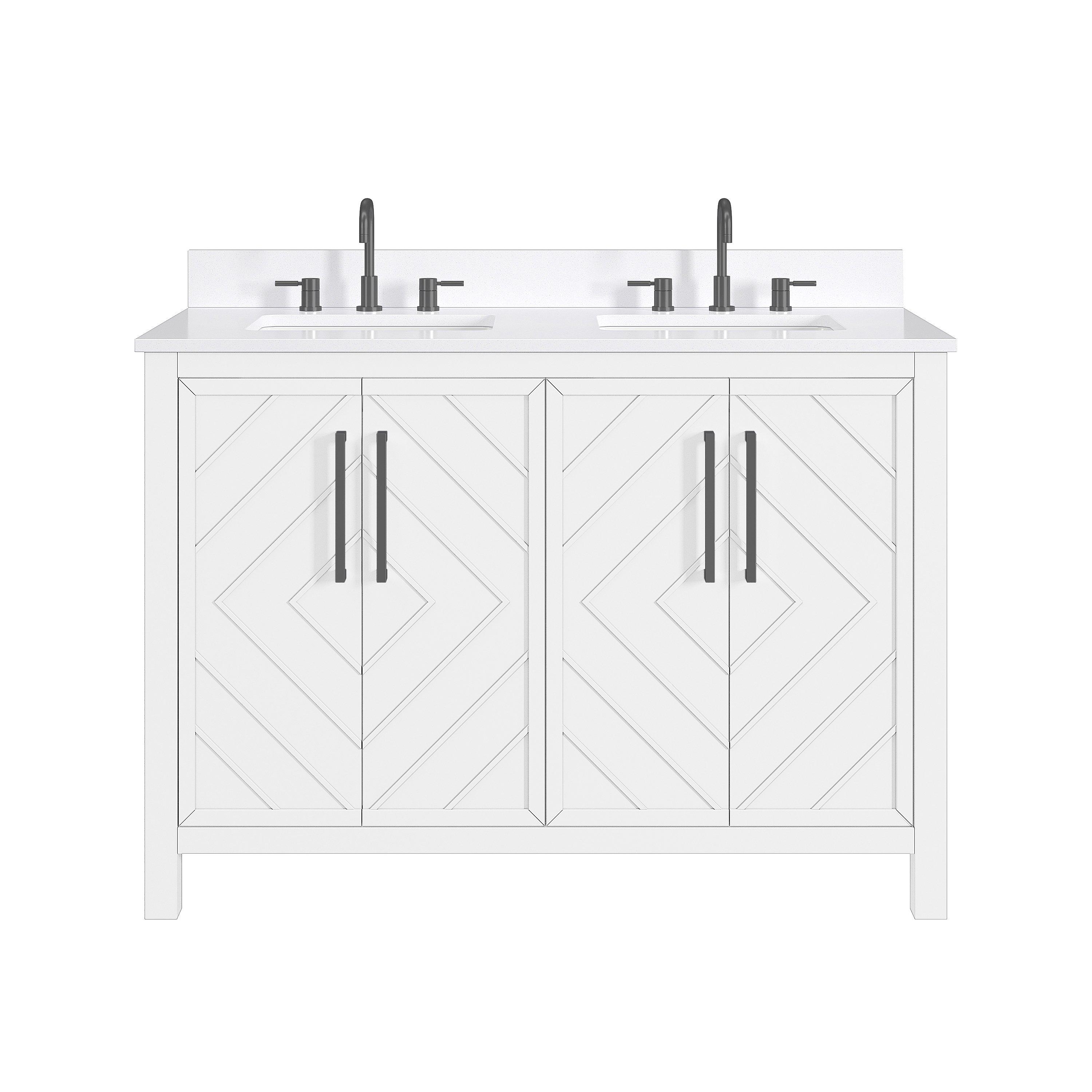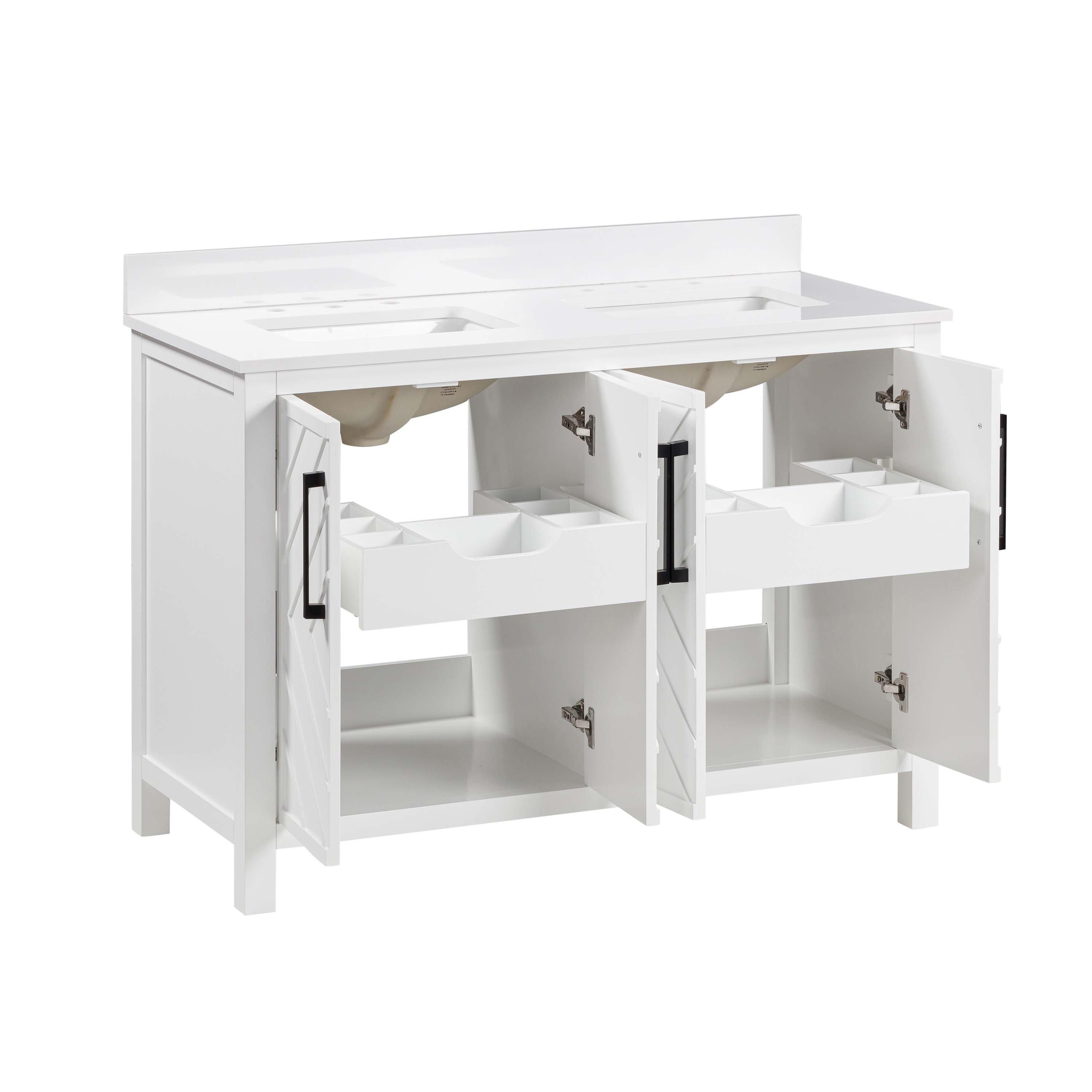 Tailor the look of your bathroom with the Bryce 49 in. White Vanity with Engineered Stone Top featuring gorgeous mdf in white with 4 doors, 2 drawers, and 0 shelves. This piece is completed with beautiful matte black hardware and a double undermount white sink. The Bryce 49 in. White Vanity with Engineered Stone Top is a stunning addition to any bathroom setting.