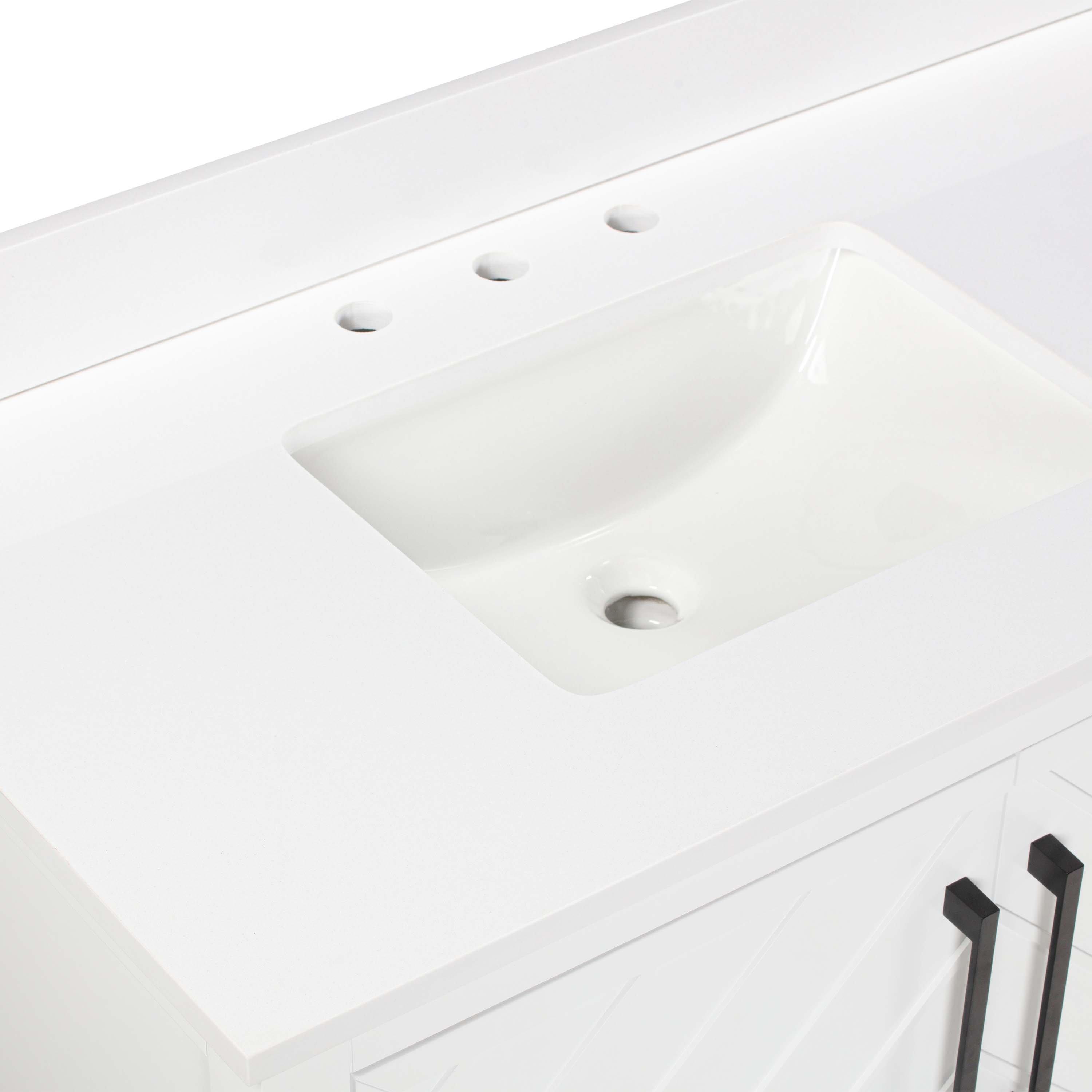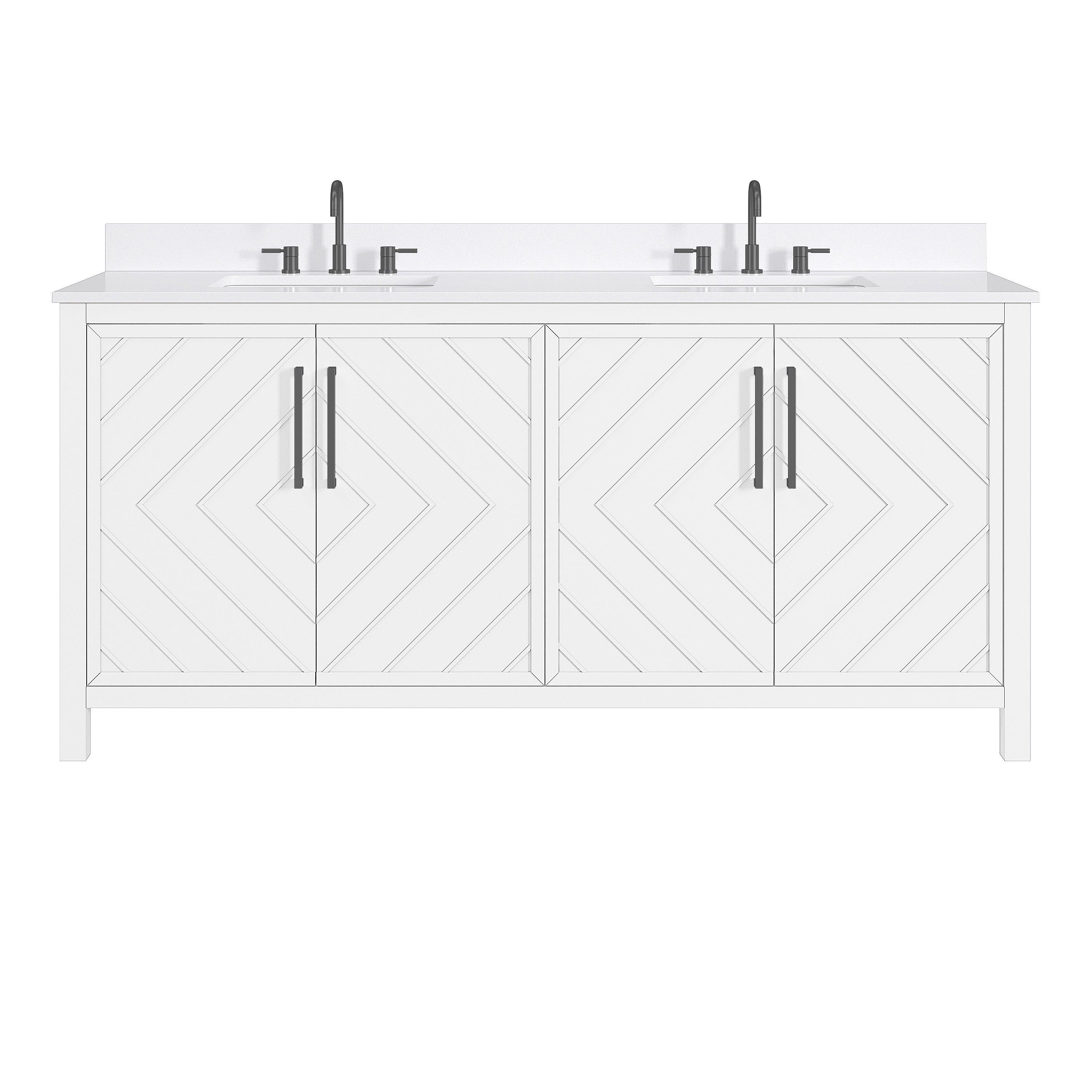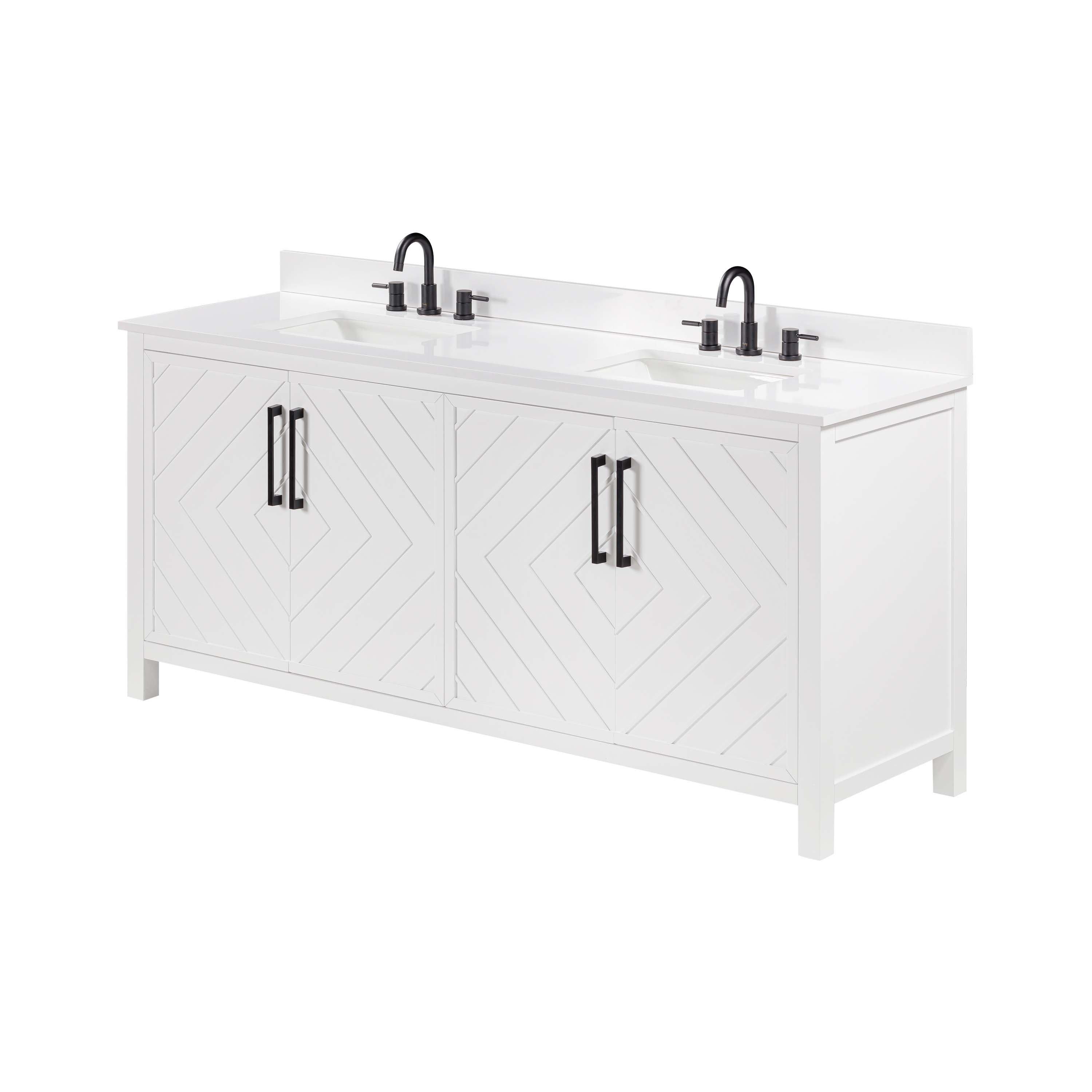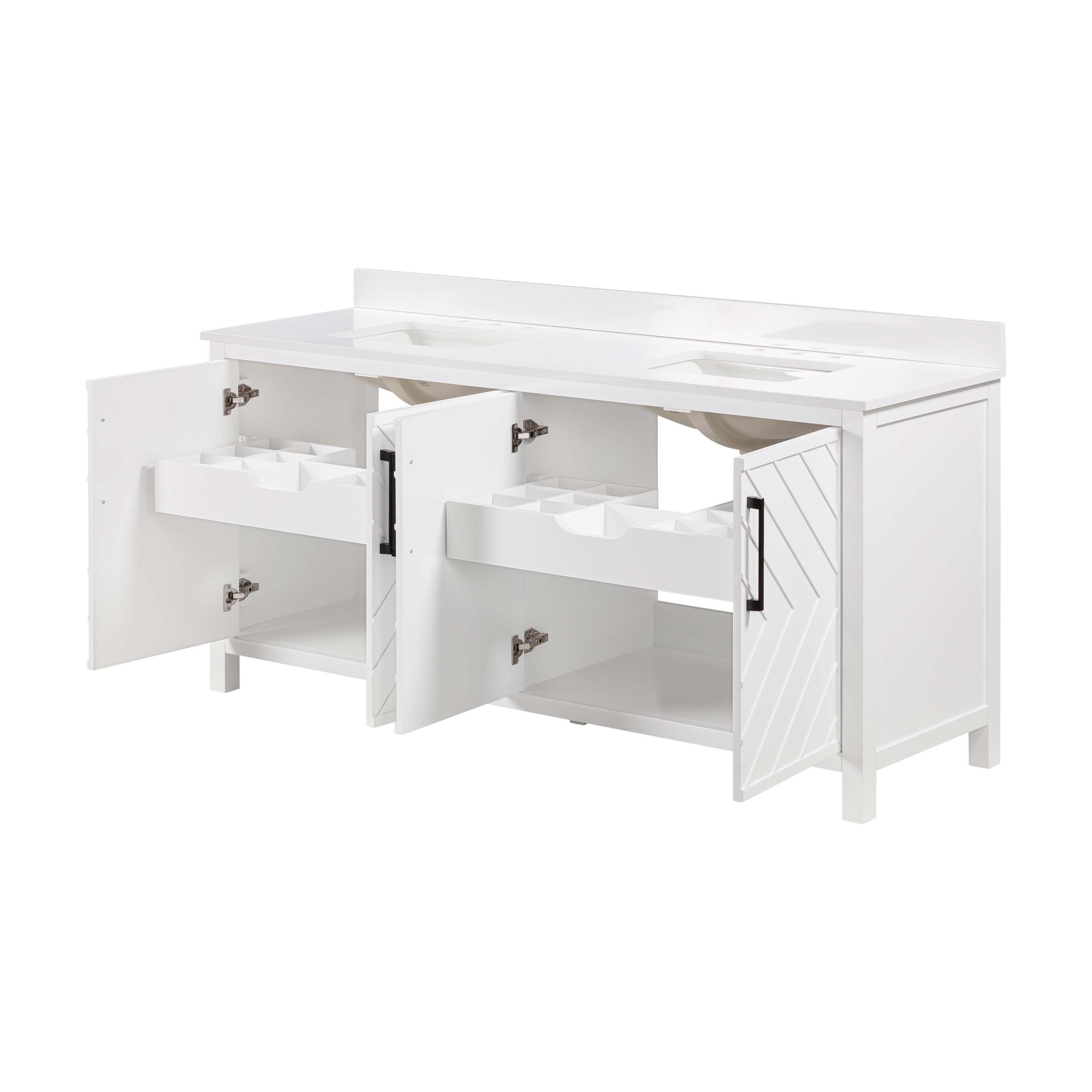 Complete your bathroom with the beautiful Bryce 73 in. White Vanity with Engineered Stone Top. This freestanding features durable mdf cabinets in stunning white with a white engineered stone vanity top and matte black hardware. A charming double undermount sink in brilliant white is included. The Bryce 73 in. White Vanity with Engineered Stone Top is a versatile choice to customize multiple bathroom settings.
