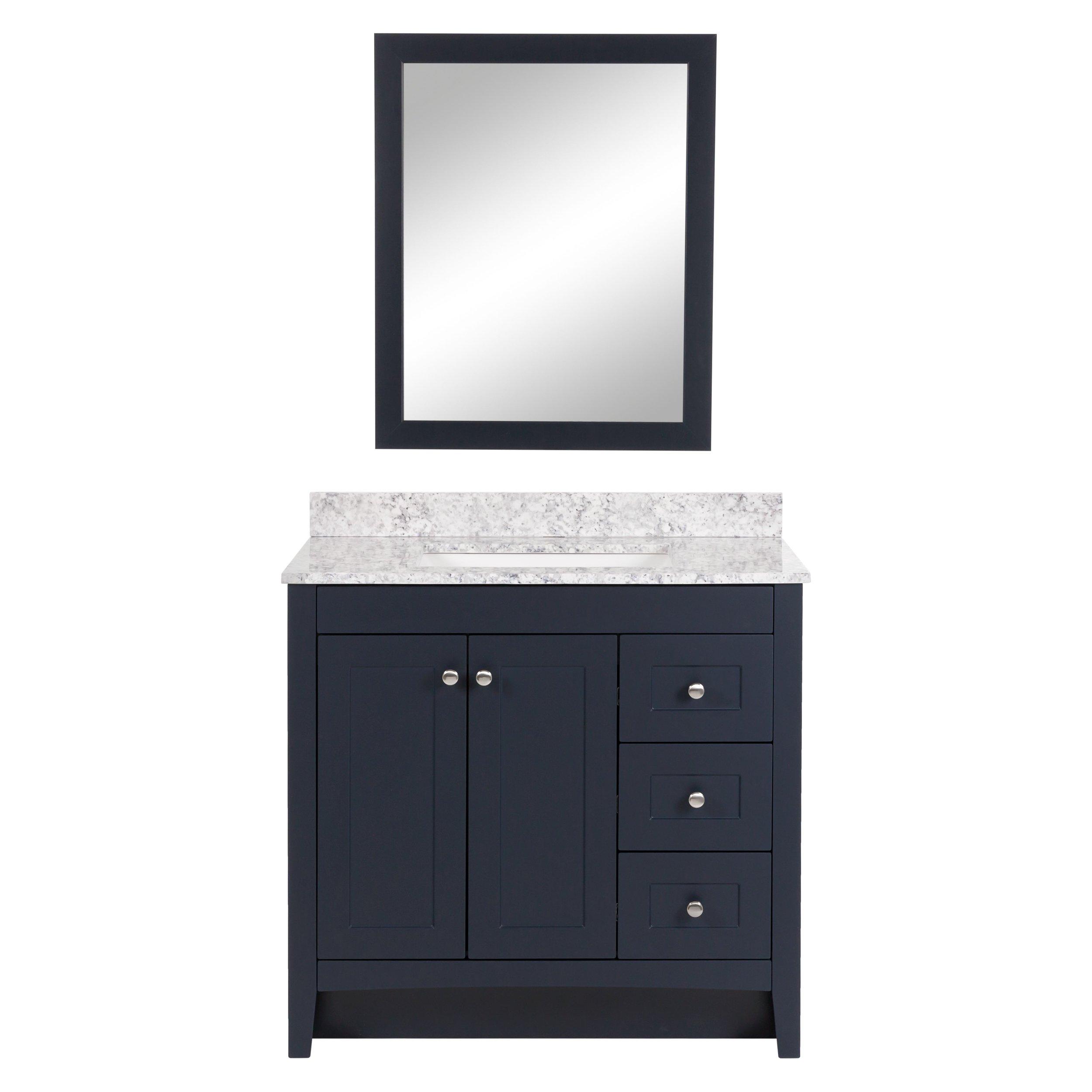 Update your bathroom with the Capri 37 in. Deep Blue bathroom vanity and mirror set. This pre-assembled bathroom vanity features furniture-grade construction, a Deep Blue laminate finish, satin nickel hardware, and a granite-style Stone Effects cultured marble sink top. And its 3 full-extension drawers and soft-close 2-door under-sink cabinet provide easy-access bathroom storage. A matching 26.2 in. W x 32 in. H Deep Blue mirror completes this set for a stunning upgrade to any bathroom.
