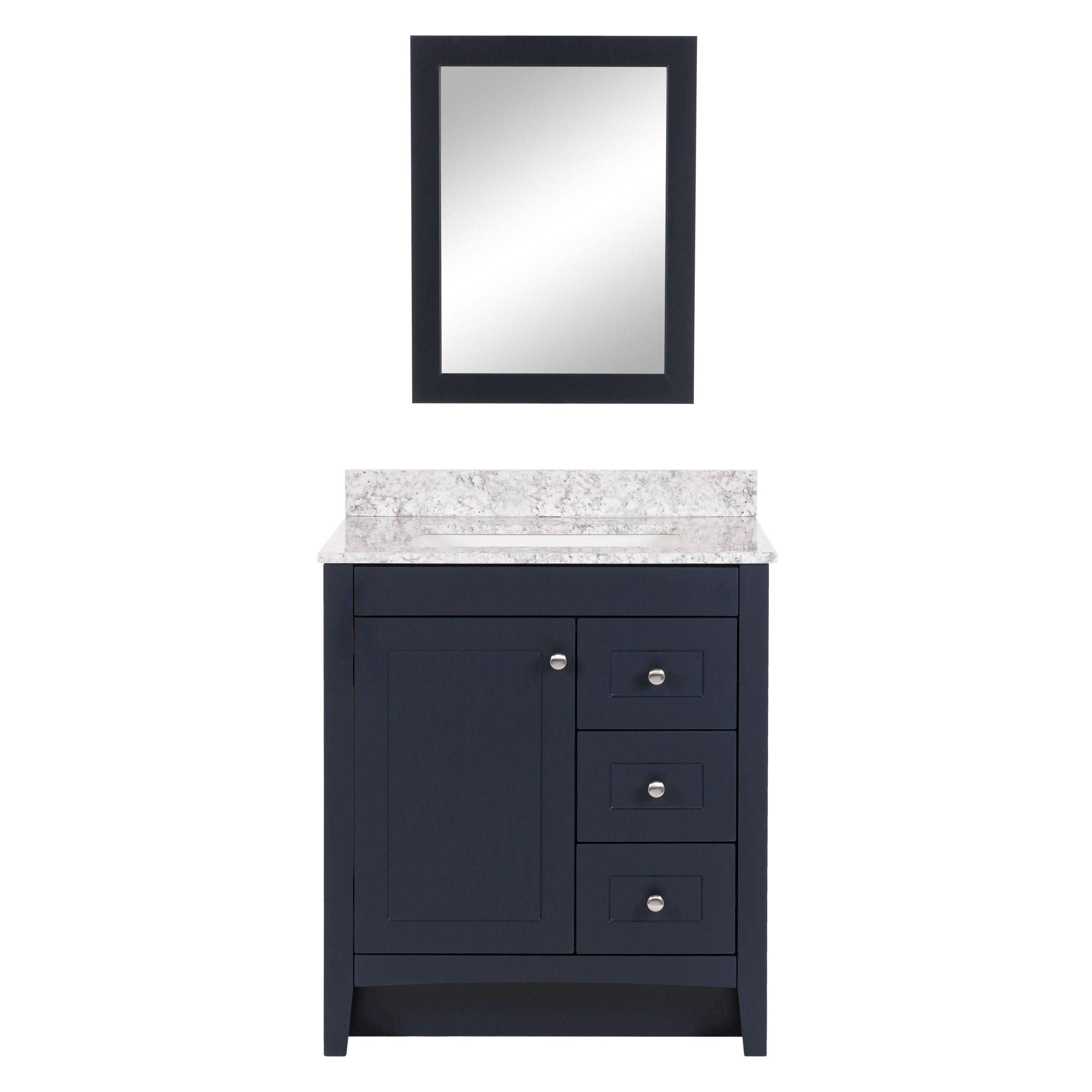 Update your bathroom with the Capri 31 in. Deep Blue bathroom vanity and mirror set. This pre-assembled bathroom vanity features furniture-grade construction, a Deep Blue laminate finish, satin nickel hardware, and a granite-style Stone Effects cultured marble sink top. And its 3 full-extension drawers and soft-close 1-door under-sink cabinet provide easy-access bathroom storage. A matching 21.1 in. W x 27.1 in. H Deep Blue mirror completes this set for a stunning upgrade to any bathroom.