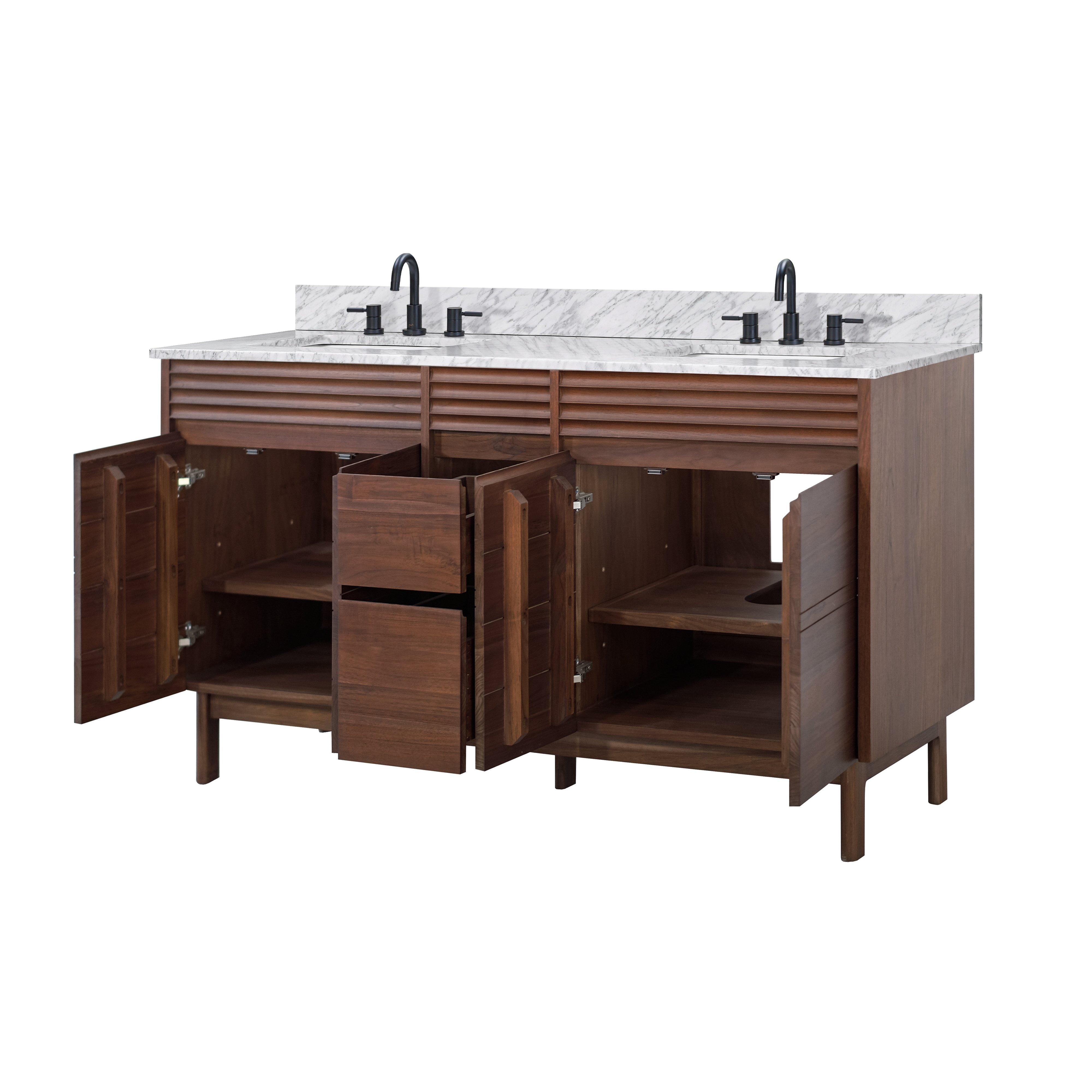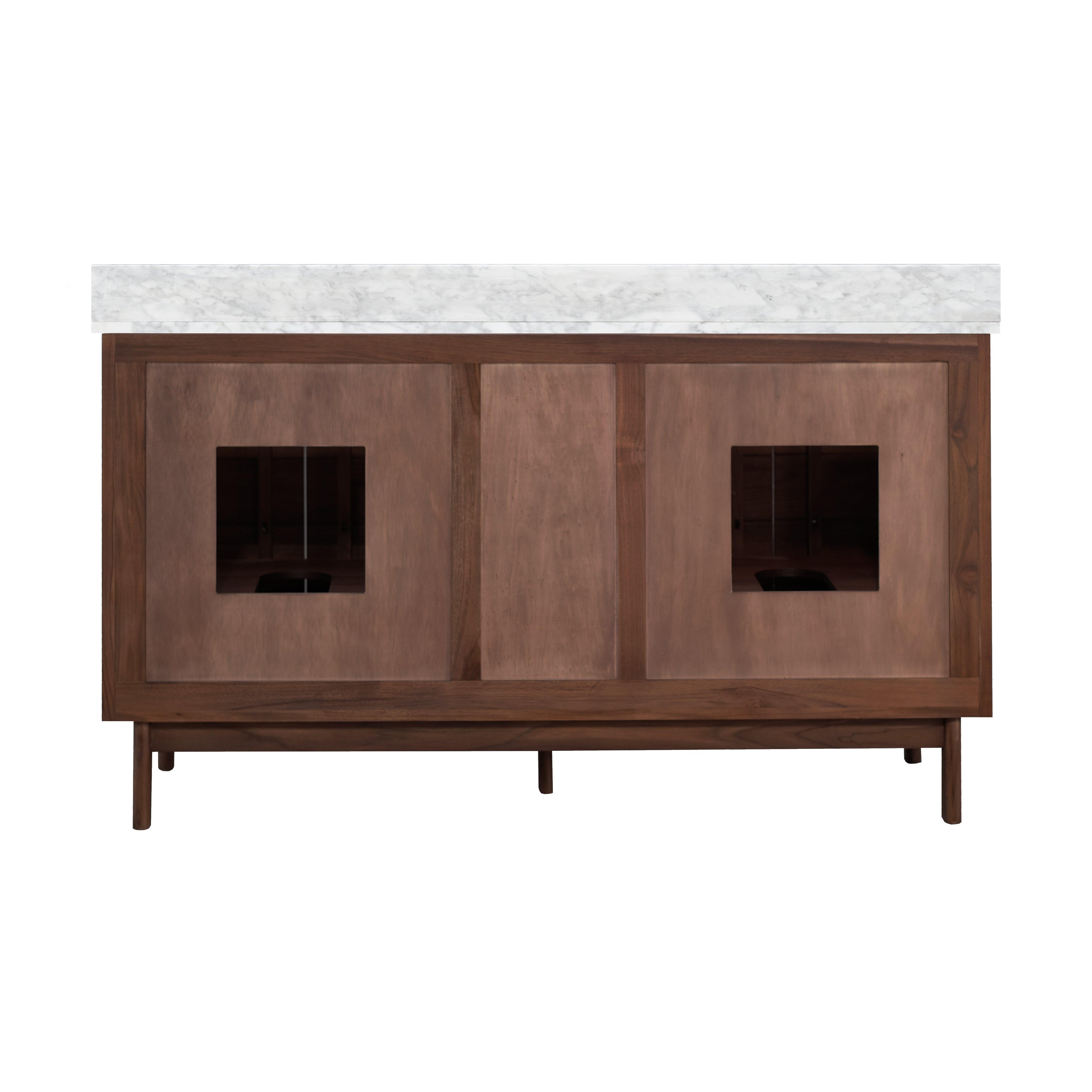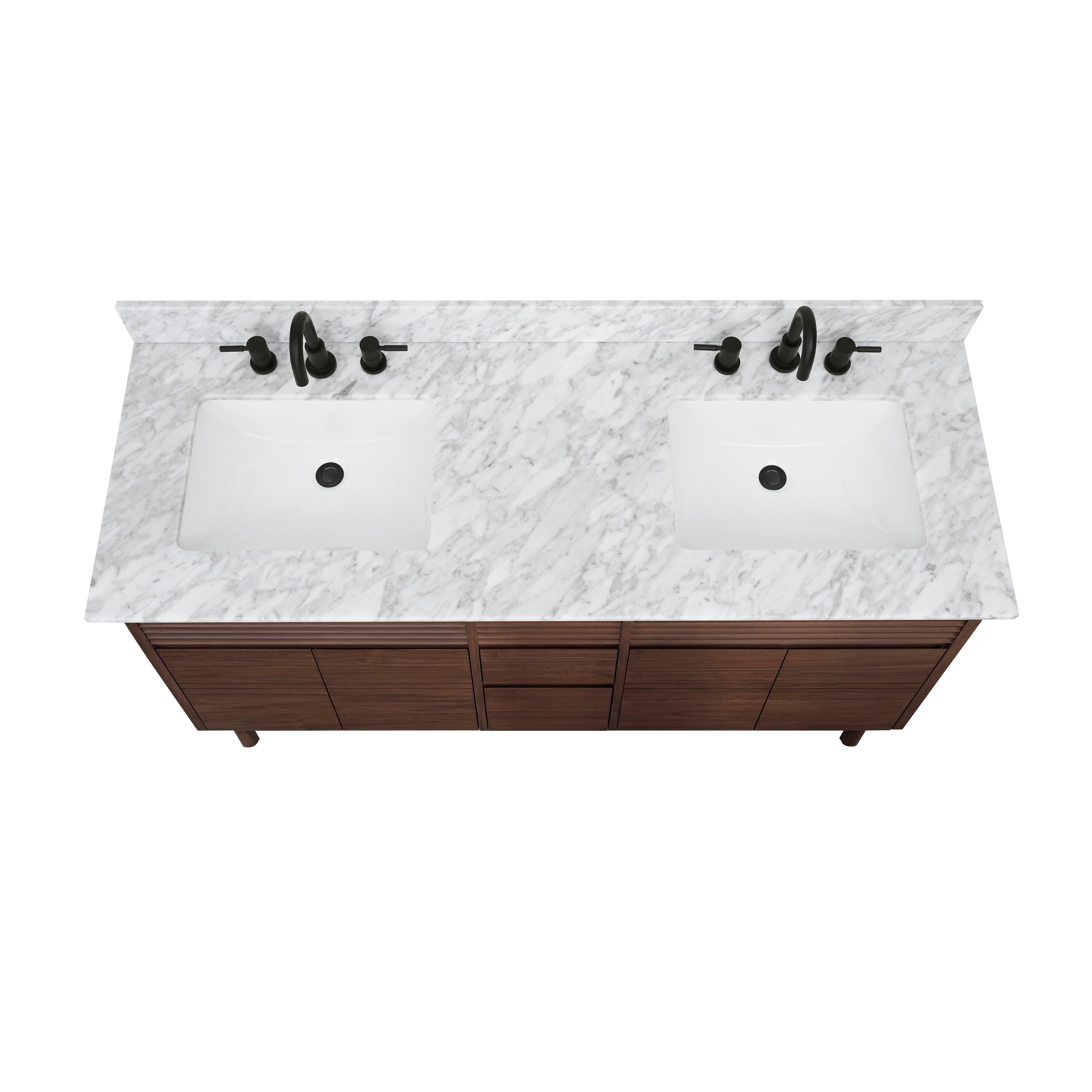Complete your bathroom with the beautiful Chaval 61 in. Coffee Brown Vanity with Carrara Top. This freestanding features durable solid wood, mdf cabinets in stunning brown with a white marble vanity top and n/a n/a hardware. A charming double undermount sink in brilliant white is included. The Chaval 61 in. Coffee Brown Vanity with Carrara Top is a versatile choice to customize multiple bathroom settings.