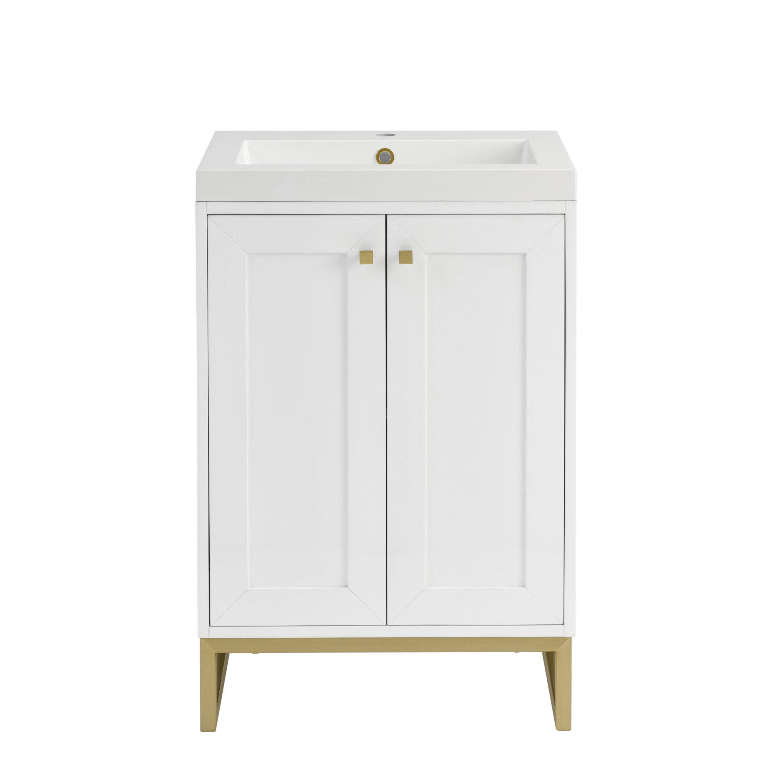Tailor the look of your bathroom with the Chianti 24 in. Glossy White and Champagne Brass Single Sink Vanity with White Glossy Composite Stone Top featuring gorgeous solid wood, plywood in white with 2 doors, 0 drawers, and 1 shelves. This piece is completed with beautiful polished brass hardware and a n/a n/a n/a sink. The Chianti 24 in. Glossy White and Champagne Brass Single Sink Vanity with White Glossy Composite Stone Top is a stunning addition to any bathroom setting.