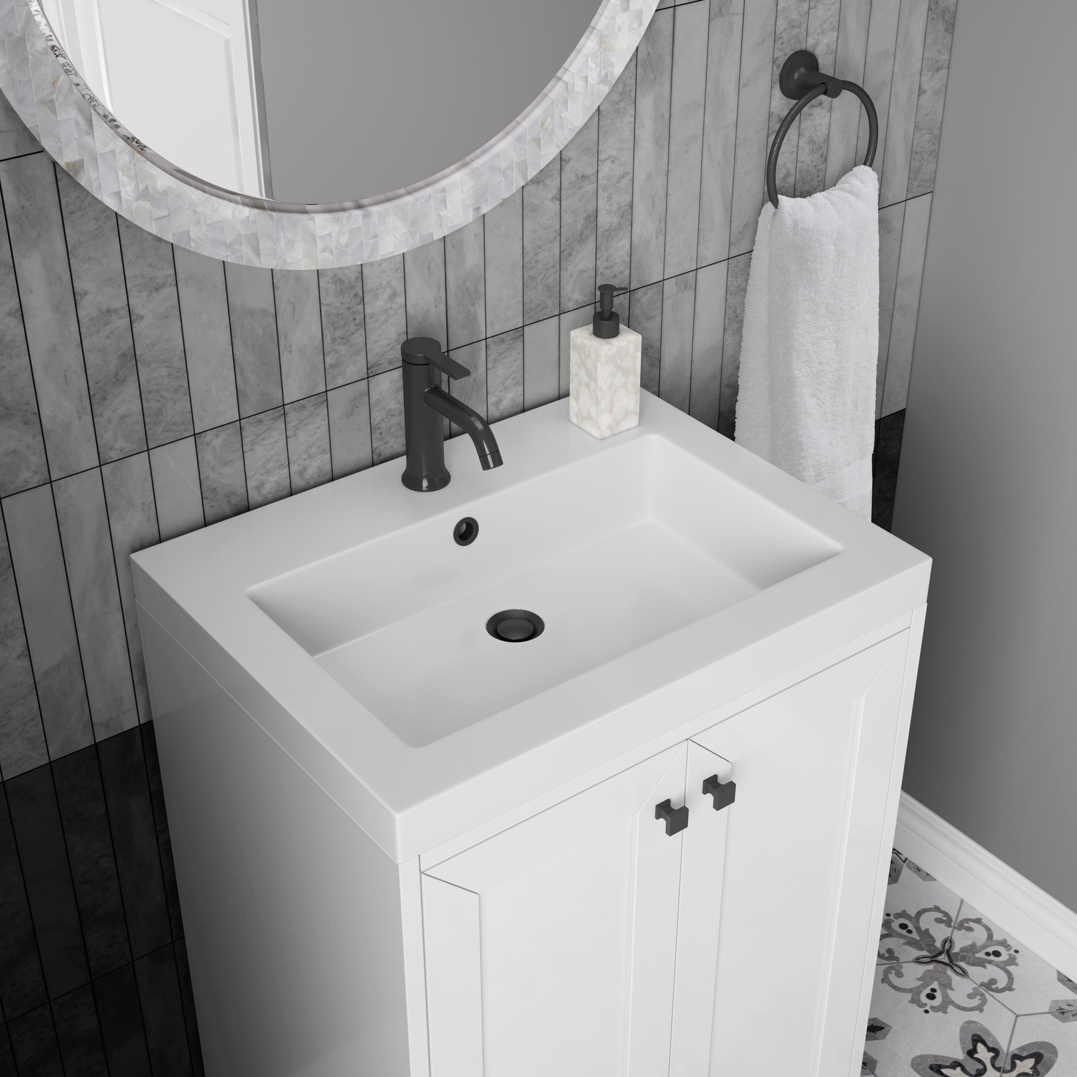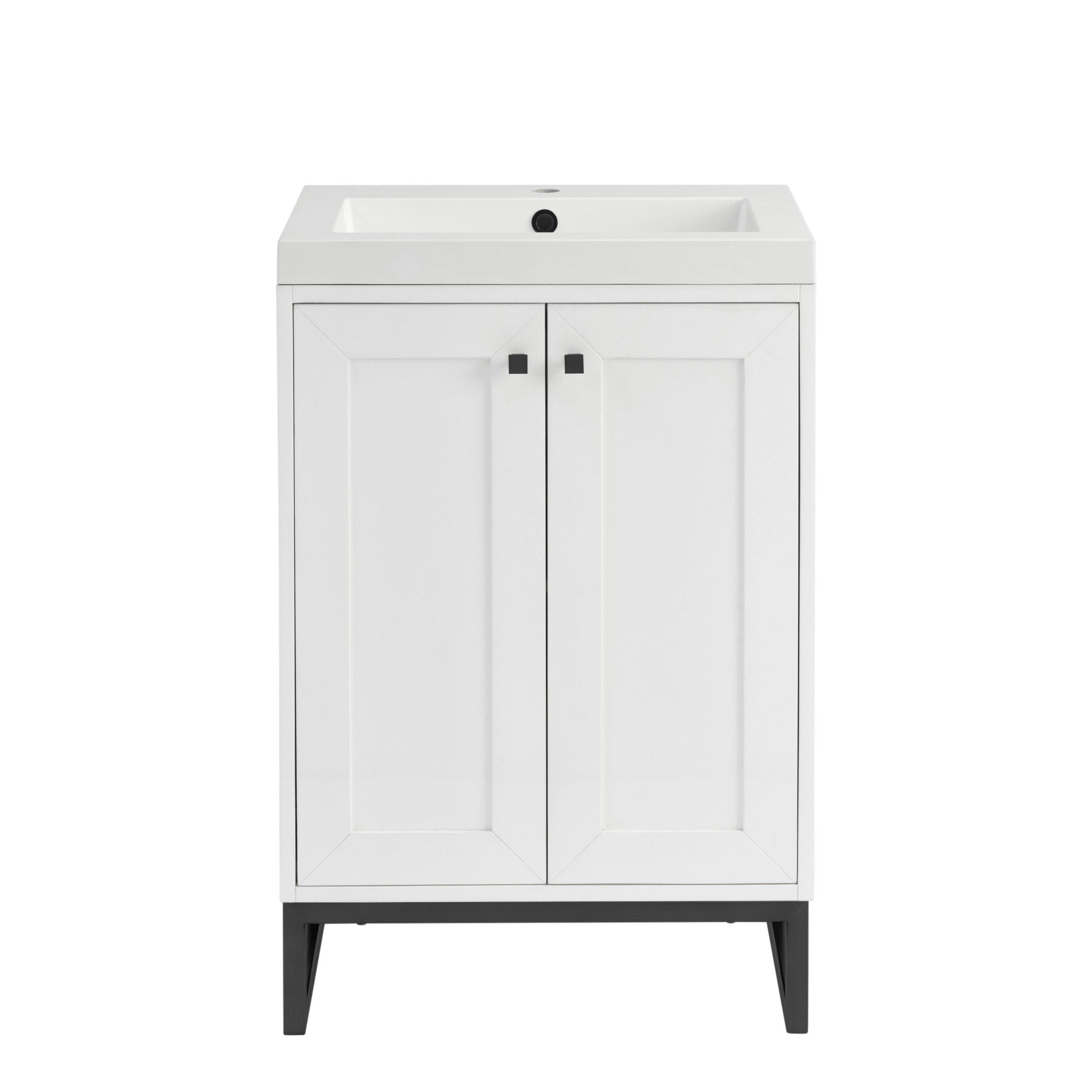 Tailor the look of your bathroom with the Chianti 24 in. Glossy White and Matte Black Single Sink Vanity with White Glossy Composite Stone Top featuring gorgeous solid wood, plywood in white with 2 doors, 0 drawers, and 1 shelves. This piece is completed with beautiful polished brass hardware and a single integral white sink. The Chianti 24 in. Glossy White and Matte Black Single Sink Vanity with White Glossy Composite Stone Top is a stunning addition to any bathroom setting.