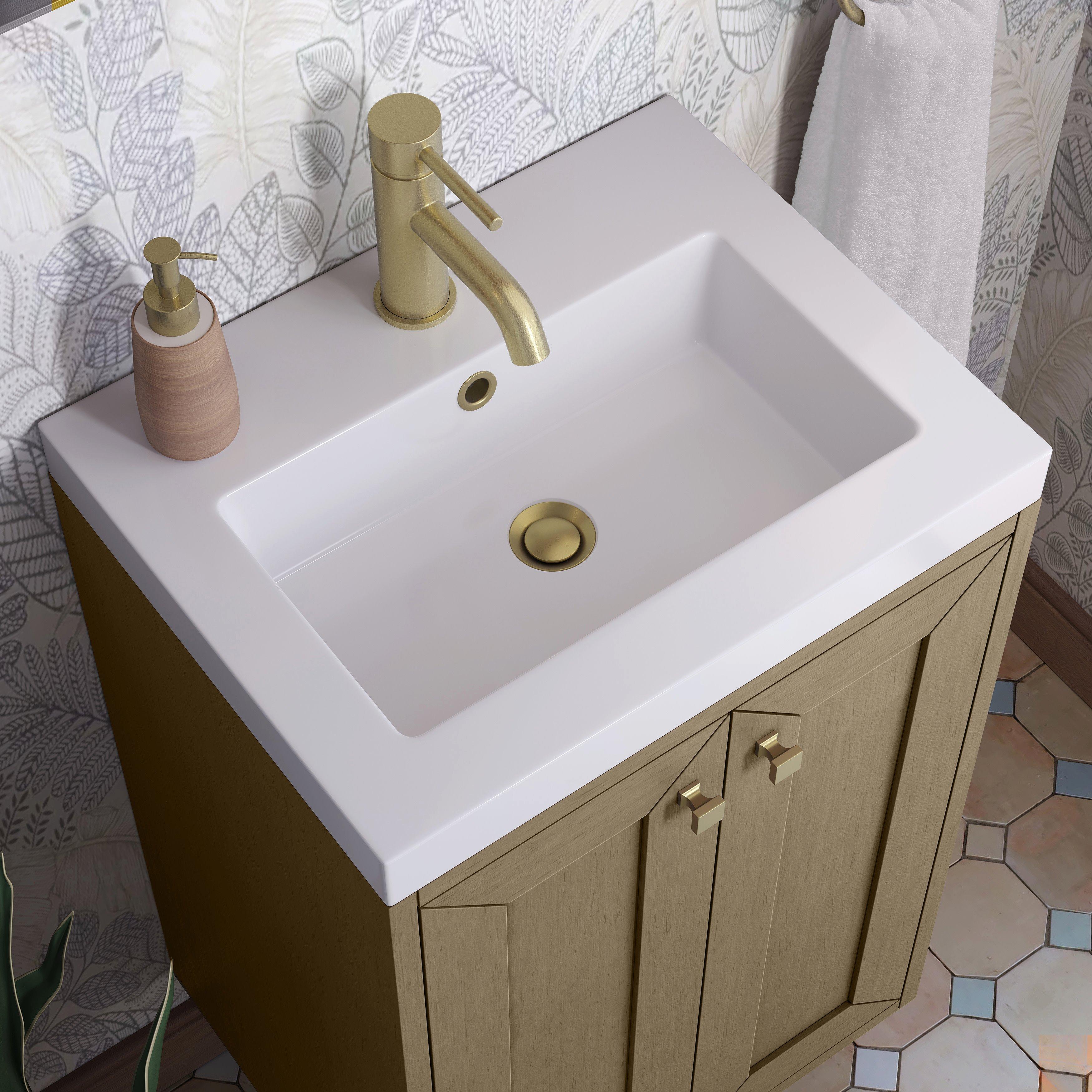 Complete your bathroom with the beautiful Chianti 20 in. Walnut Brown and Champagne Brass Single Sink Vanity with White Glossy Composite Stone Top. This freestanding features durable solid wood, plywood cabinets in stunning brown with a n/a n/a vanity top and satin nickel hardware. A charming n/a n/a sink in brilliant n/a is included. The Chianti 20 in. Walnut Brown and Champagne Brass Single Sink Vanity with White Glossy Composite Stone Top is a versatile choice to customize multiple bathroom settings.