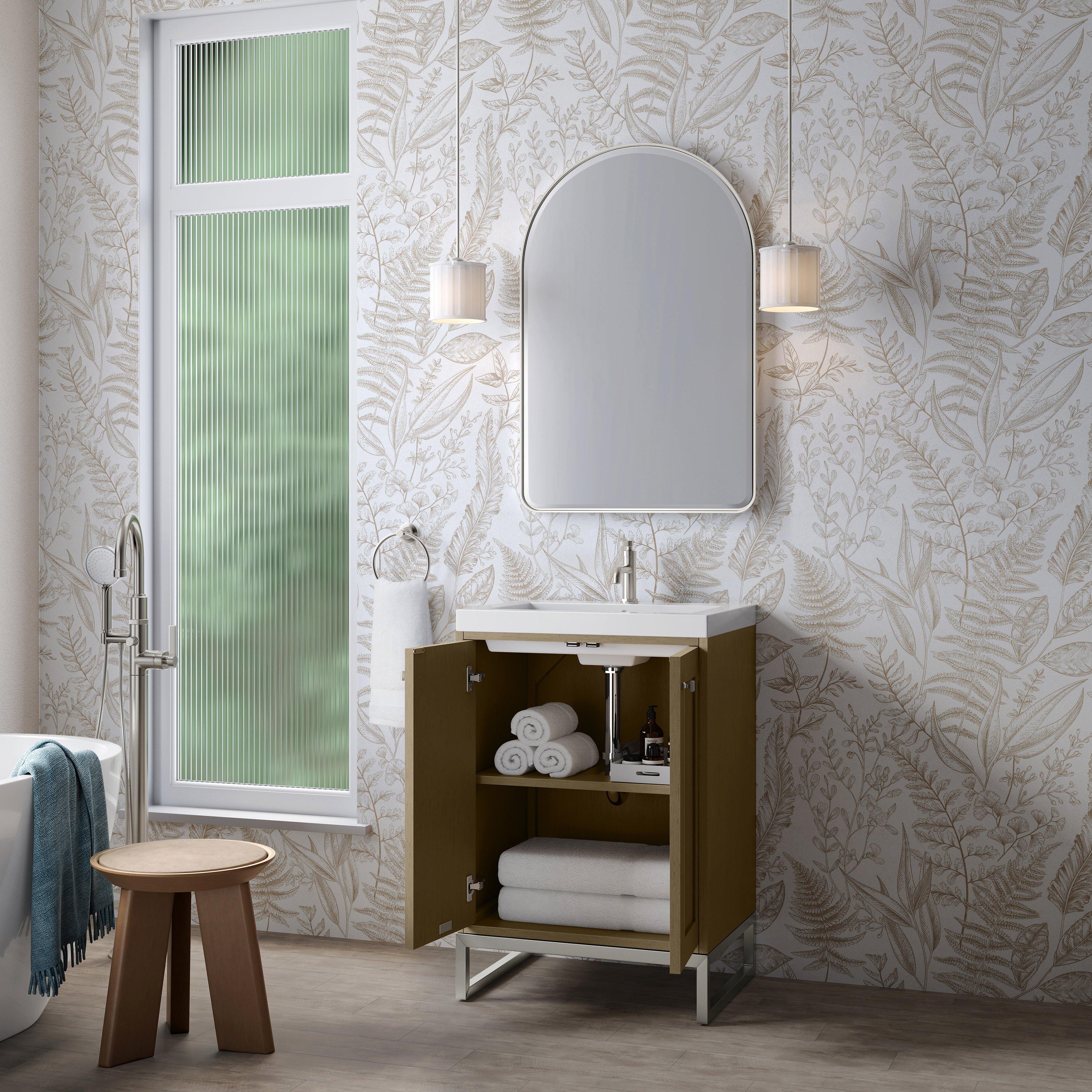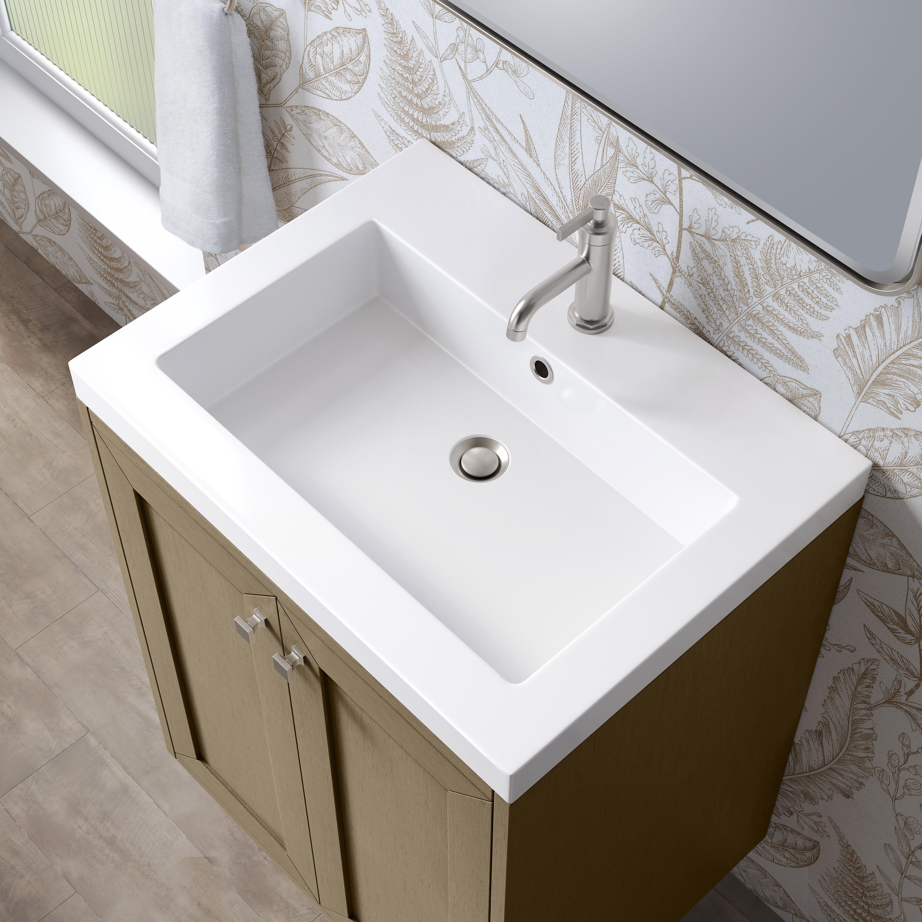 Complete your bathroom with the beautiful Chianti 24 in. Walnut Brown and Brushed Nickel Single Sink Vanity with White Glossy Composite Stone Top. This freestanding features durable solid wood, plywood cabinets in stunning brown with a white composite vanity top and satin nickel hardware. A charming single integral sink in brilliant white is included. The Chianti 24 in. Walnut Brown and Brushed Nickel Single Sink Vanity with White Glossy Composite Stone Top is a versatile choice to customize multiple bathroom settings.