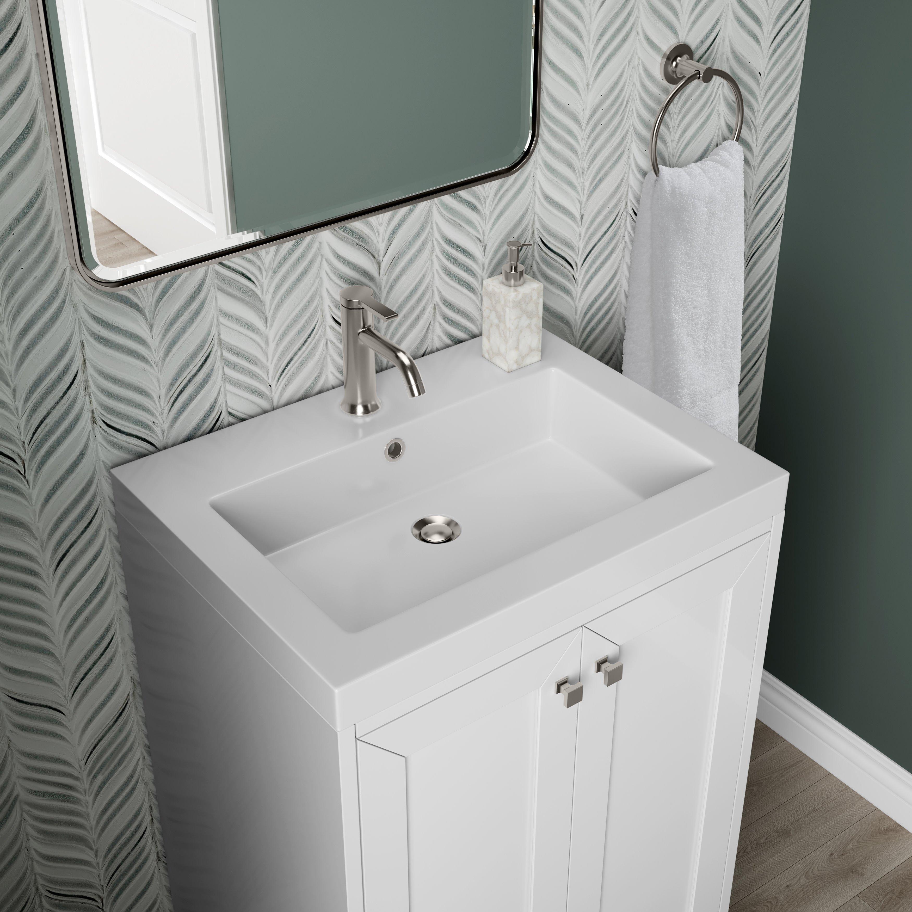 Tailor the look of your bathroom with the Chianti 24 in. Glossy White and Brushed Nicekl Single Sink Vanity with White Glossy Composite Stone Top featuring gorgeous solid wood, plywood in white with 2 doors, 0 drawers, and 1 shelves. This piece is completed with beautiful satin nickel hardware and a single integral white sink. The Chianti 24 in. Glossy White and Brushed Nicekl Single Sink Vanity with White Glossy Composite Stone Top is a stunning addition to any bathroom setting.