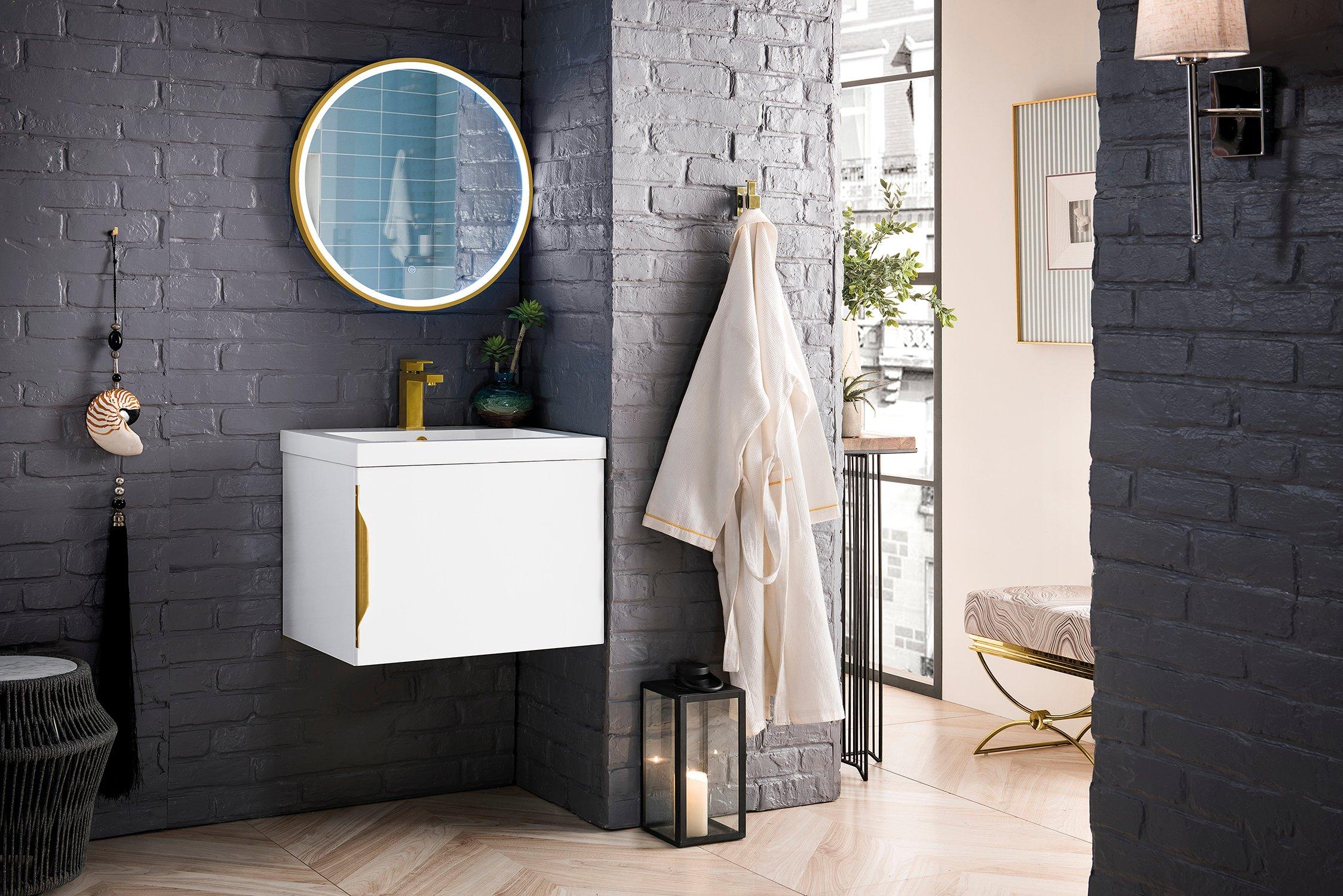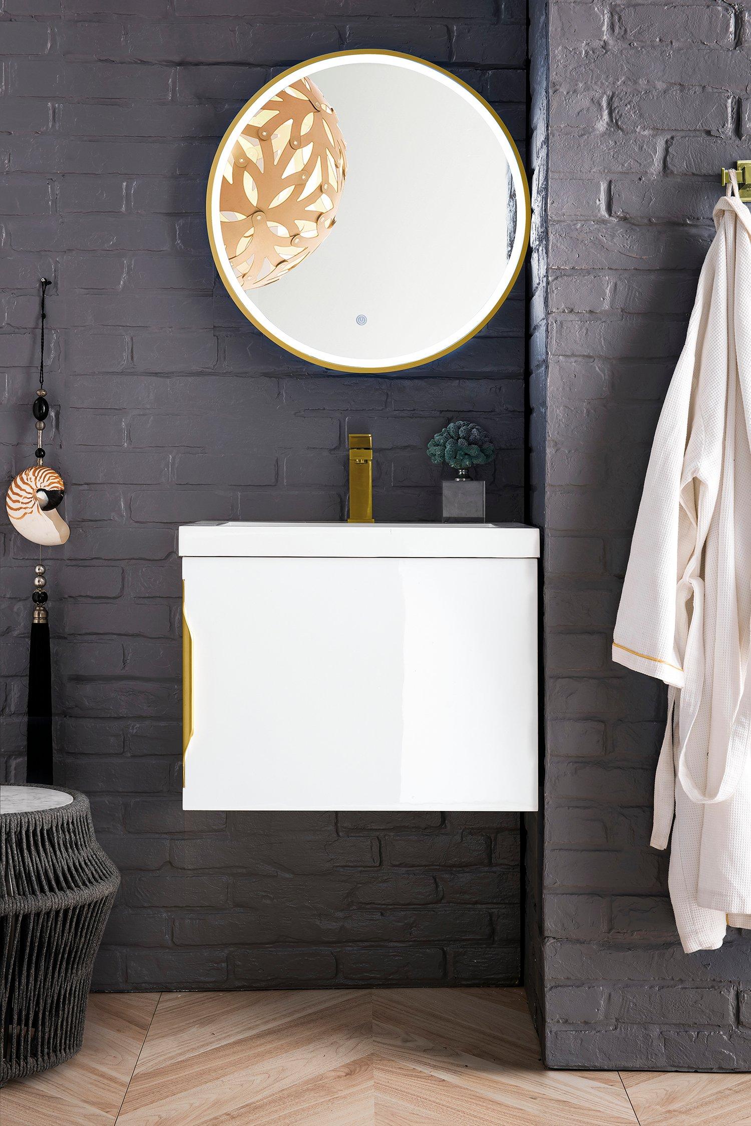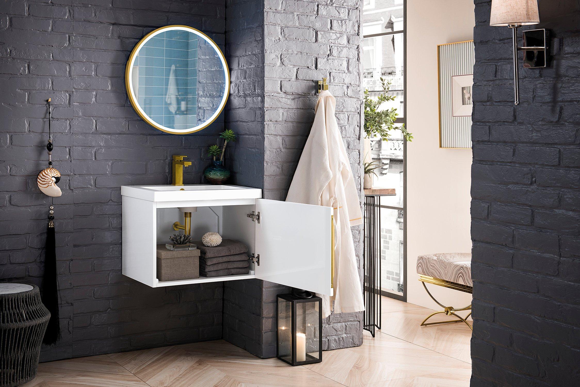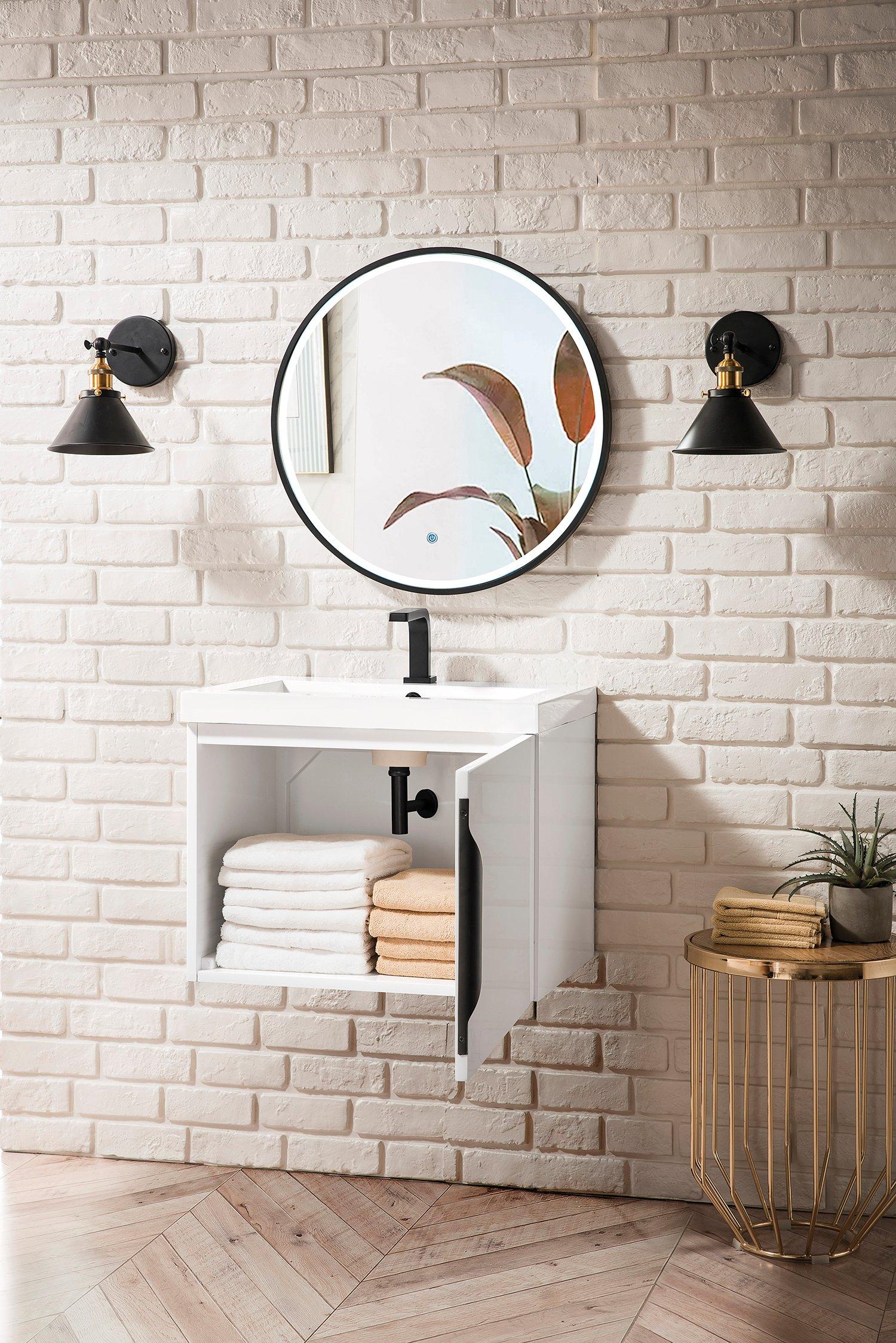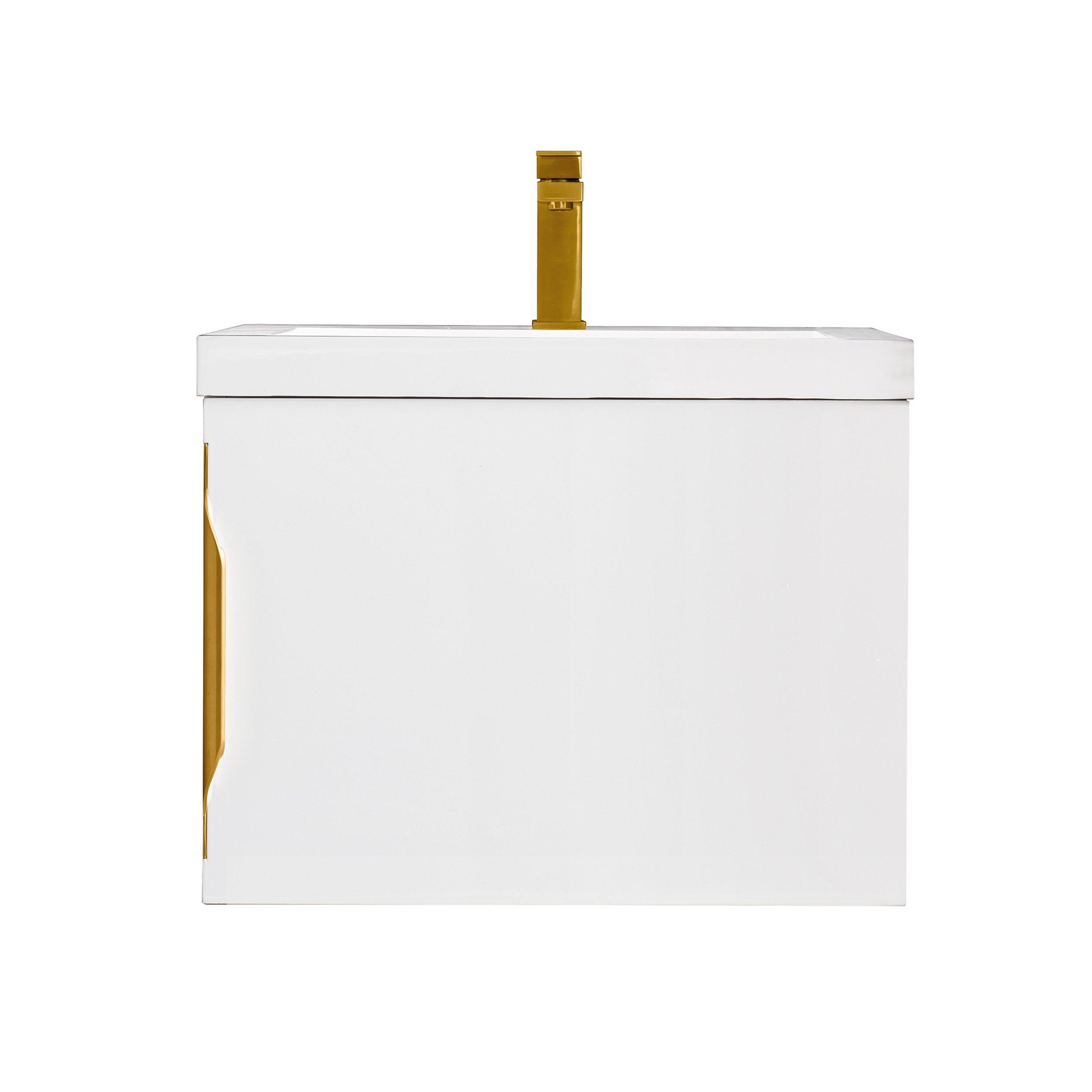Complete your bathroom with the beautiful Columbia 24 in. Glossy White Vanity with Glossy White Top. This wall mounted features durable solid wood, veneer cabinets in stunning white with a white solid surface vanity top and brushed silver hardware. A charming single integral sink in brilliant white is included. The Columbia 24 in. Glossy White Vanity with Glossy White Top is a versatile choice to customize multiple bathroom settings.
