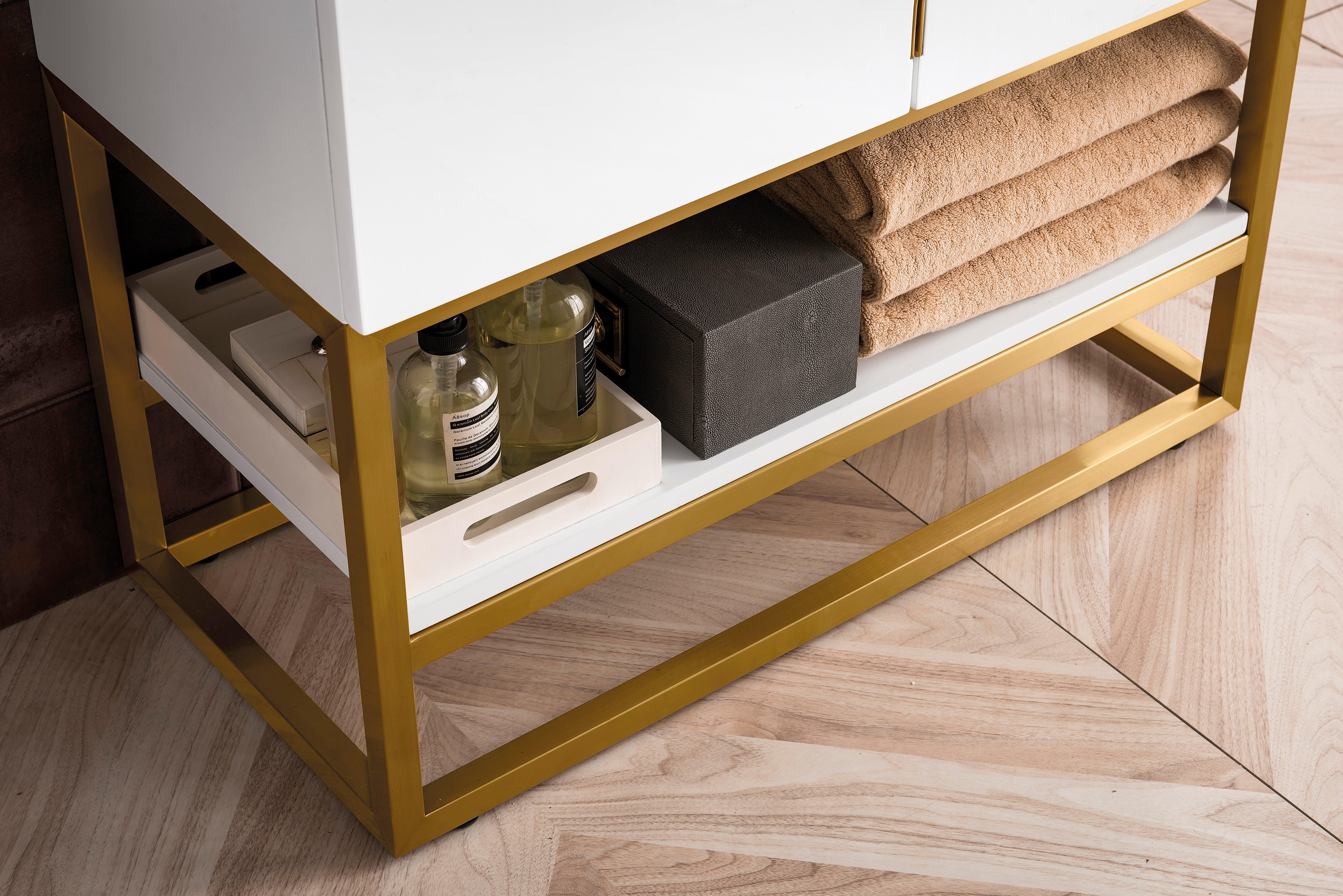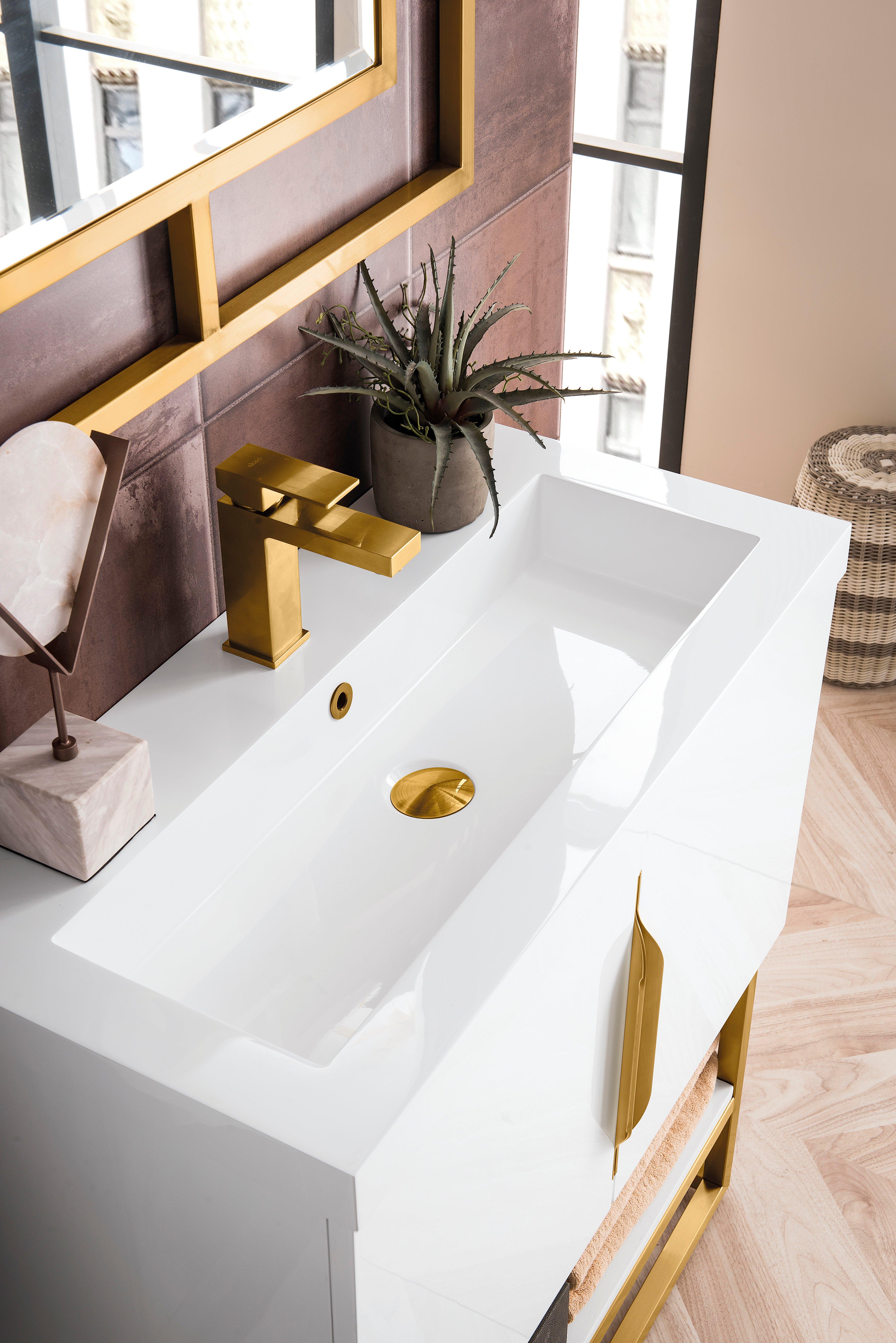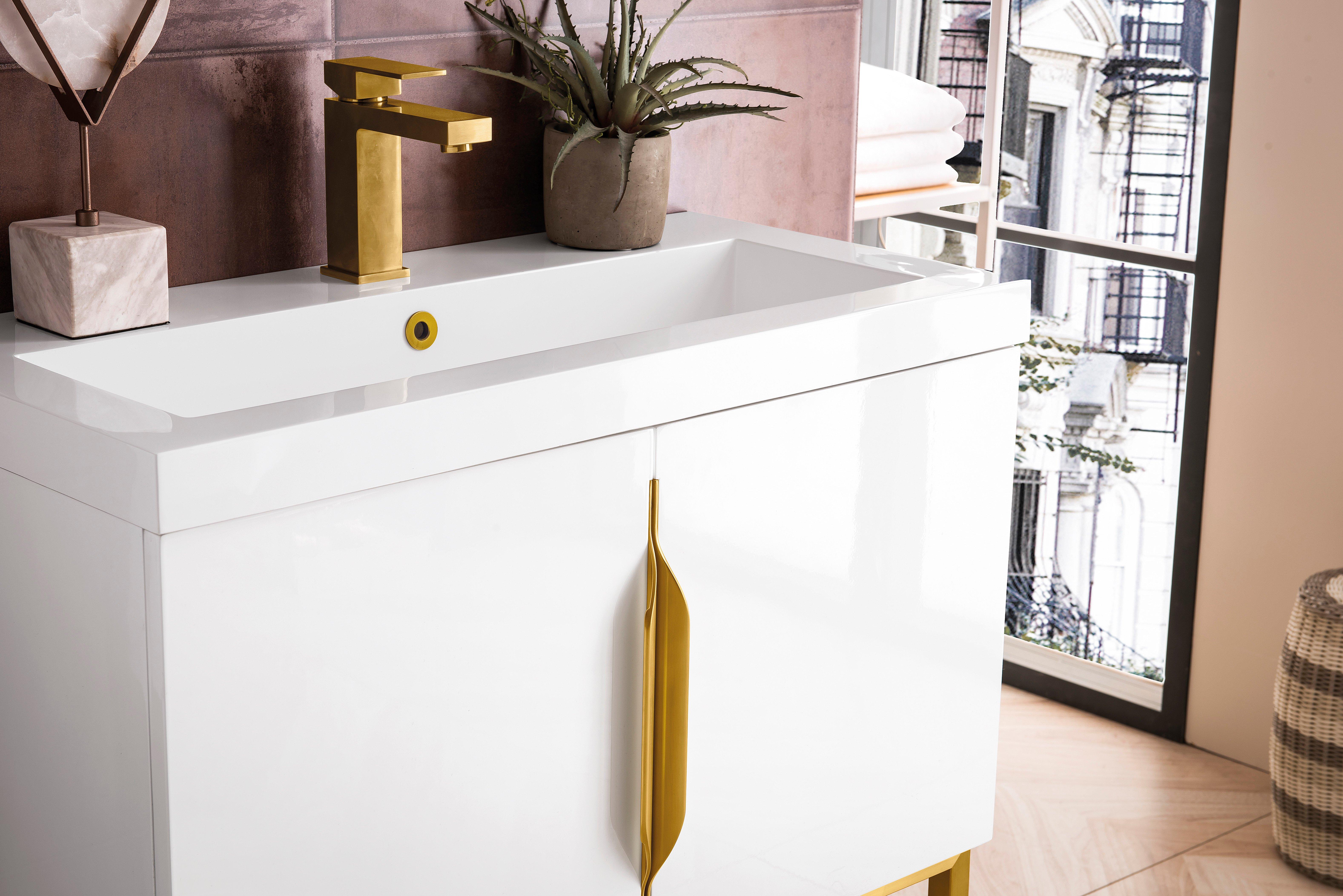 Tailor the look of your bathroom with the Columbia 31.5 in. Glossy White and Radiant Gold Vanity with Glossy White Top featuring gorgeous solid wood, plywood in white with 2 doors, 0 drawers, and 1 shelves. This piece is completed with beautiful brushed gold hardware and a single integral white sink. The Columbia 31.5 in. Glossy White and Radiant Gold Vanity with Glossy White Top is a stunning addition to any bathroom setting.
