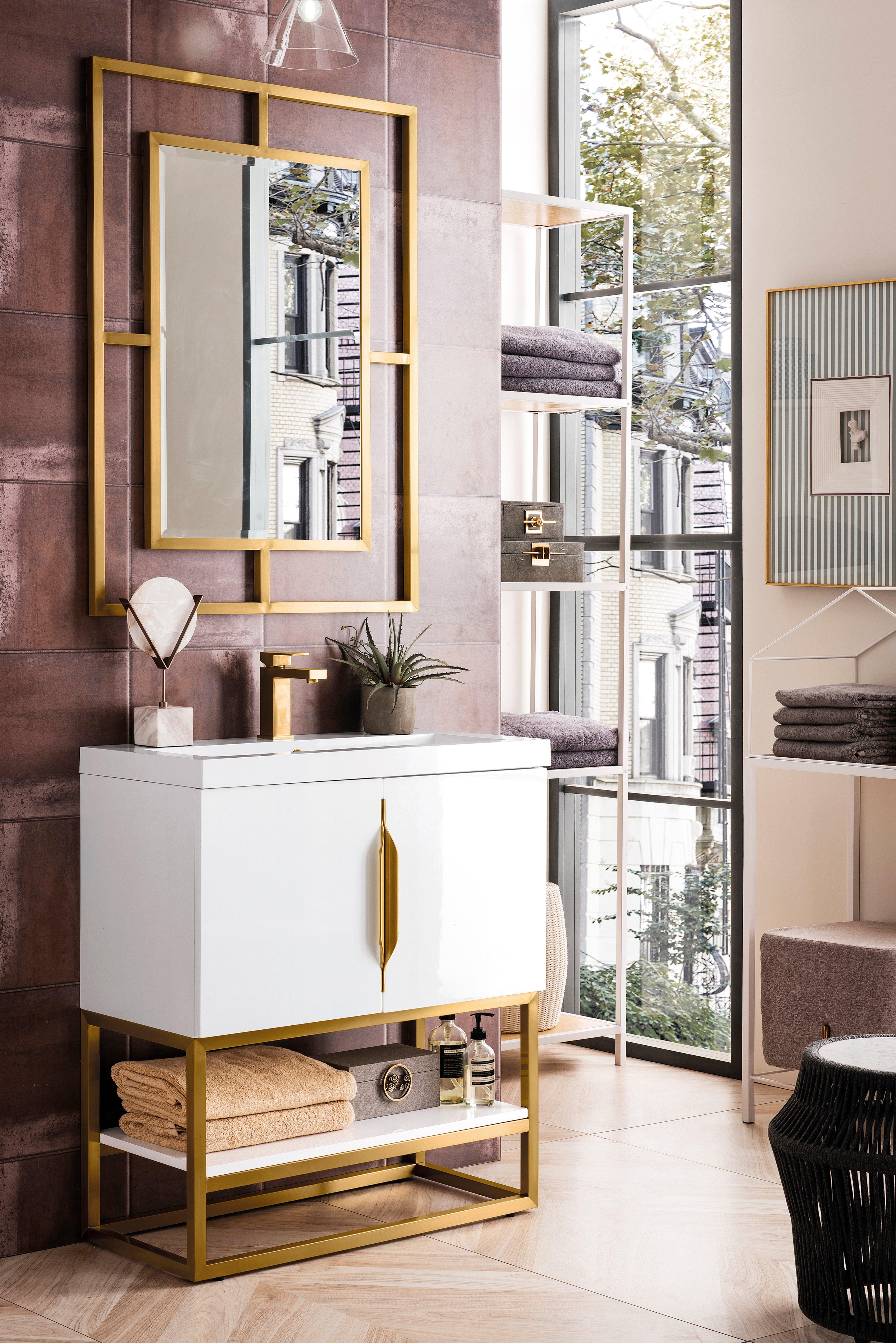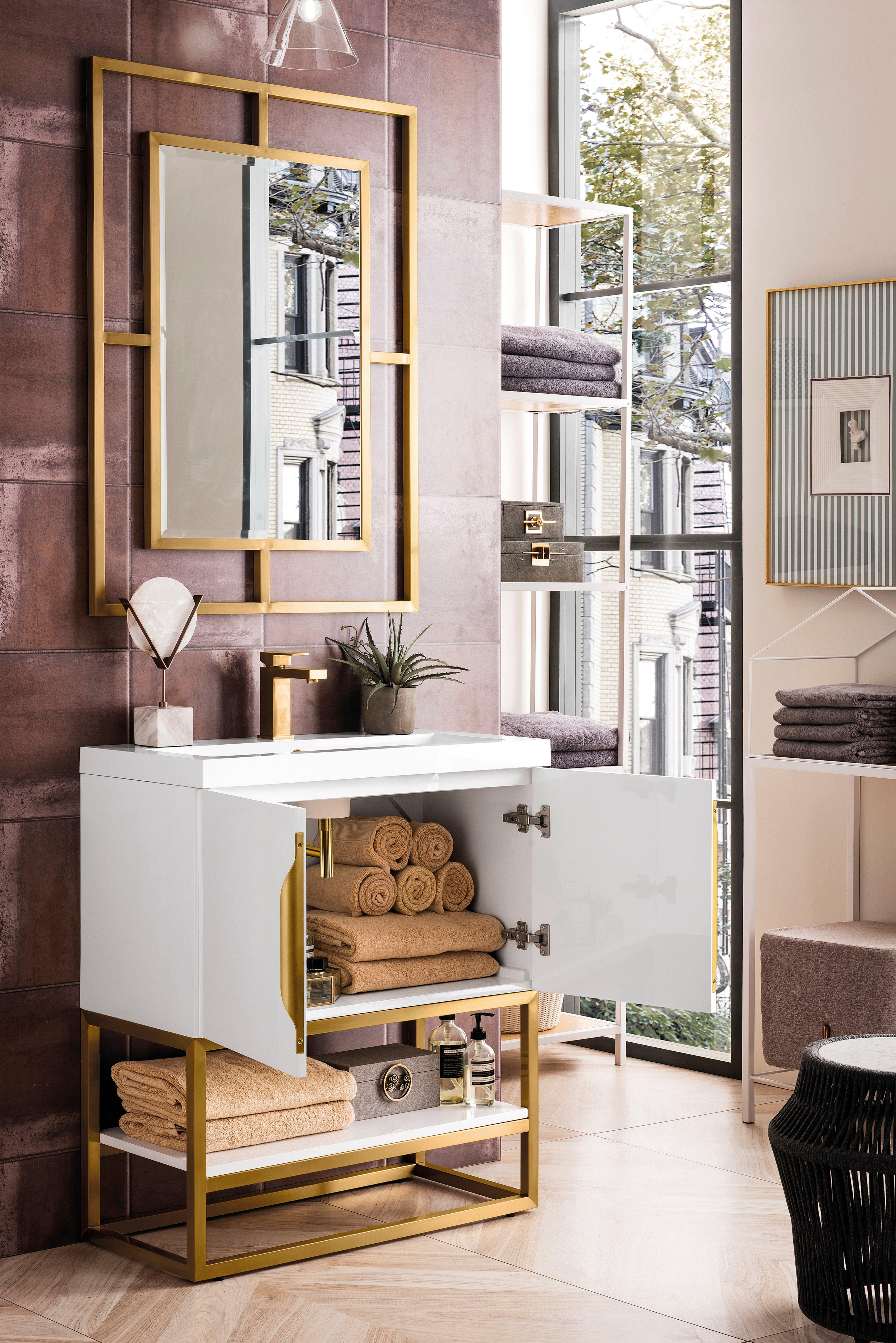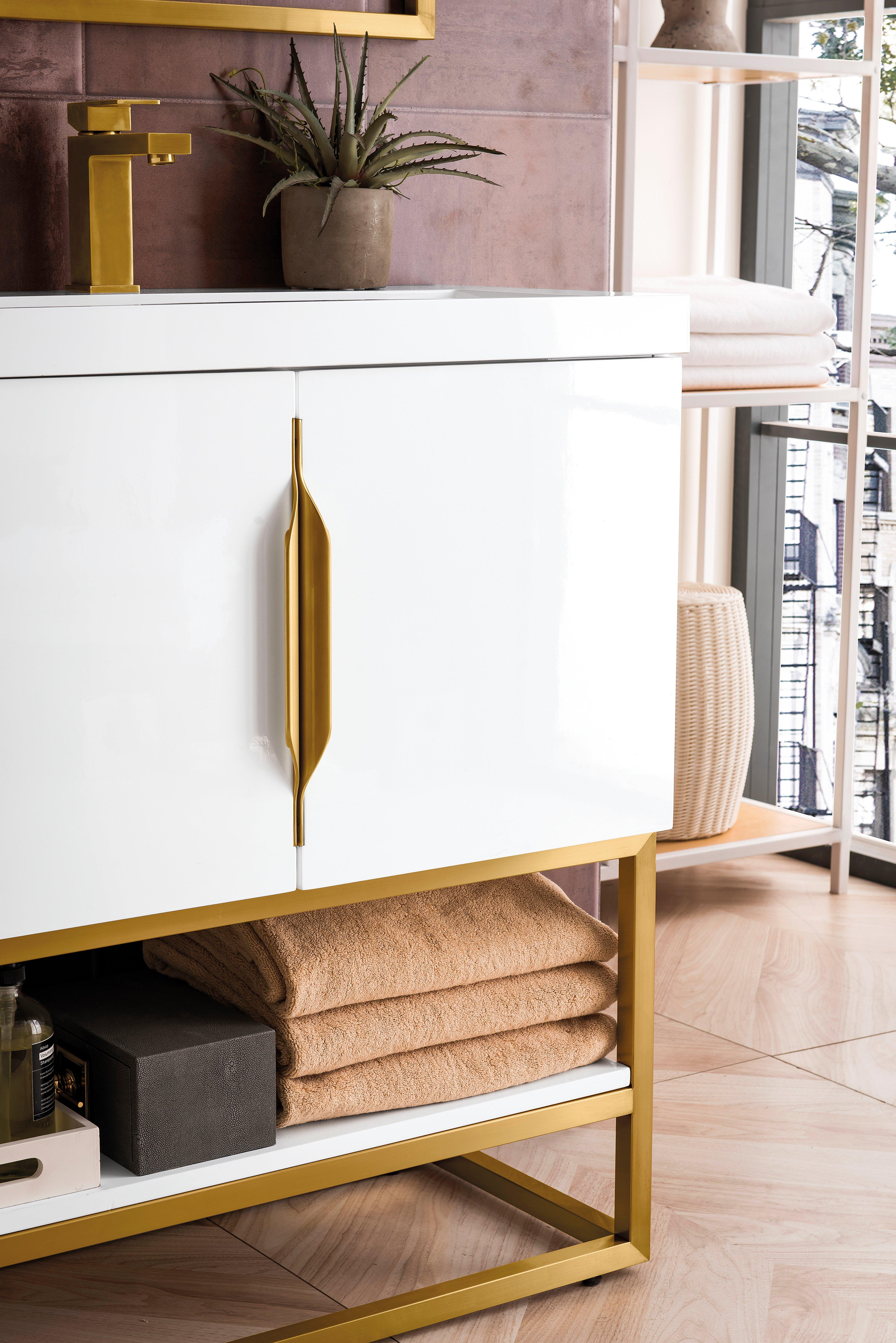 Tailor the look of your bathroom with the Columbia 31.5 in. Glossy White and Radiant Gold Vanity with Glossy White Top featuring gorgeous solid wood, plywood in white with 2 doors, 0 drawers, and 1 shelves. This piece is completed with beautiful brushed gold hardware and a single integral white sink. The Columbia 31.5 in. Glossy White and Radiant Gold Vanity with Glossy White Top is a stunning addition to any bathroom setting.