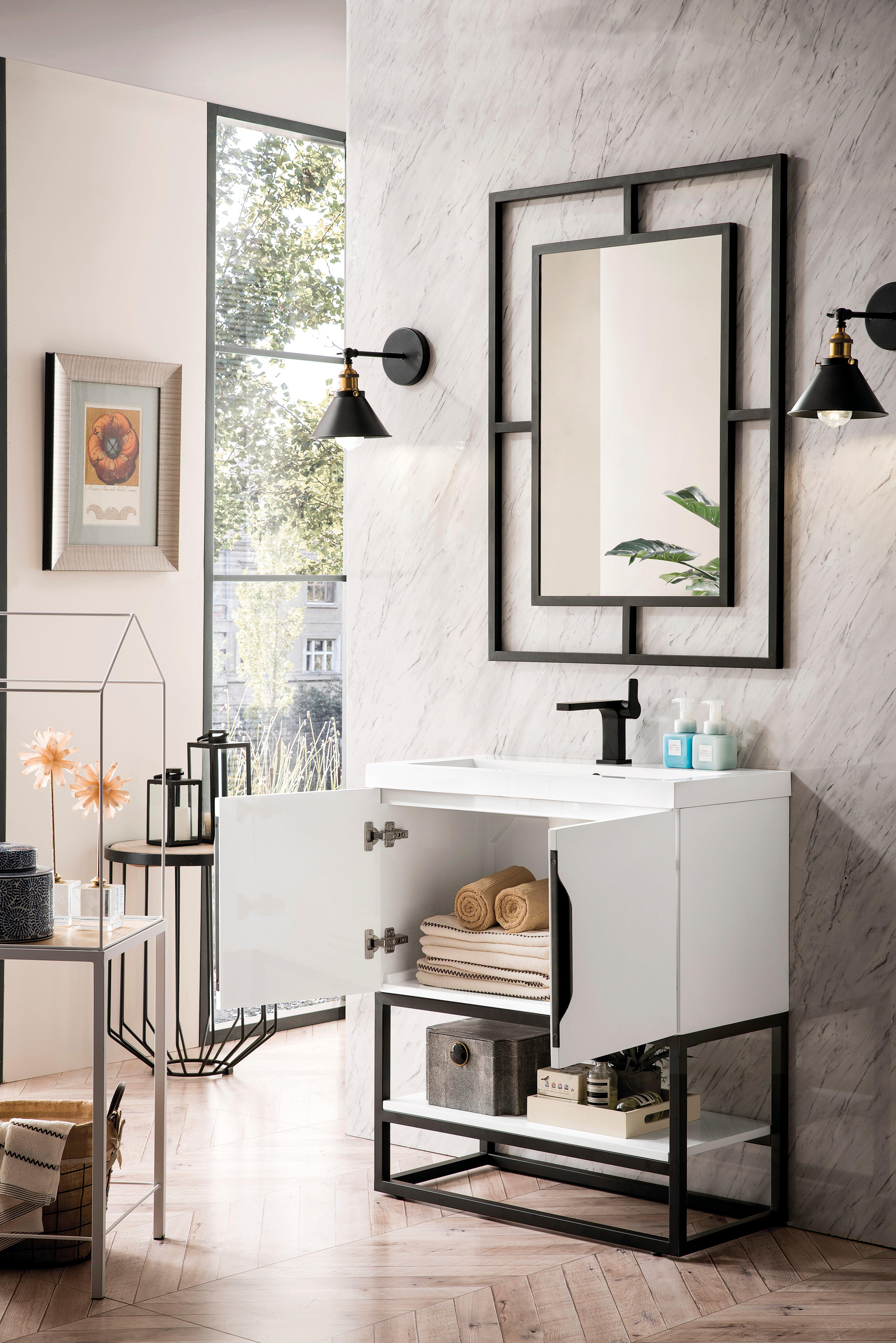 Tailor the look of your bathroom with the Columbia 31.5 in. Glossy White and Matte Black Vanity with Glossy White Top featuring gorgeous solid wood, plywood in white with 2 doors, 0 drawers, and 1 shelves. This piece is completed with beautiful matte black hardware and a single integral white sink. The Columbia 31.5 in. Glossy White and Matte Black Vanity with Glossy White Top is a stunning addition to any bathroom setting.