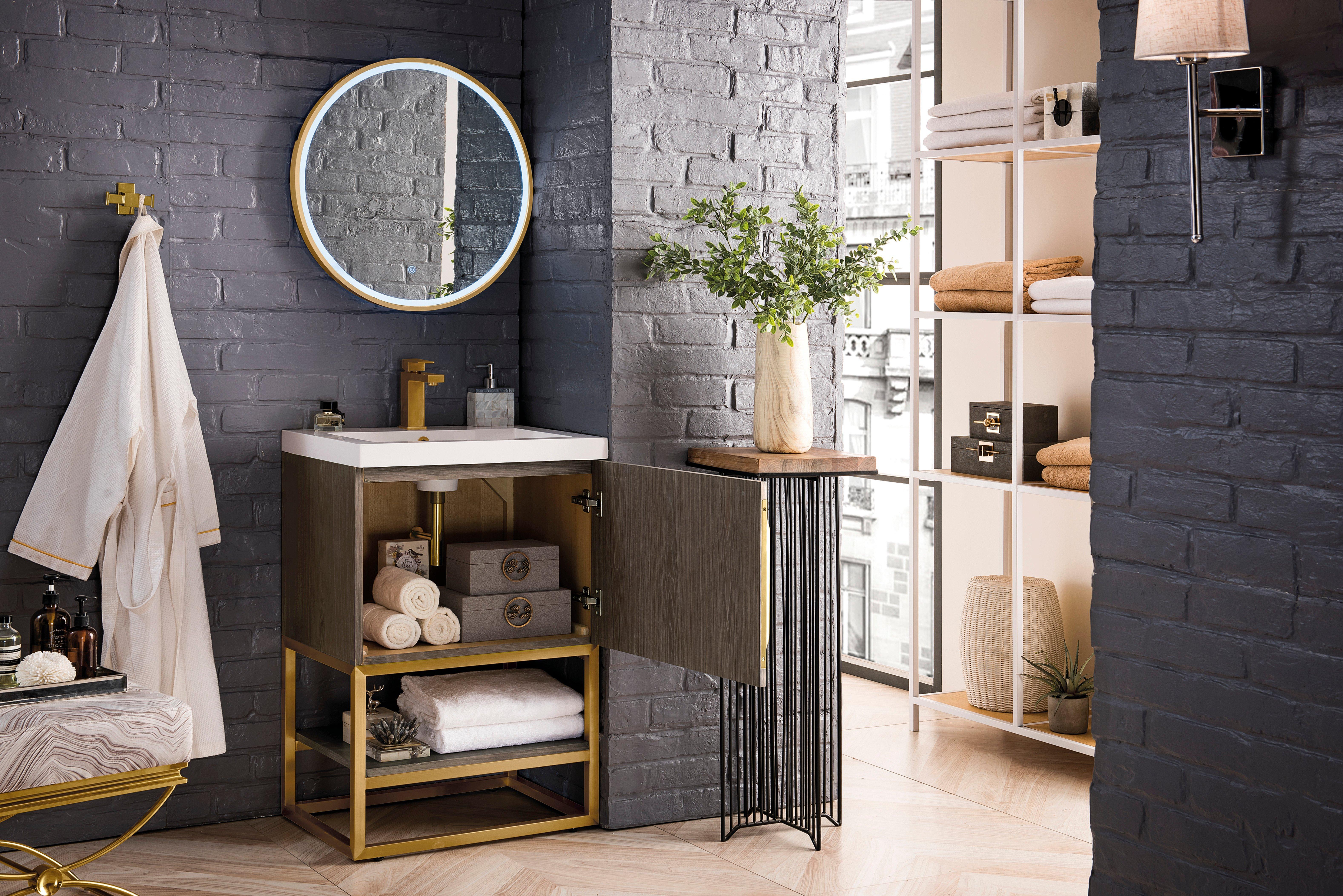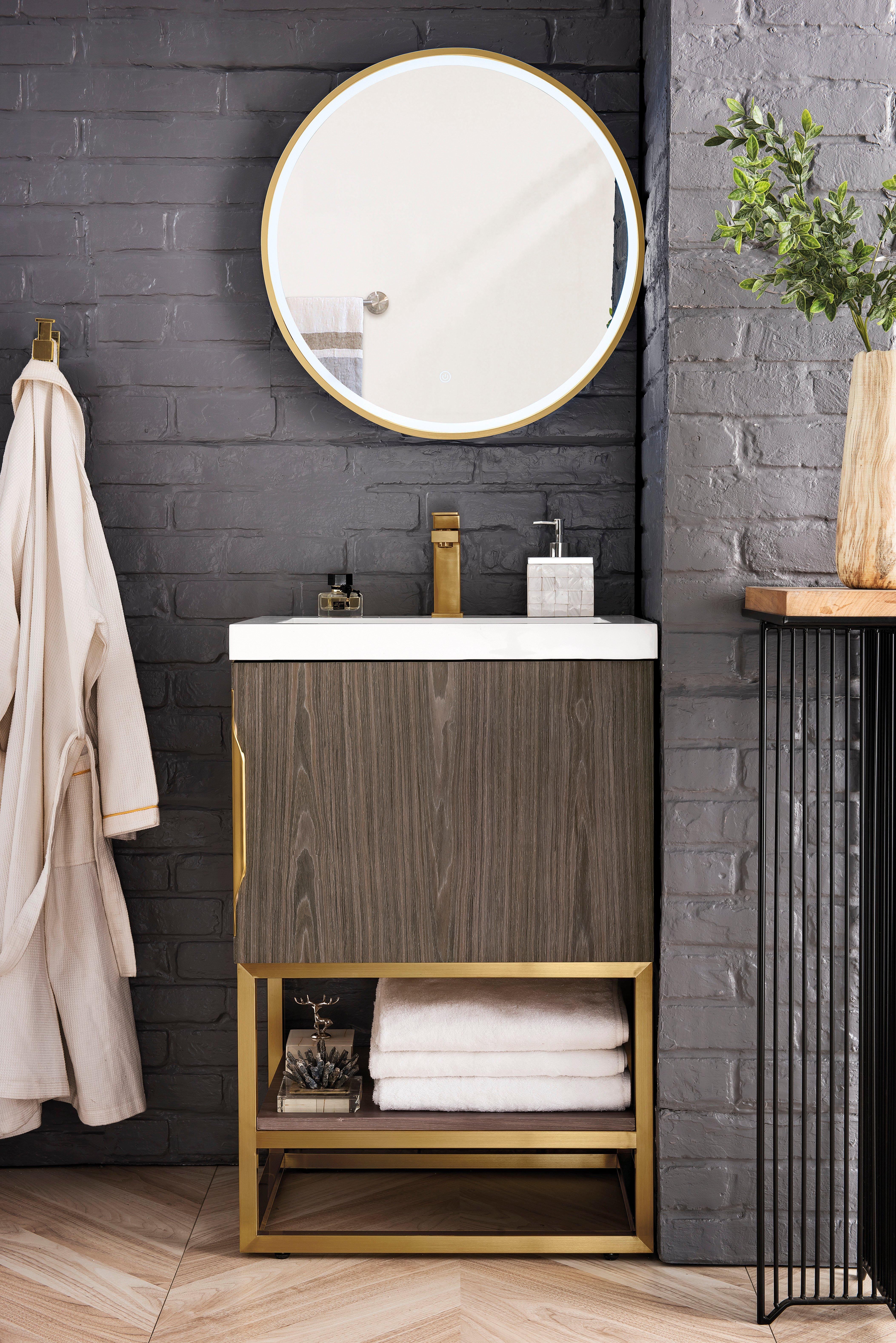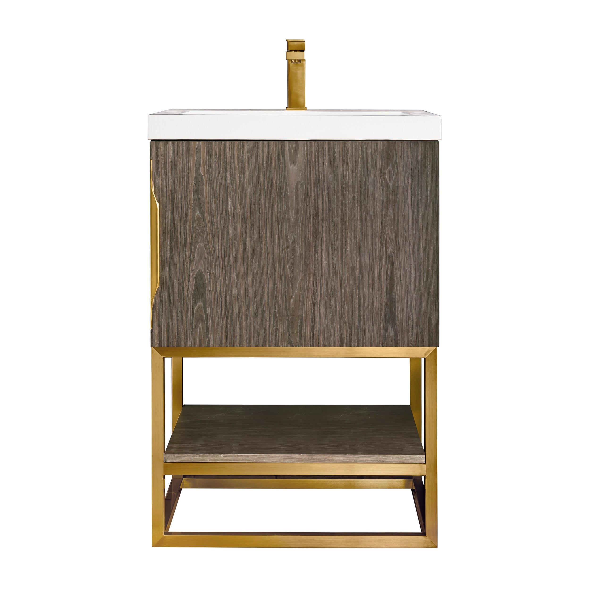 Complete your bathroom with the beautiful Columbia 24 in. Ash Gray and Radiant Gold Vanity with Glossy White Top. This freestanding features durable solid wood, veneer cabinets in stunning gray with a white manufactured stone vanity top and brushed silver hardware. A charming single integral sink in brilliant white is included. The Columbia 24 in. Ash Gray and Radiant Gold Vanity with Glossy White Top is a versatile choice to customize multiple bathroom settings.