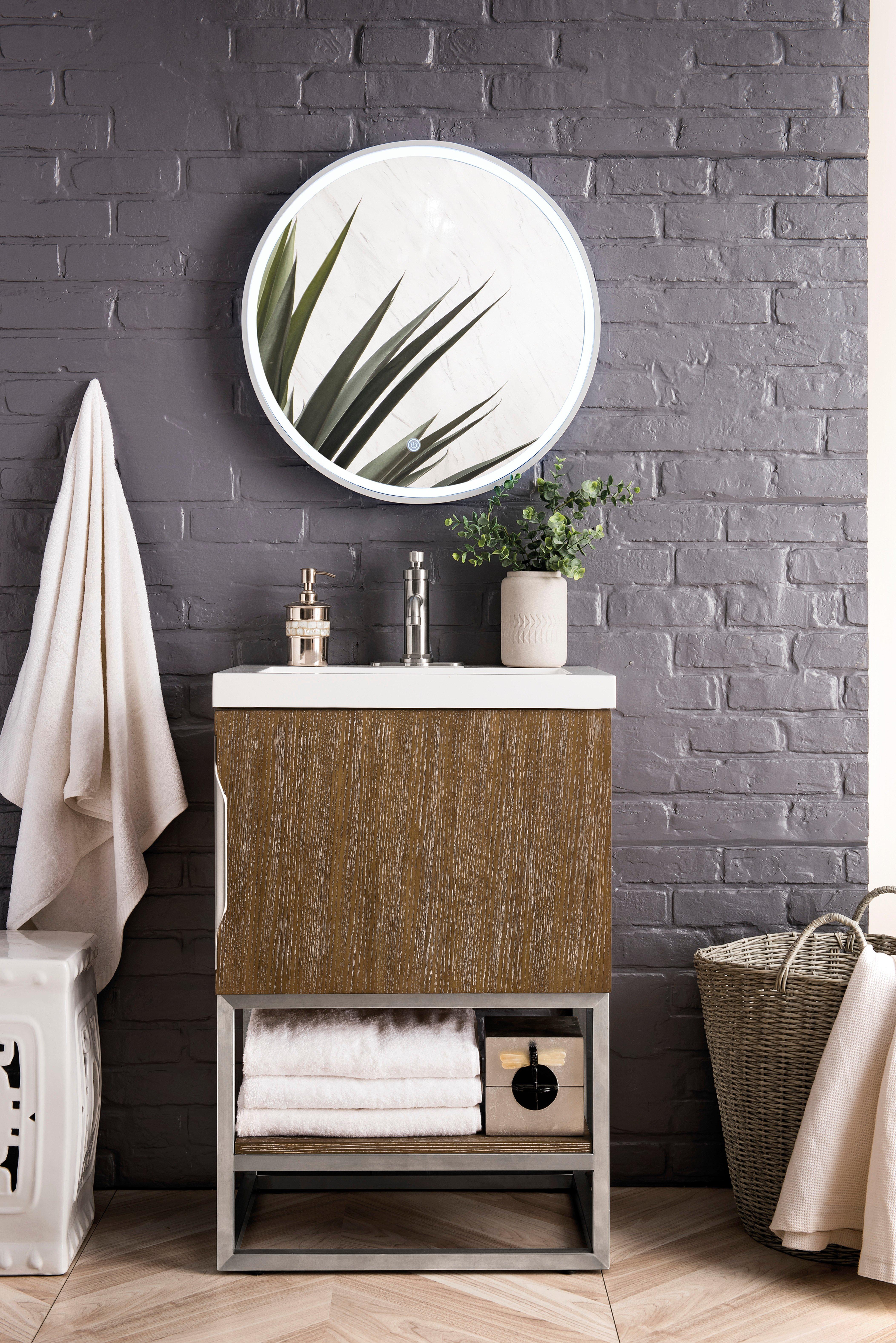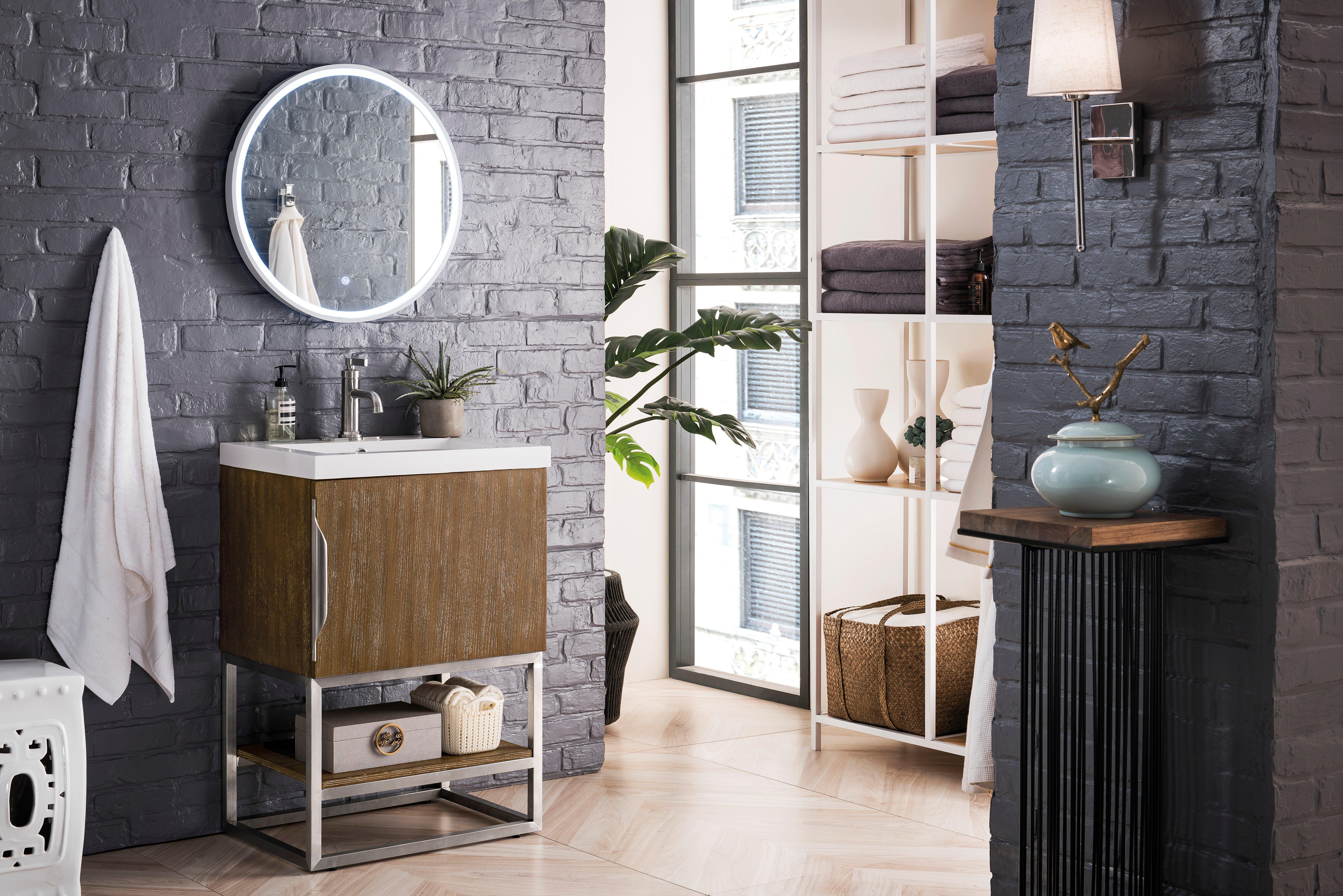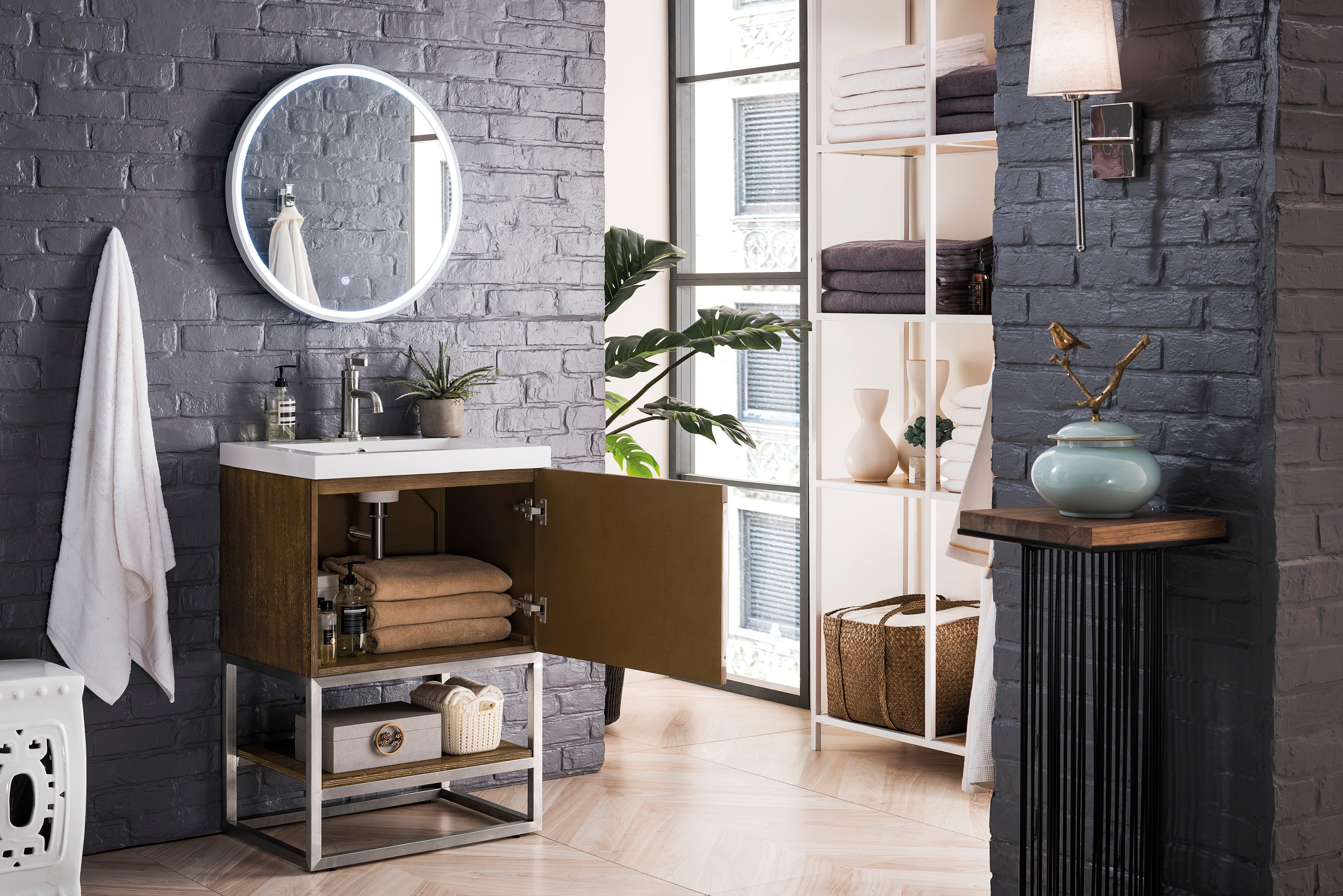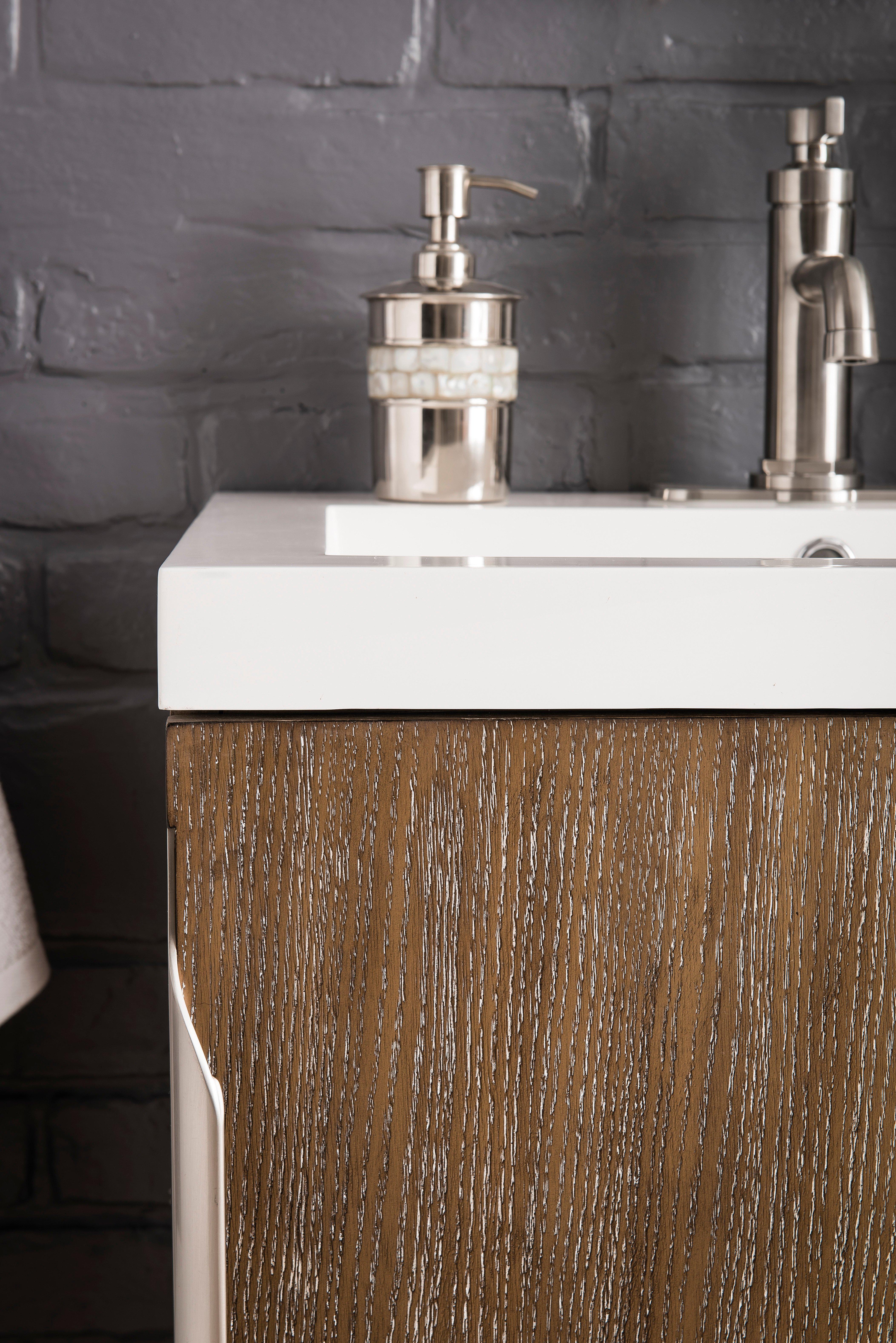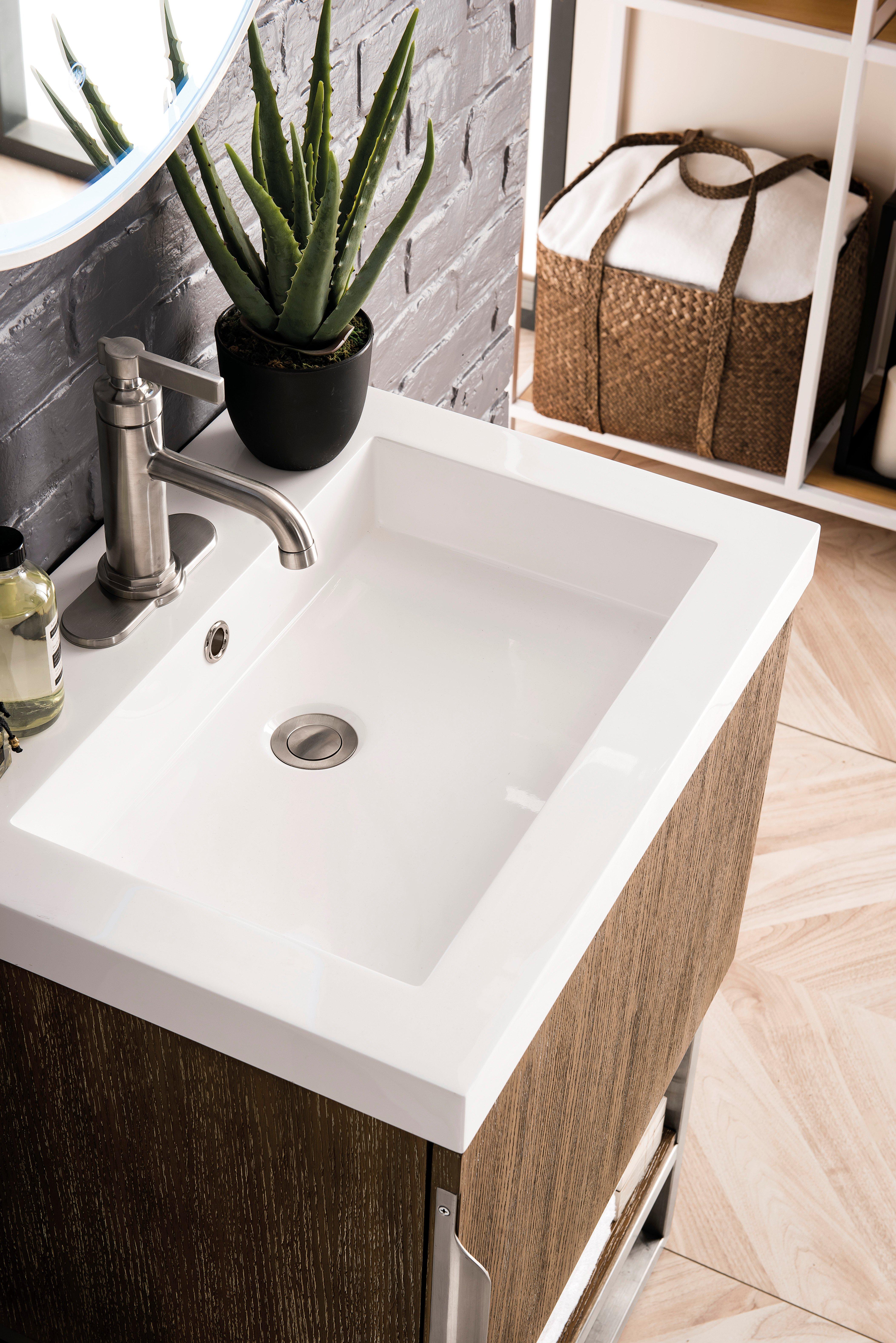 Complete your bathroom with the beautiful Columbia 24 in. Latte Oak and Brushed Nickel Vanity with Glossy White Top. This freestanding features durable solid wood, veneer cabinets in stunning brown with a white manufactured stone vanity top and brushed silver hardware. A charming single integral sink in brilliant white is included. The Columbia 24 in. Latte Oak and Brushed Nickel Vanity with Glossy White Top is a versatile choice to customize multiple bathroom settings.