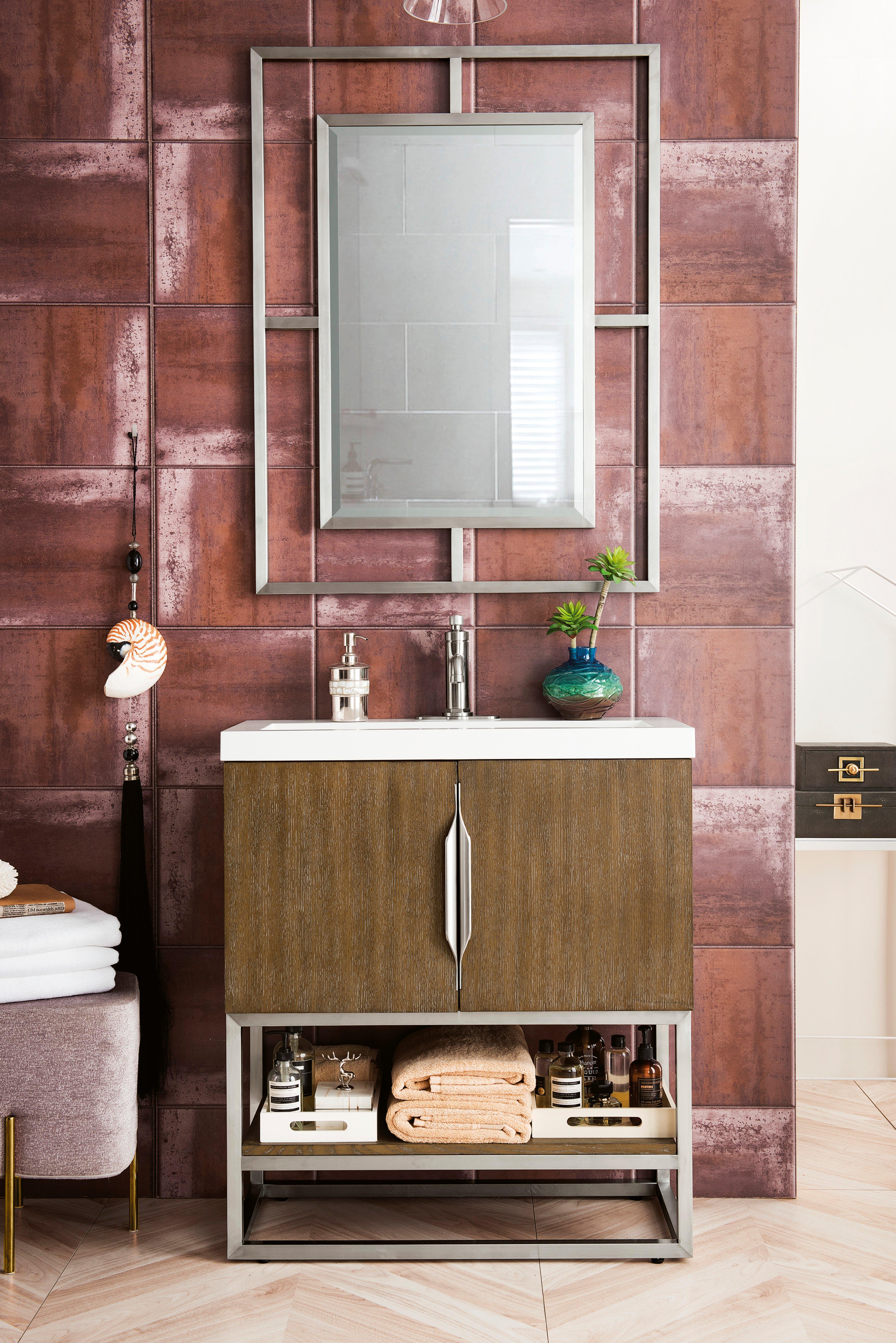 Complete your bathroom with the beautiful Columbia 31.5 in. Latte Oak and Brushed Nickel Vanity with Glossy White Top. This freestanding features durable solid wood, plywood cabinets in stunning brown with a white solid surface vanity top and brushed silver hardware. A charming single integral sink in brilliant white is included. The Columbia 31.5 in. Latte Oak and Brushed Nickel Vanity with Glossy White Top is a versatile choice to customize multiple bathroom settings.