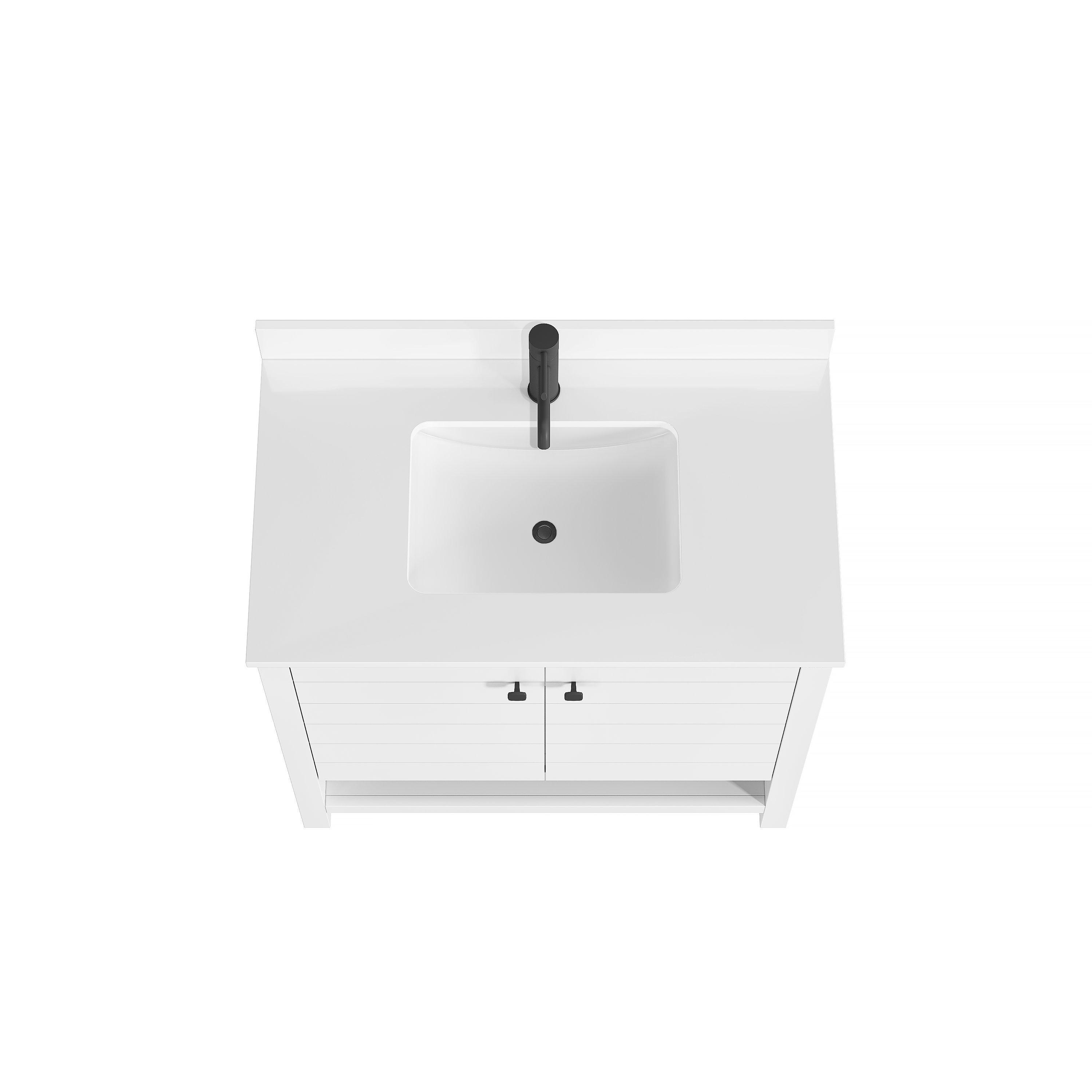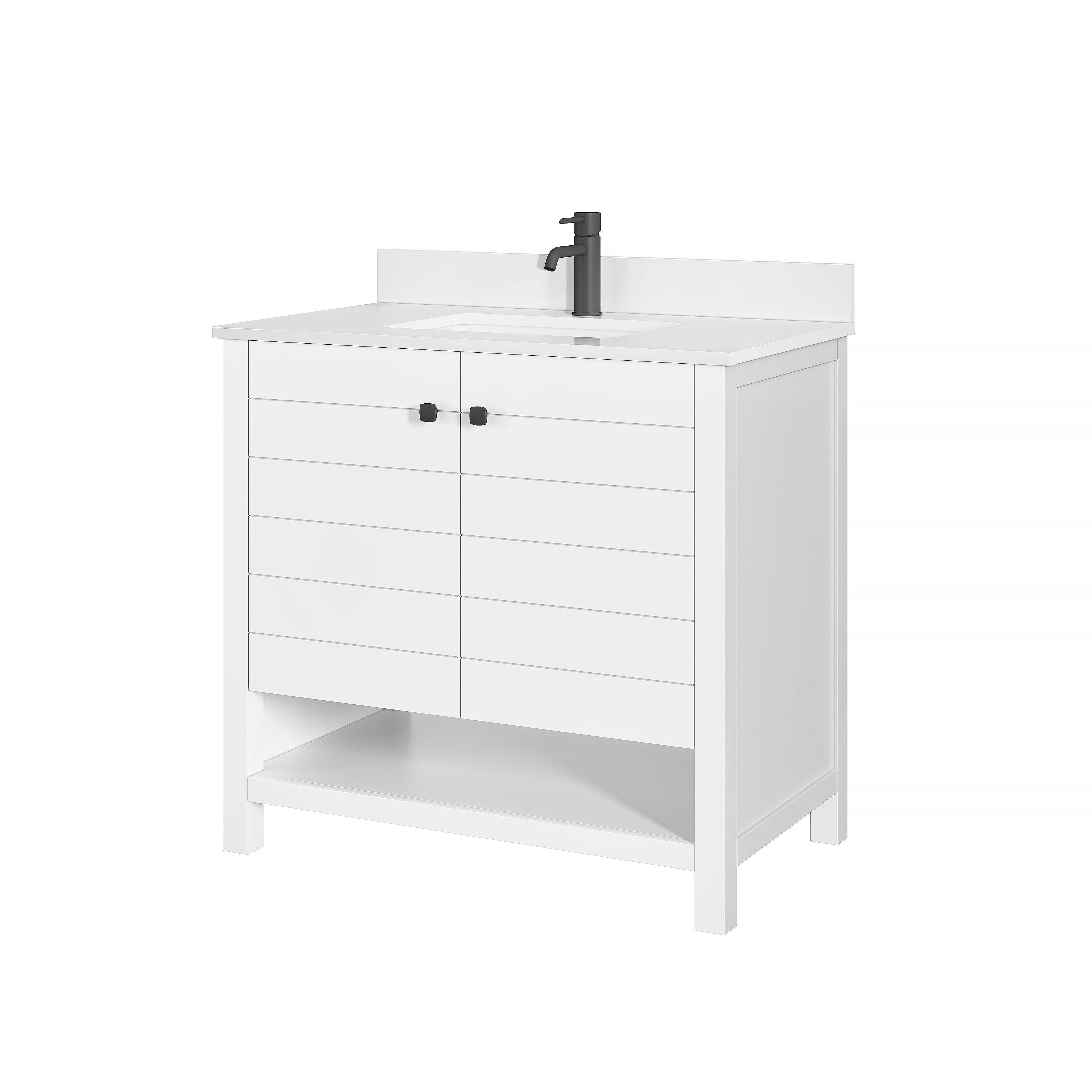 The Dover 37 in. White Vanity with Engineered Stone Top from Studio Design Collection is the perfect addition to any residential bathroom. This stylish single sink vanity combines functionality and elegance, making it a must-have for homeowners seeking a modern upgrade.