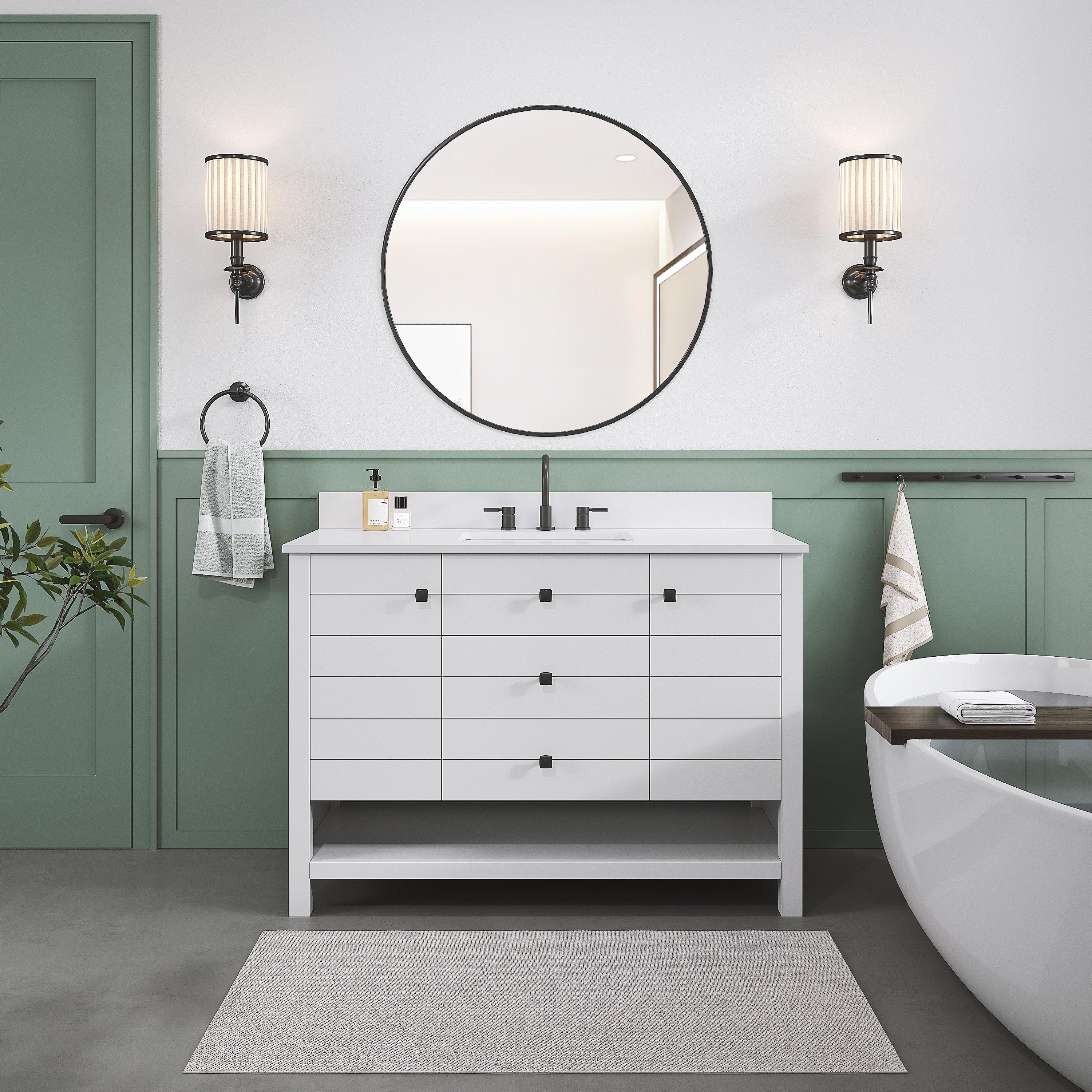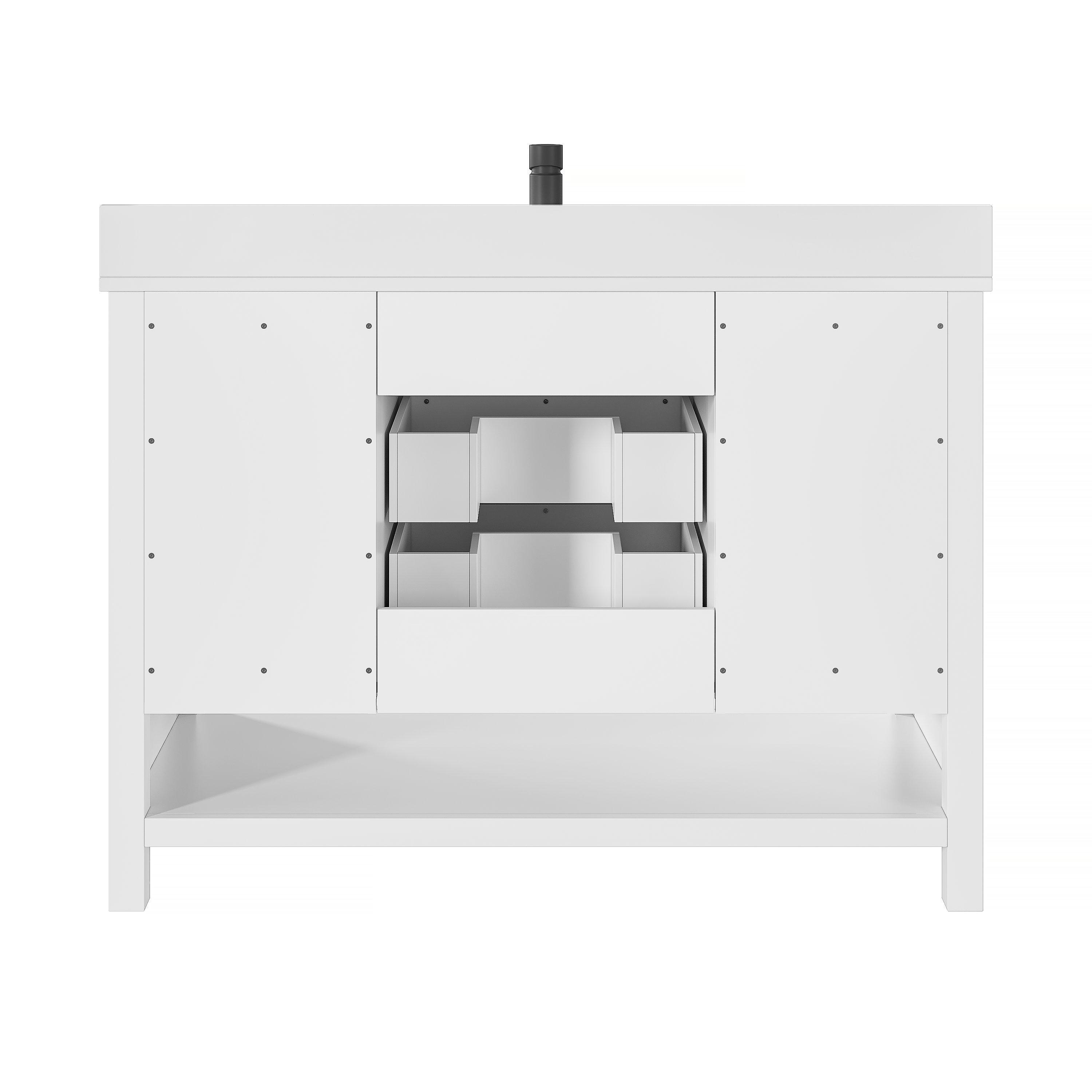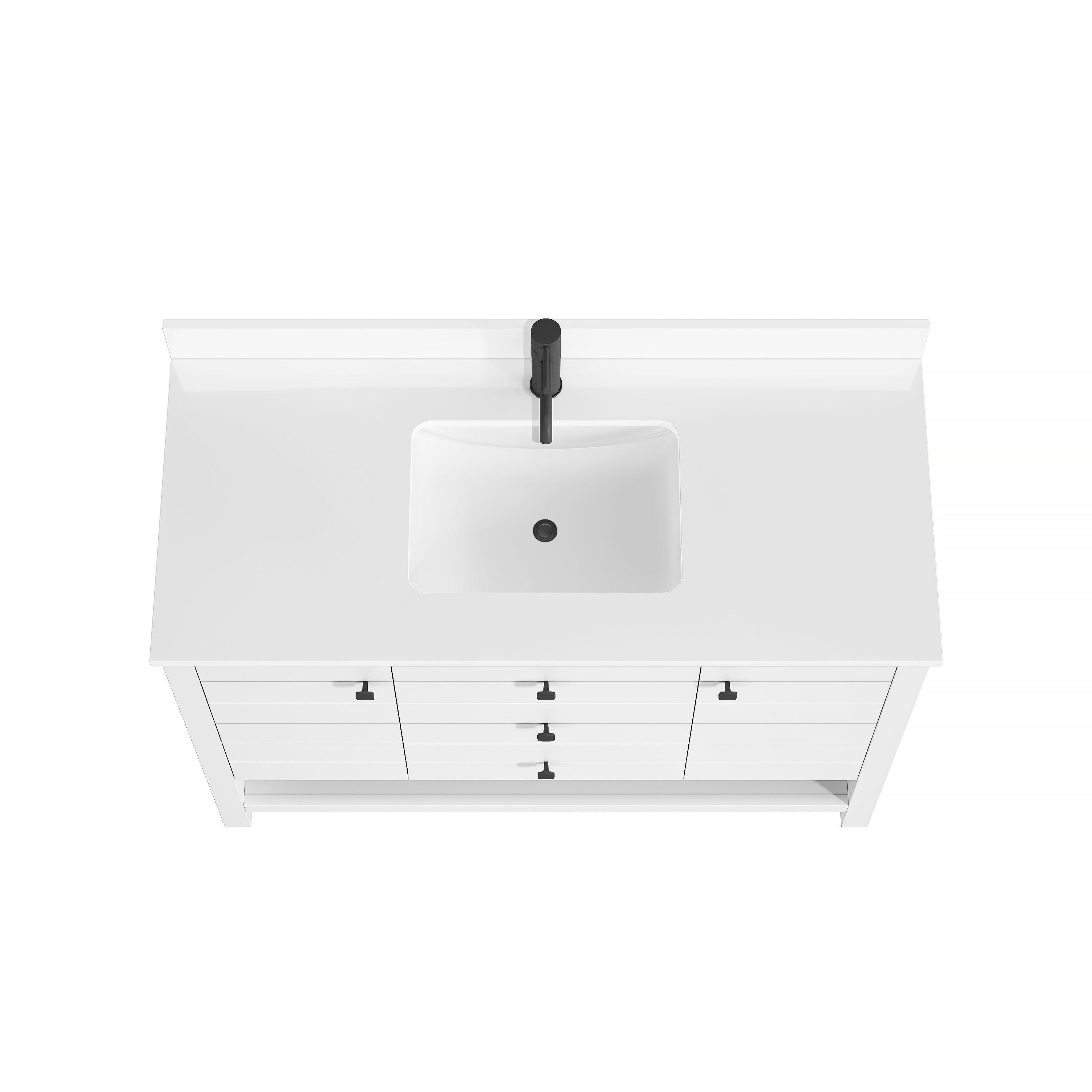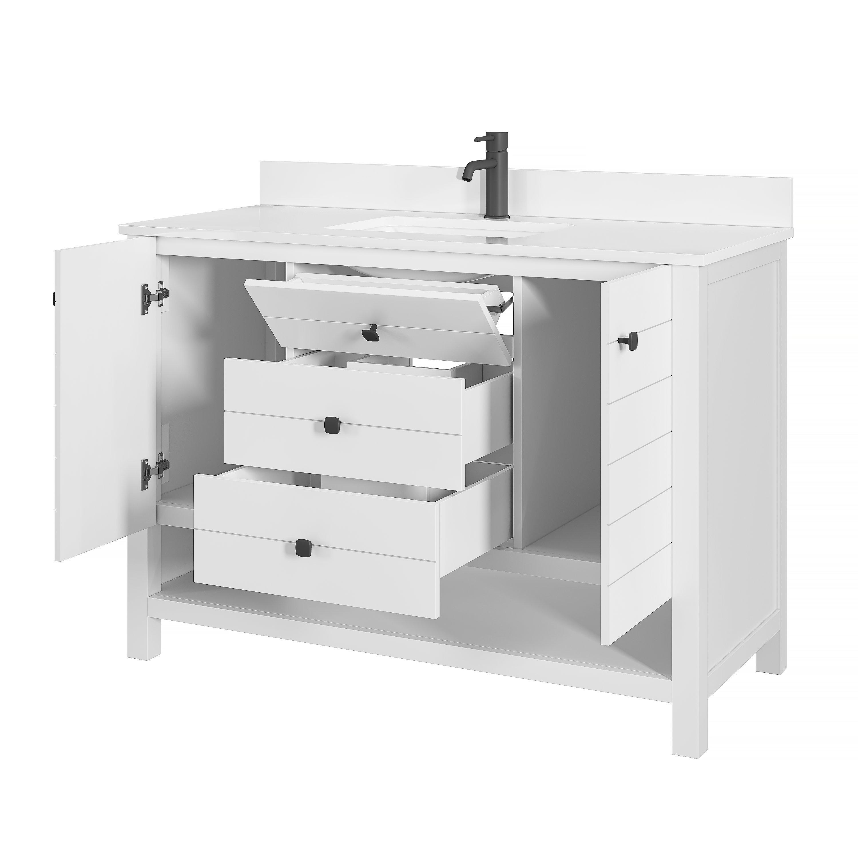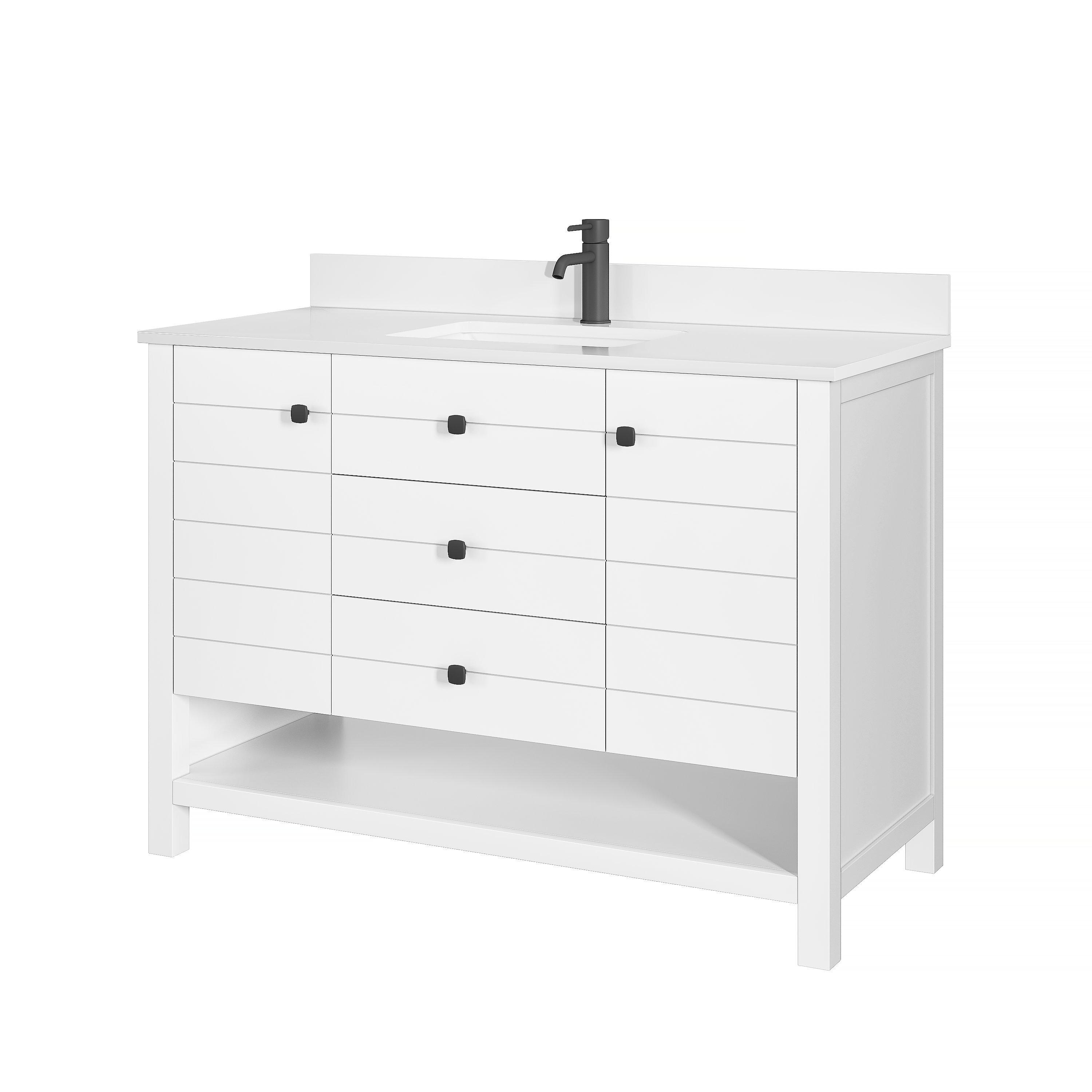 Ideal for those seeking both beauty and practicality, the Dover 49 in. White Vanity with Engineered Stone Top guarantees satisfaction with its thoughtful design and quality construction.