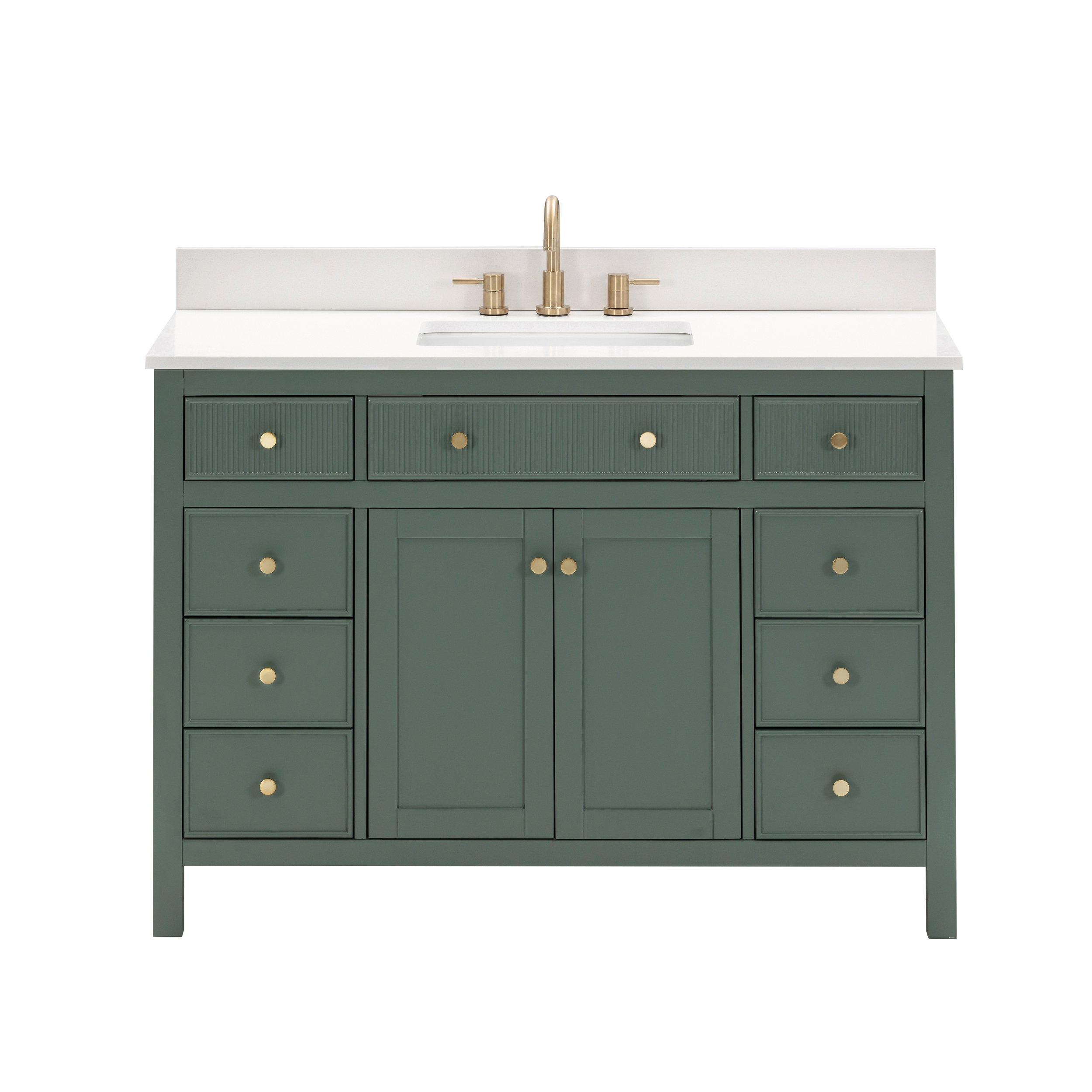 Tailor the look of your bathroom with the Dylan 49 in. Smoke Green Vanity with Quartz Top featuring gorgeous mdf in green with 2 doors, 9 drawers, and 1 shelves. This piece is completed with beautiful matte gold hardware and a single undermount white sink. The Dylan 49 in. Smoke Green Vanity with Quartz Top is a stunning addition to any bathroom setting.