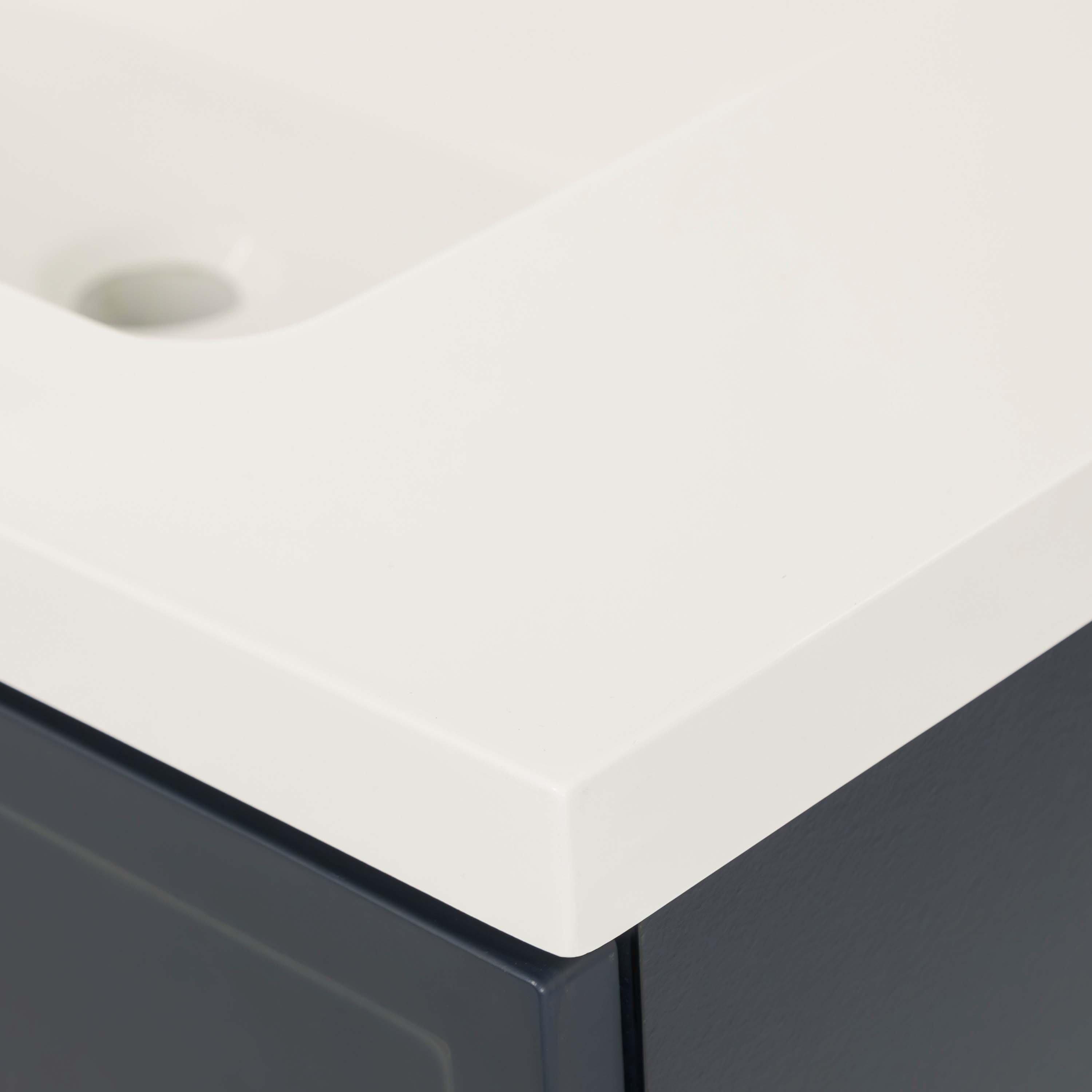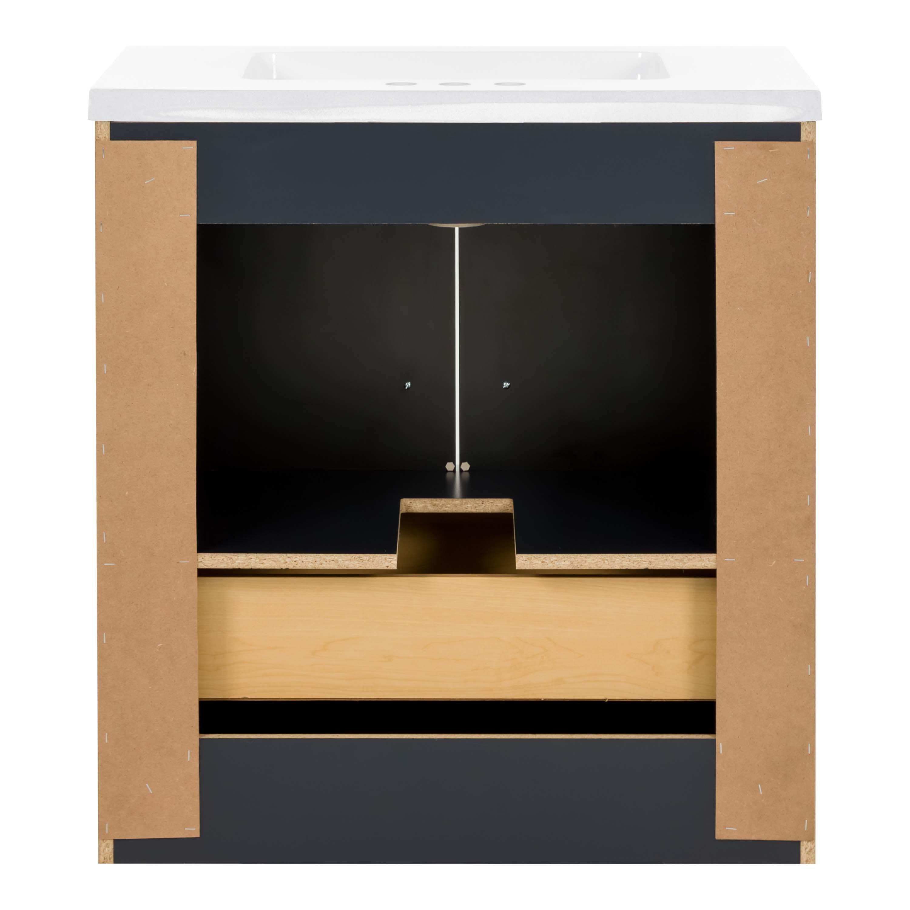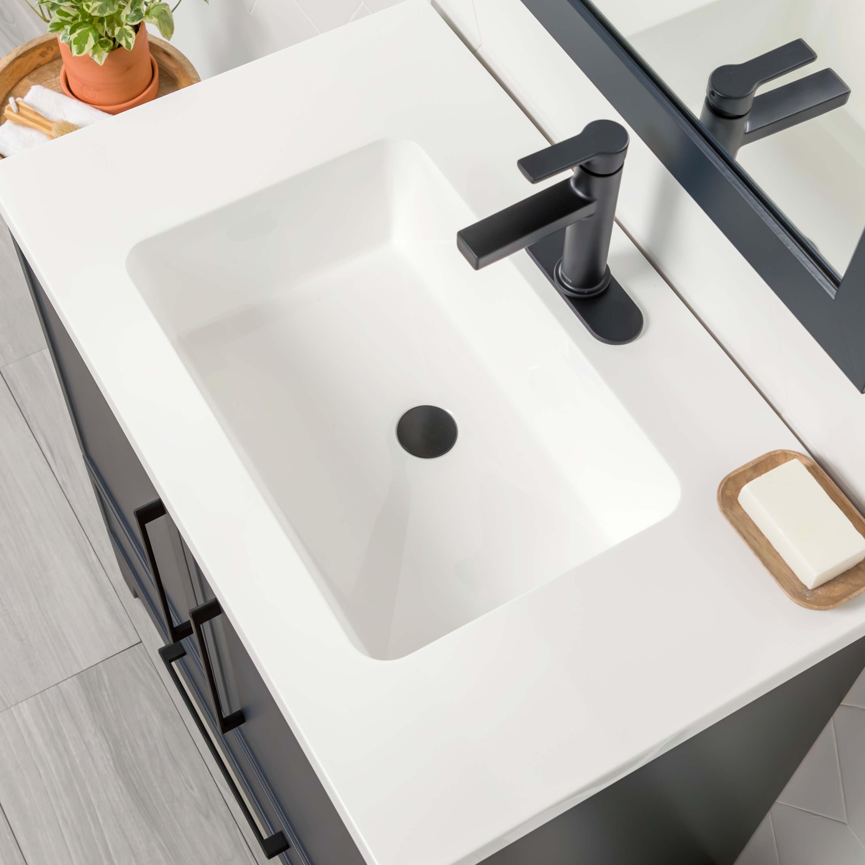 Complete your bathroom with the beautiful Eli 30 in. Deep Blue Vanity with Cultured Marble Top Includes Mirror. This freestanding features durable particle board cabinets in stunning blue with a white cultured marble vanity top and matte black hardware. A charming single integral sink in brilliant white is included. The Eli 30 in. Deep Blue Vanity with Cultured Marble Top Includes Mirror is a versatile choice to customize multiple bathroom settings.