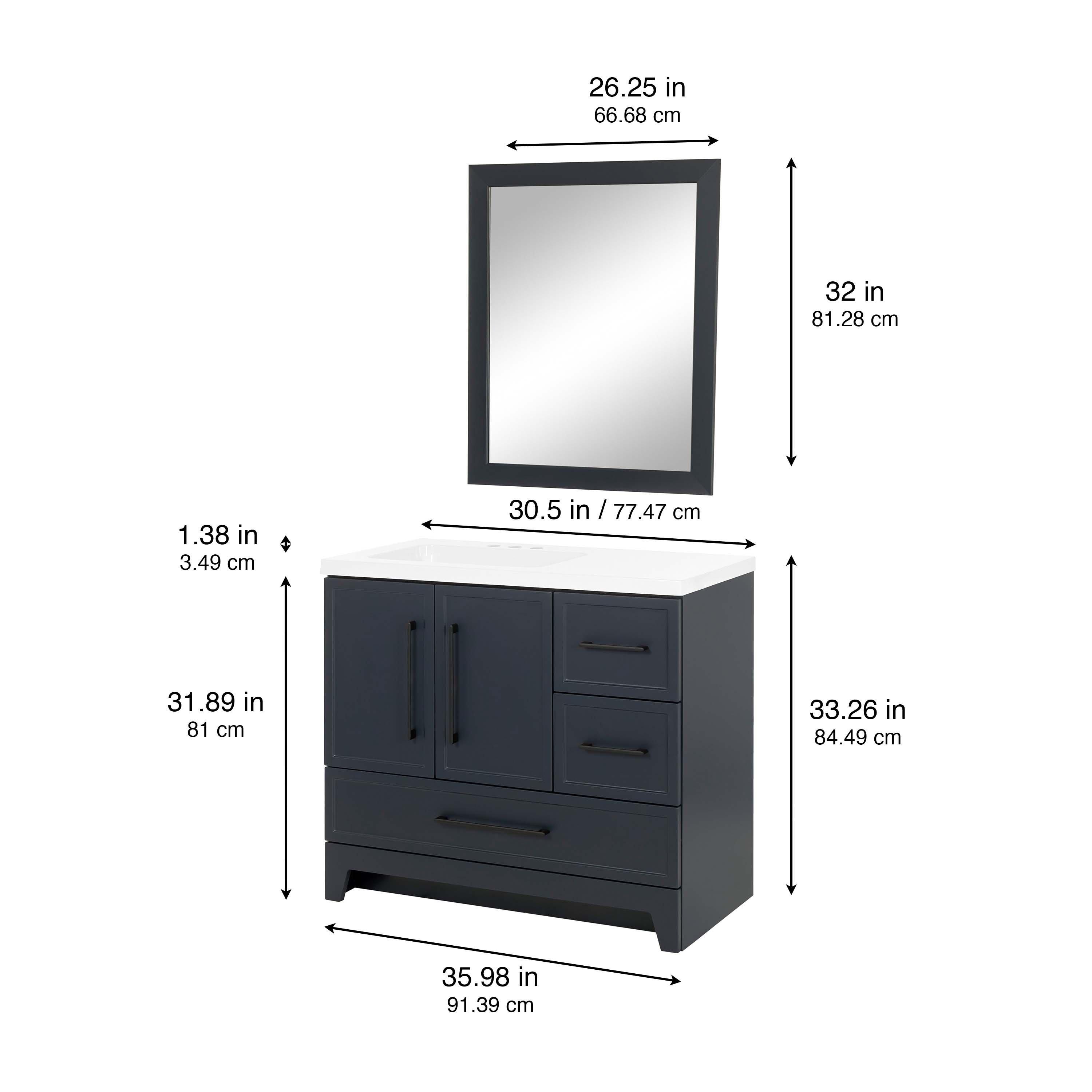 Tailor the look of your bathroom with the Eli 36 in. Deep Blue Vanity with Cultured Marble Top Includes Mirror featuring gorgeous particle board in blue with 2 doors, 3 drawers, and 0 shelves. This piece is completed with beautiful matte black hardware and a single integral white sink. The Eli 36 in. Deep Blue Vanity with Cultured Marble Top Includes Mirror is a stunning addition to any bathroom setting.