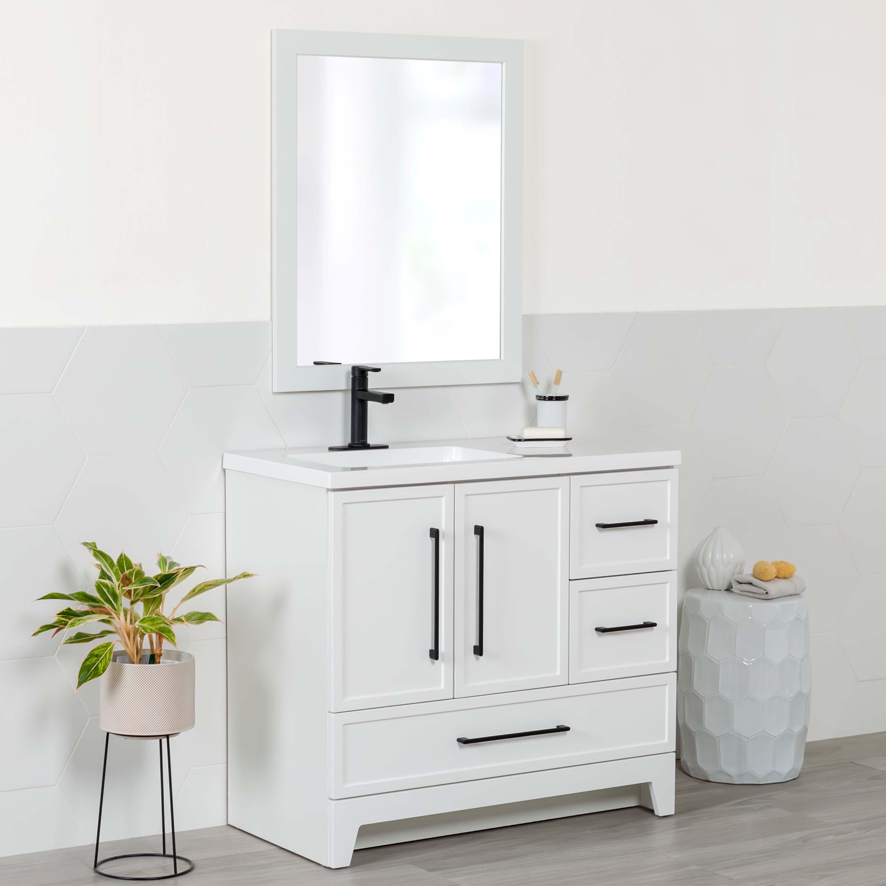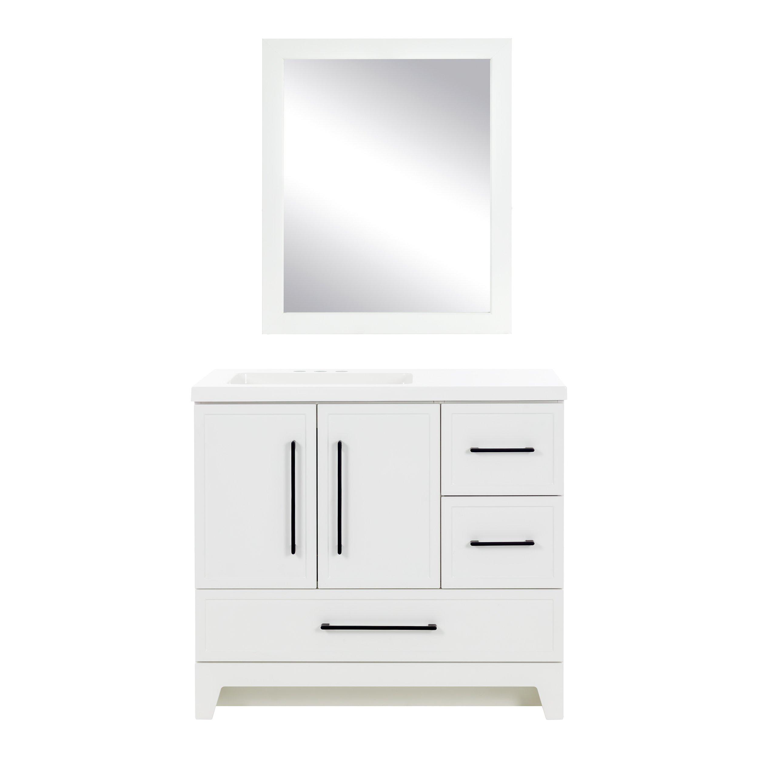 Give your bathroom a contemporary update with the Eli 37 in. white bathroom vanity and mirror set. This pre-assembled bathroom vanity features furniture-grade construction, a white laminate finish, beautiful matte black hardware, and a 1-piece white cultured marble sink top. And its 3 full-extension drawers and 2-door under-sink cabinet provide easy-access bathroom storage. A matching 26.2 in. W x 32 in. H white mirror completes this set for a stunning addition to any bathroom.