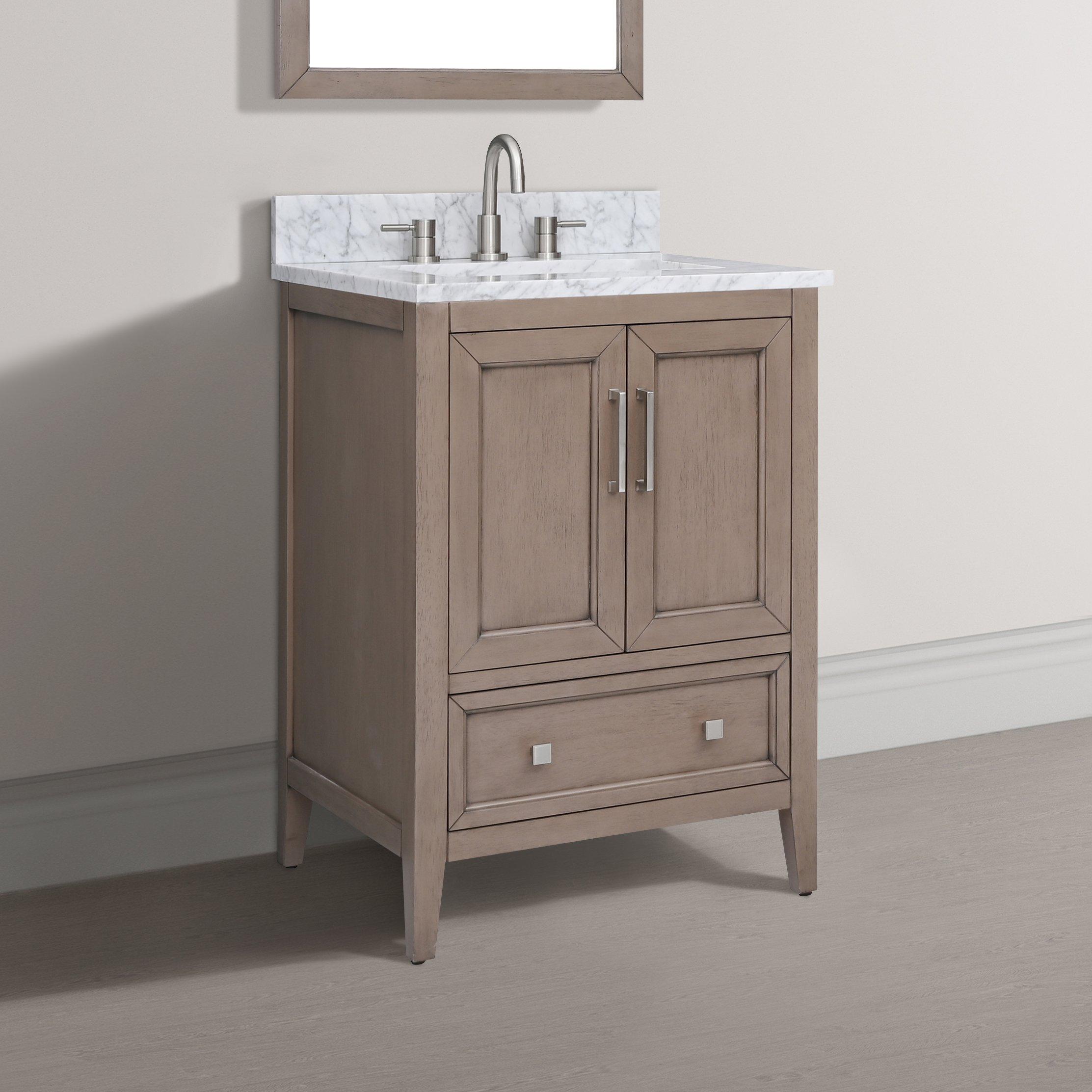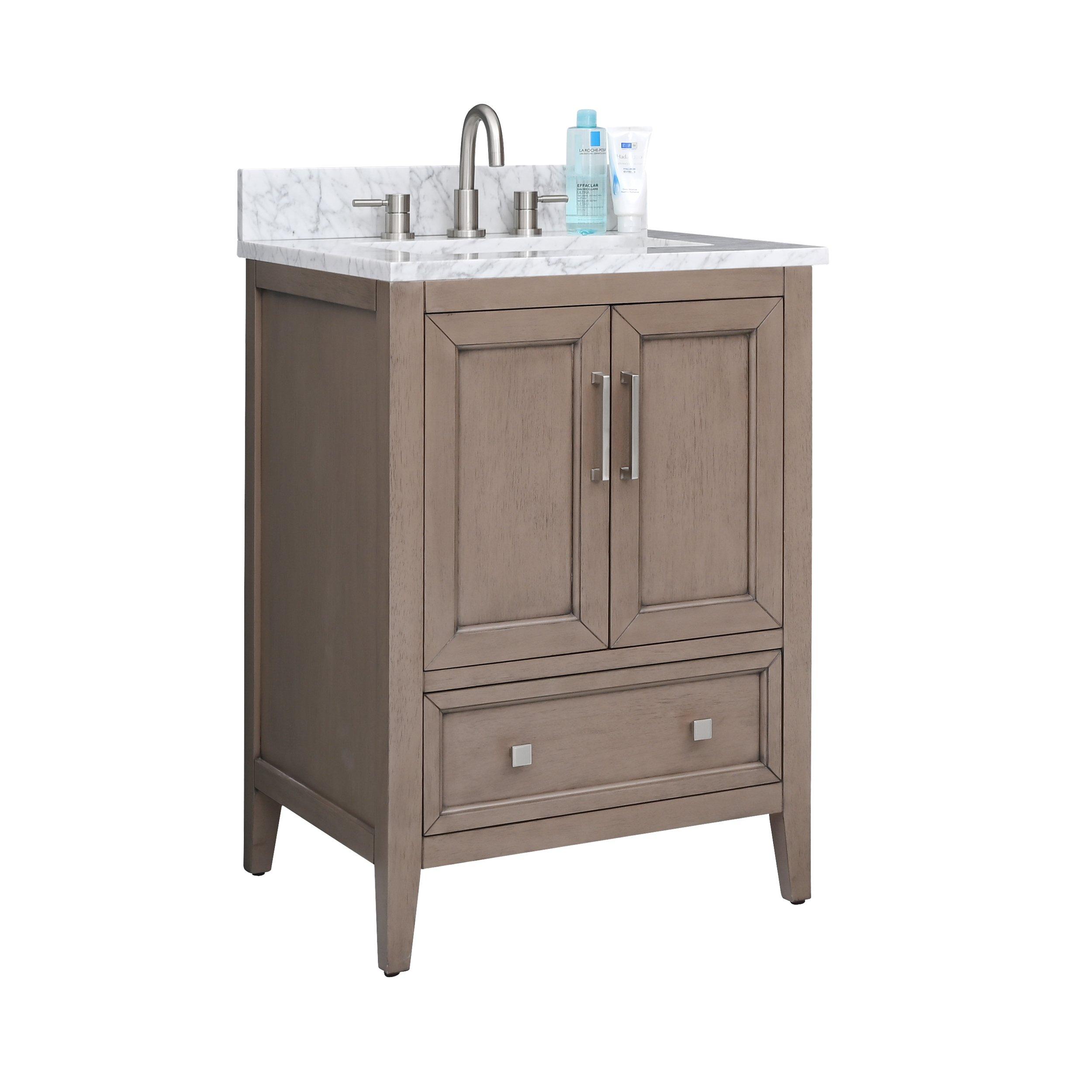 Complete your bathroom with the beautiful Everly 25 in. Gray Oak Vanity with Carrara Marble Top. This freestanding features durable solid wood, mdf cabinets in stunning brown with a multi color marble vanity top and brushed nickel hardware. A charming single undermount sink in brilliant white is included. The Everly 25 in. Gray Oak Vanity with Carrara Marble Top is a versatile choice to customize multiple bathroom settings.