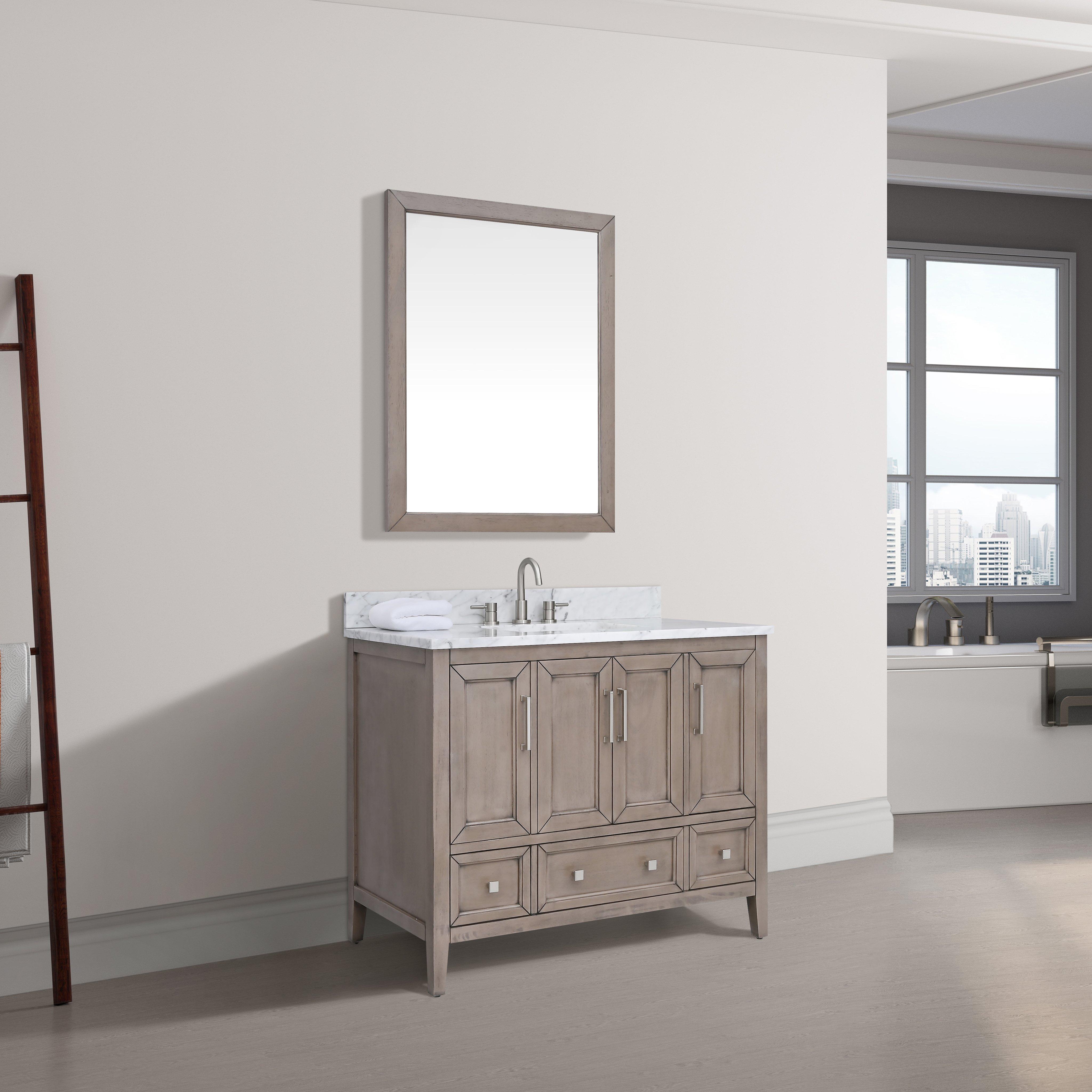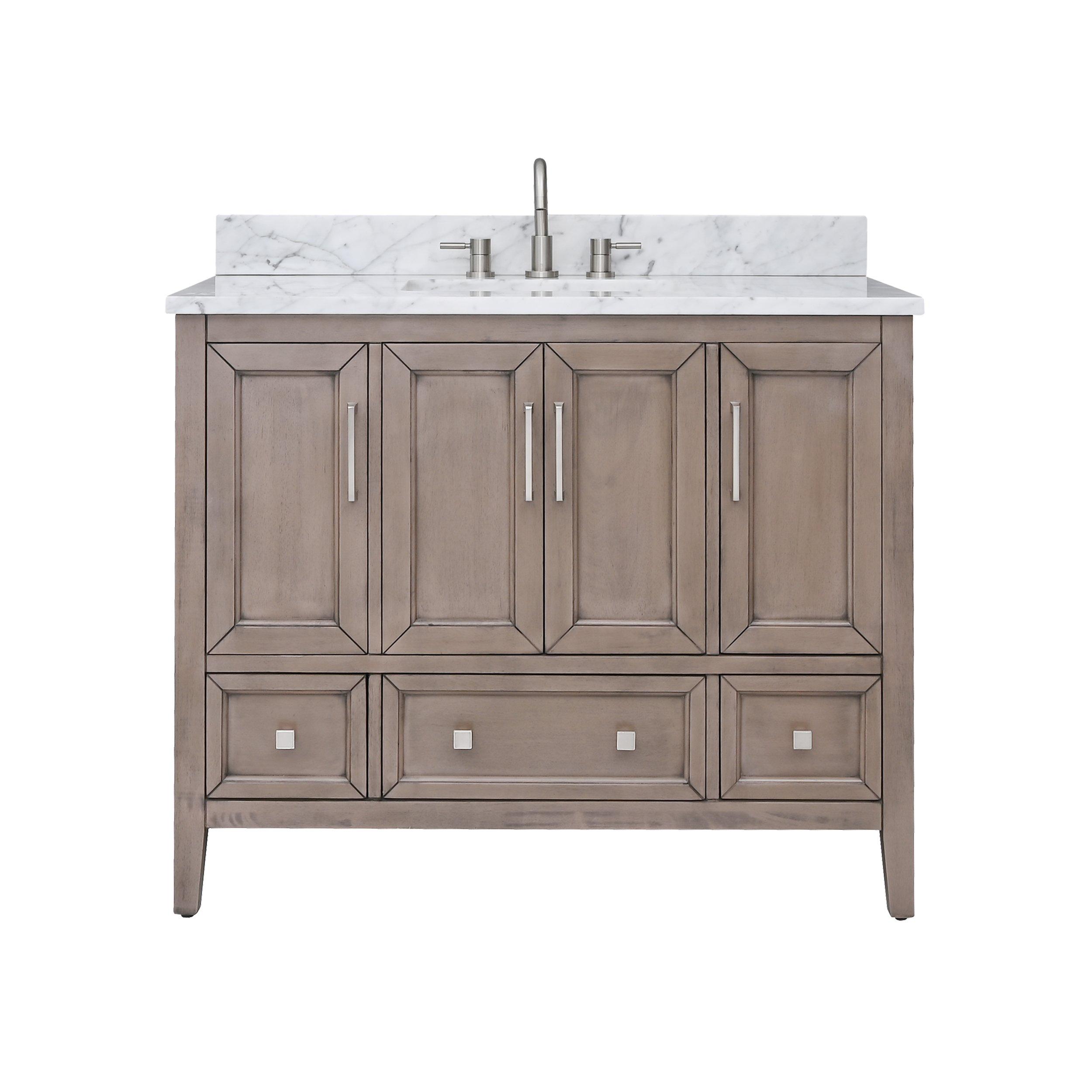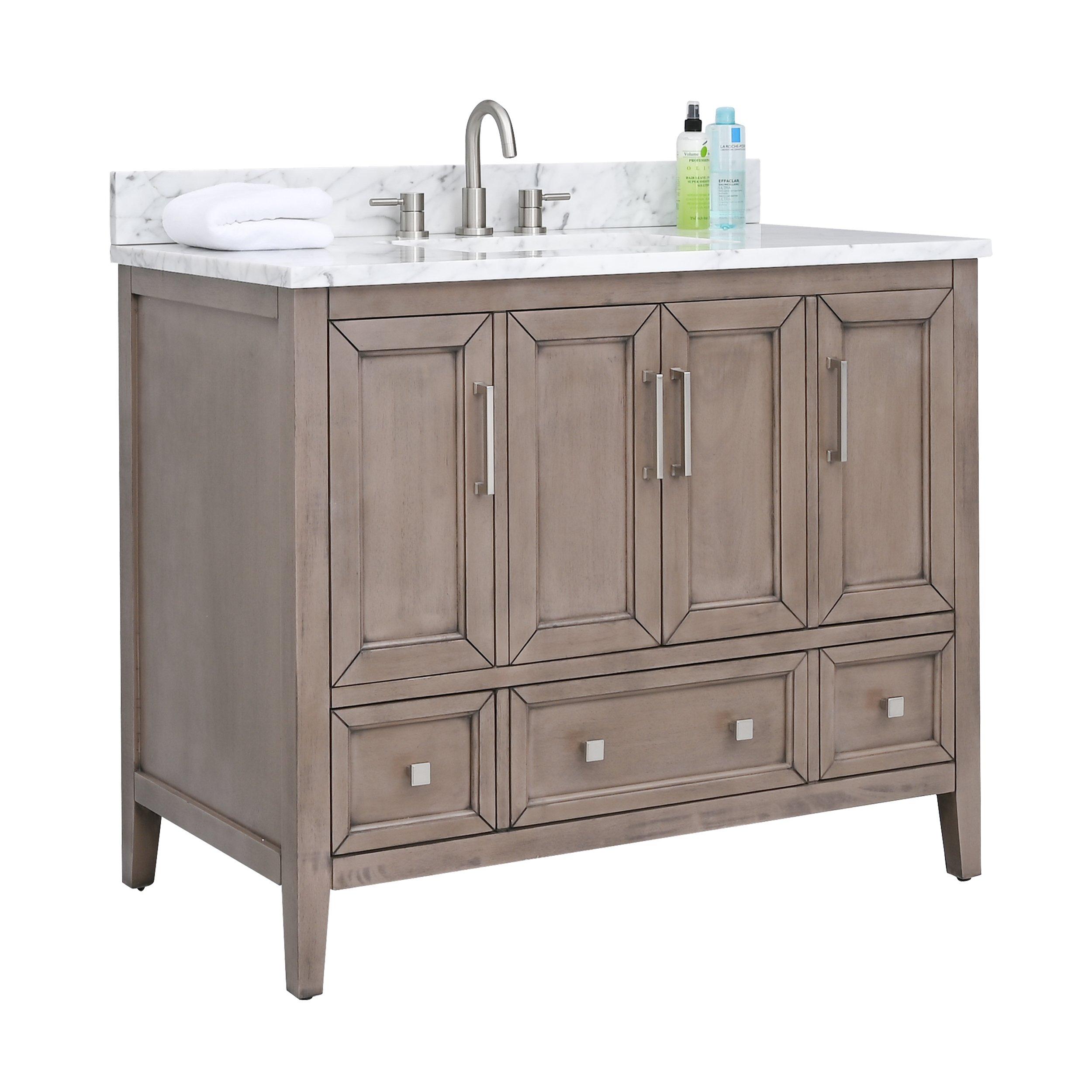 Tailor the look of your bathroom with the Everly 43 in. Gray Oak Vanity with Carrara Marble Top featuring gorgeous solid wood, mdf in brown with 4 doors, 3 drawers, and 3 shelves. This piece is completed with beautiful brushed nickel hardware and a single undermount white sink. The Everly 43 in. Gray Oak Vanity with Carrara Marble Top is a stunning addition to any bathroom setting.