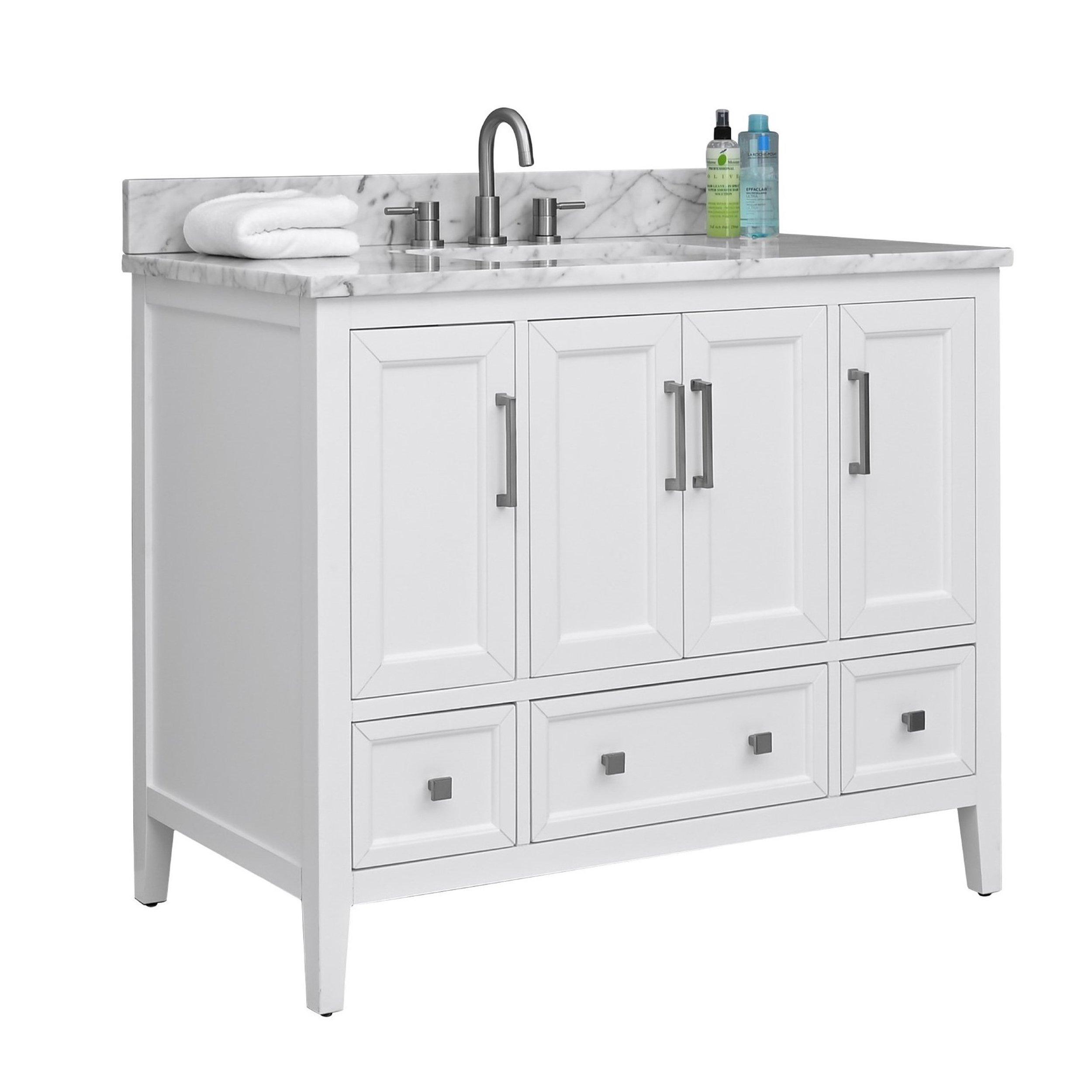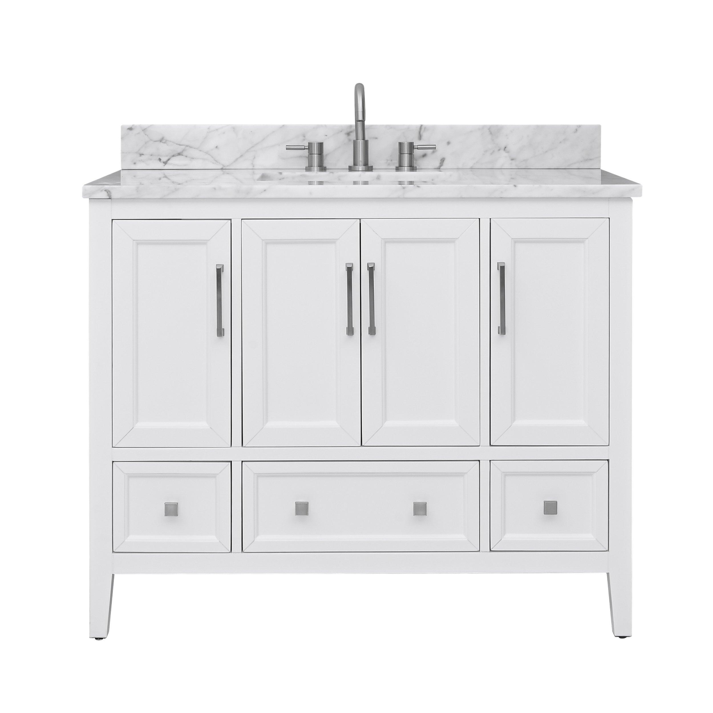 Tailor the look of your bathroom with the Everly 43 in. White Vanity with Carrara Marble Top featuring gorgeous solid wood, mdf in white with 4 doors, 3 drawers, and 3 shelves. This piece is completed with beautiful brushed nickel hardware and a single undermount white sink. The Everly 43 in. White Vanity with Carrara Marble Top is a stunning addition to any bathroom setting.