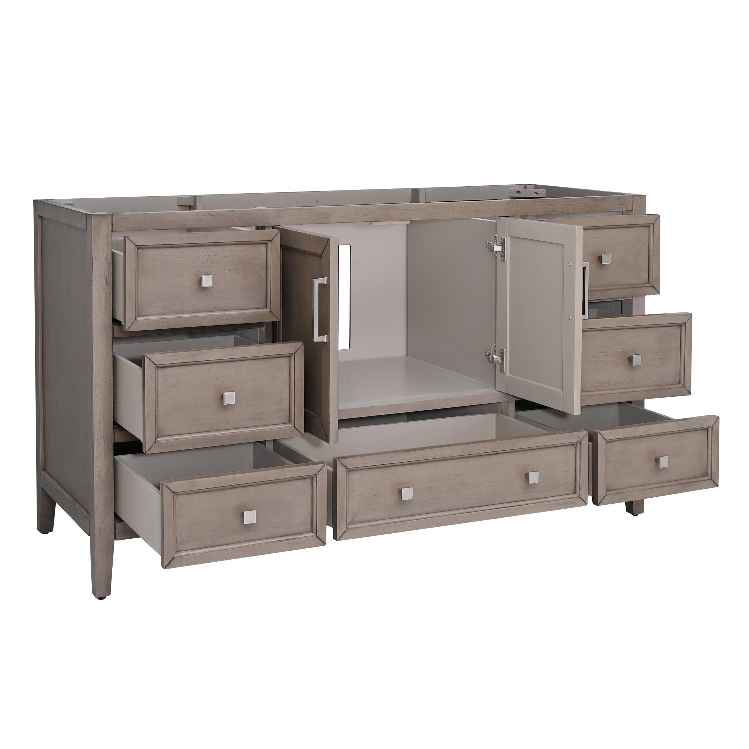 Complete your bathroom with the beautiful Everly 60 in. Gray Oak Vanity Base. This freestanding features durable solid wood, mdf cabinets in stunning brown with brushed nickel hardware. The Everly 60 in. Gray Oak Vanity Base is a versatile choice to customize multiple bathroom settings.