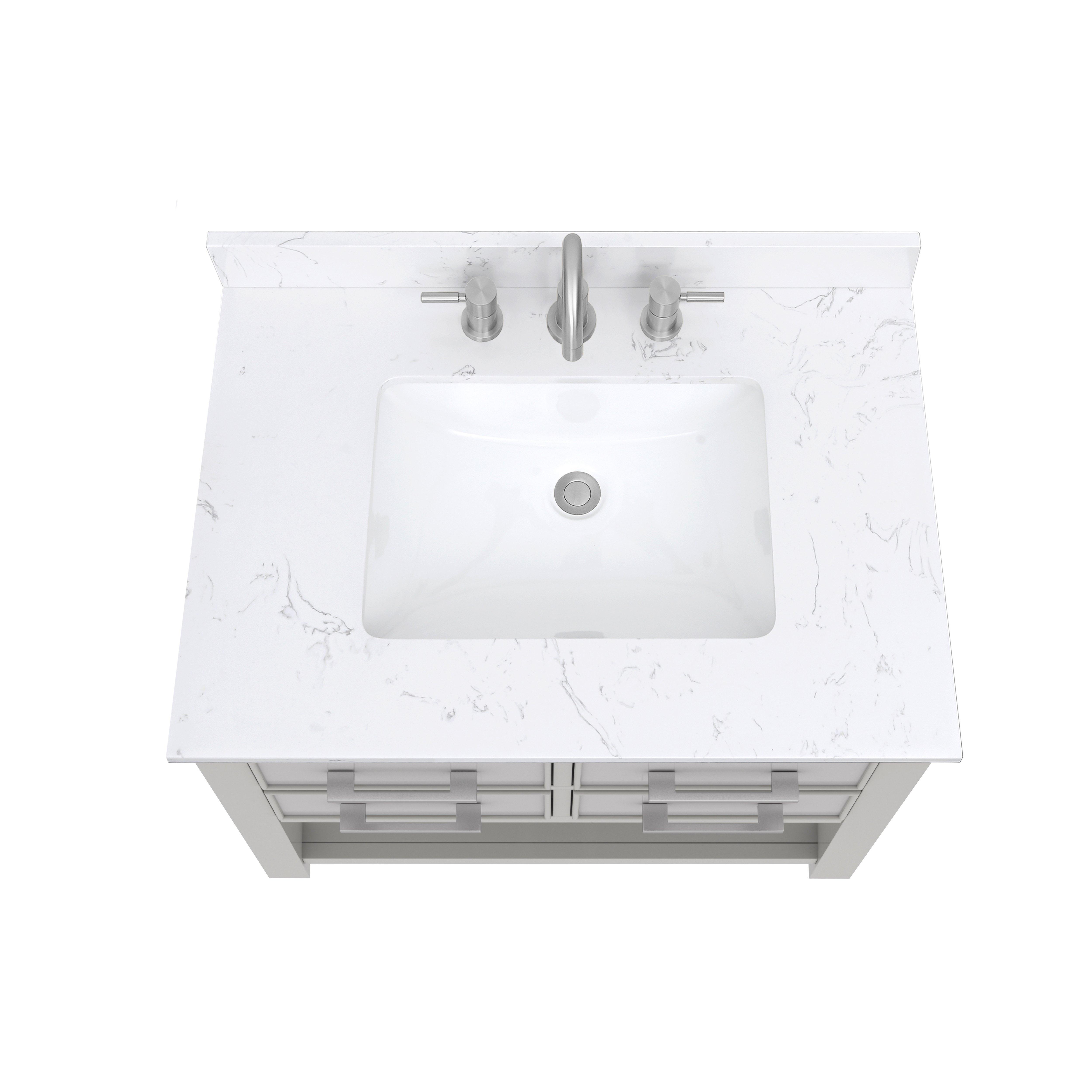 Complete your bathroom with the beautiful Hampton 31 in. Chilled Gray Single Vanity with Engineered Top. This freestanding features durable solid wood cabinets in stunning gray with a white manufactured stone vanity top and brushed nickel hardware. A charming single undermount sink in brilliant white is included. The Hampton 31 in. Chilled Gray Single Vanity with Engineered Top is a versatile choice to customize multiple bathroom settings.