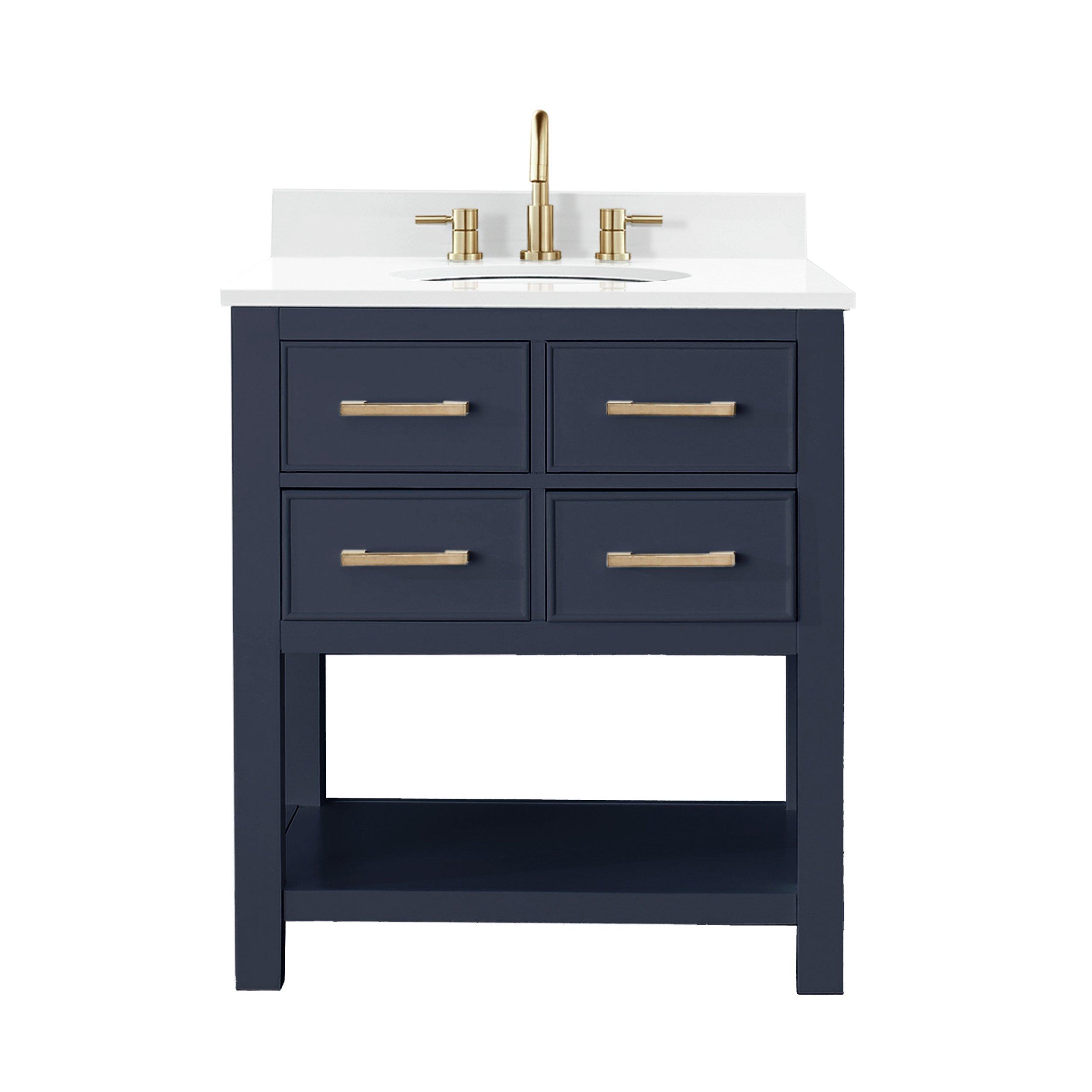 Tailor the look of your bathroom with the Hampton 31 in. Navy Blue Single Vanity with Engineered Top featuring gorgeous solid wood in blue with 0 doors, 3 drawers, and 1 shelves. This piece is completed with beautiful matte gold hardware and a single undermount white sink. The Hampton 31 in. Navy Blue Single Vanity with Engineered Top is a stunning addition to any bathroom setting.