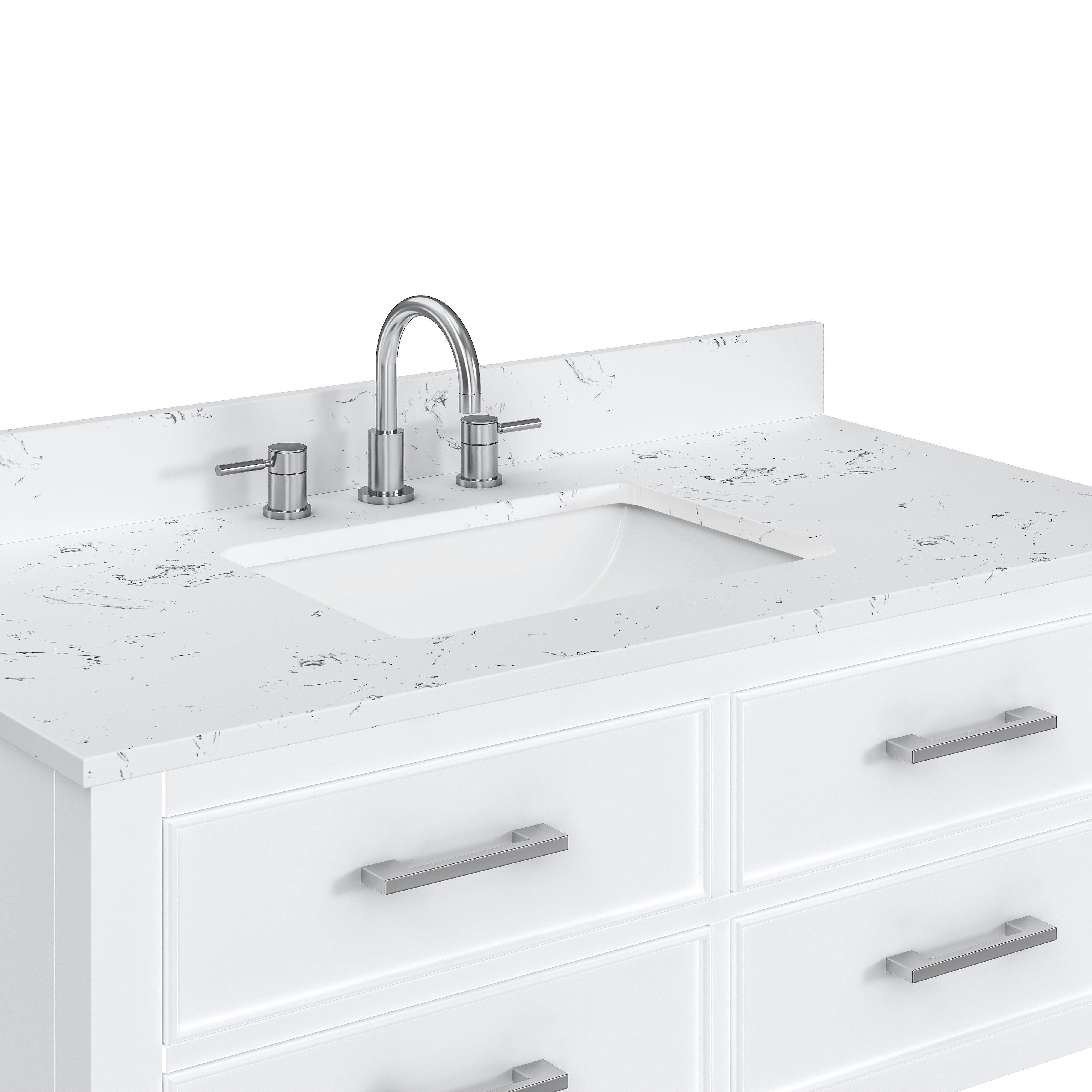 Tailor the look of your bathroom with the Hampton 43 in. White Single Vanity with Engineered Top featuring gorgeous solid wood in white with 0 doors, 4 drawers, and 1 shelves. This piece is completed with beautiful brushed nickel hardware and a single undermount white sink. The Hampton 43 in. White Single Vanity with Engineered Top is a stunning addition to any bathroom setting.