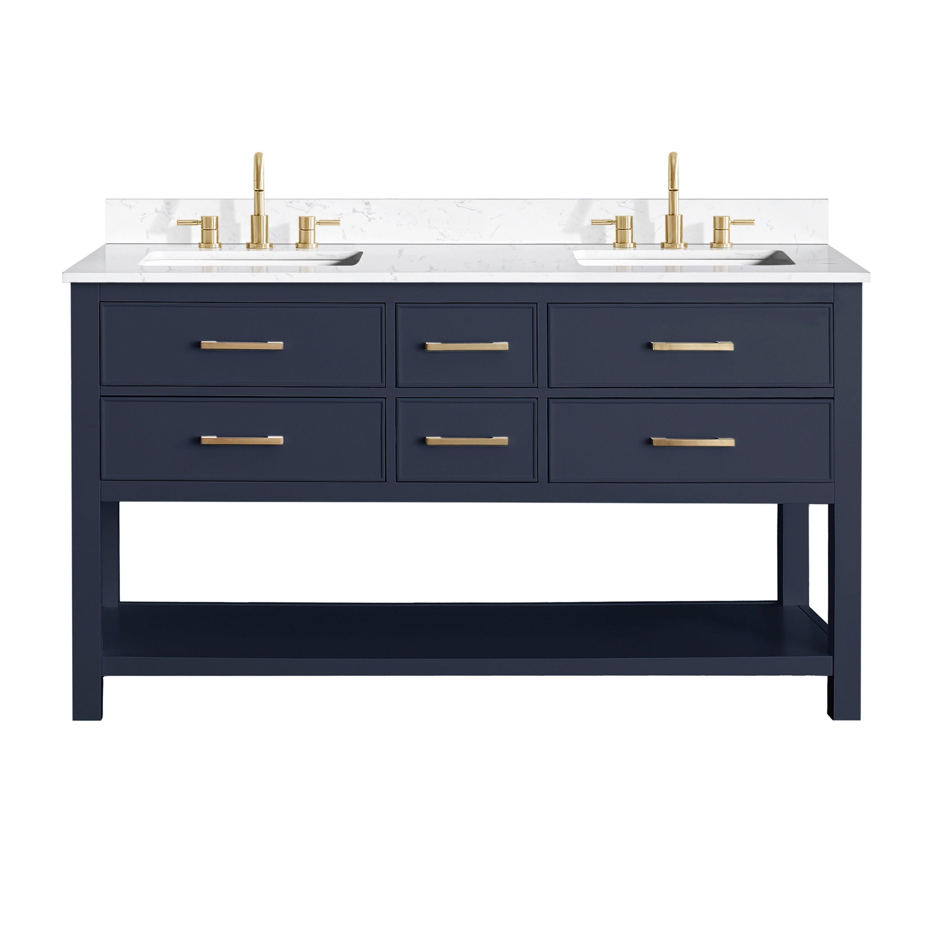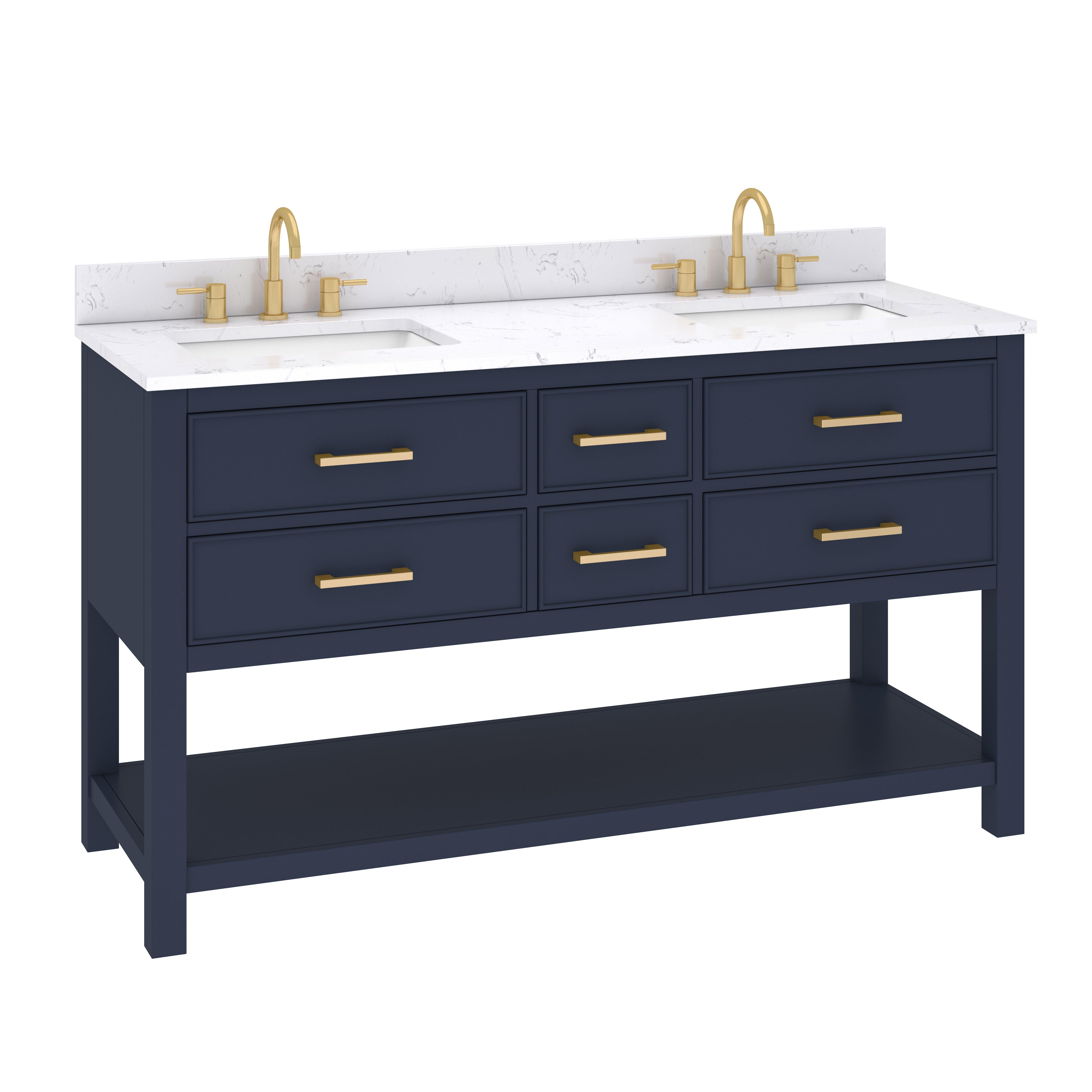 Tailor the look of your bathroom with the Hampton 61 in. Blue Double Vanity with Engineered Top featuring gorgeous solid wood in blue with 0 doors, 6 drawers, and 1 shelves. This piece is completed with beautiful matte gold hardware and a double undermount white sink. The Hampton 61 in. Blue Double Vanity with Engineered Top is a stunning addition to any bathroom setting.