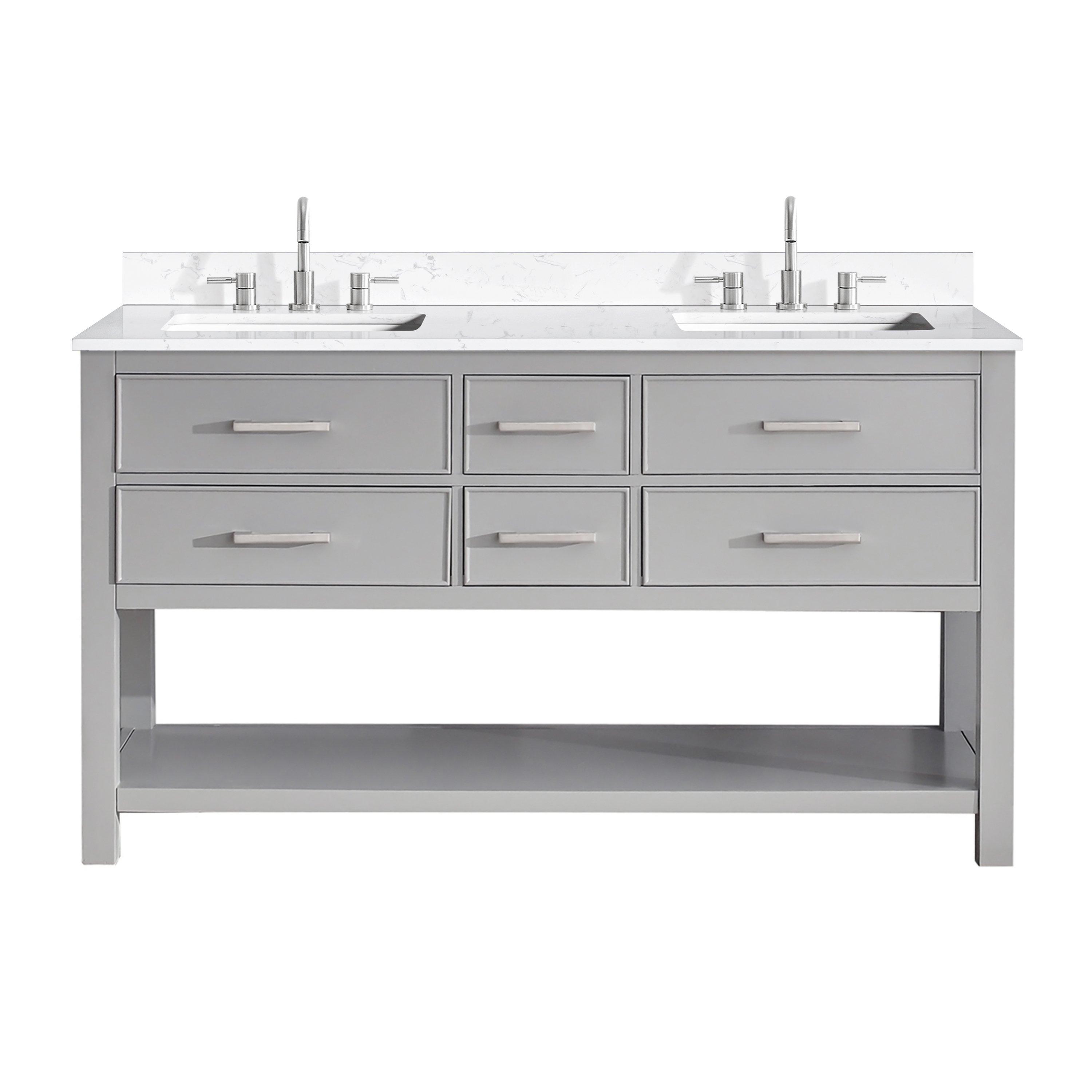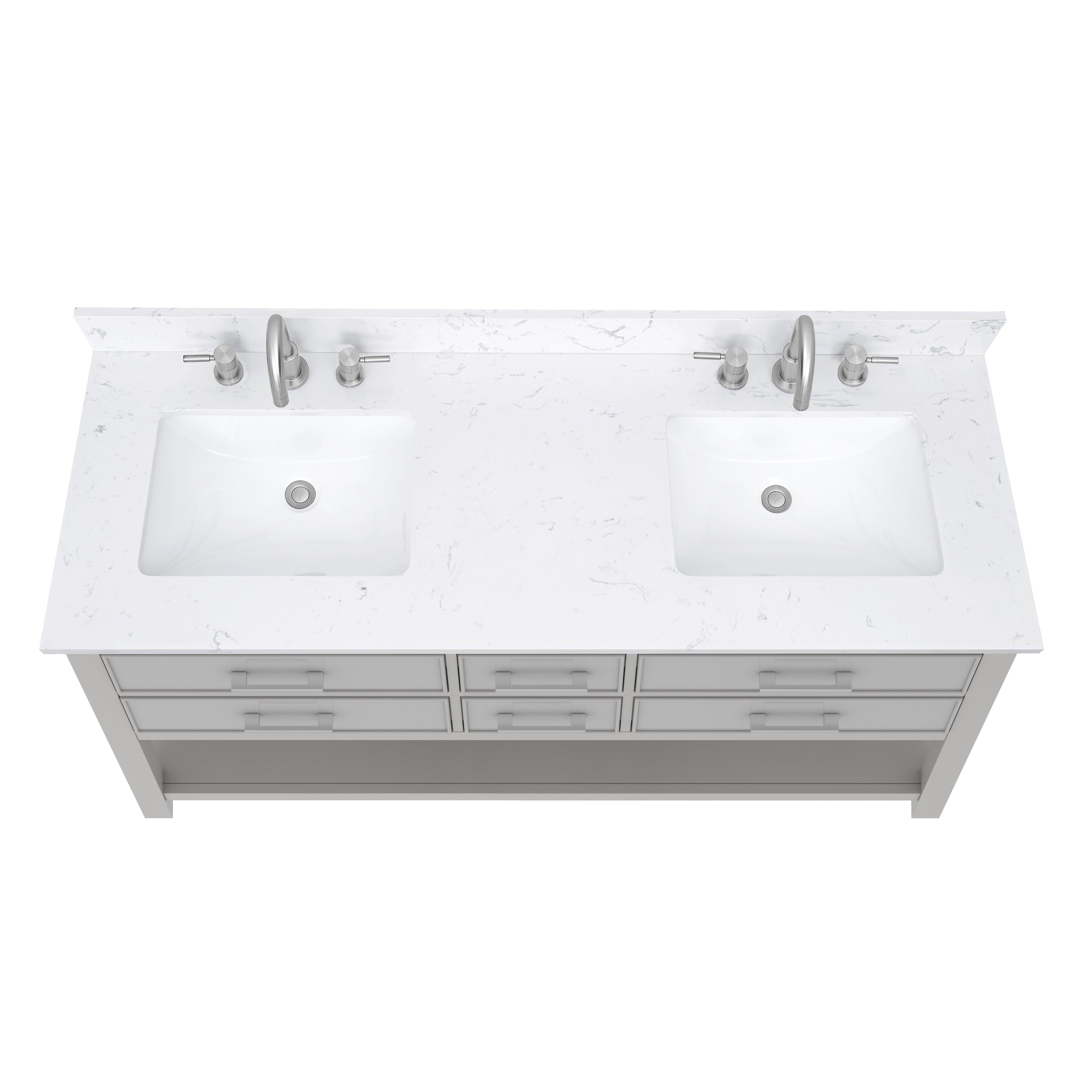 Tailor the look of your bathroom with the Hampton 61. Gray Double Vanity with Engineered Top featuring gorgeous solid wood in gray with 0 doors, 6 drawers, and 1 shelves. This piece is completed with beautiful brushed nickel hardware and a double undermount white sink. The Hampton 61. Gray Double Vanity with Engineered Top is a stunning addition to any bathroom setting.