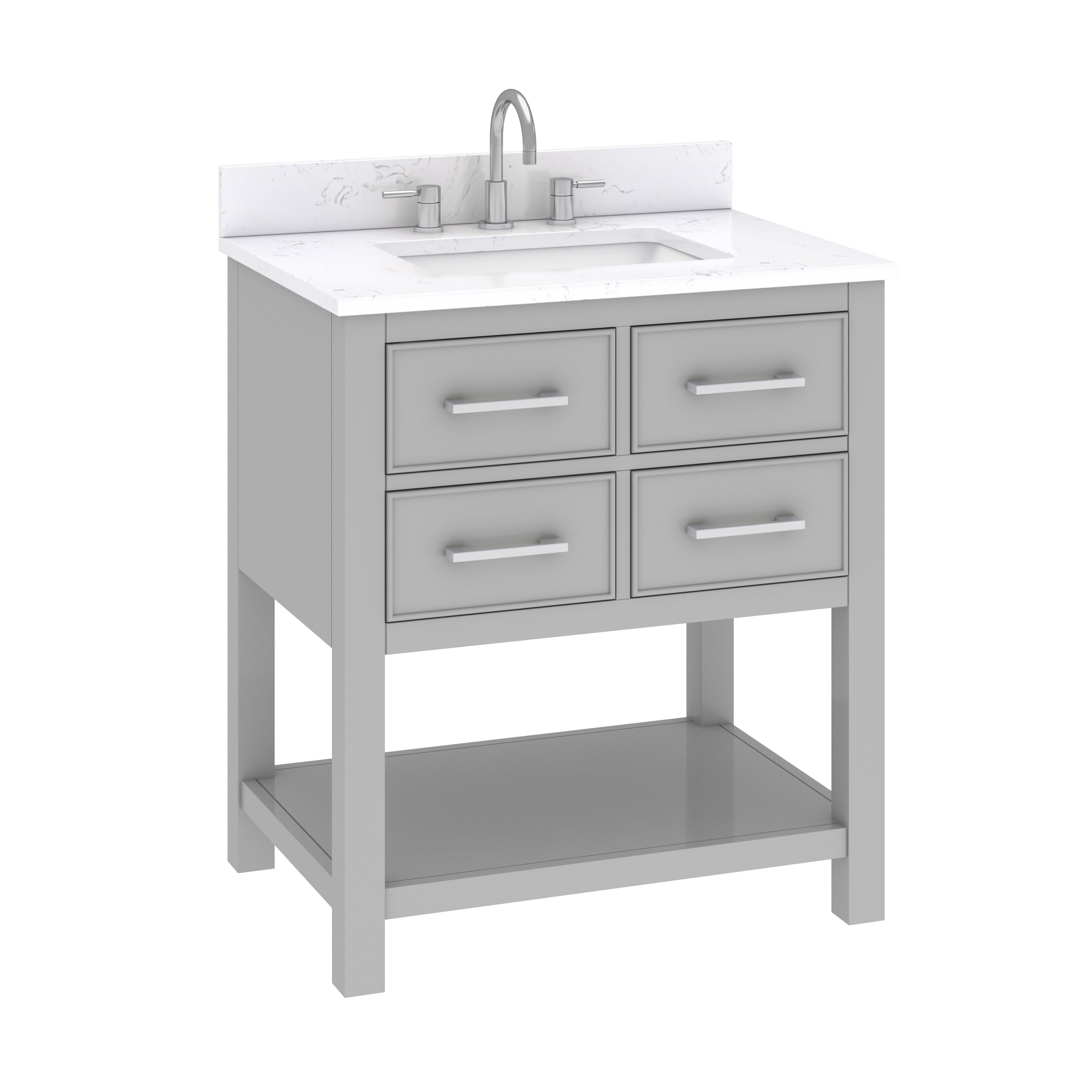 Complete your bathroom with the beautiful Hampton 31 in. Chilled Gray Single Vanity with Engineered Top. This freestanding features durable solid wood cabinets in stunning gray with a white manufactured stone vanity top and brushed nickel hardware. A charming single undermount sink in brilliant white is included. The Hampton 31 in. Chilled Gray Single Vanity with Engineered Top is a versatile choice to customize multiple bathroom settings.