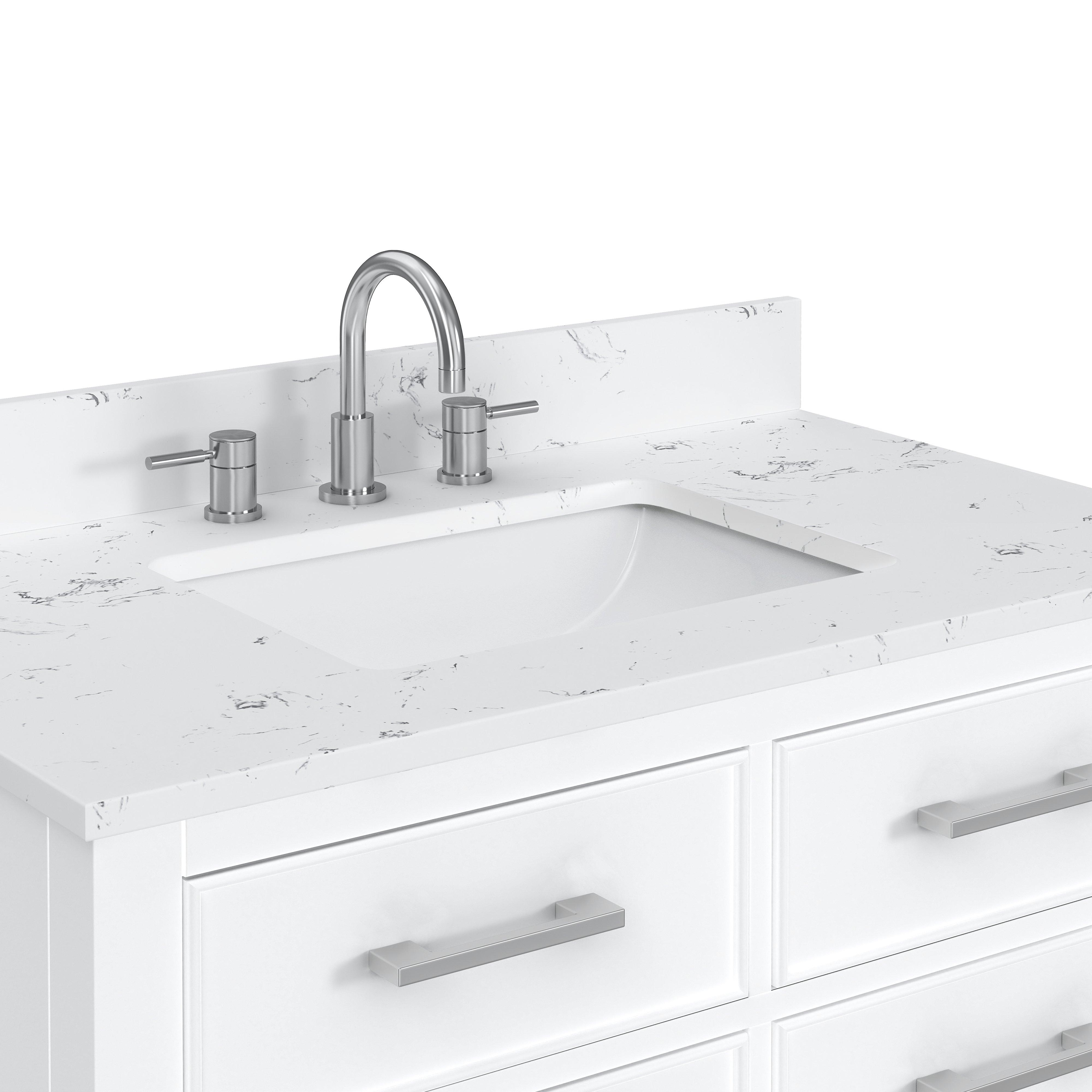 The sink position is offset and not directly centered on the vanity top to allow for more space on the side of the vanity.