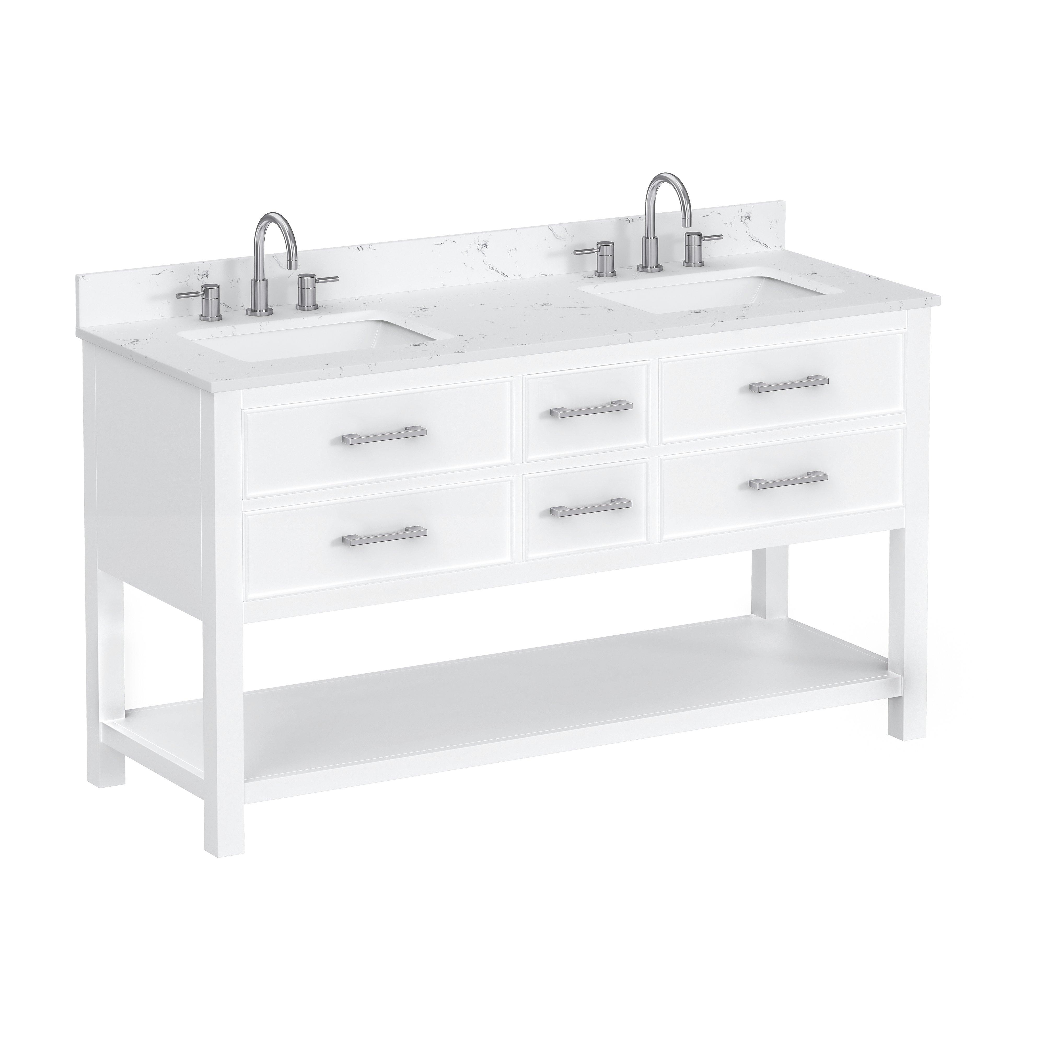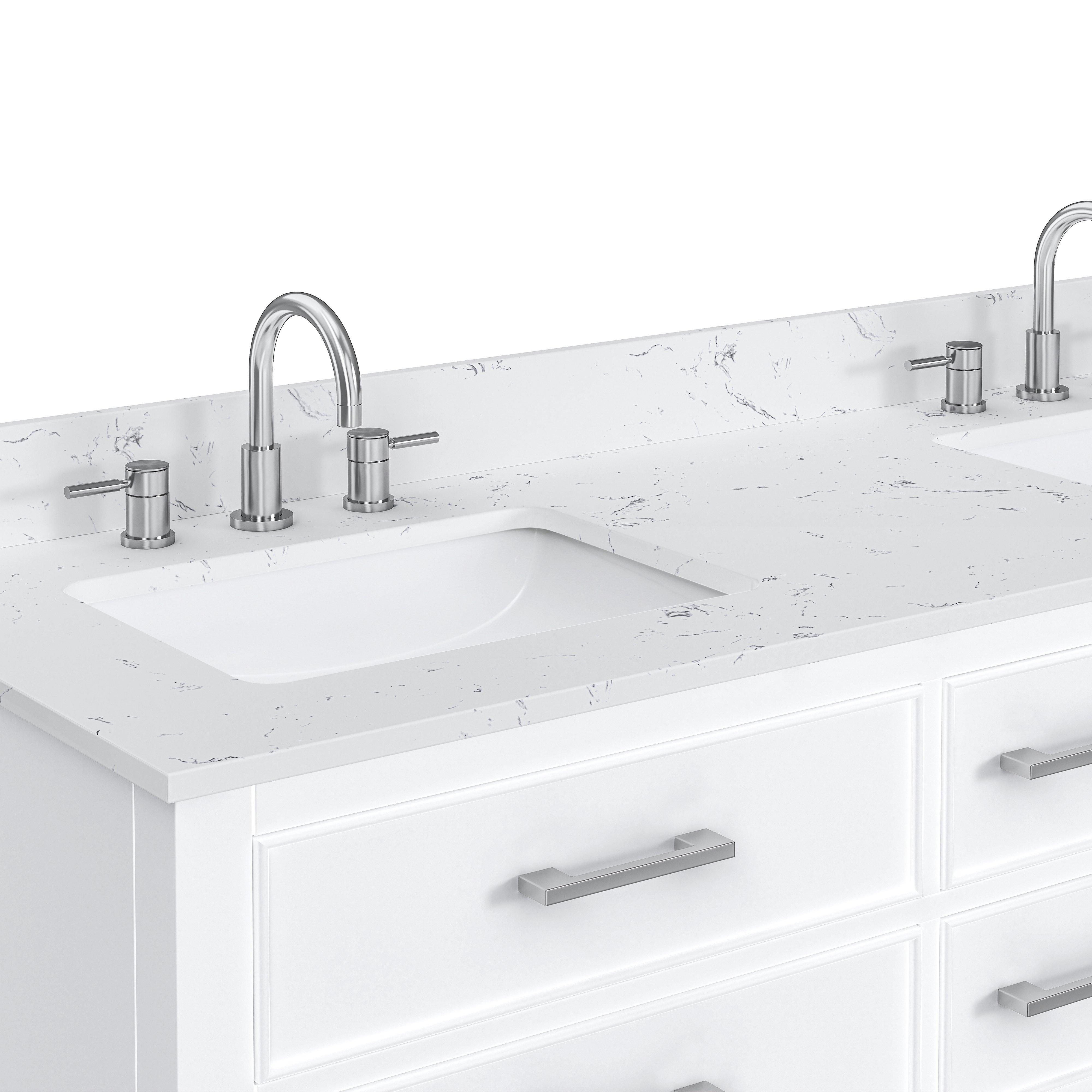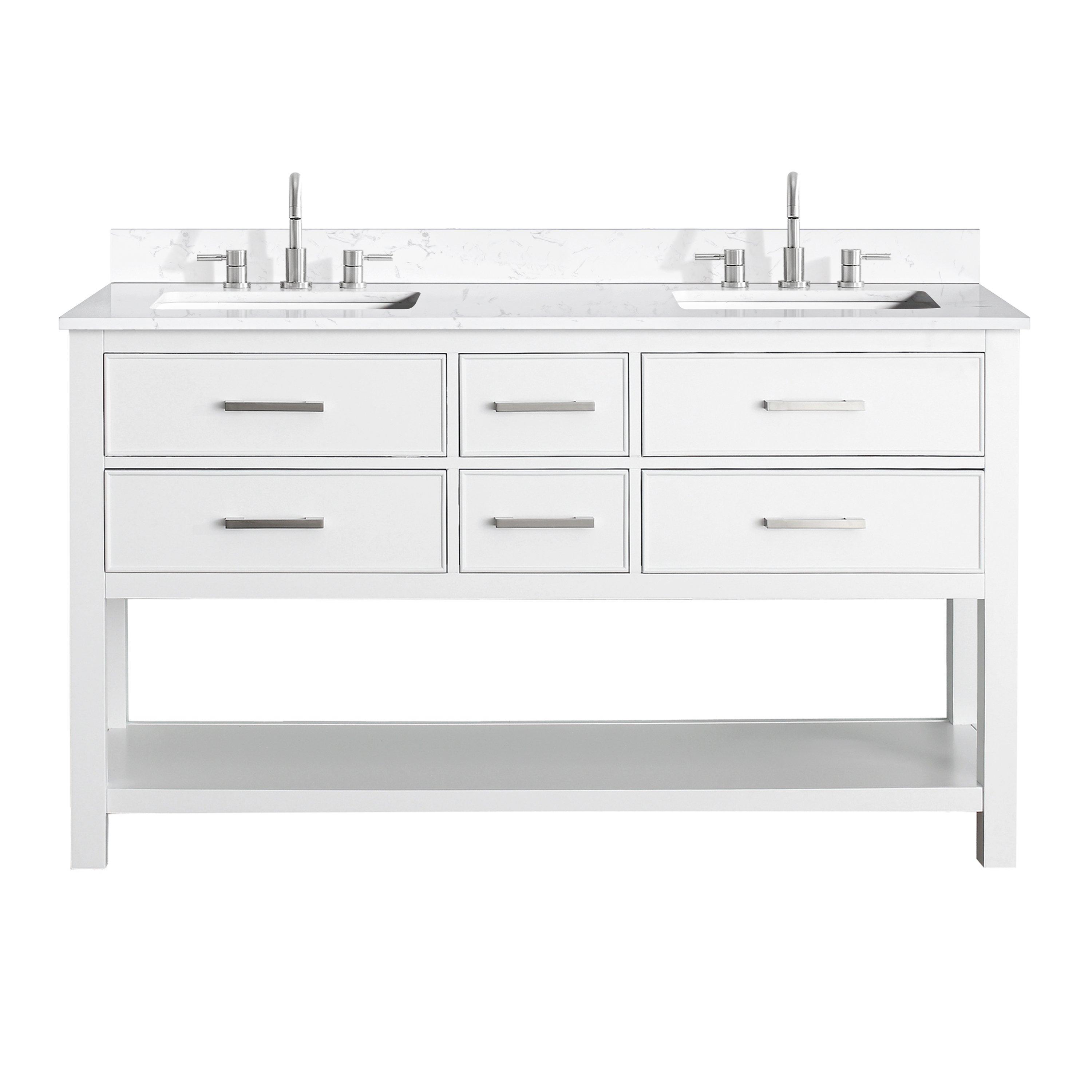 Tailor the look of your bathroom with the Hampton 61 in. White Double Vanity with Engineered Top featuring gorgeous solid wood in white with 0 doors, 6 drawers, and 1 shelves. This piece is completed with beautiful brushed nickel hardware and a double undermount white sink. The Hampton 61 in. White Double Vanity with Engineered Top is a stunning addition to any bathroom setting.