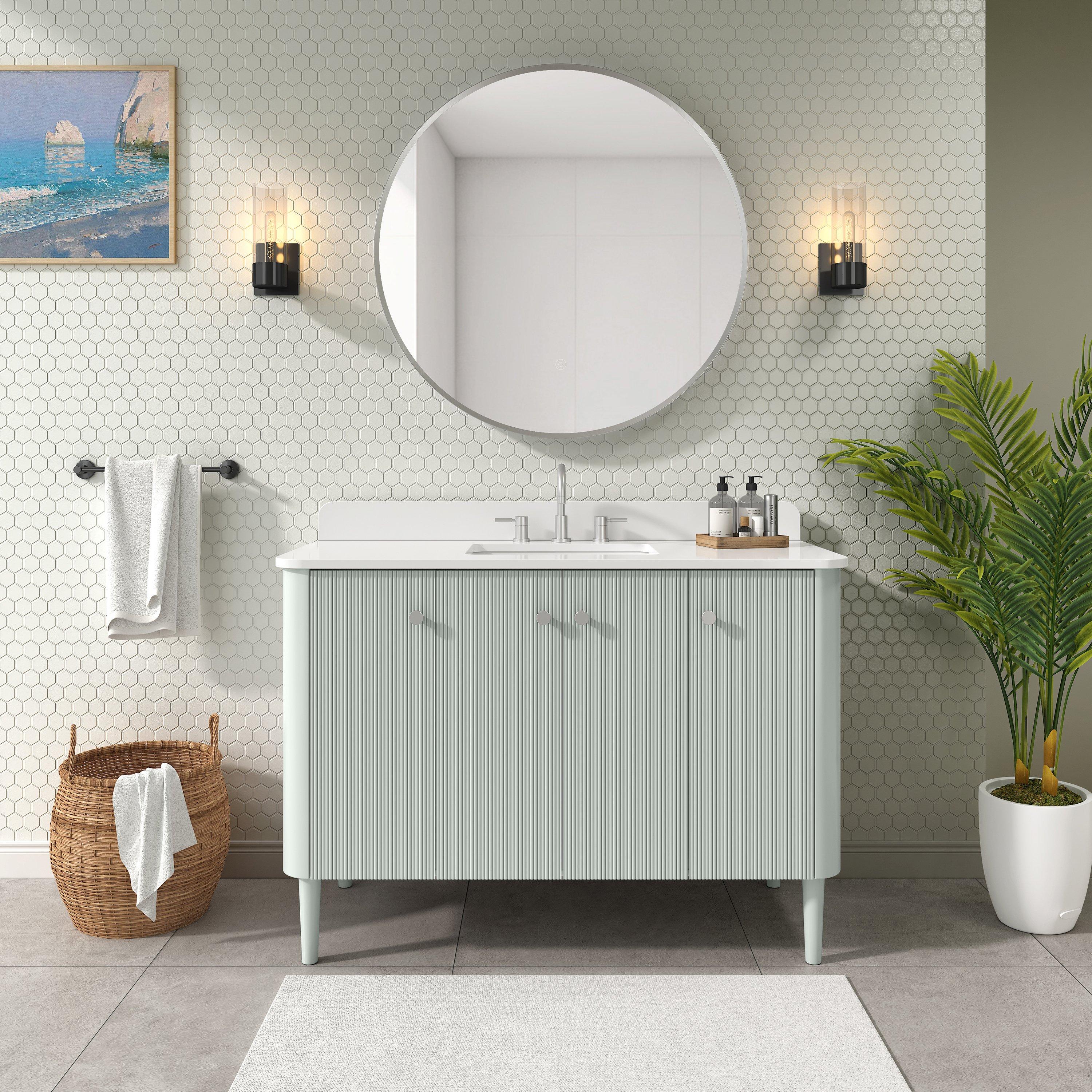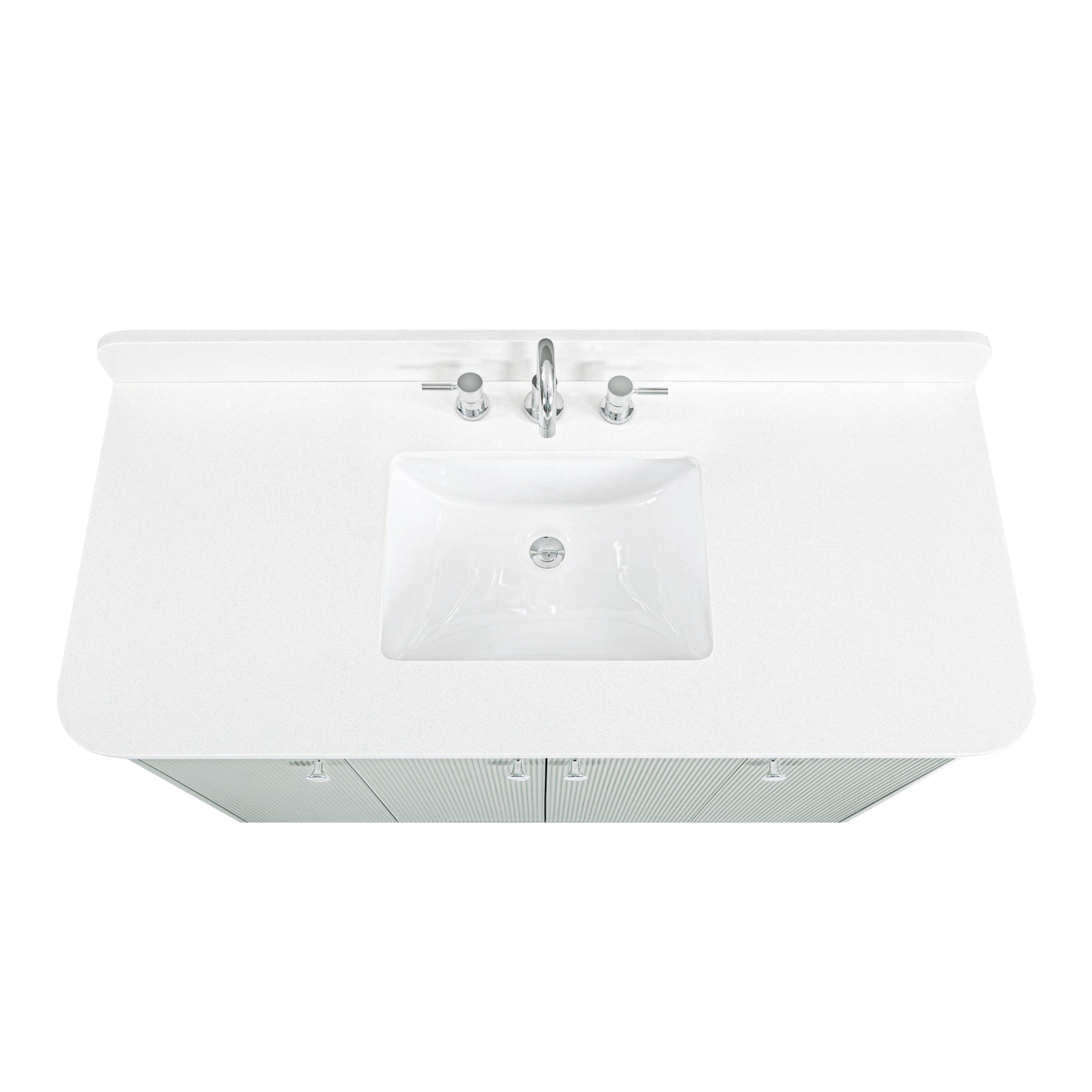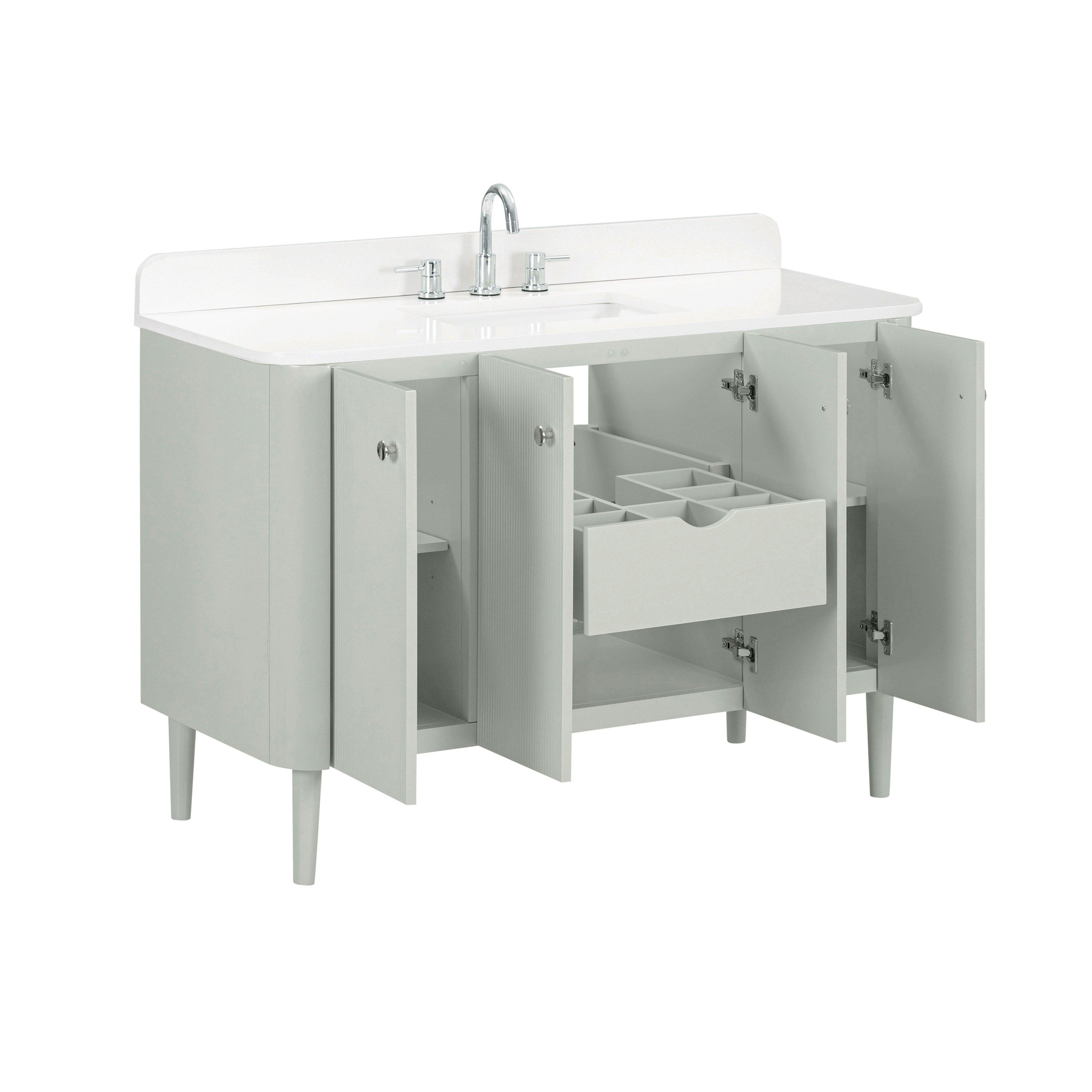 Complete your bathroom with the beautiful Hayden 49 in. Sage Green Vanity with Enigneered Stone Top. This wall mounted or freestanding features durable solid wood, mdf cabinets in stunning green with a white engineered stone vanity top and polished chrome hardware. A charming single undermount sink in brilliant white is included. The Hayden 49 in. Sage Green Vanity with Enigneered Stone Top is a versatile choice to customize multiple bathroom settings.