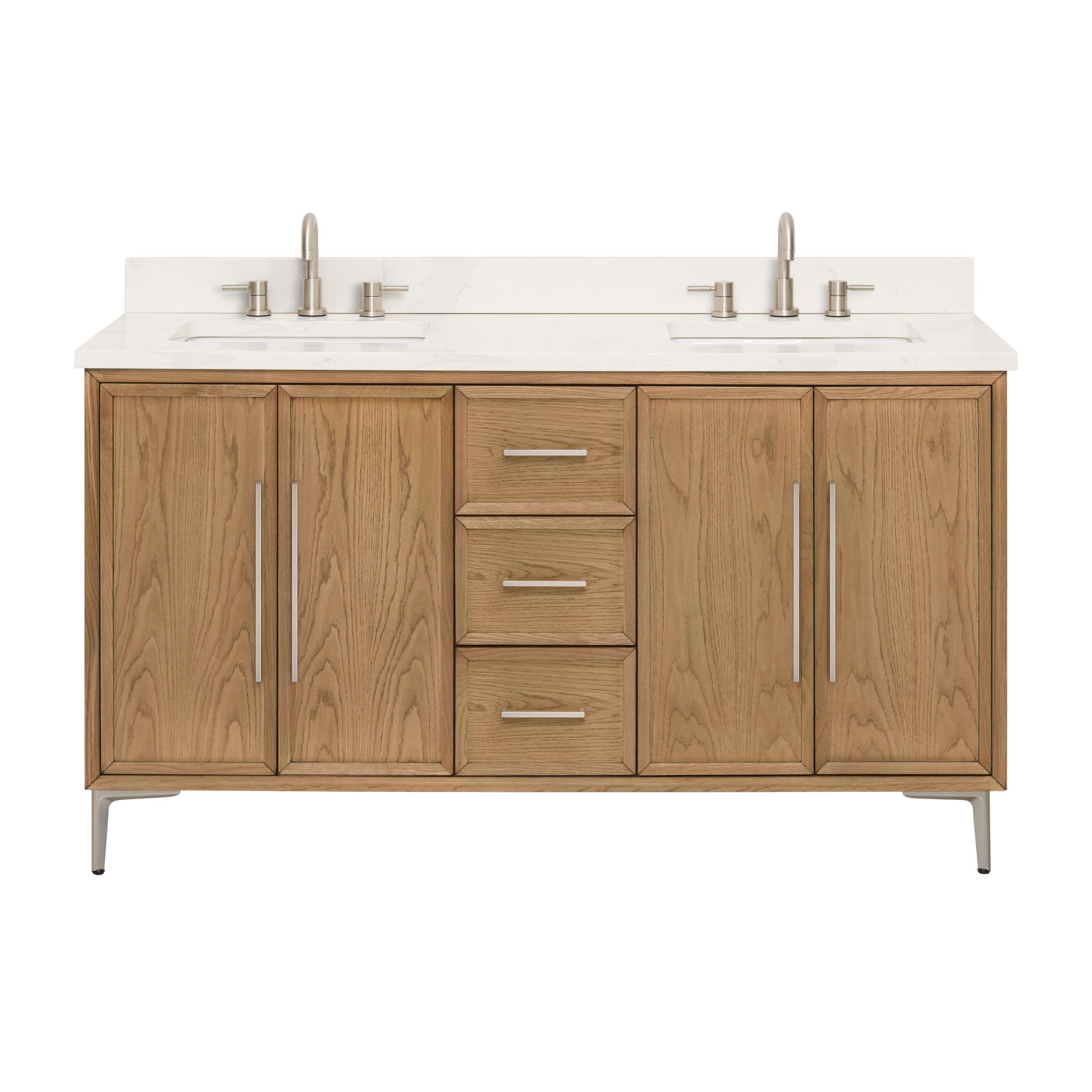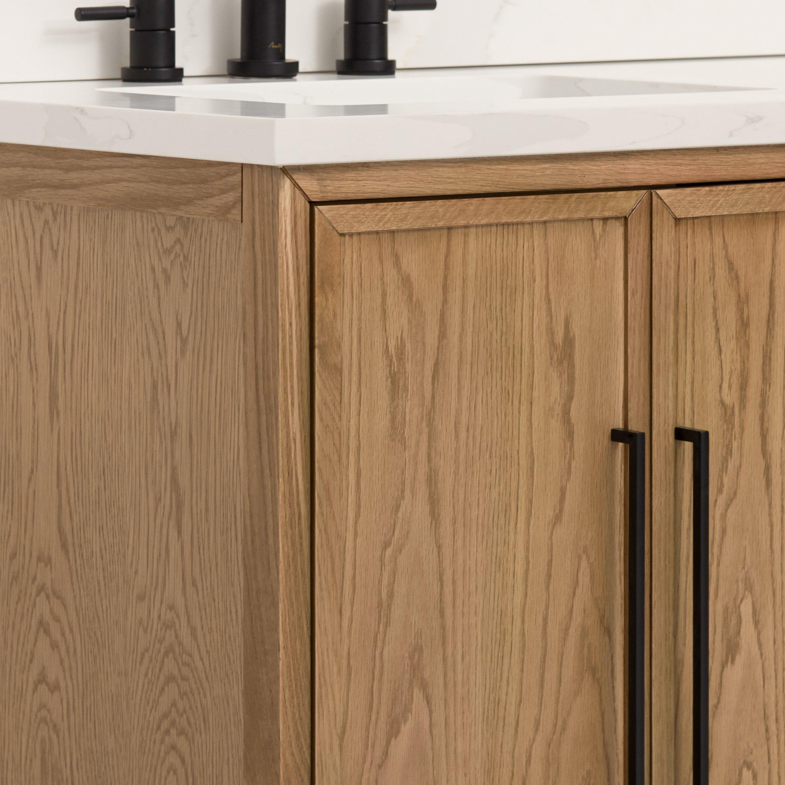 Complete your bathroom with the beautiful Hudson 61 in. Natural Oak Vanity with Quartz Top. This freestanding features durable multiple cabinets in stunning natural with a white quartz vanity top and matte black hardware. A charming single undermount sink in brilliant white is included. The Hudson 61 in. Natural Oak Vanity with Quartz Top is a versatile choice to customize multiple bathroom settings.
