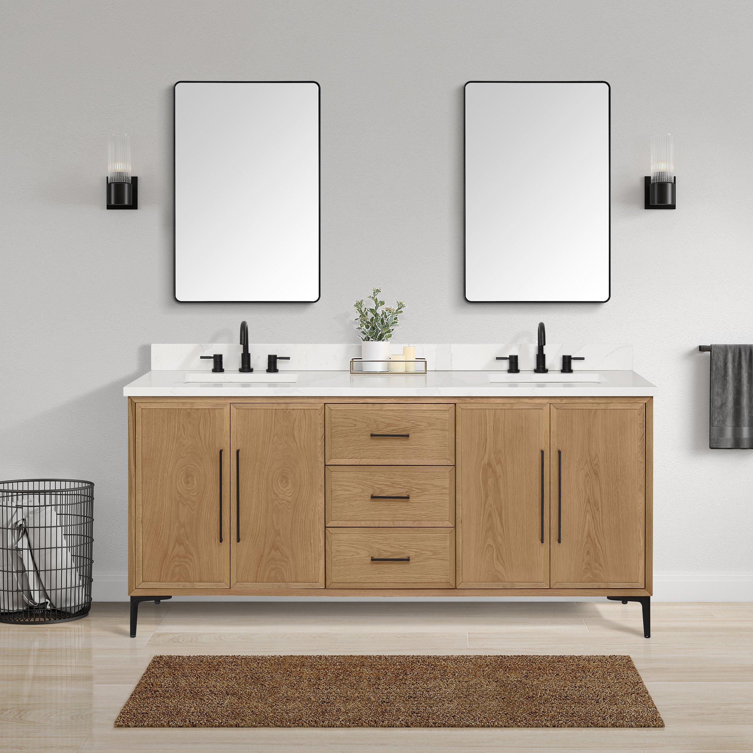 Complete your bathroom with the beautiful Hudson 73 in. Natural Oak Vanity with Quartz Top. This freestanding features durable multiple cabinets in stunning natural with a white quartz vanity top and matte black hardware. A charming single undermount sink in brilliant white is included. The Hudson 73 in. Natural Oak Vanity with Quartz Top is a versatile choice to customize multiple bathroom settings.