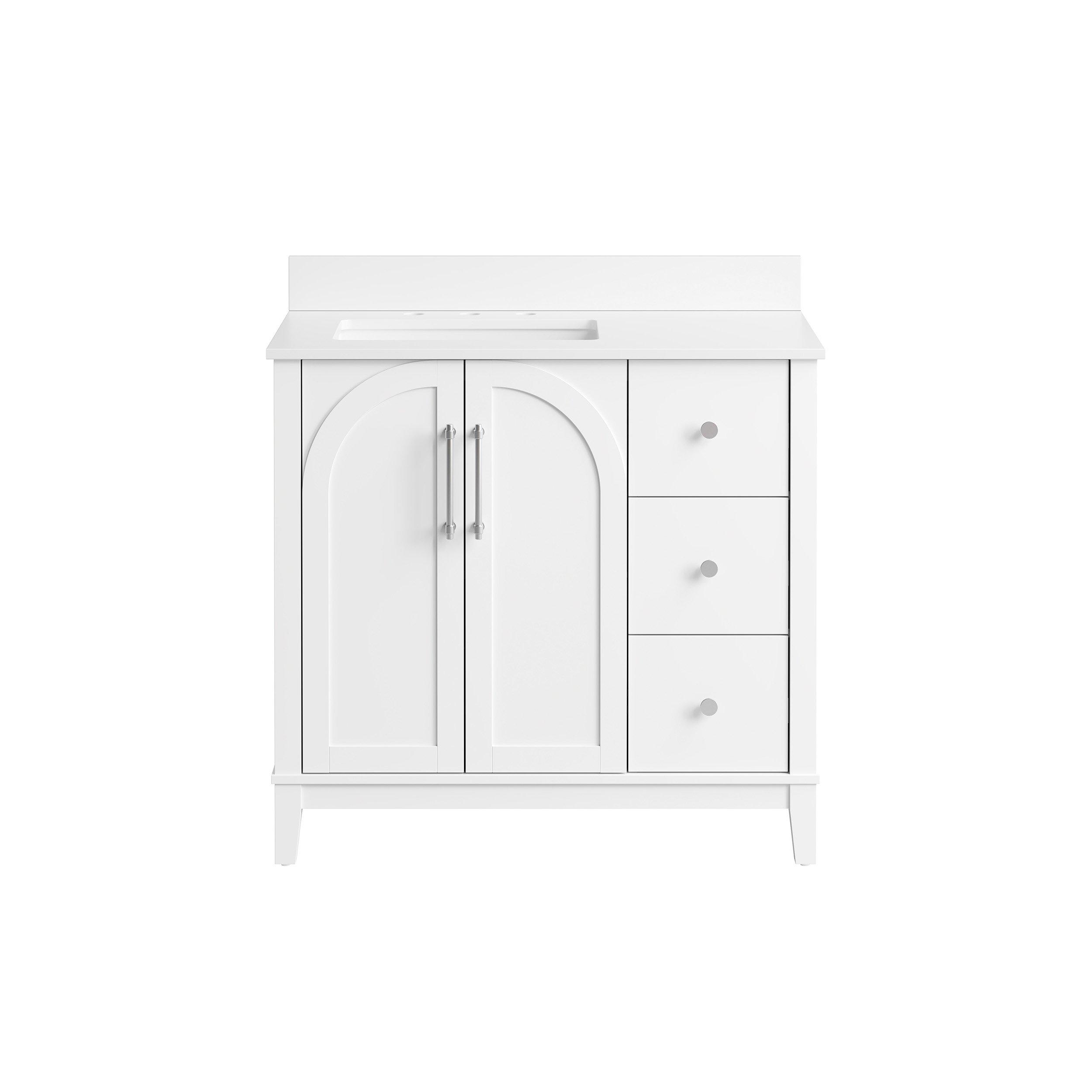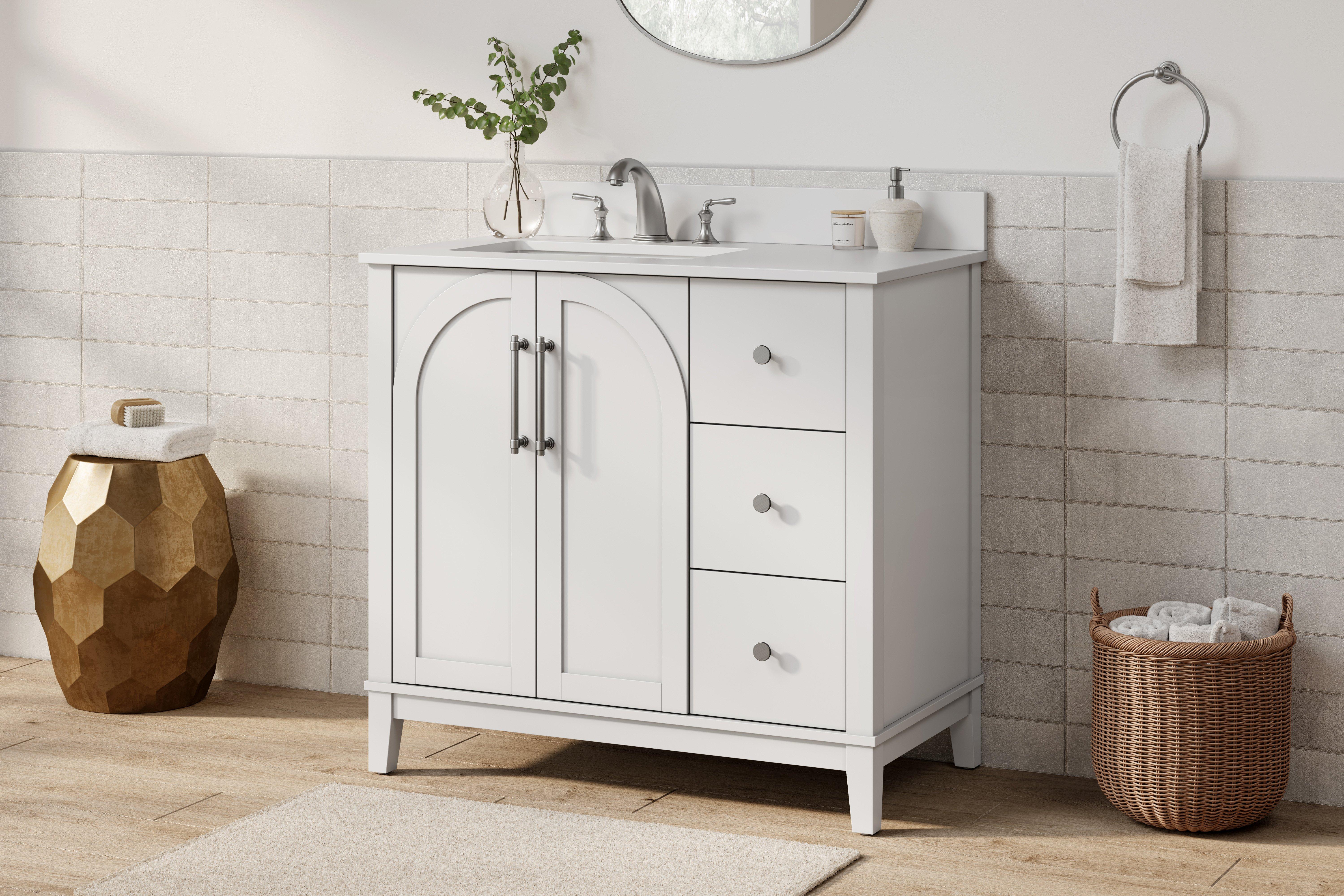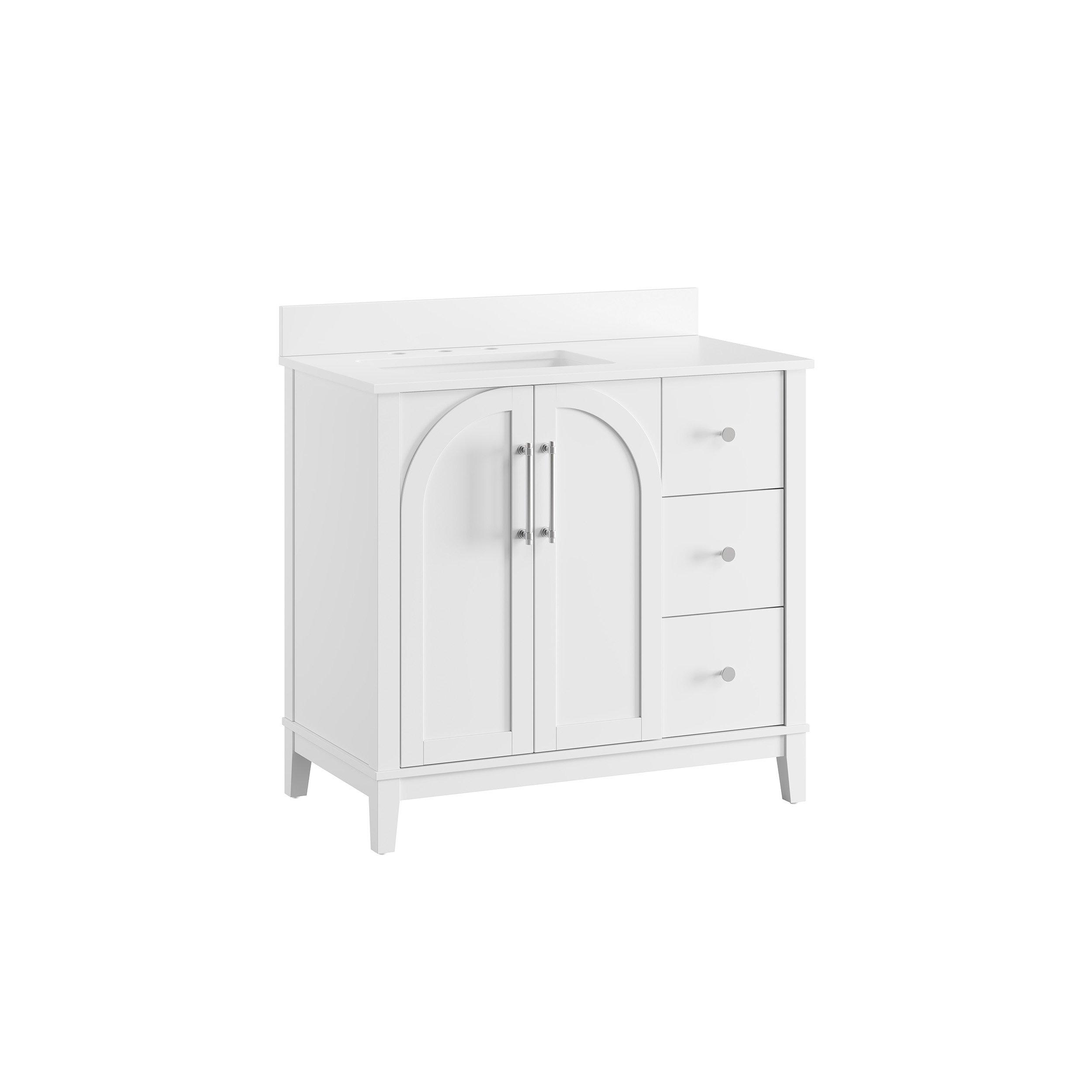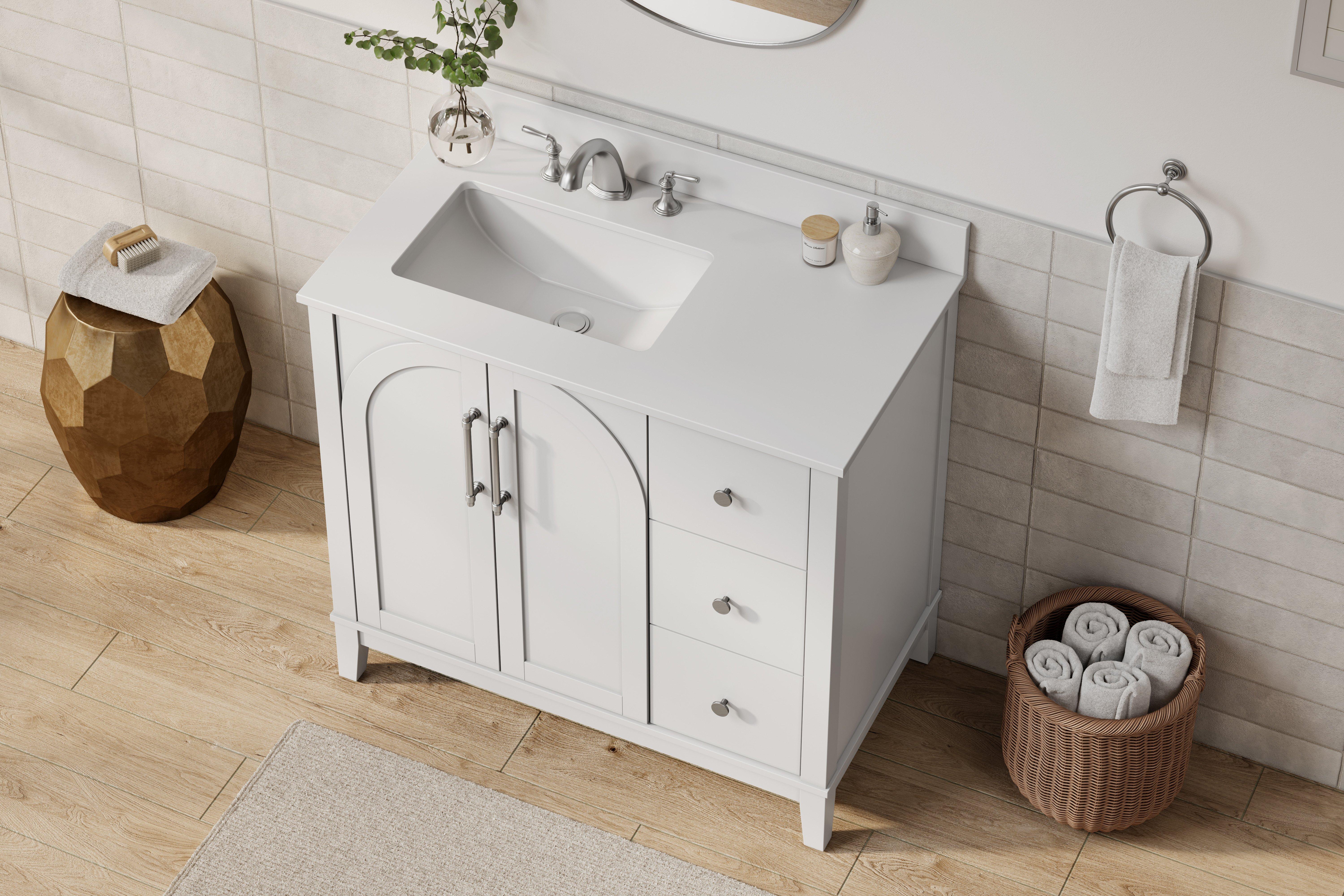 Complete your bathroom with the beautiful Hutchinson 37 in. White Vanity with Engineered Stone Top. This freestanding features durable solid wood, mdf cabinets in stunning white with a white composite vanity top and matte n/a hardware. A charming single undermount sink in brilliant white is included. The Hutchinson 37 in. White Vanity with Engineered Stone Top is a versatile choice to customize multiple bathroom settings.
