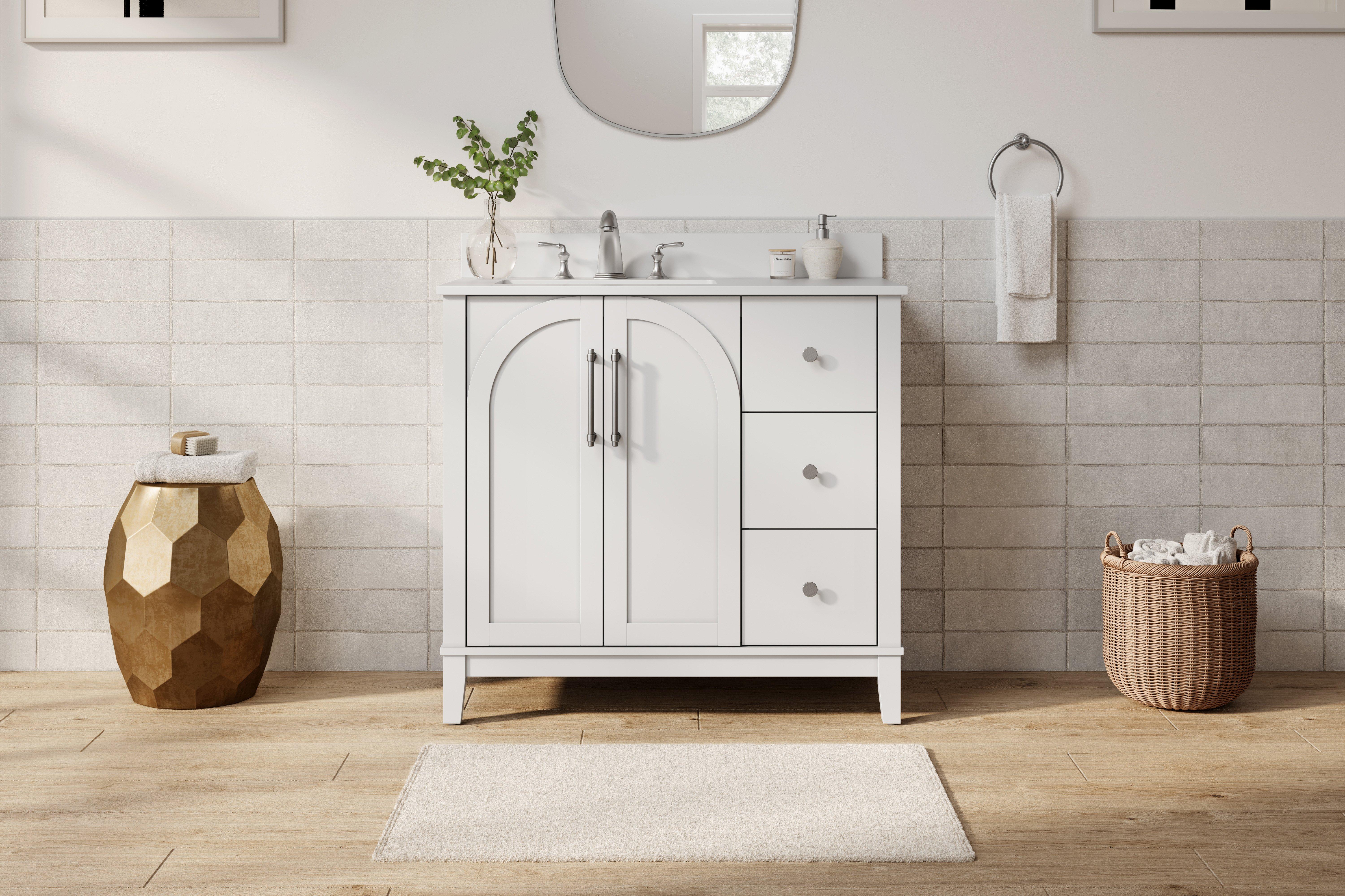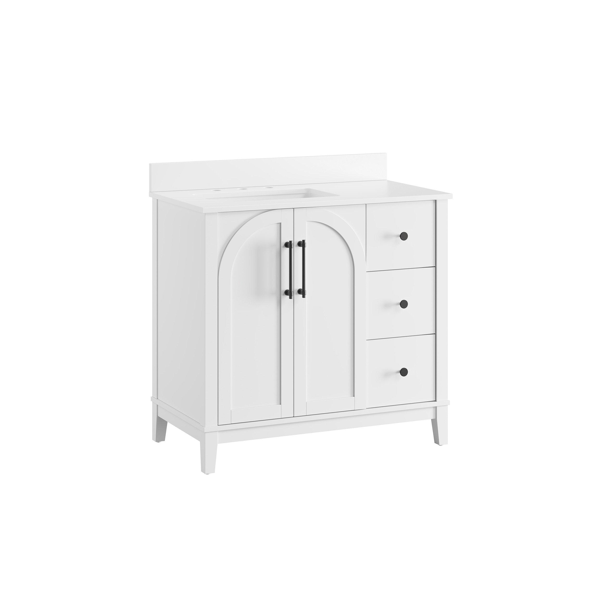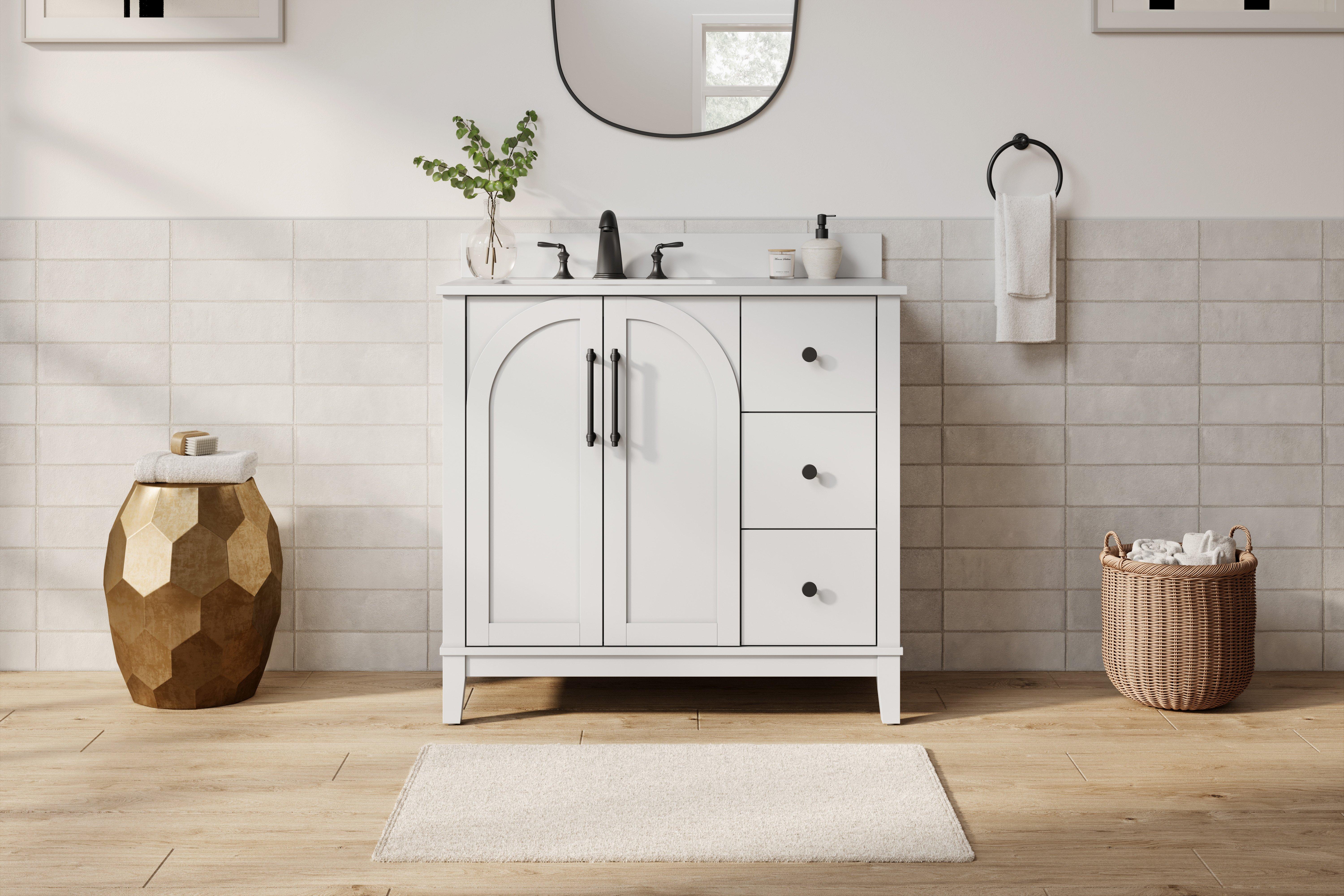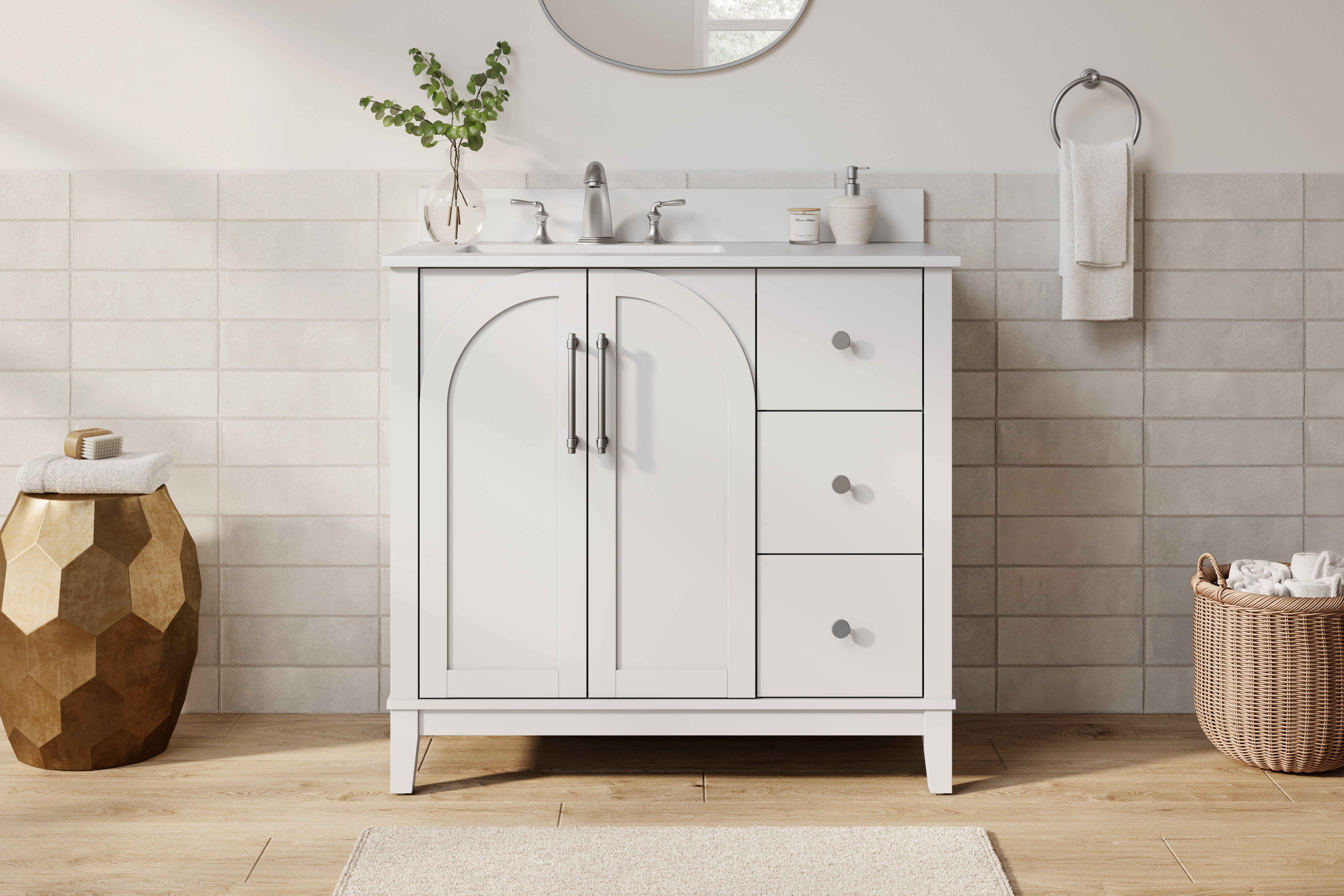 Complete your bathroom with the beautiful Hutchinson 37 in. White Vanity with Engineered Stone Top. This freestanding features durable solid wood, mdf cabinets in stunning white with a white composite vanity top and matte n/a hardware. A charming single undermount sink in brilliant white is included. The Hutchinson 37 in. White Vanity with Engineered Stone Top is a versatile choice to customize multiple bathroom settings.
