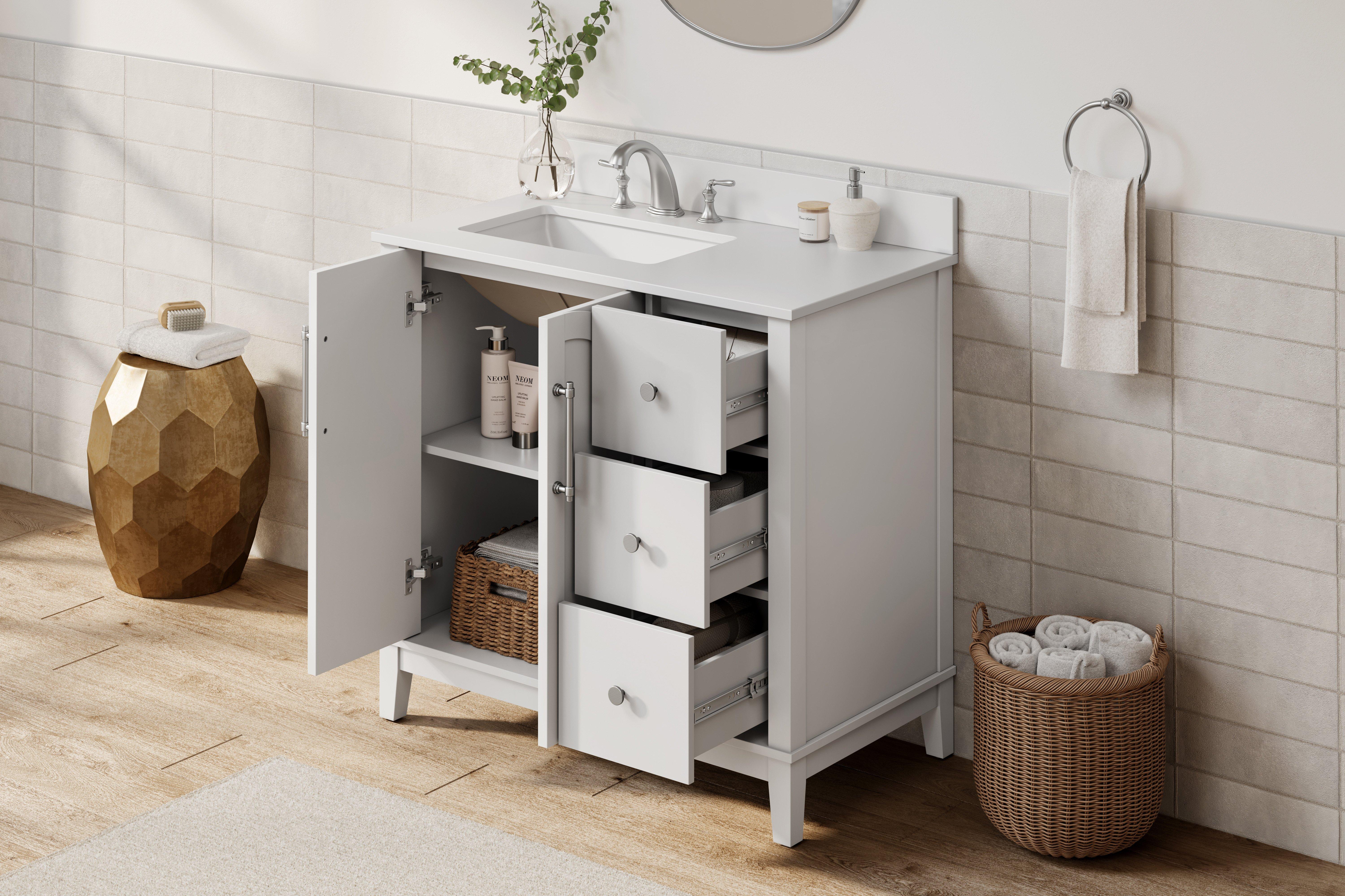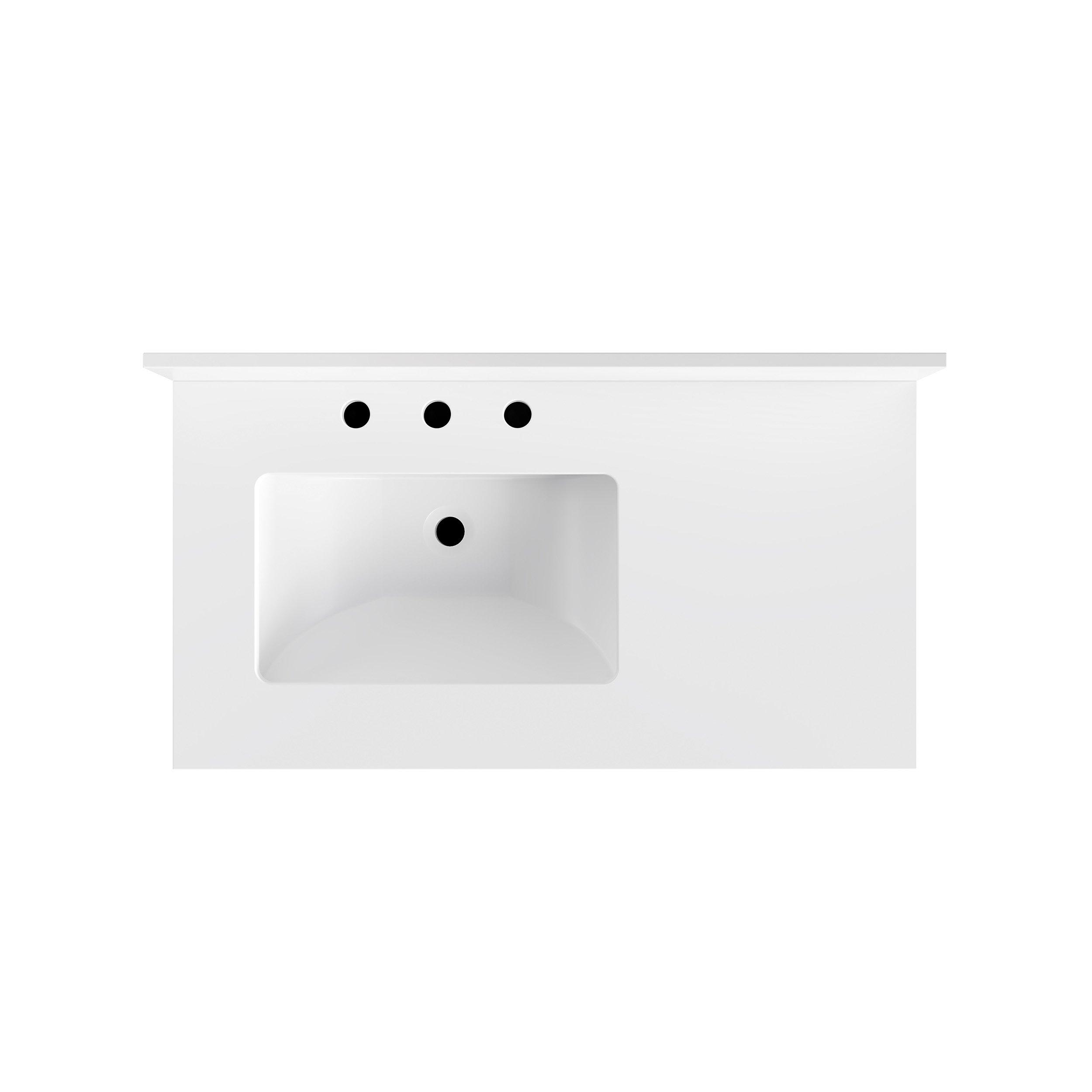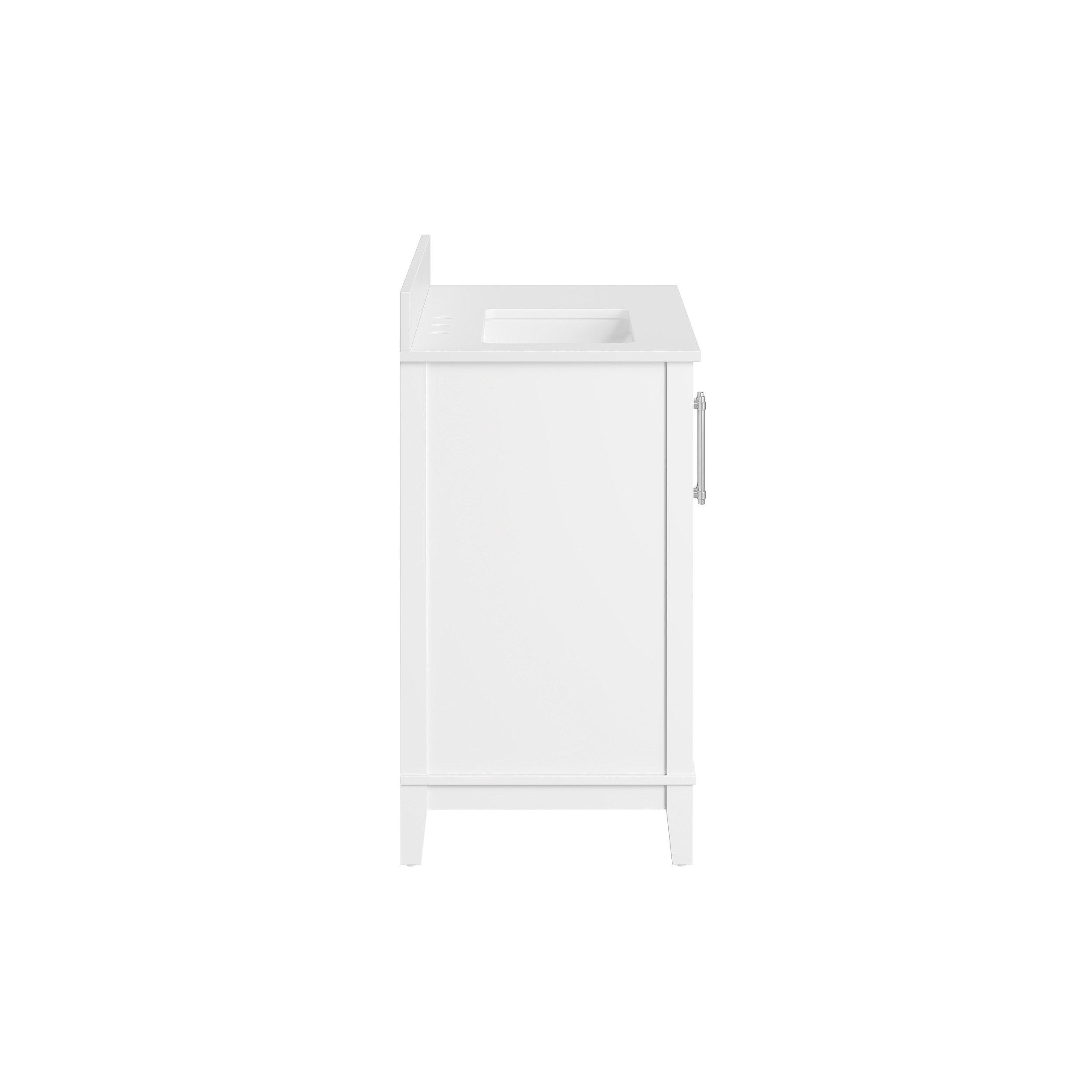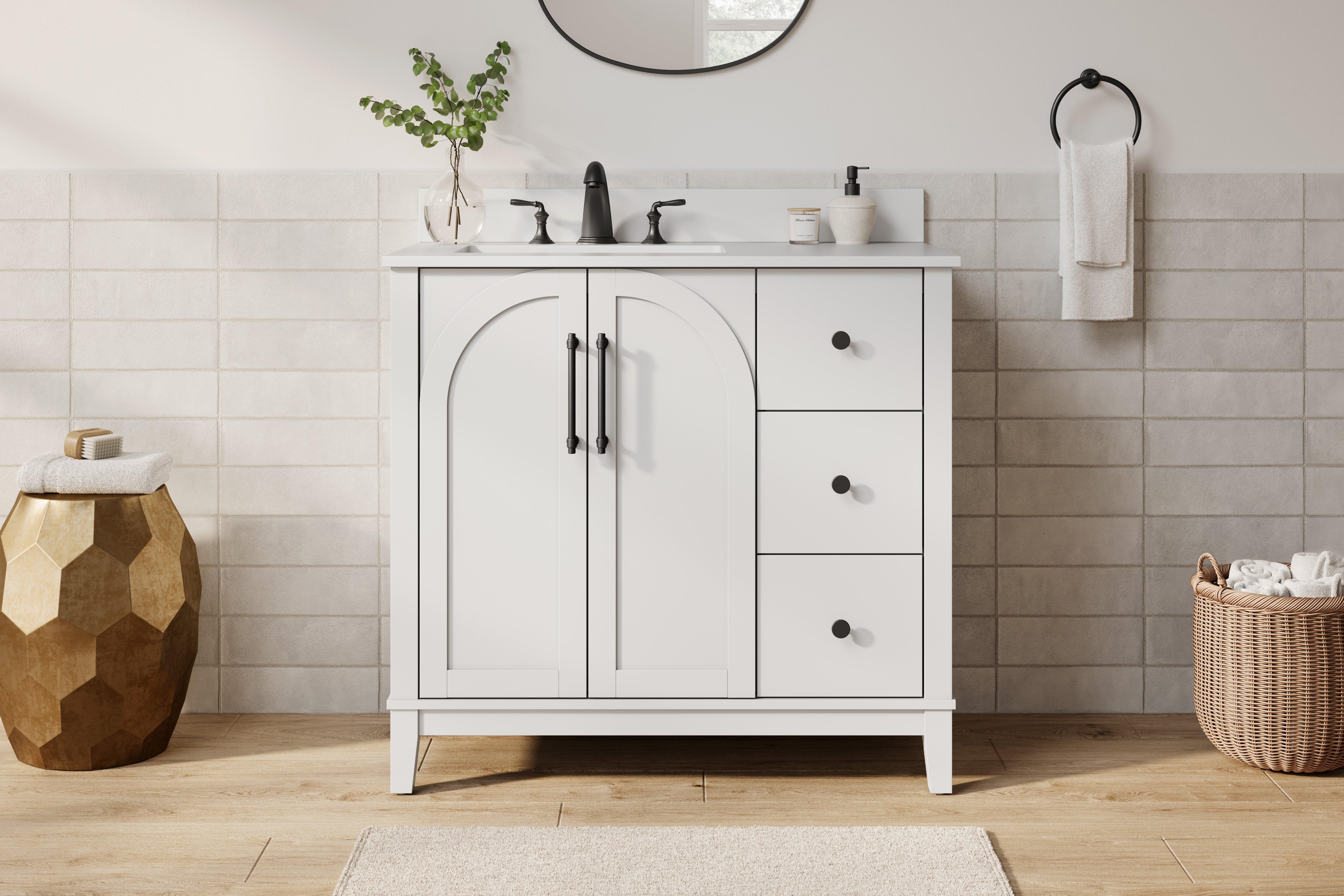 Complete your bathroom with the beautiful Hutchinson 37 in. White Vanity with Engineered Stone Top. This freestanding features durable solid wood, mdf cabinets in stunning white with a white composite vanity top and matte n/a hardware. A charming single undermount sink in brilliant white is included. The Hutchinson 37 in. White Vanity with Engineered Stone Top is a versatile choice to customize multiple bathroom settings.
