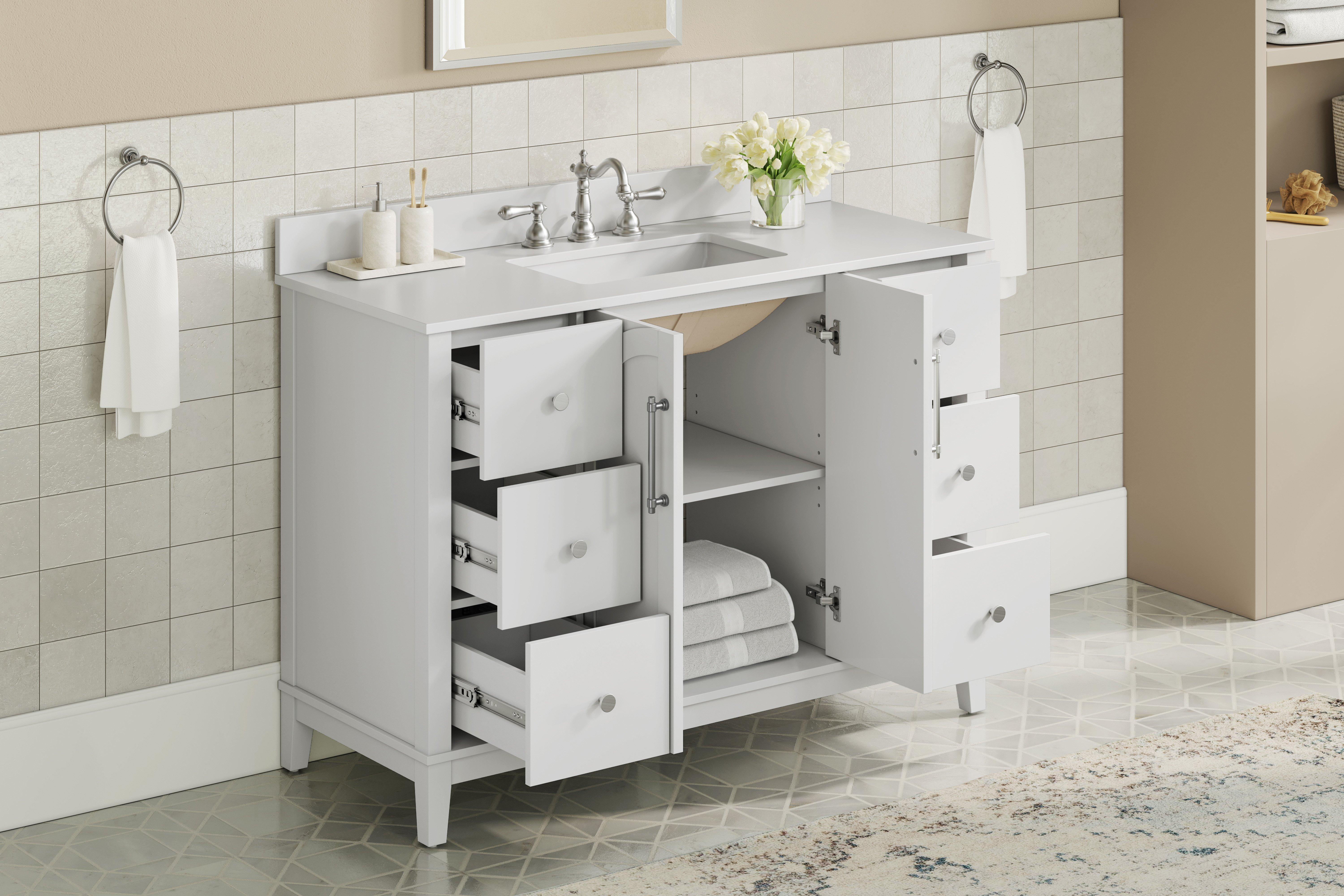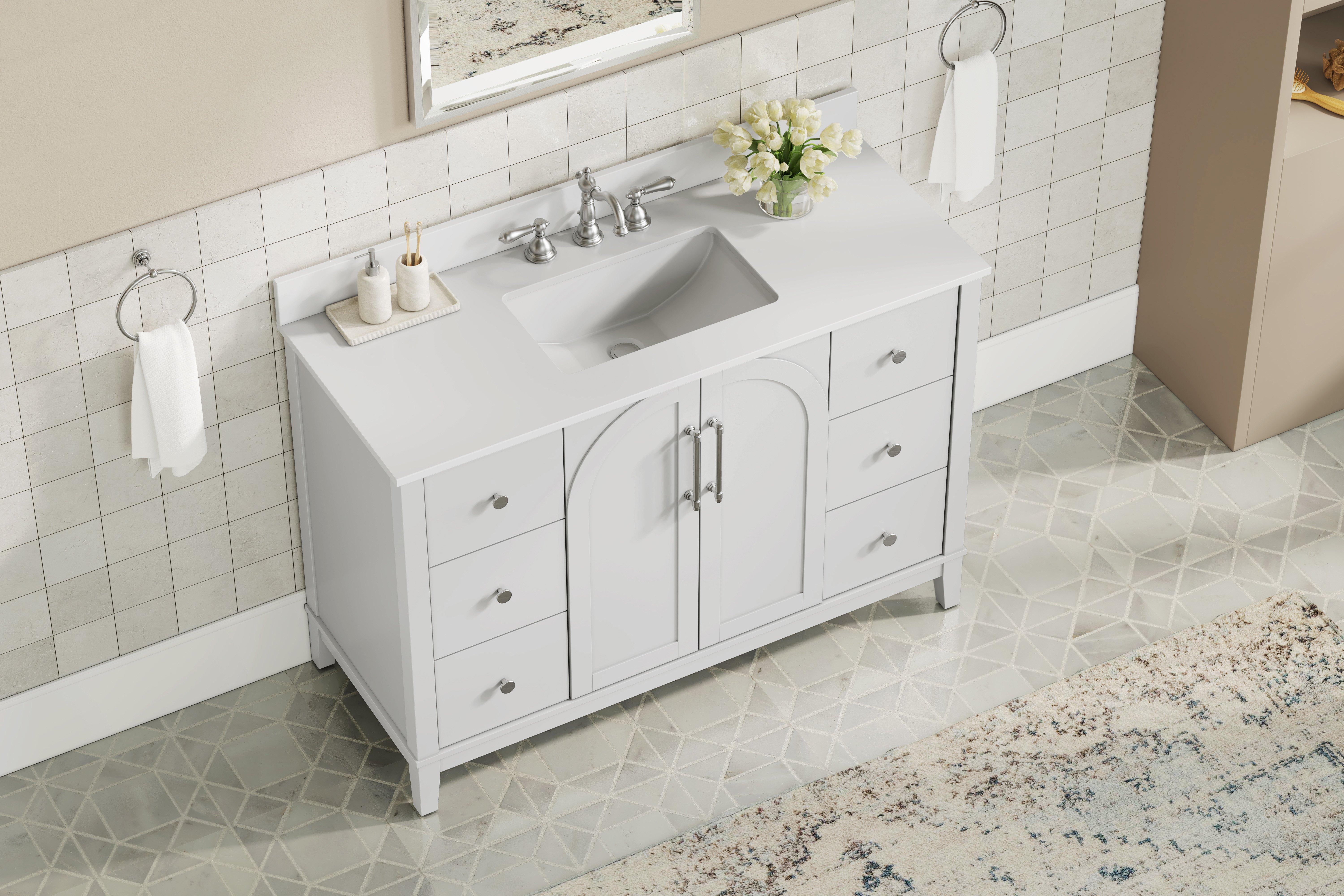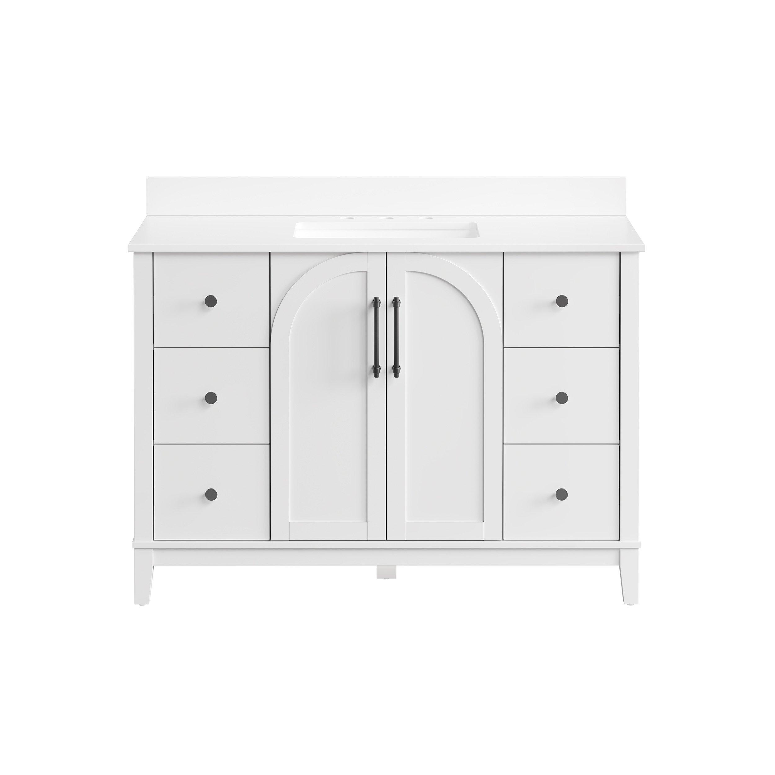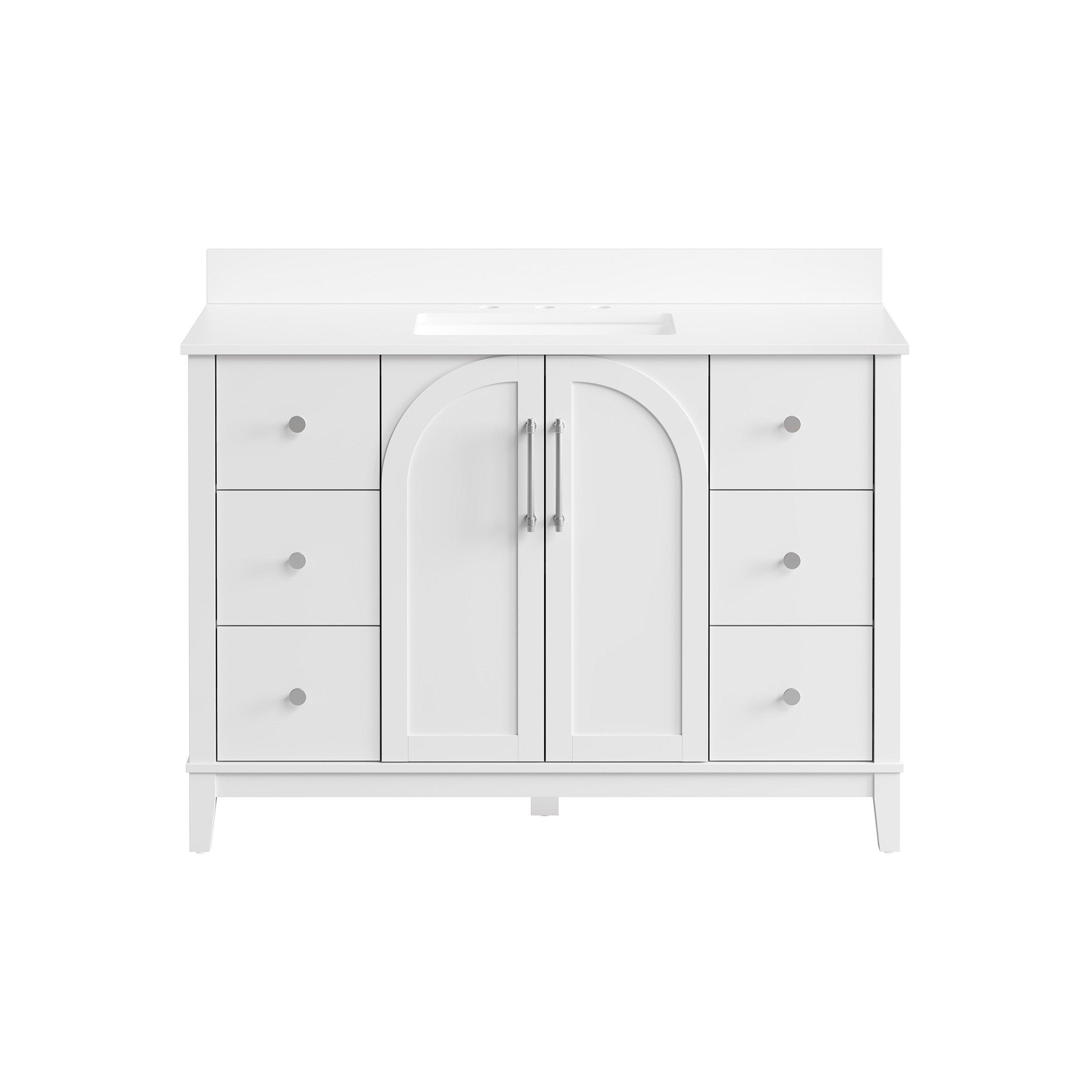 Tailor the look of your bathroom with the Hutchinson 49 in. White Vanity with Engineered Stone Top featuring gorgeous solid wood, mdf in white with 2 doors, 6 drawers, and 1 shelves. This piece is completed with beautiful matte black hardware and a single undermount white sink. The Hutchinson 49 in. White Vanity with Engineered Stone Top is a stunning addition to any bathroom setting.