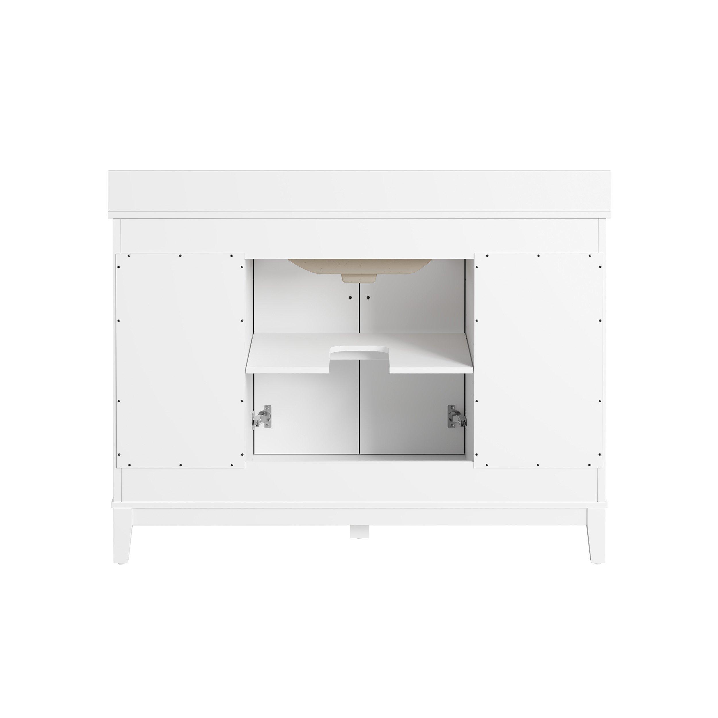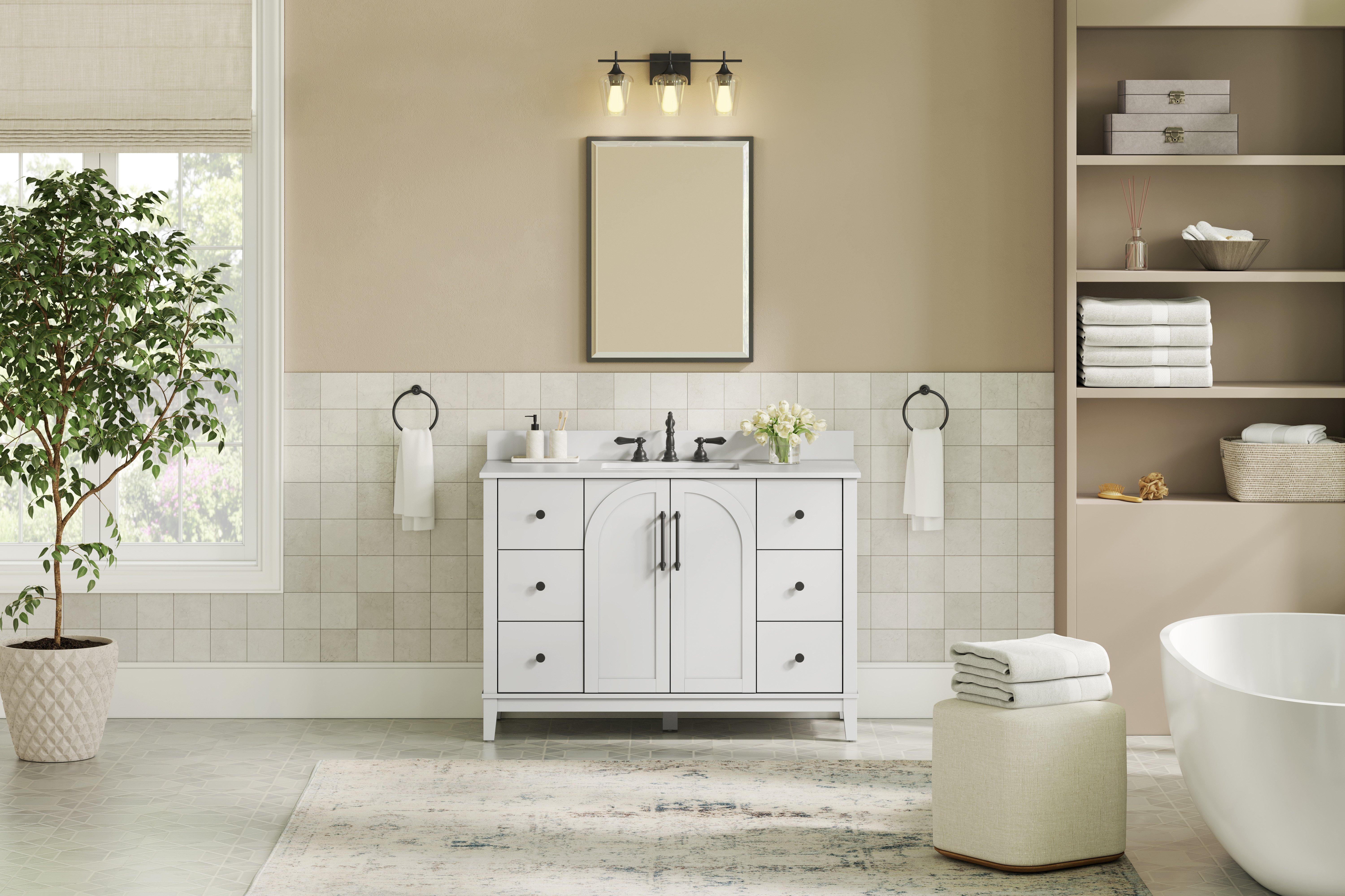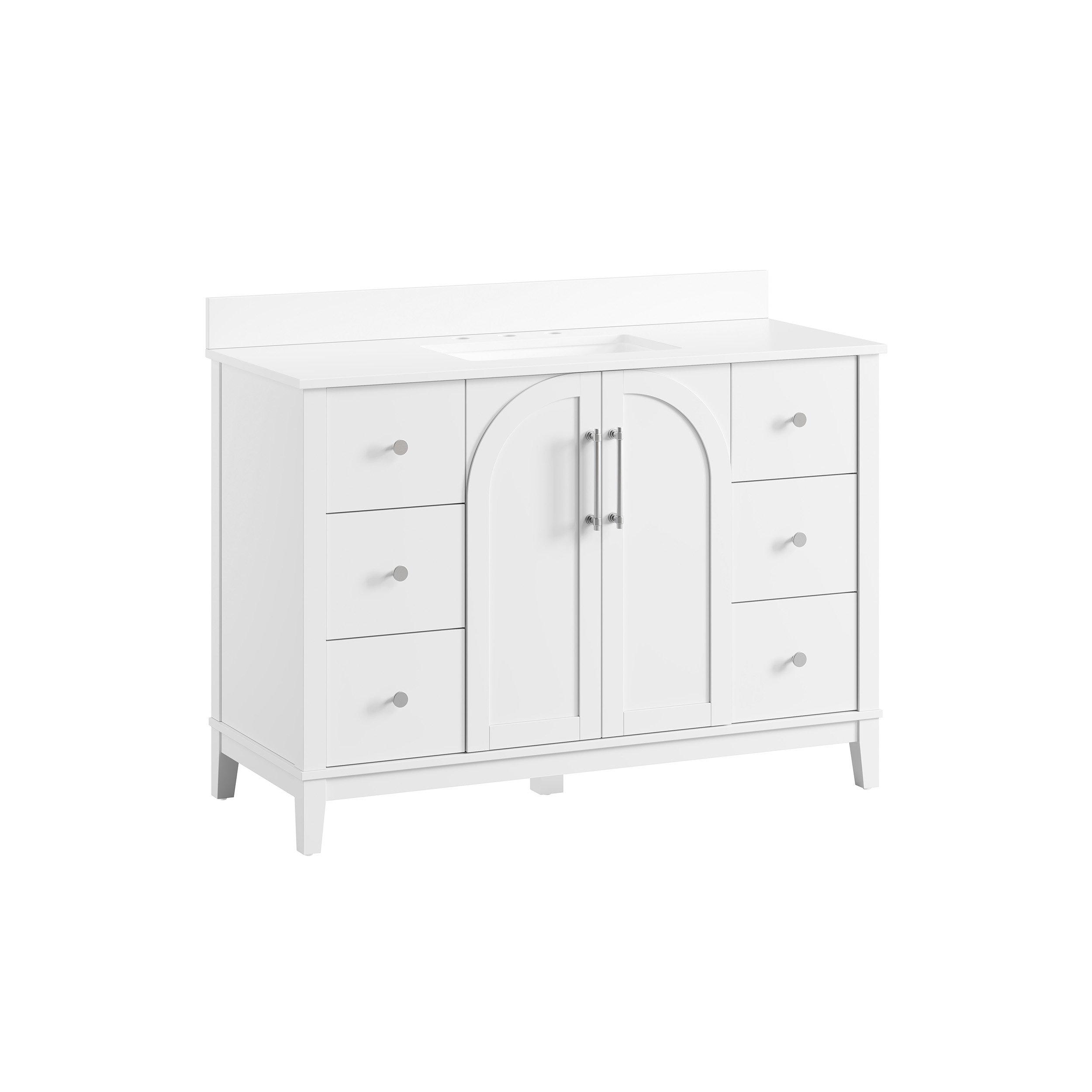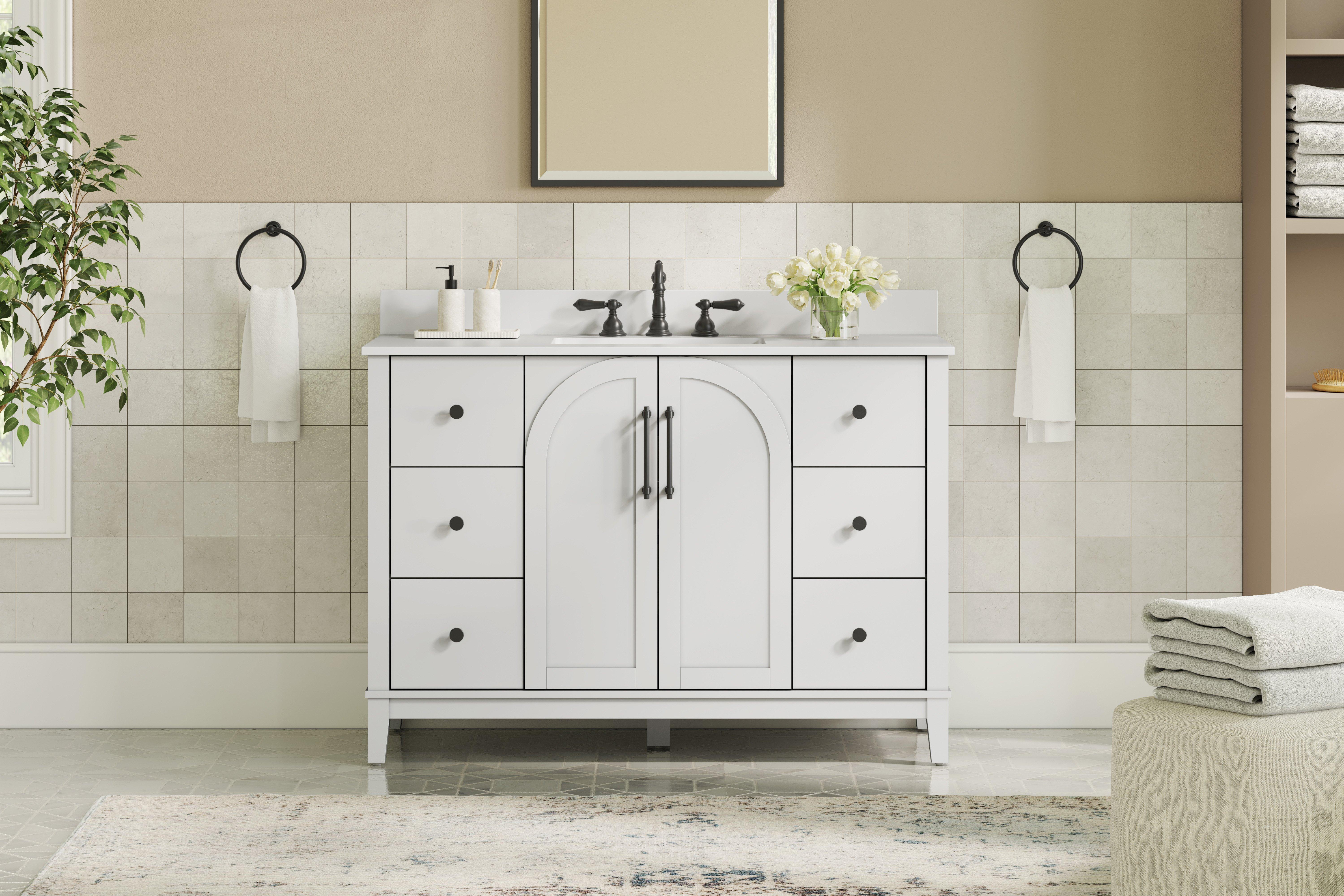 Tailor the look of your bathroom with the Hutchinson 49 in. White Vanity with Engineered Stone Top featuring gorgeous solid wood, mdf in white with 2 doors, 6 drawers, and 1 shelves. This piece is completed with beautiful matte black hardware and a single undermount white sink. The Hutchinson 49 in. White Vanity with Engineered Stone Top is a stunning addition to any bathroom setting.