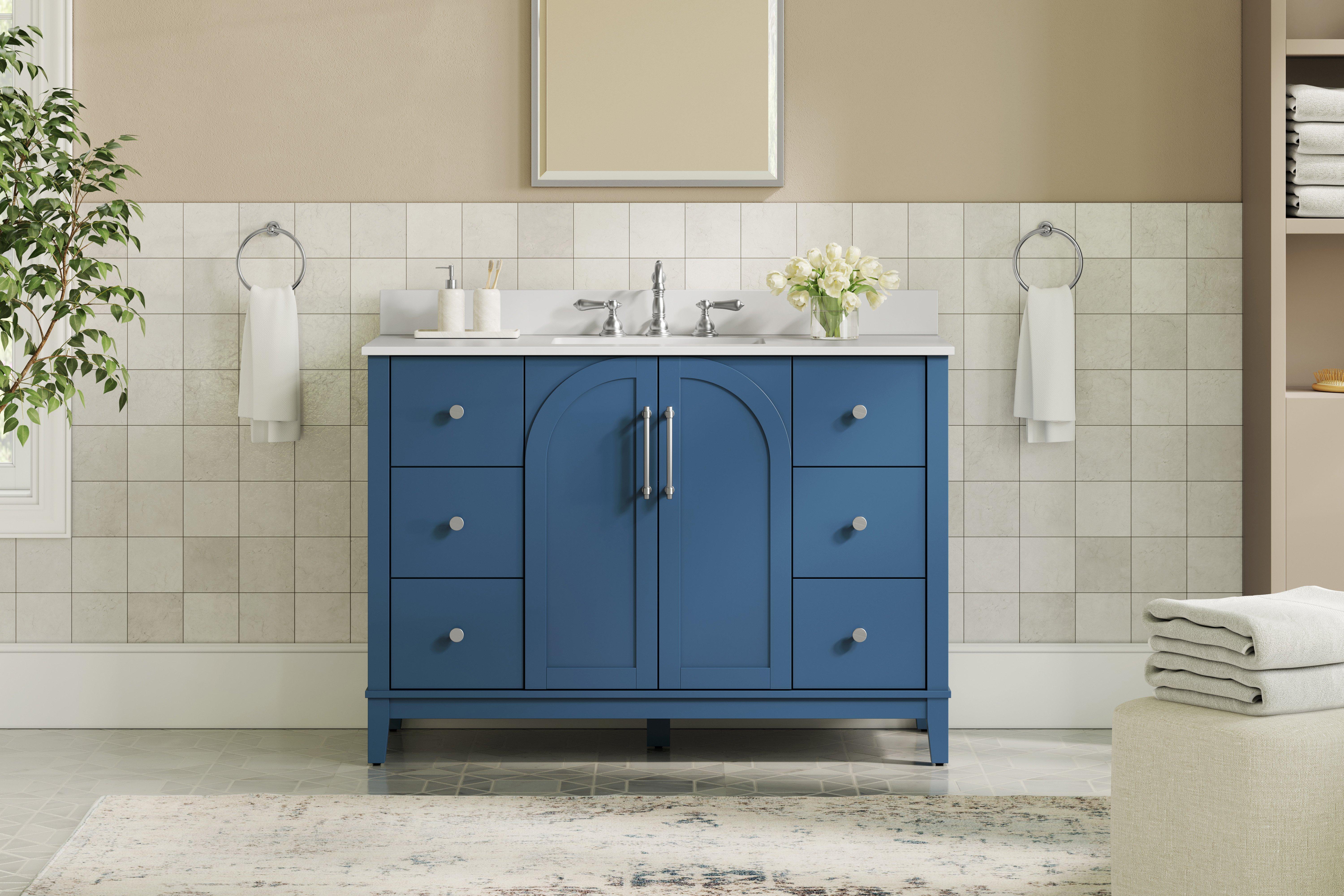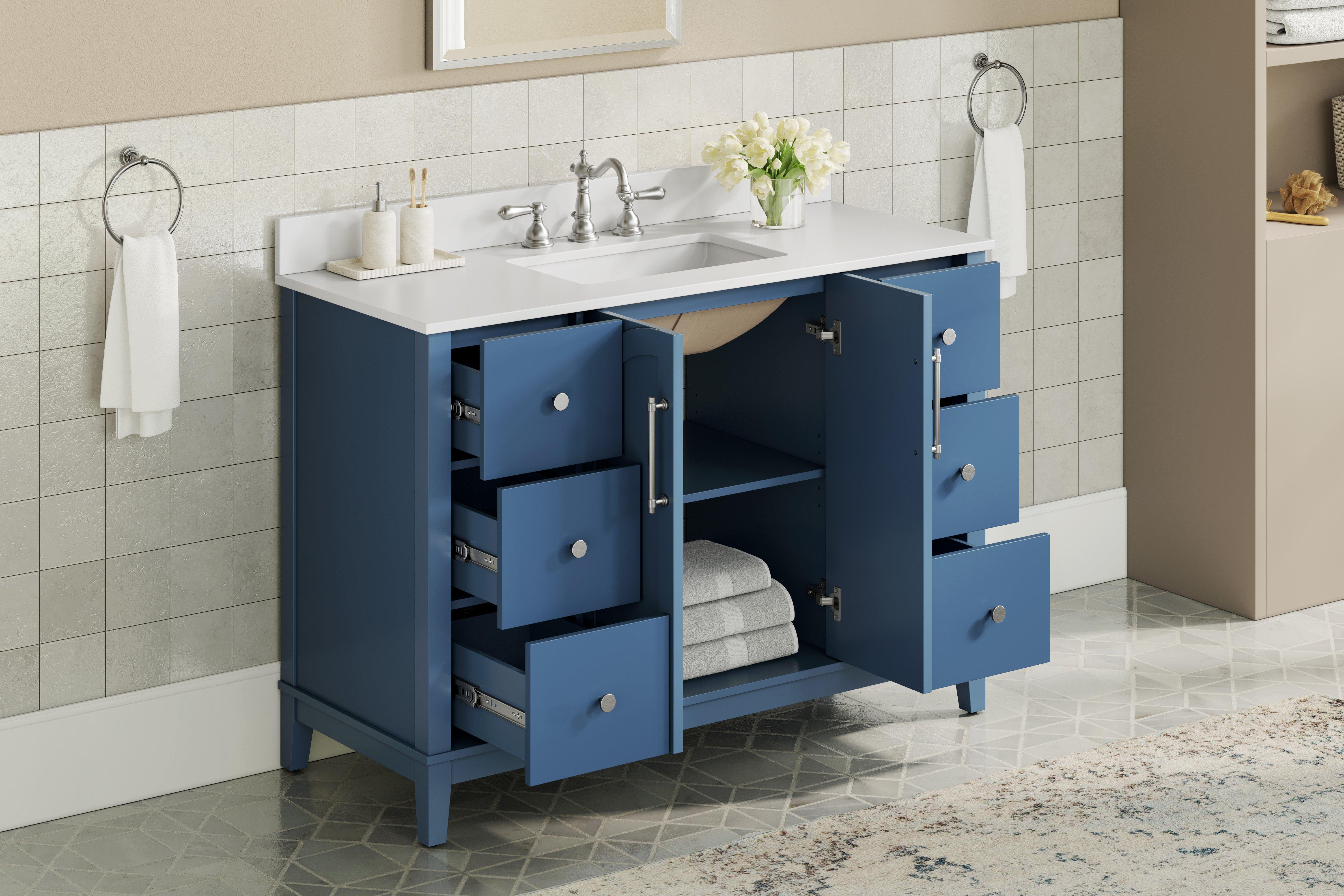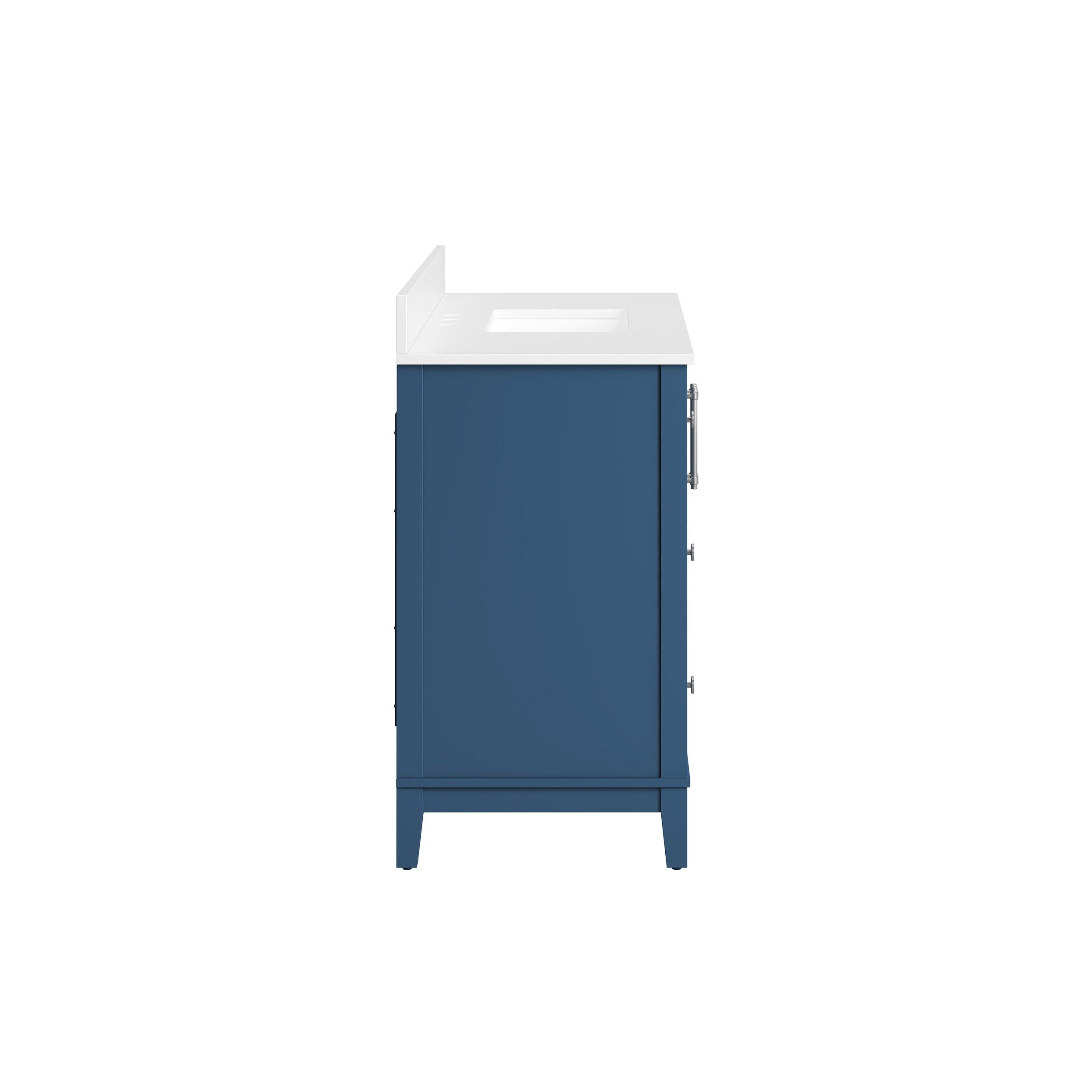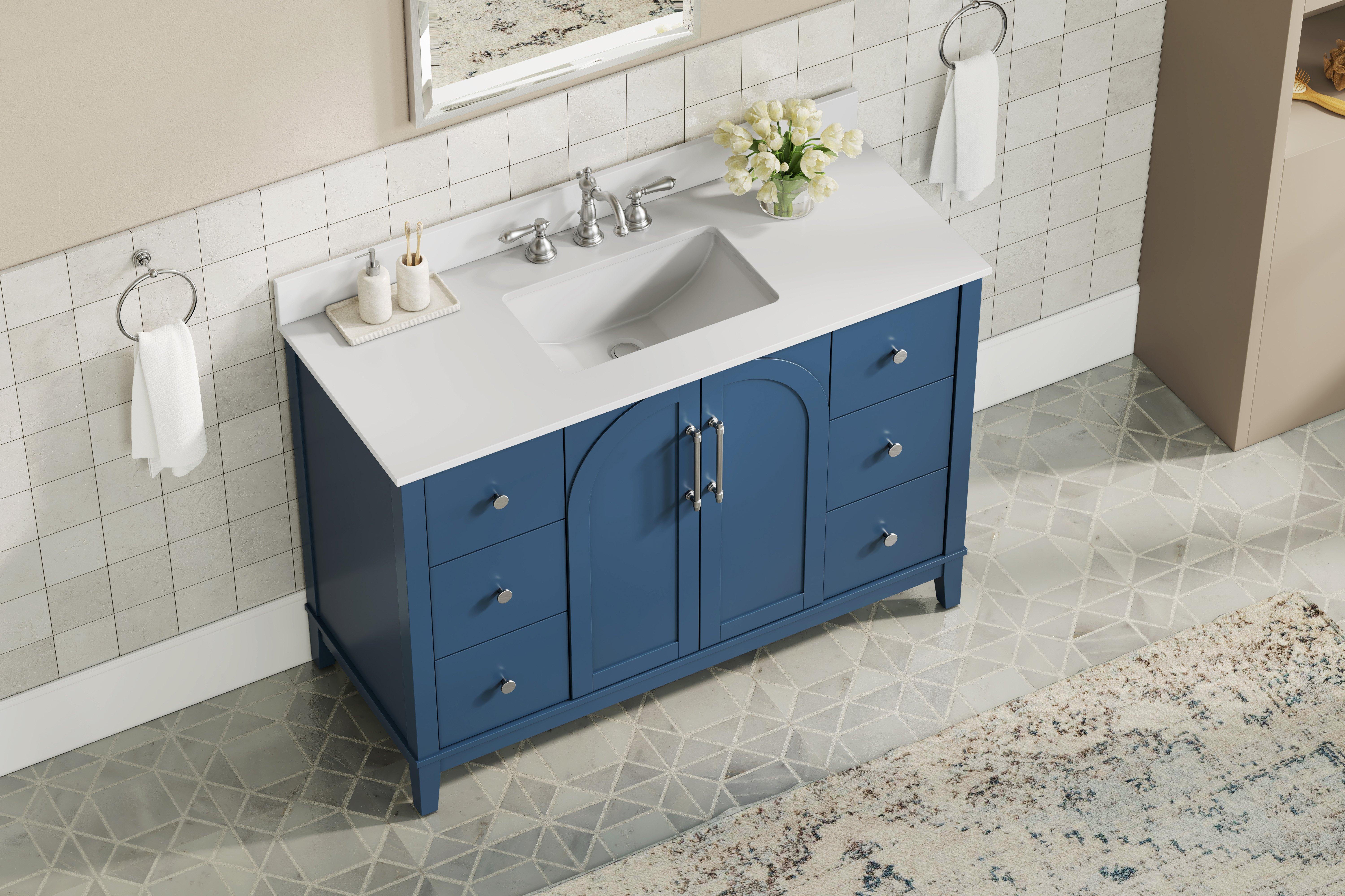 Complete your bathroom with the beautiful Hutchinson 49 in. Blue Vanity with Engineered Stone Top. This freestanding features durable solid wood, mdf cabinets in stunning blue with a white composite vanity top and brushed nickel hardware. A charming single undermount sink in brilliant white is included. The Hutchinson 49 in. Blue Vanity with Engineered Stone Top is a versatile choice to customize multiple bathroom settings.