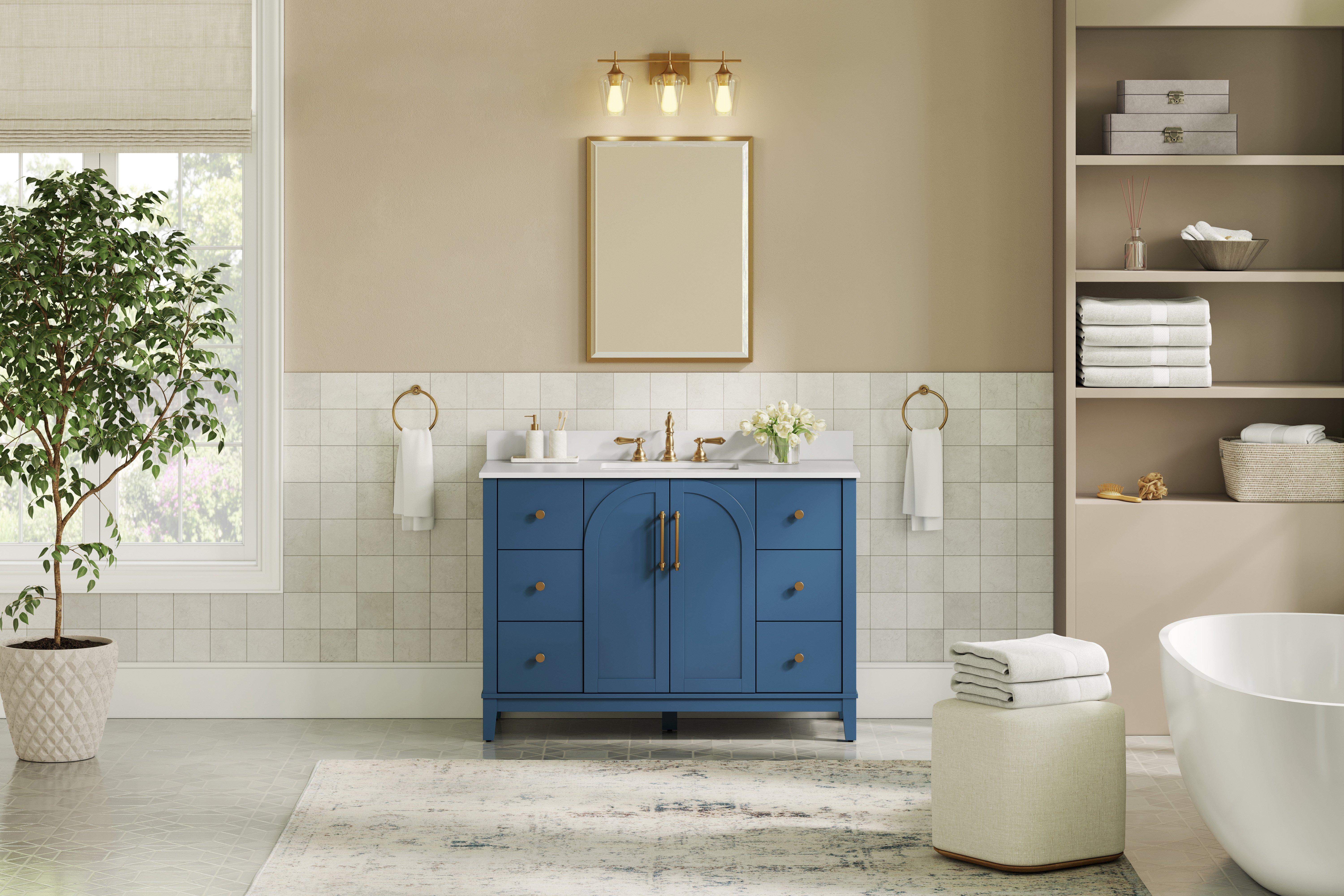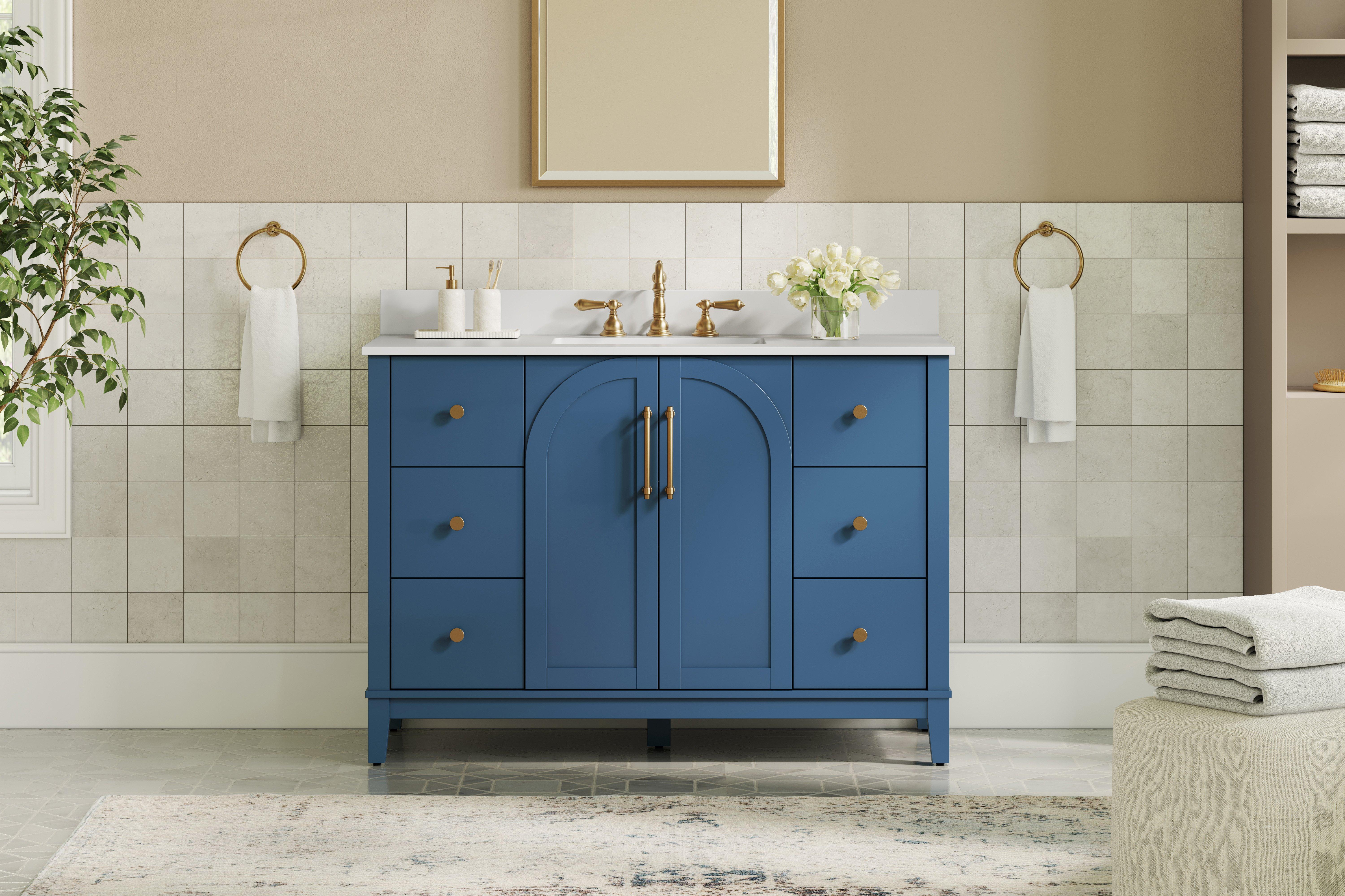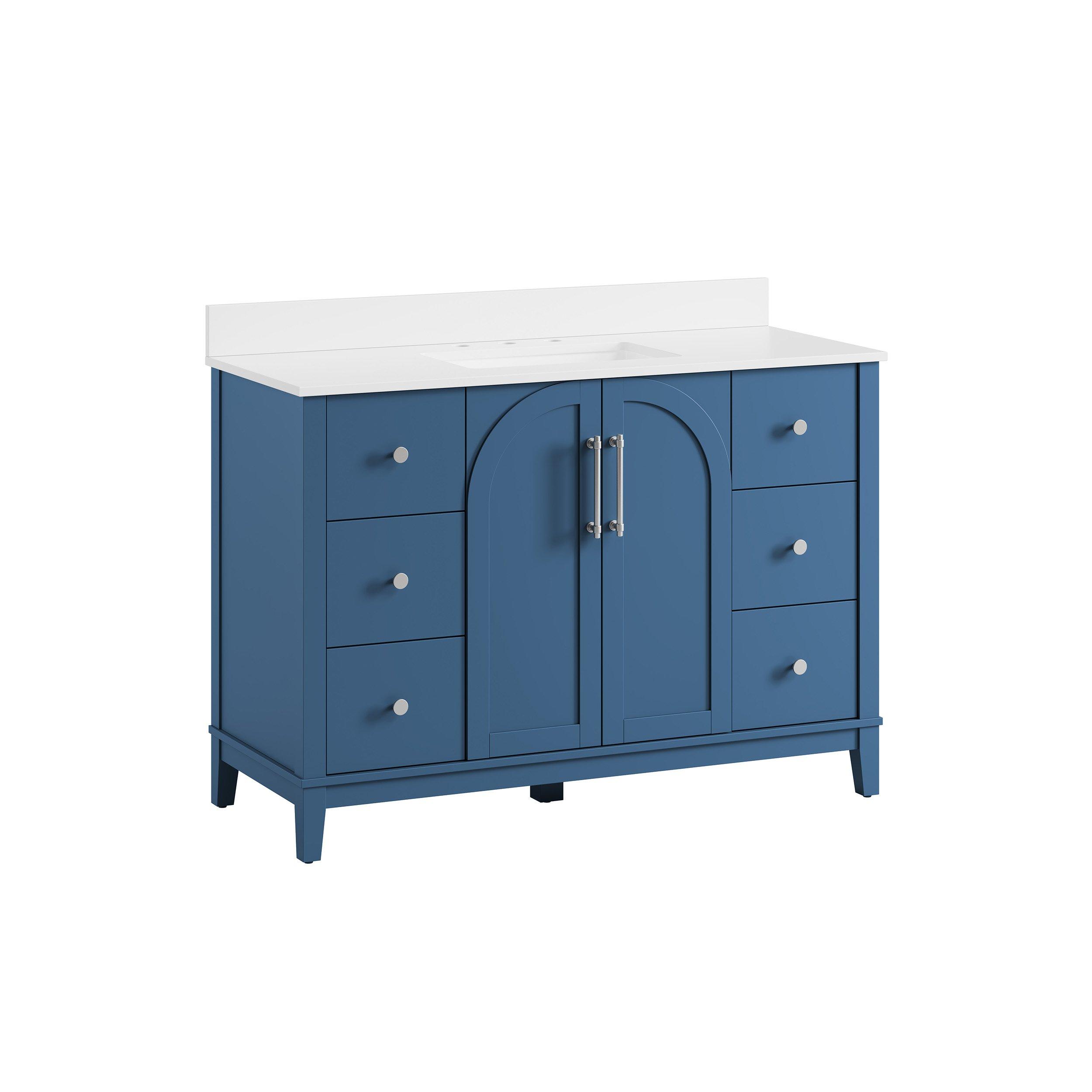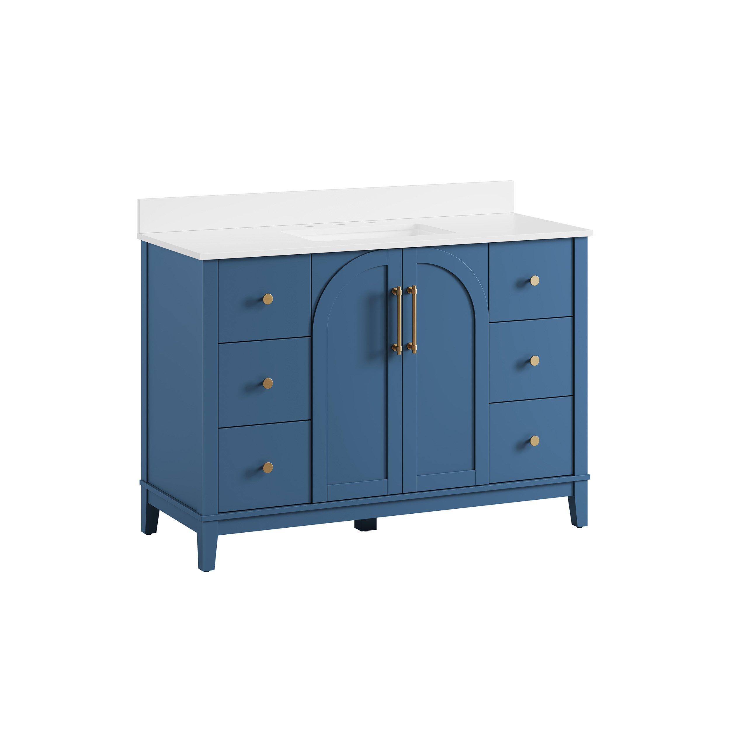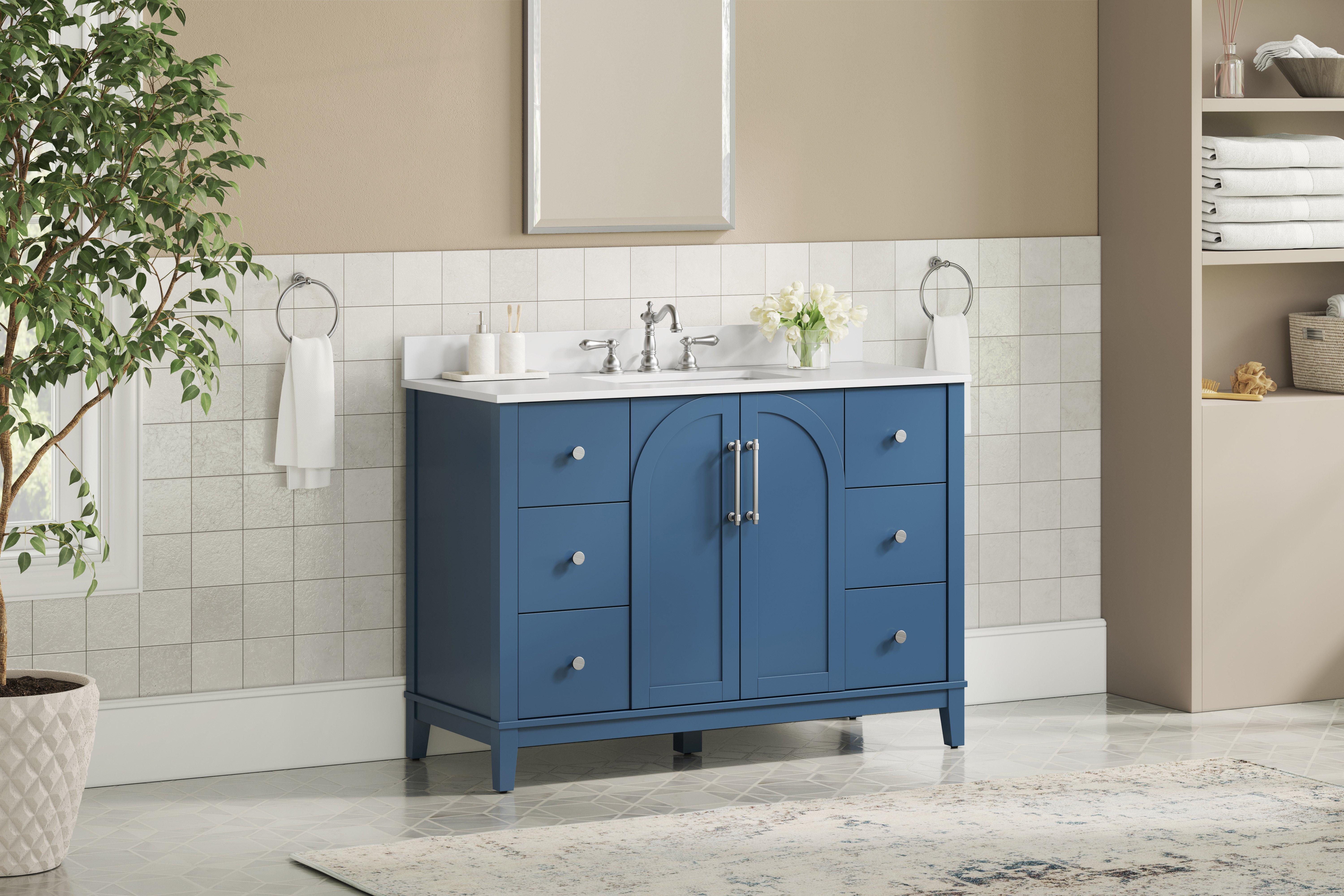Complete your bathroom with the beautiful Hutchinson 49 in. Blue Vanity with Engineered Stone Top. This freestanding features durable solid wood, mdf cabinets in stunning blue with a white composite vanity top and brushed nickel hardware. A charming single undermount sink in brilliant white is included. The Hutchinson 49 in. Blue Vanity with Engineered Stone Top is a versatile choice to customize multiple bathroom settings.