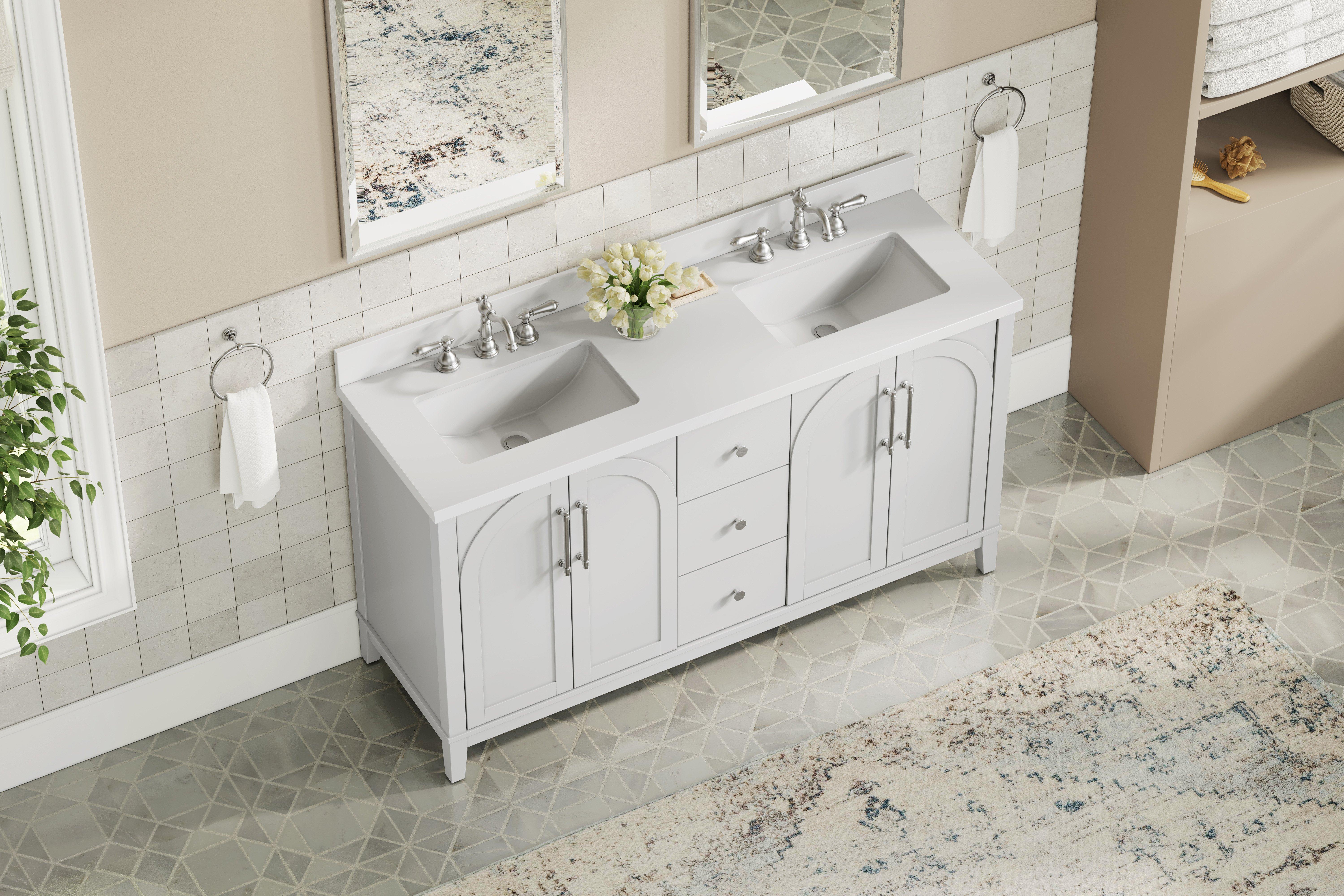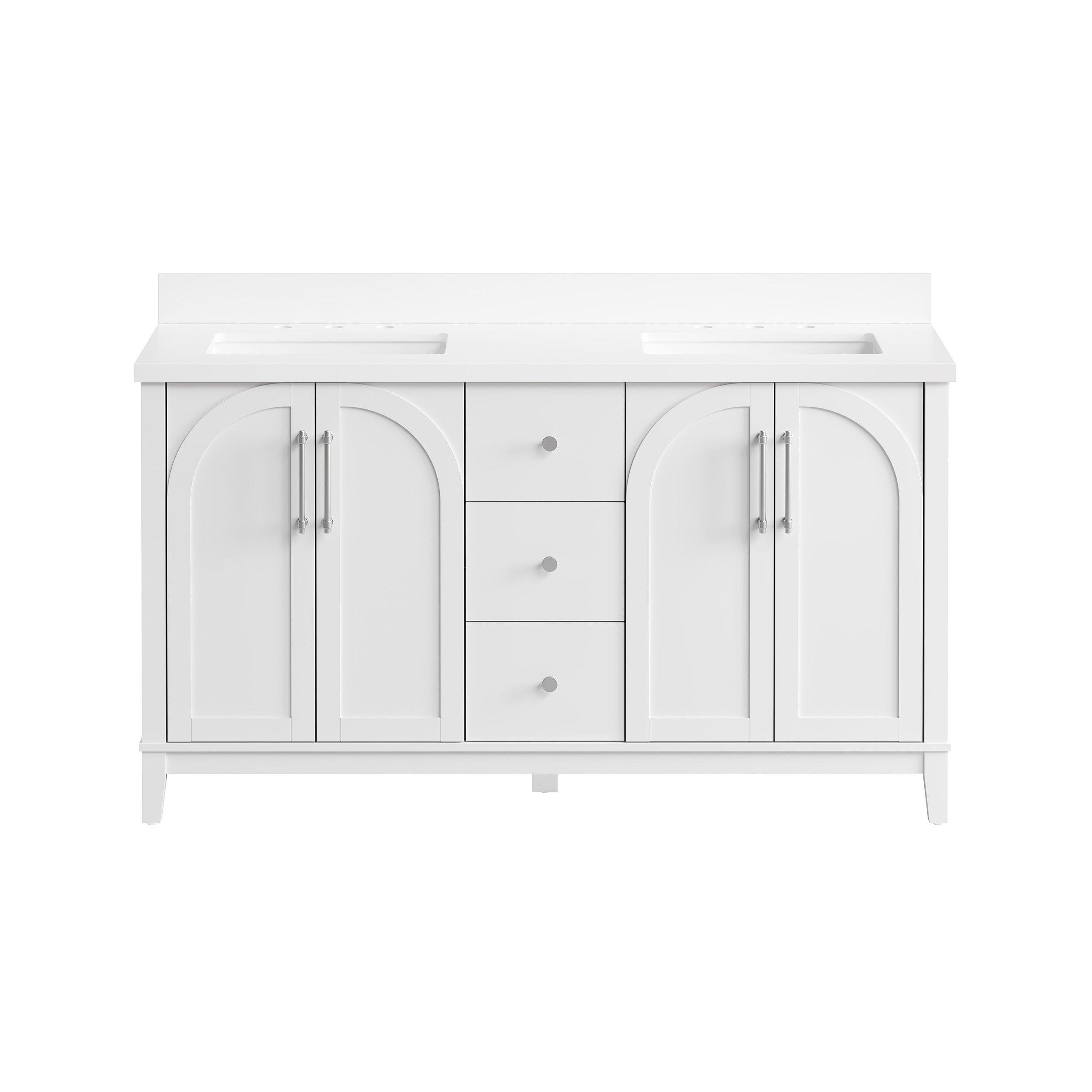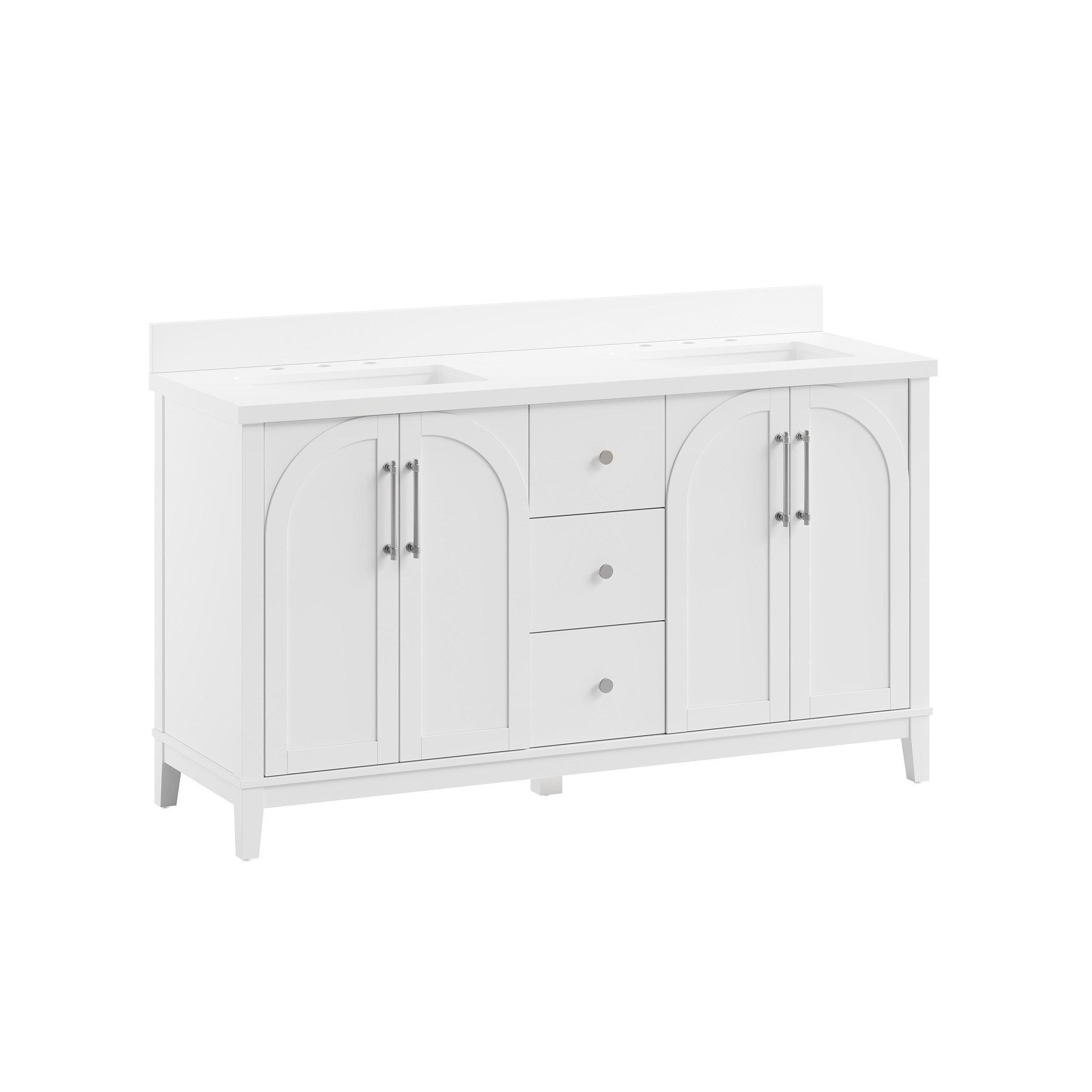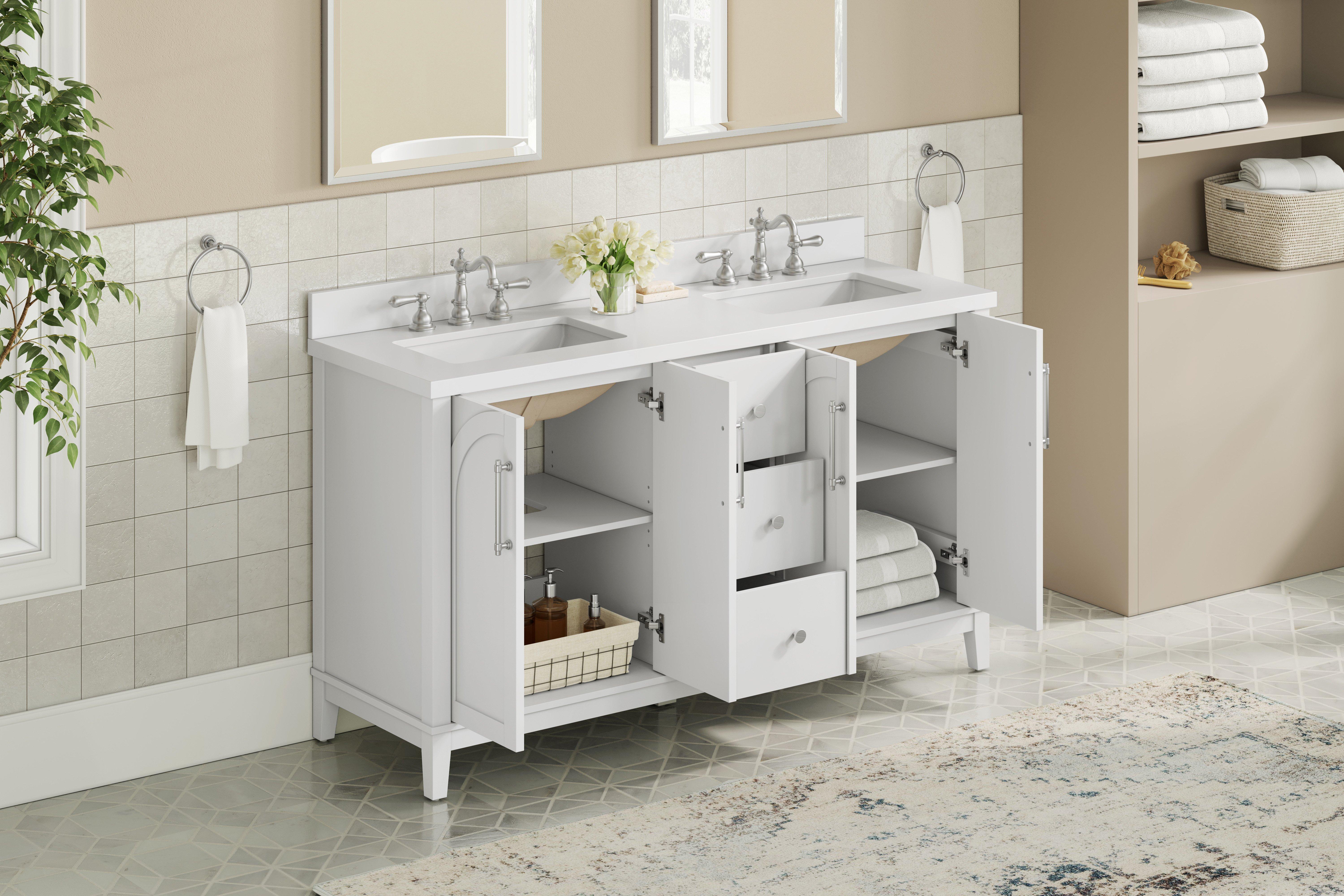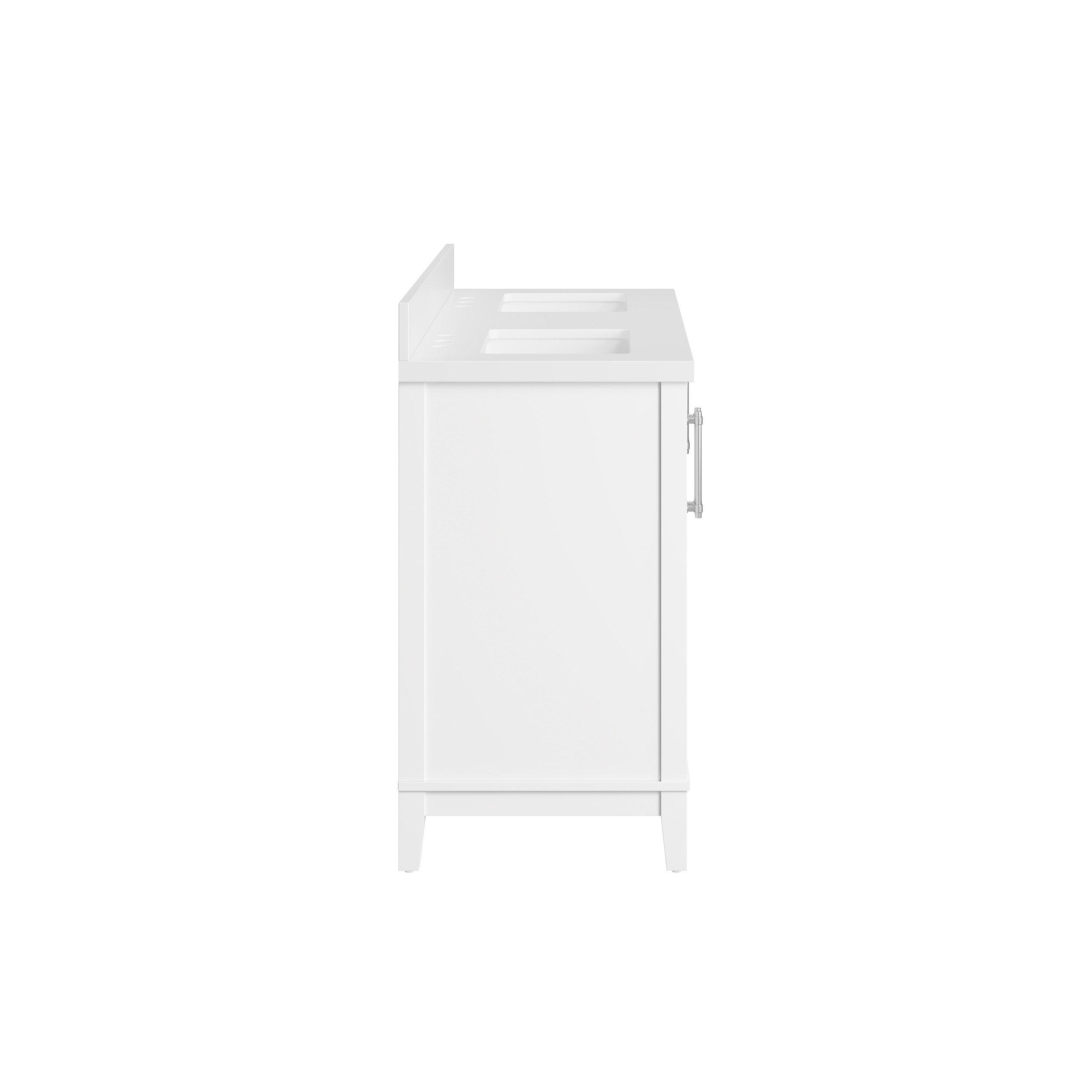 Tailor the look of your bathroom with the Hutchinson 61 in. White Vanity with Engineered Stone Top featuring gorgeous solid wood, mdf in white with 4 doors, 3 drawers, and 2 shelves. This piece is completed with beautiful brushed nickel hardware and a double undermount white sink. The Hutchinson 61 in. White Vanity with Engineered Stone Top is a stunning addition to any bathroom setting.