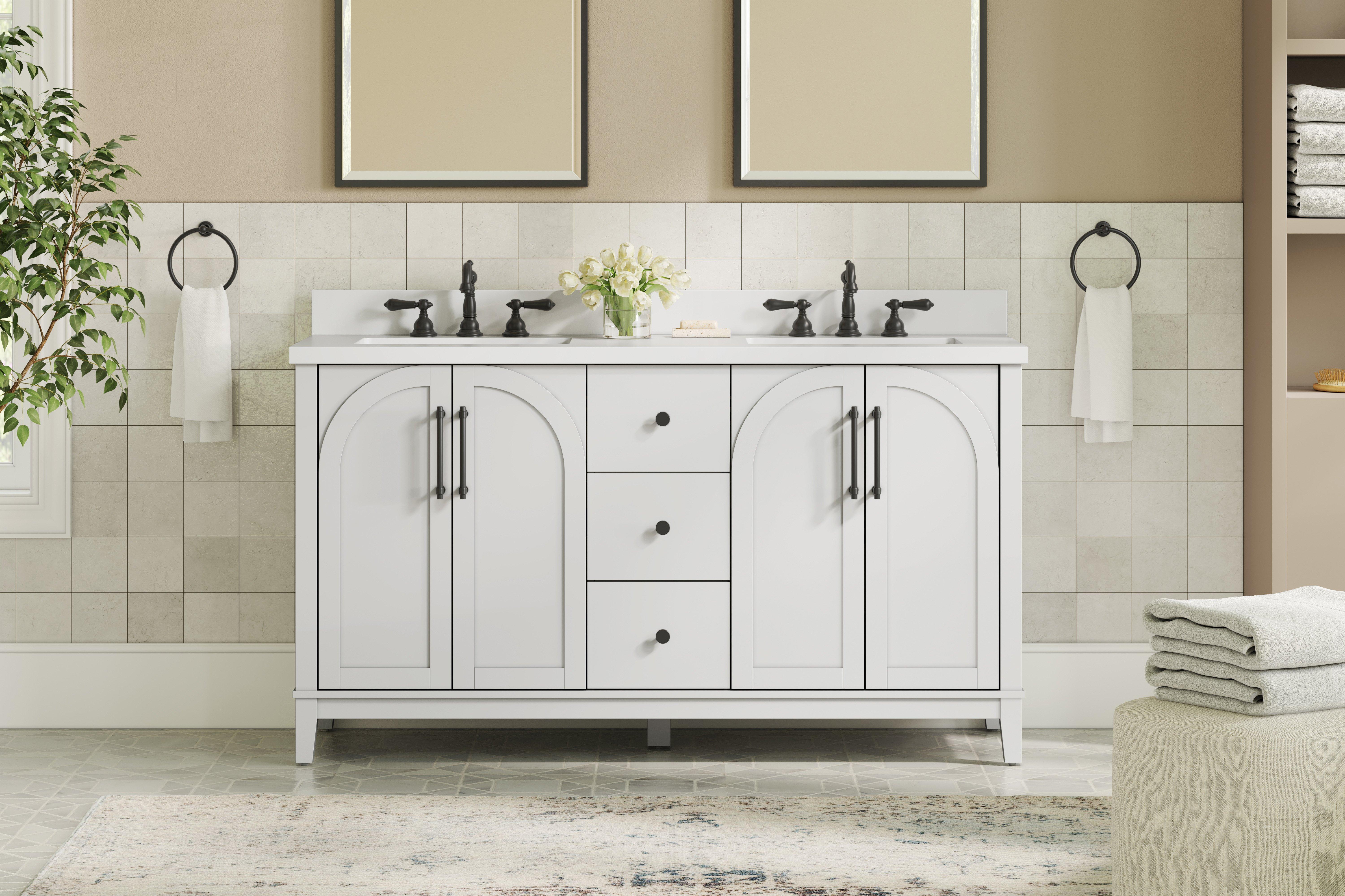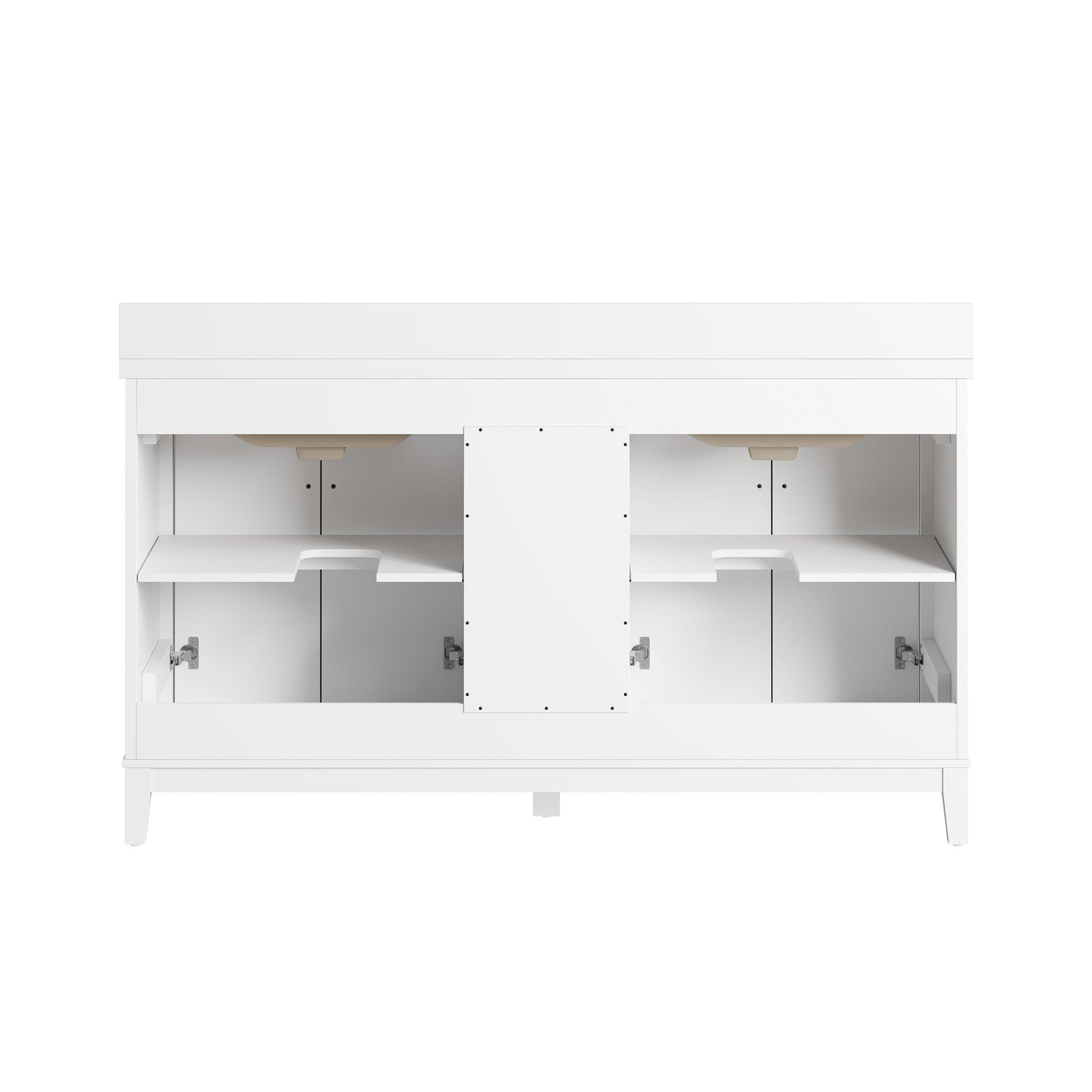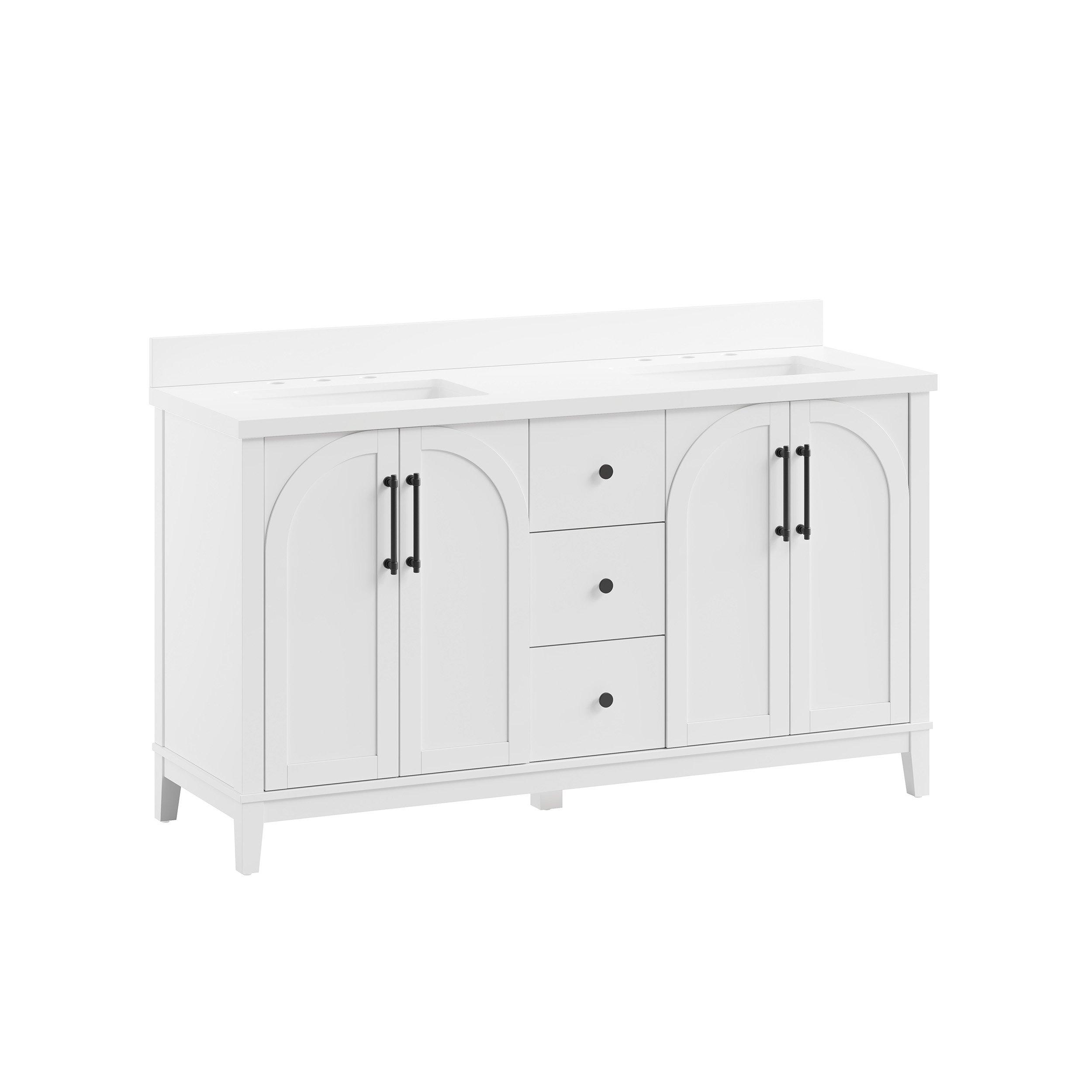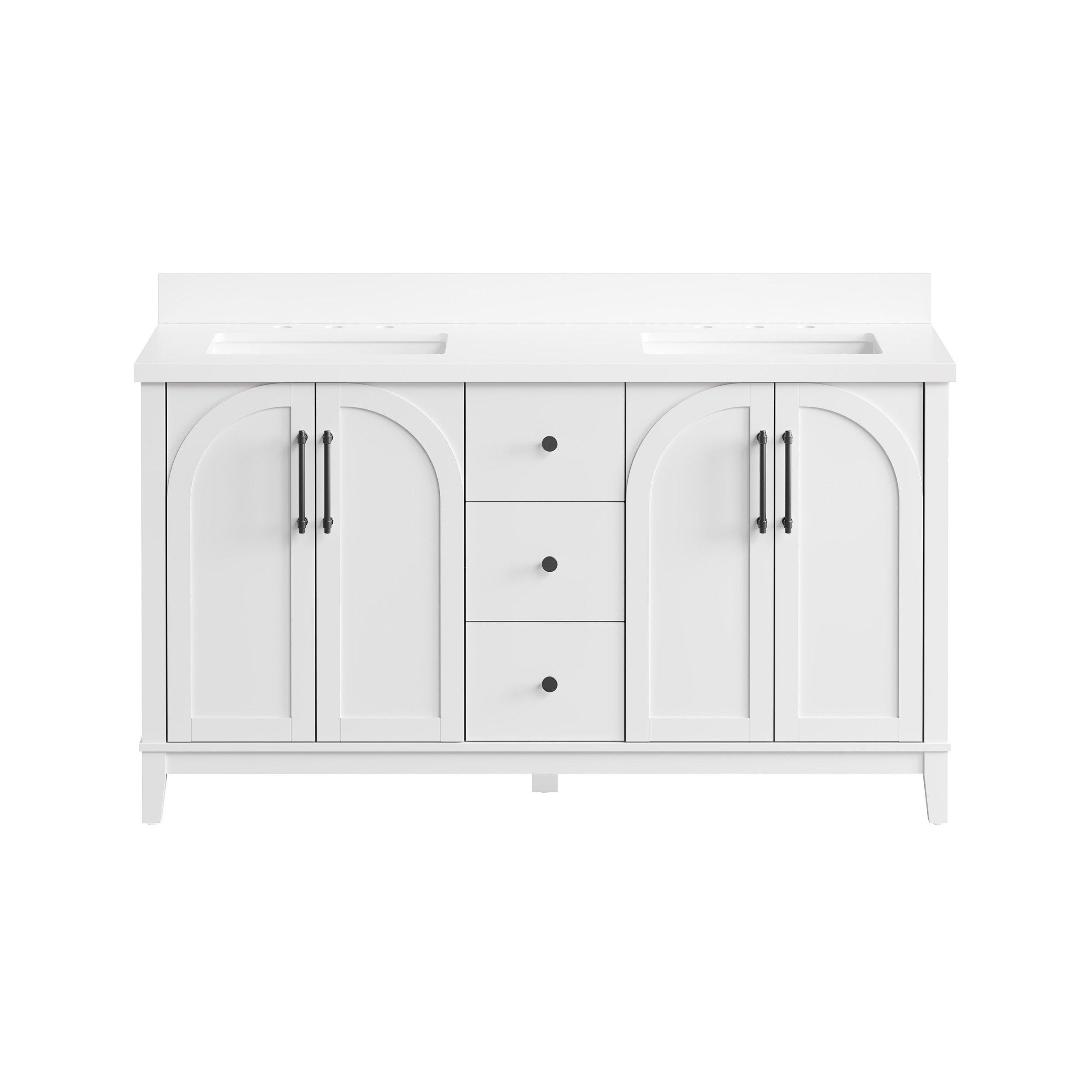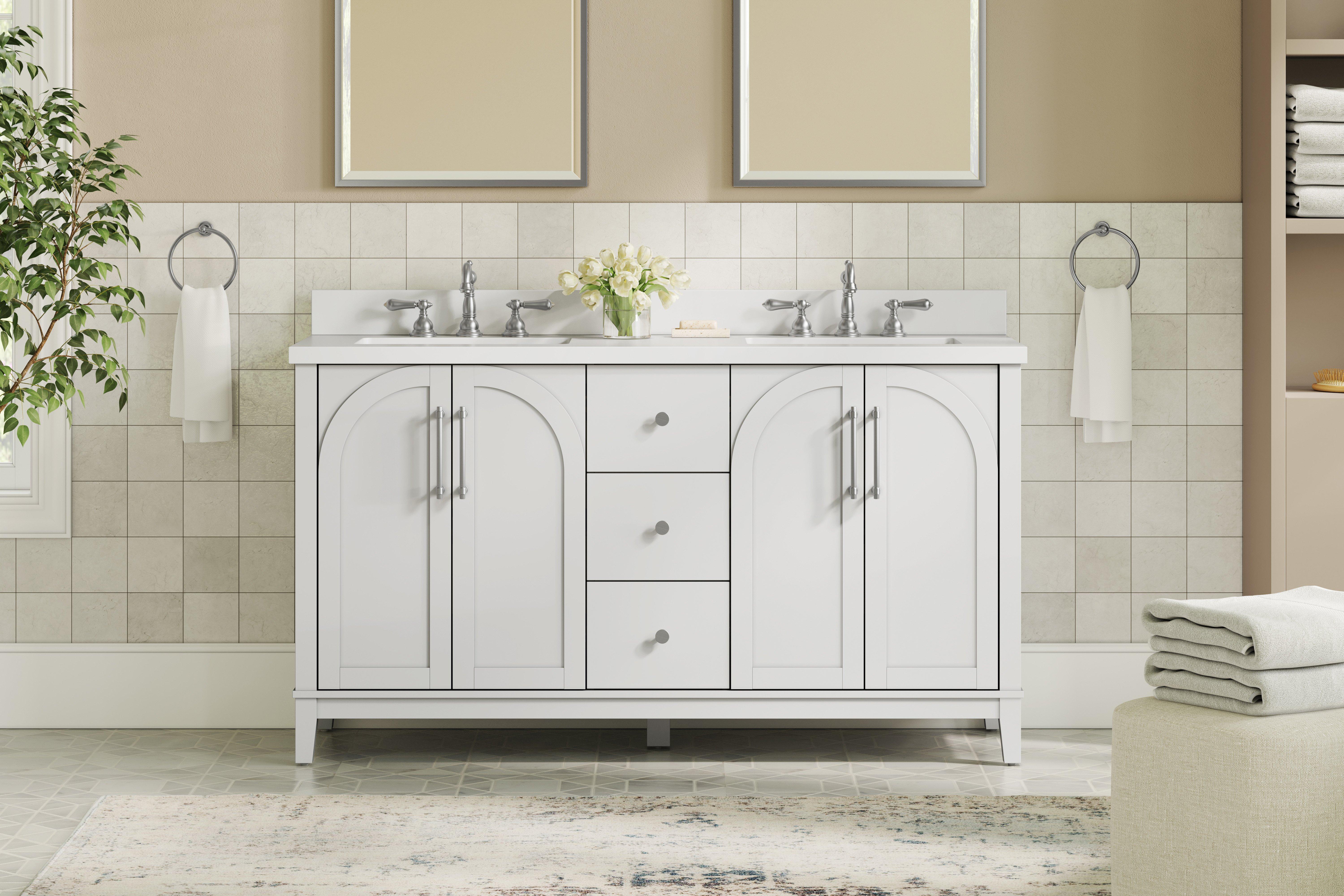 Tailor the look of your bathroom with the Hutchinson 61 in. White Vanity with Engineered Stone Top featuring gorgeous solid wood, mdf in white with 4 doors, 3 drawers, and 2 shelves. This piece is completed with beautiful brushed nickel hardware and a double undermount white sink. The Hutchinson 61 in. White Vanity with Engineered Stone Top is a stunning addition to any bathroom setting.