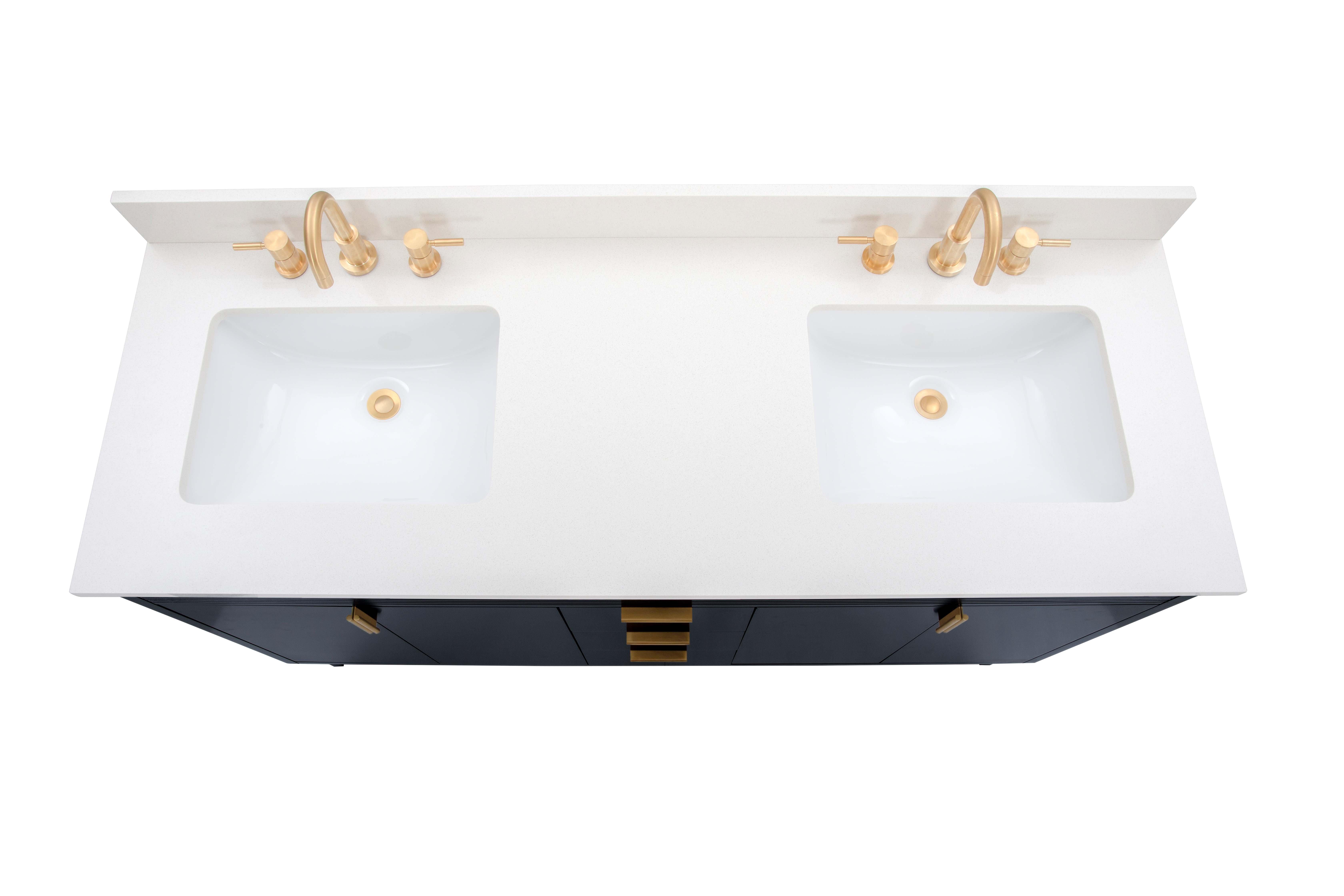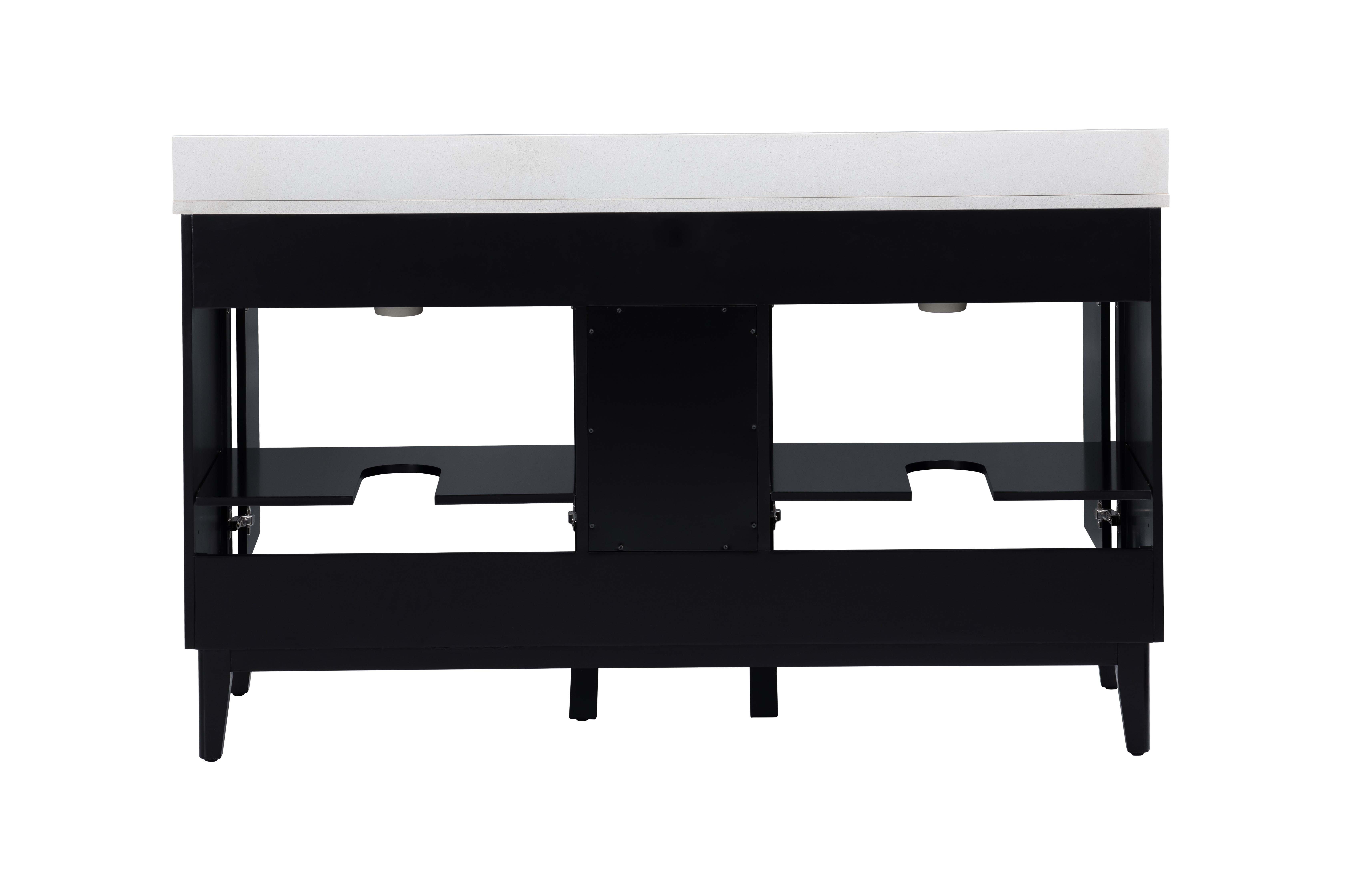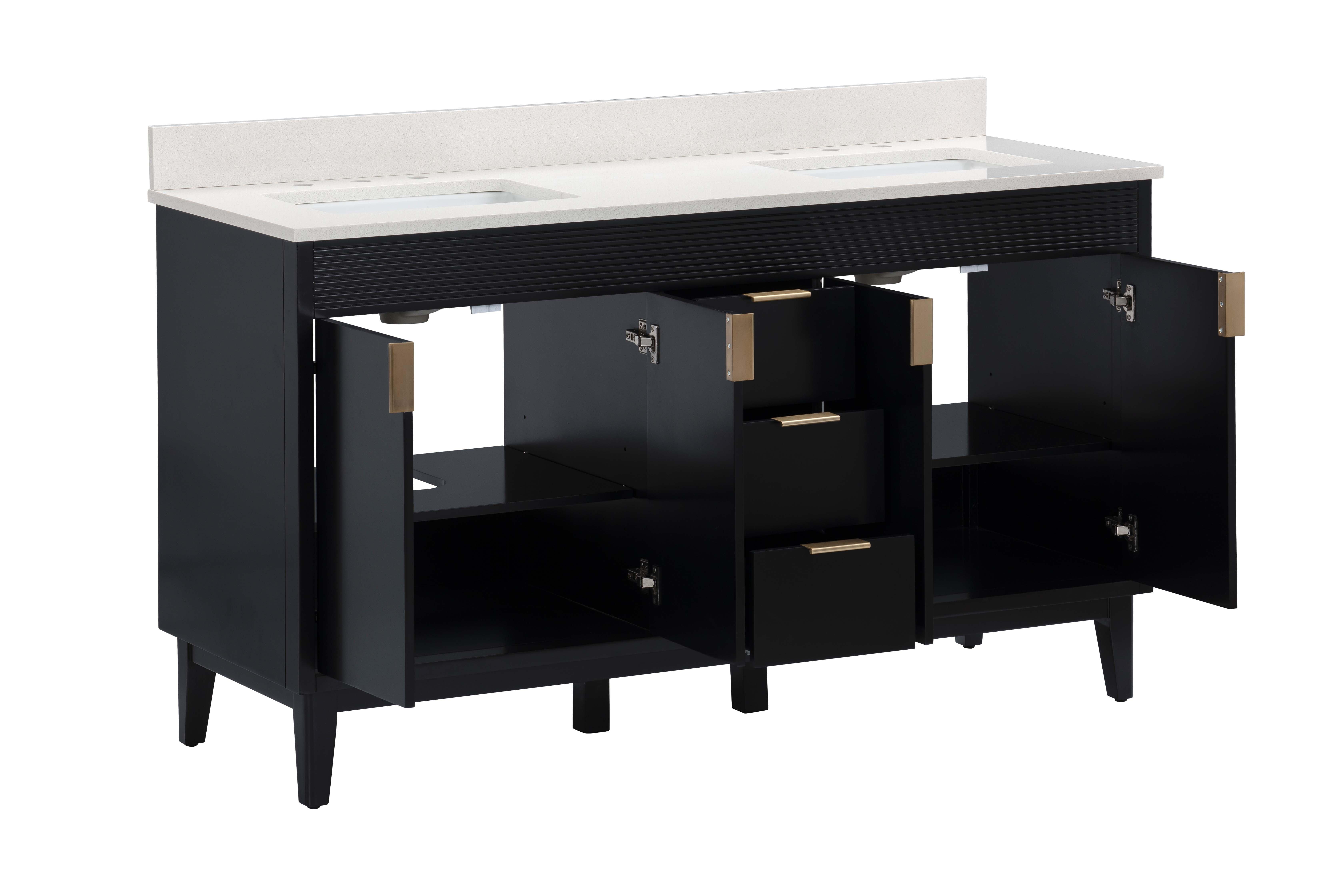 Complete your bathroom with the beautiful Julian 61 in. Black Vanity with Engineered Stone Top. This freestanding features durable mdf cabinets in stunning black with a white engineered stone vanity top and matte gold hardware. A charming double undermount sink in brilliant white is included. The Julian 61 in. Black Vanity with Engineered Stone Top is a versatile choice to customize multiple bathroom settings.